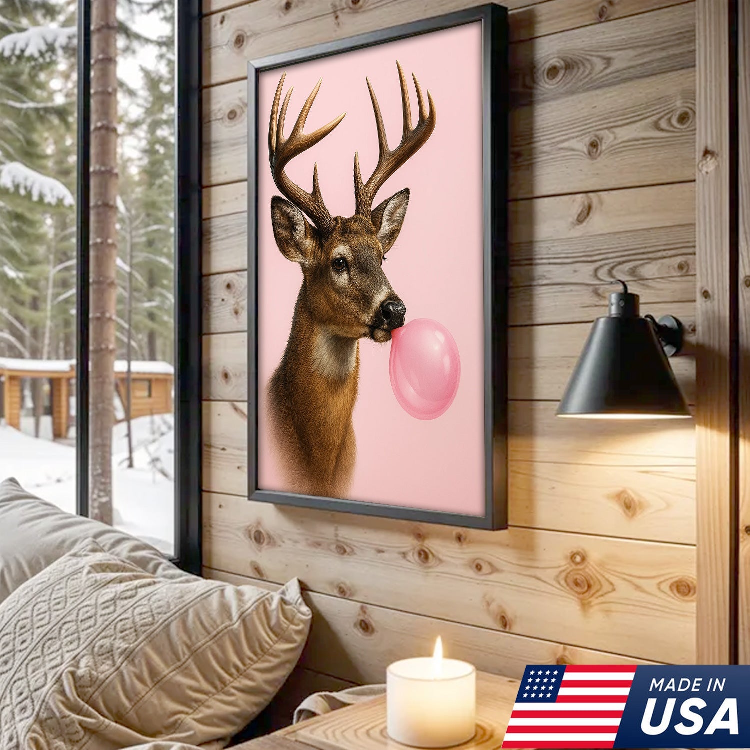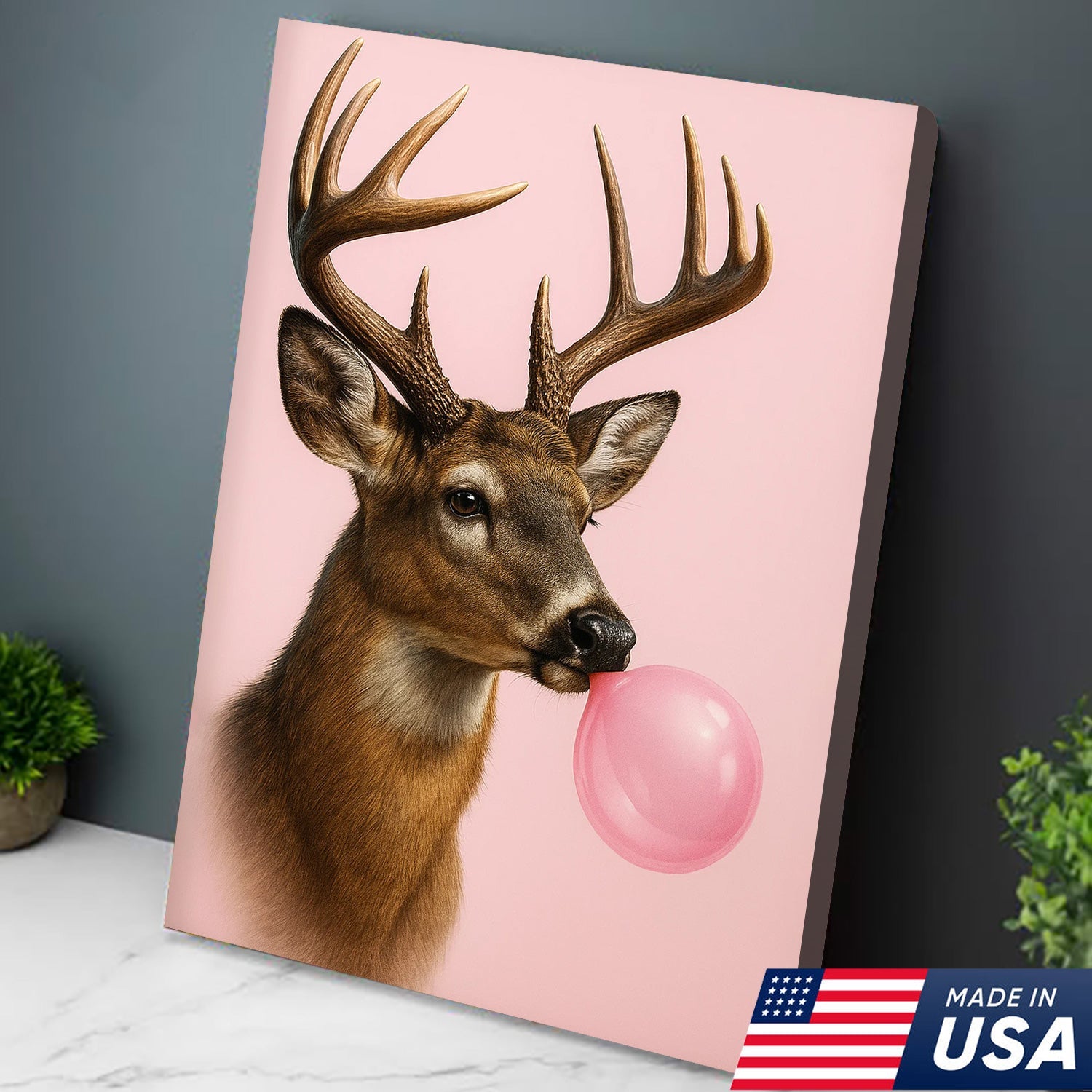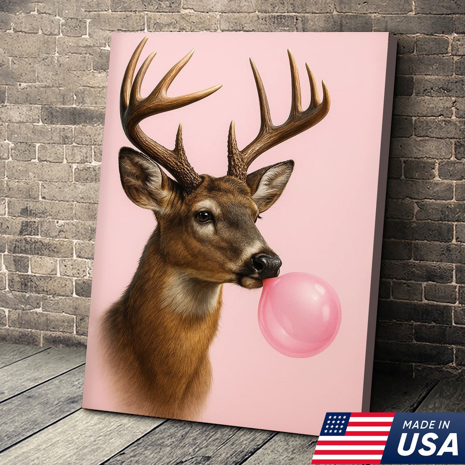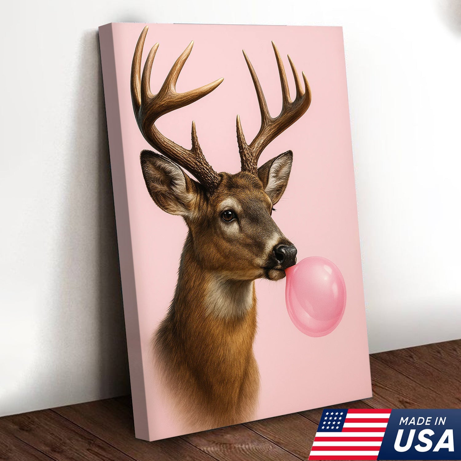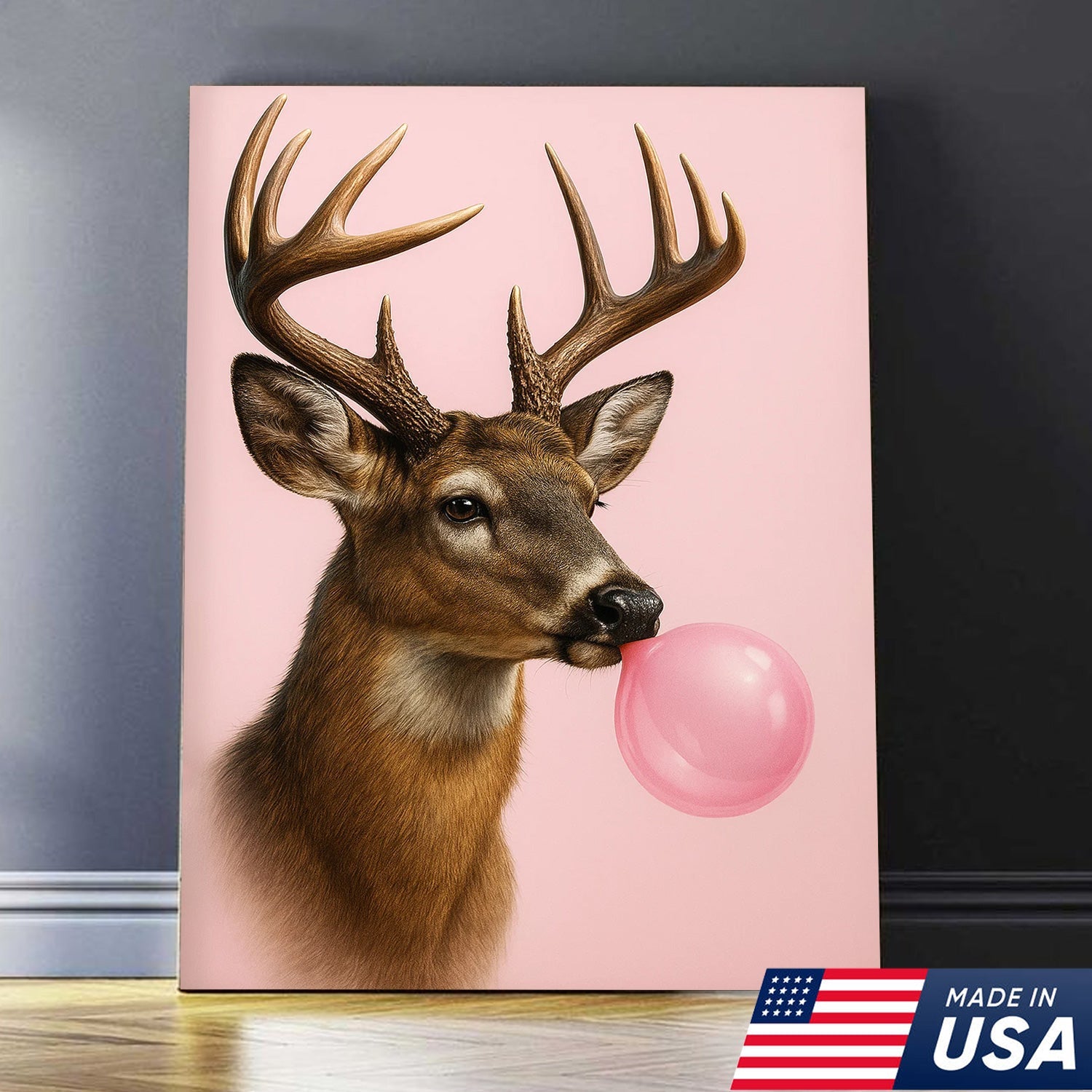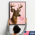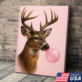 Funny Deer Blowing Bubblegum Wall Art – Modern Animal Canvas Print for Living Room, Cabin & Lodge Decor