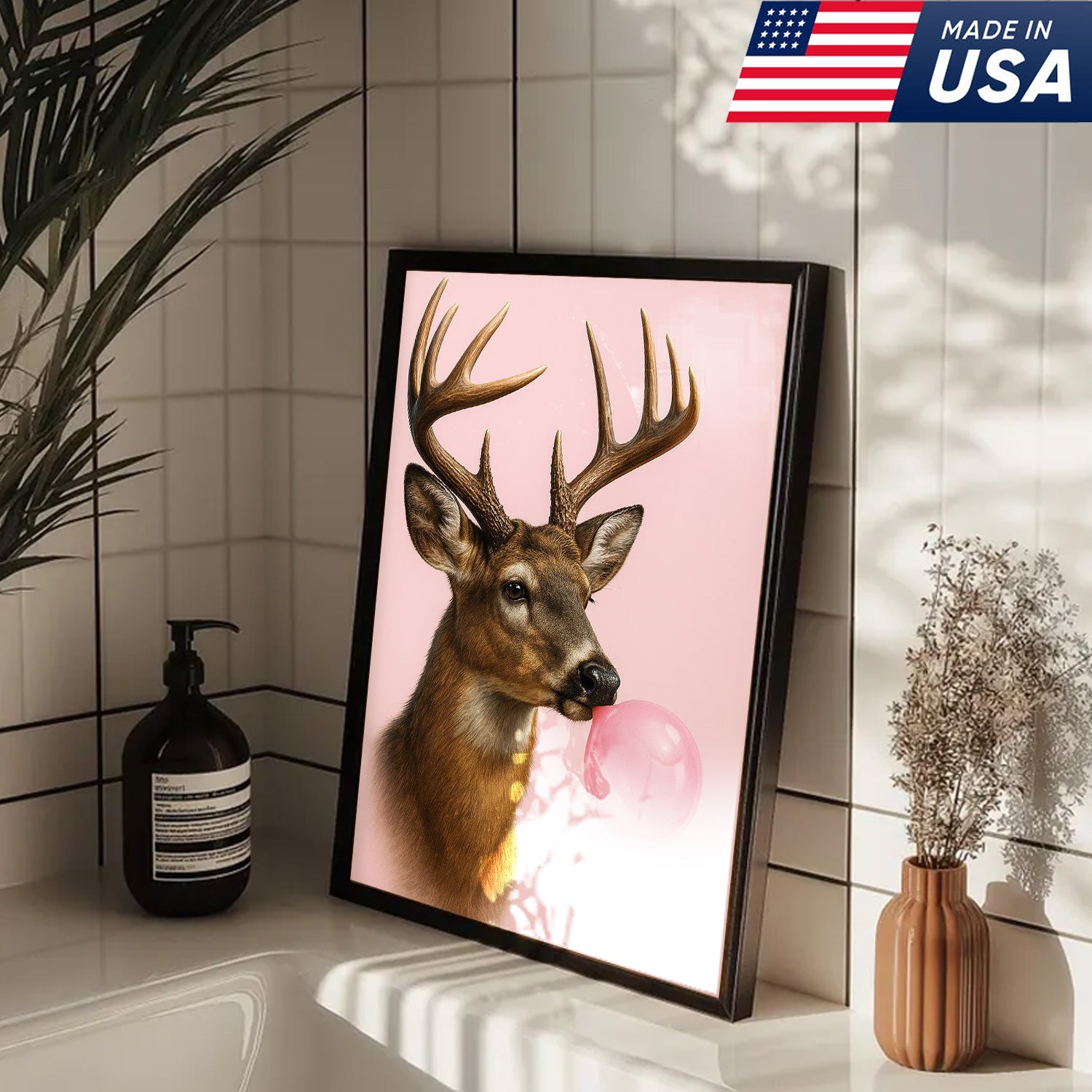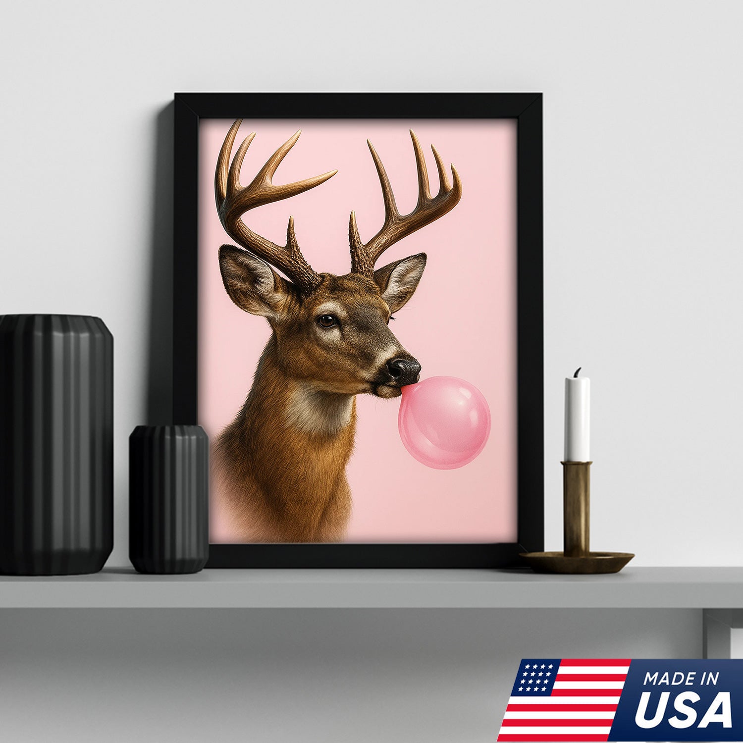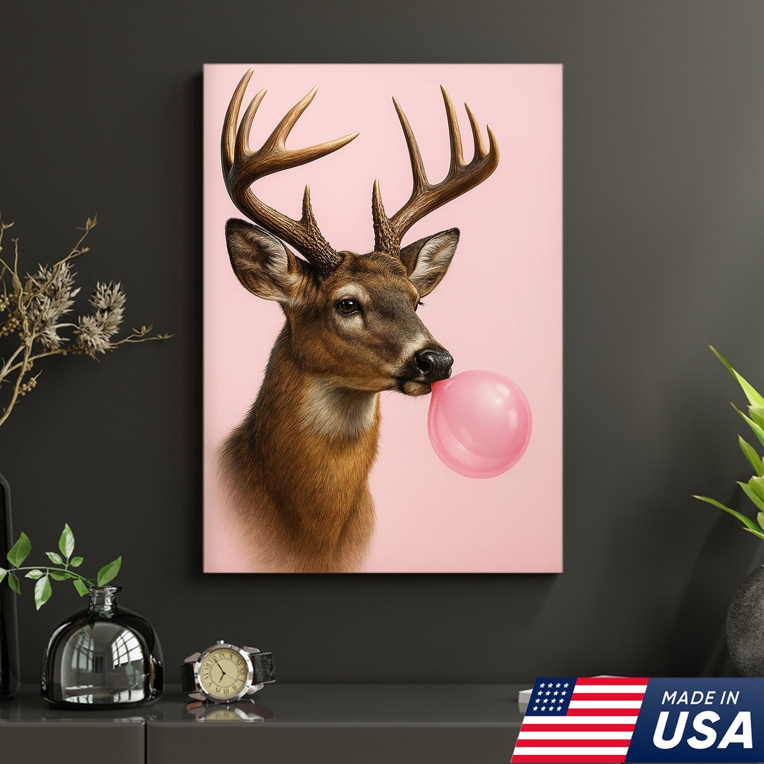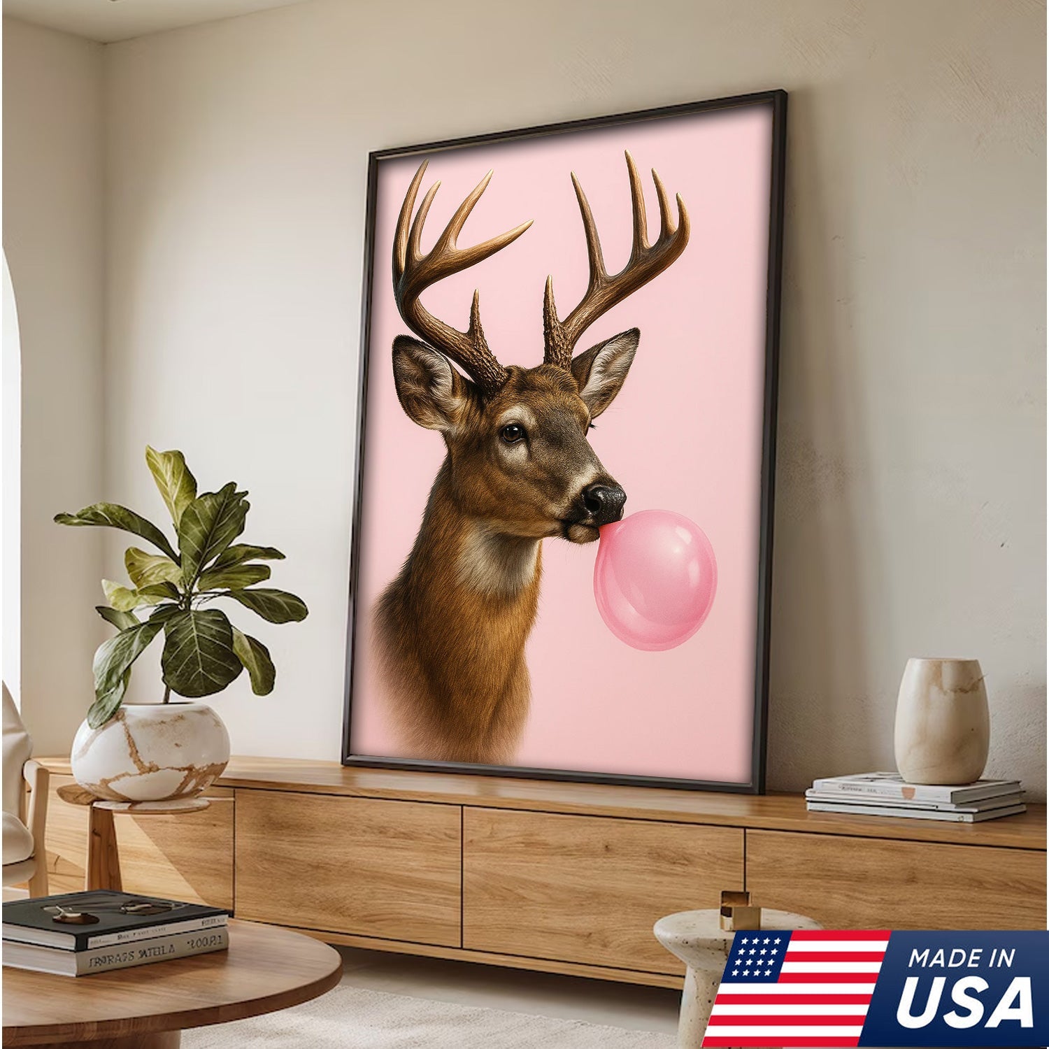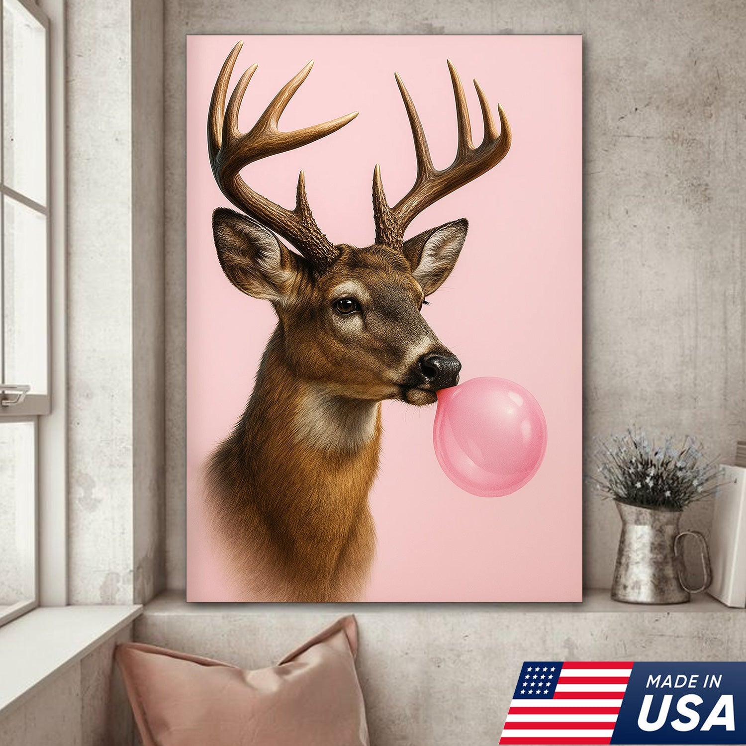 Funny Deer Blowing Bubblegum Wall Art – Modern Animal Canvas Print for Living Room, Cabin & Lodge Decor
