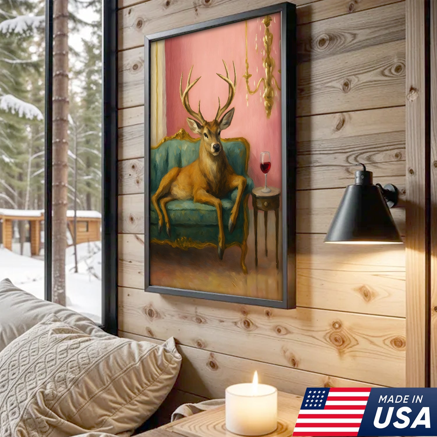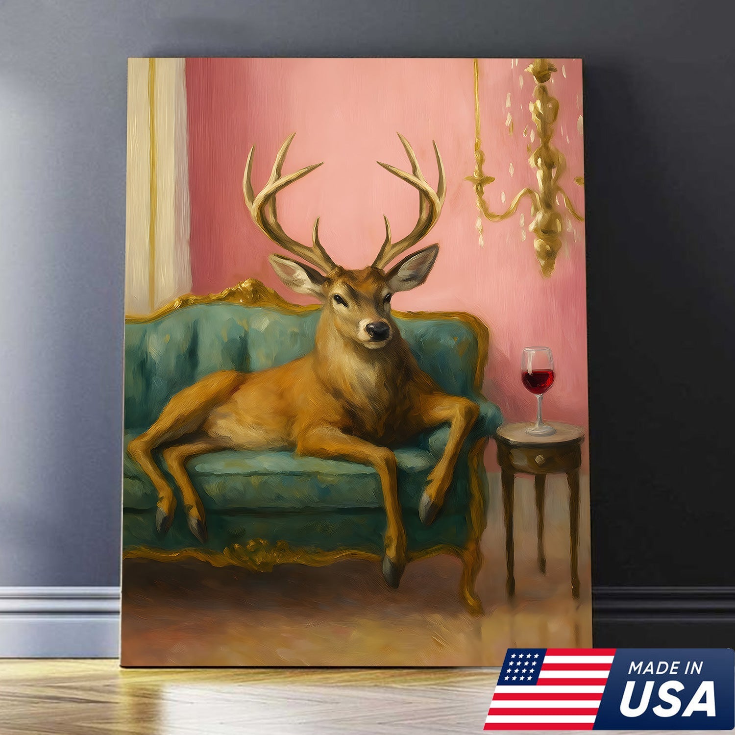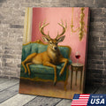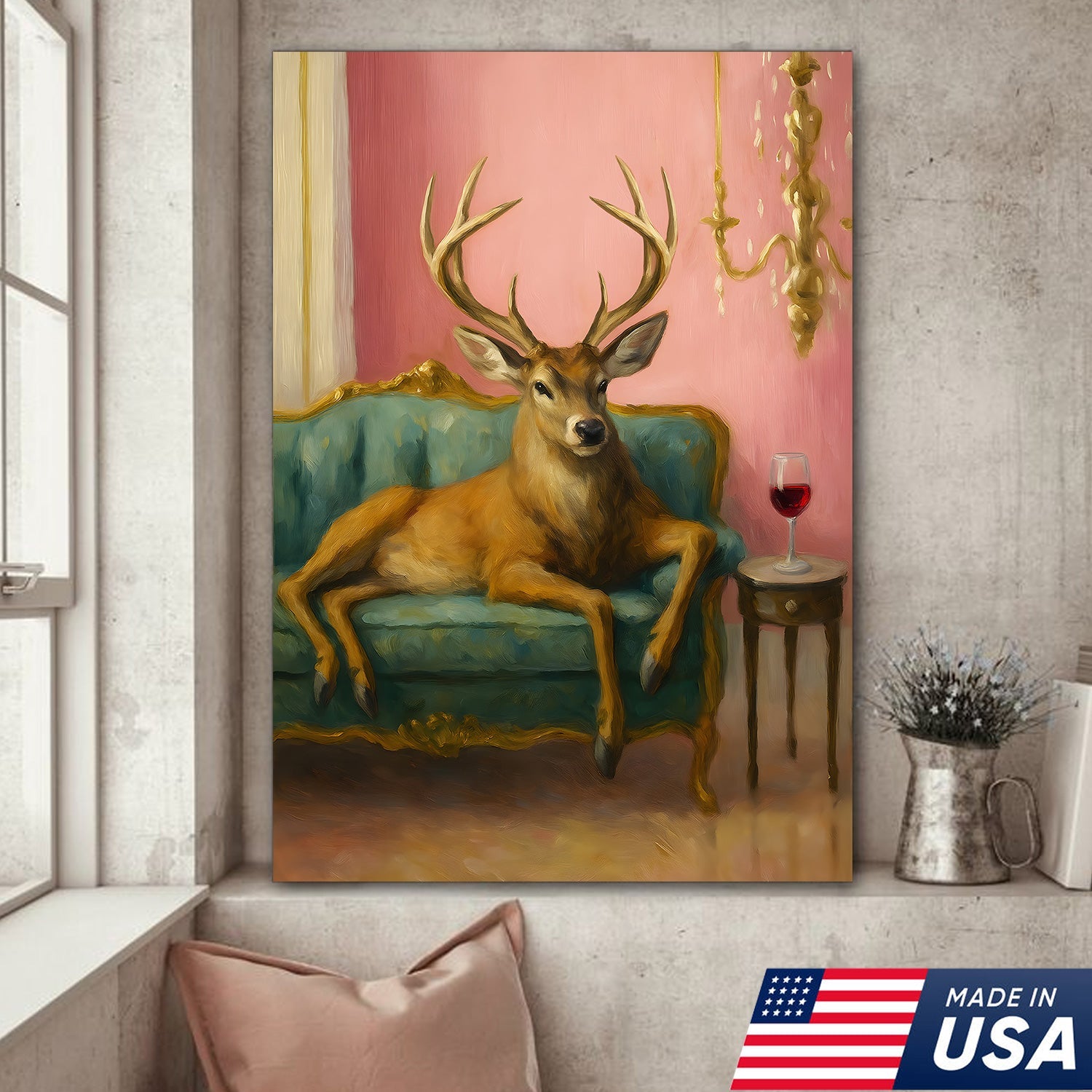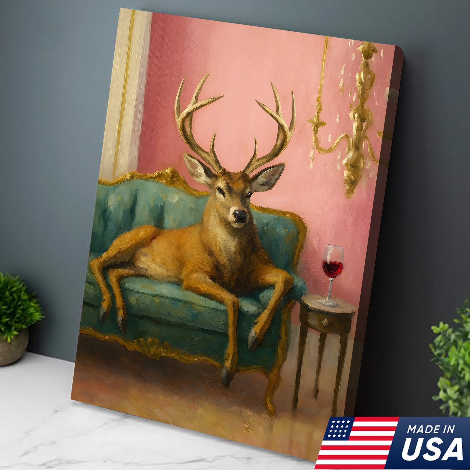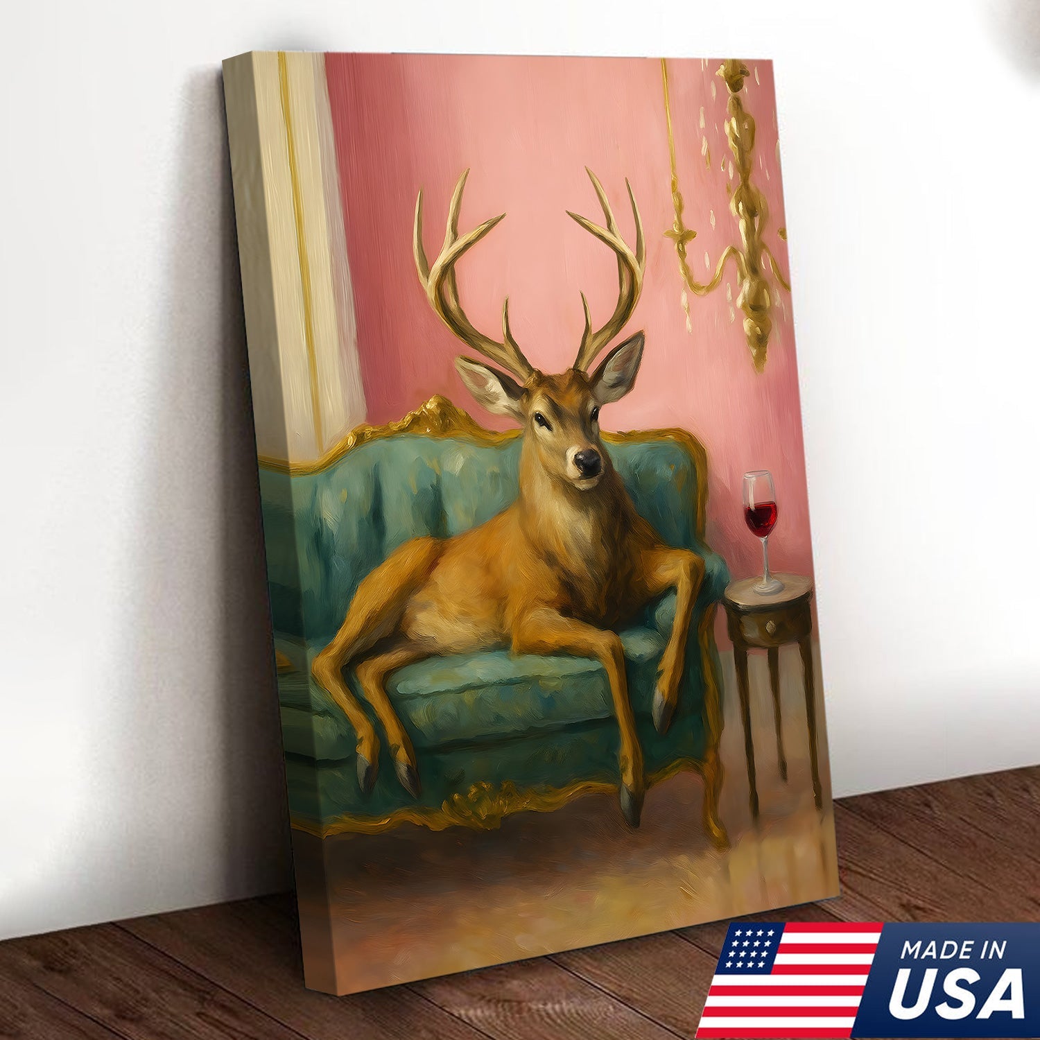 Funny Deer Chill On The Sofa Canvas Wall Art – Elegant Deer Drinking Wine Canvas
