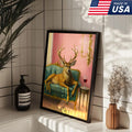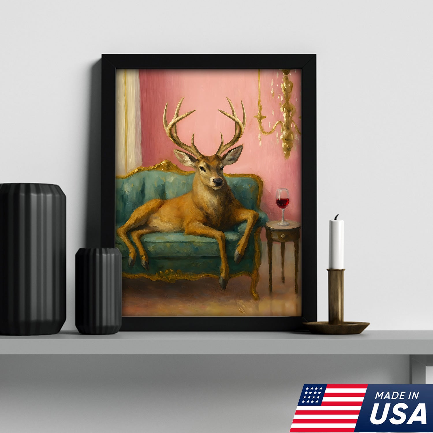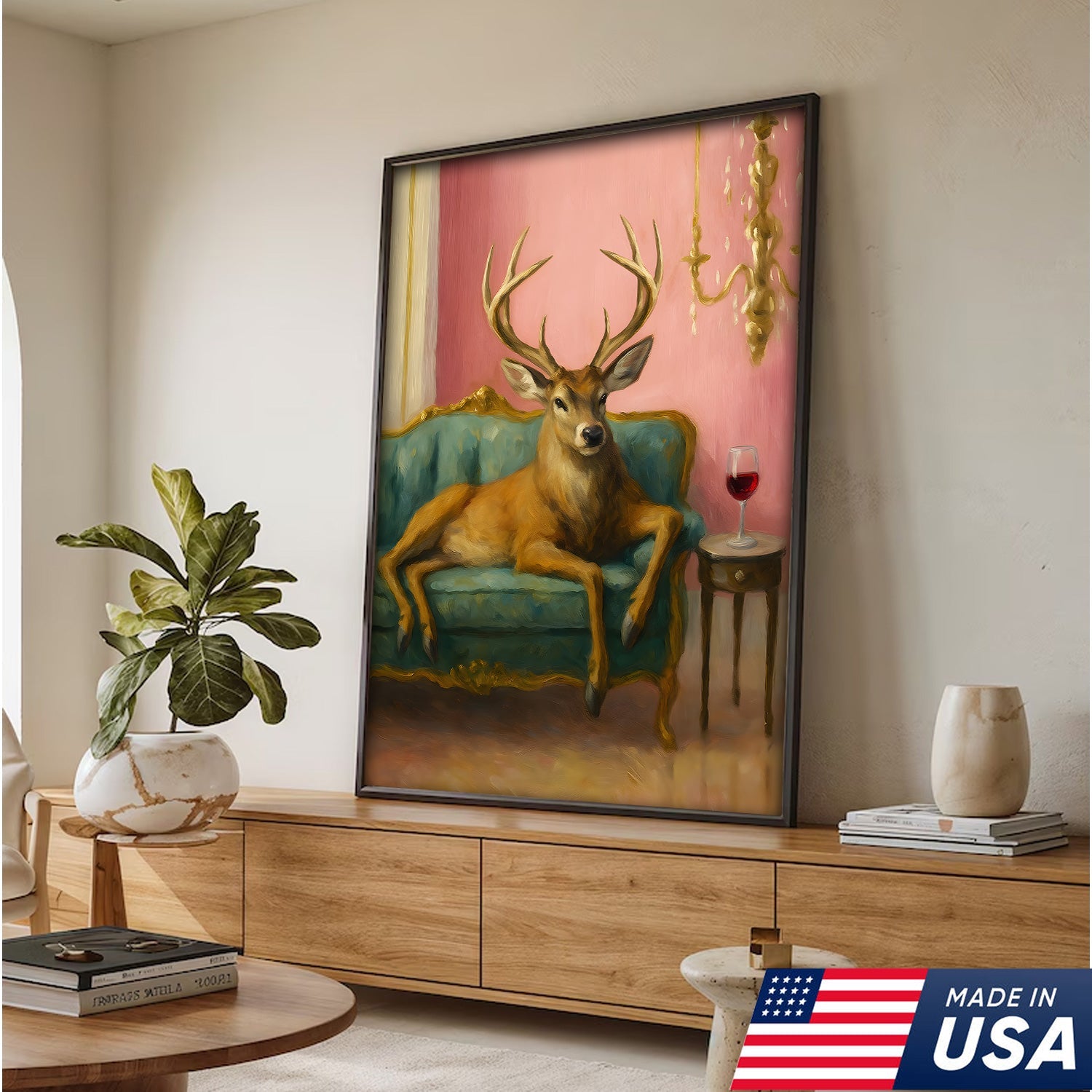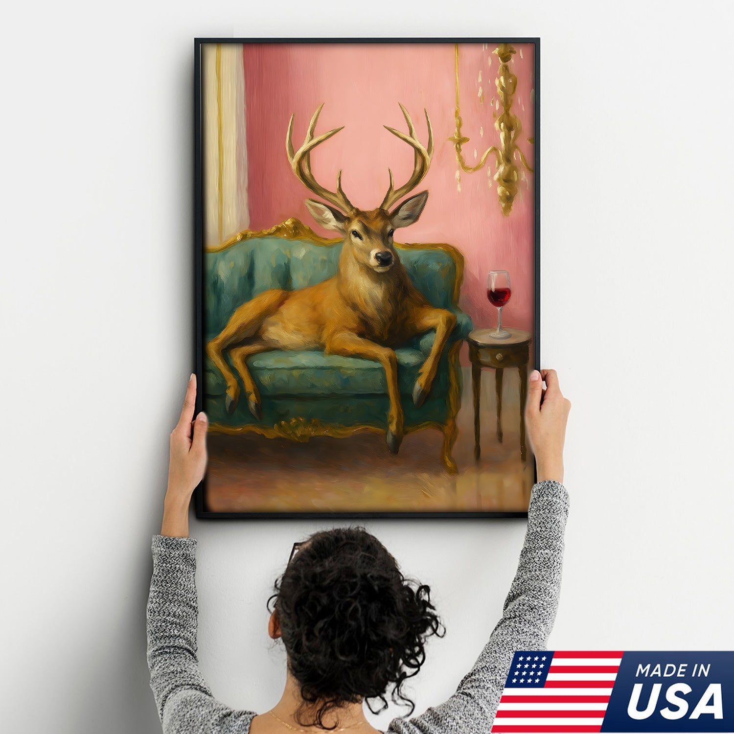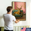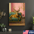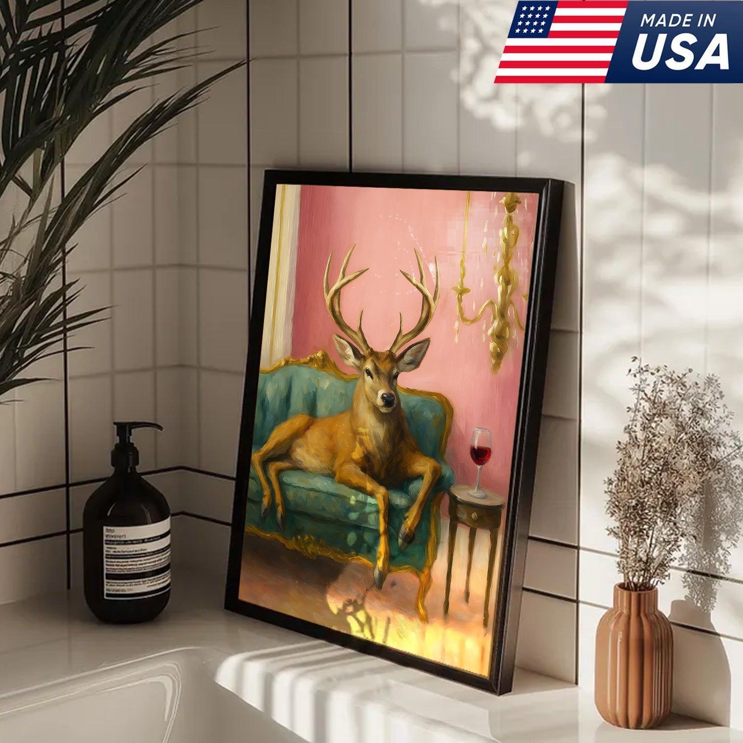 Funny Deer Chill On The Sofa Canvas Wall Art – Elegant Deer Drinking Wine Canvas