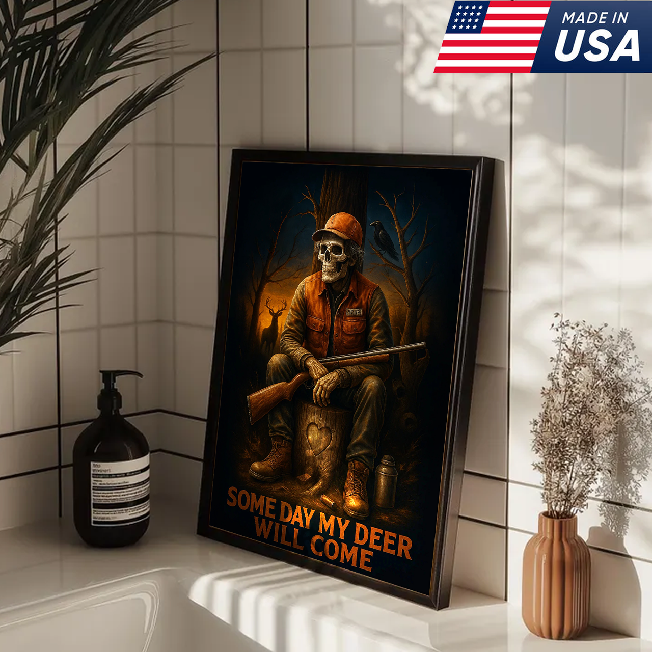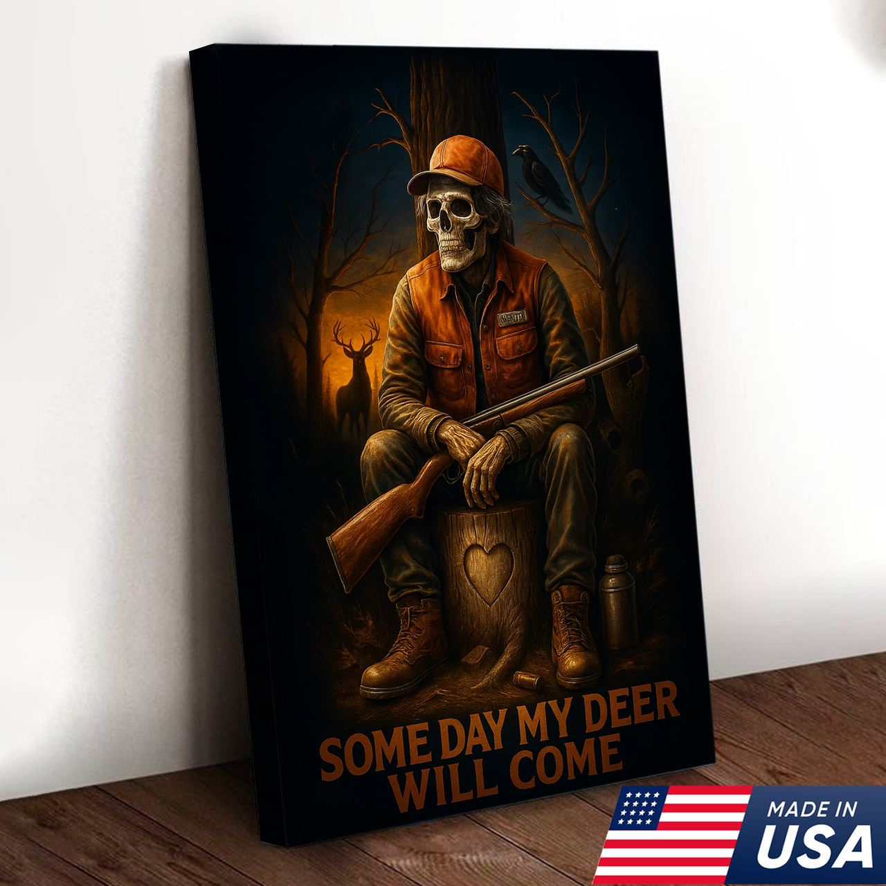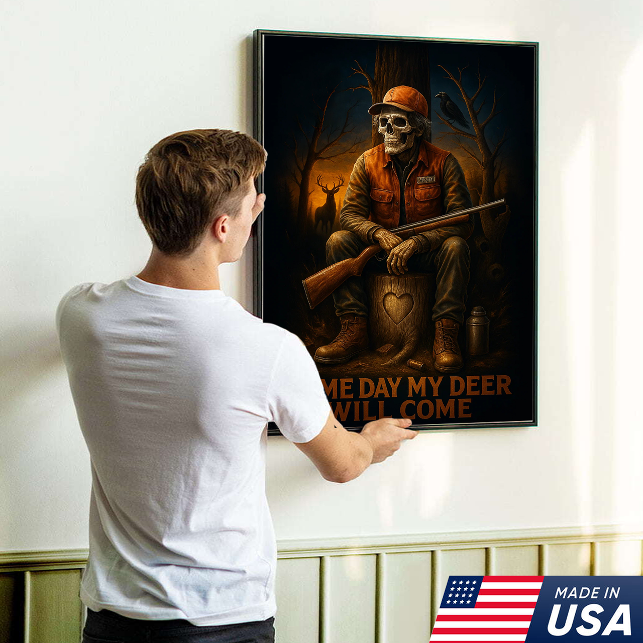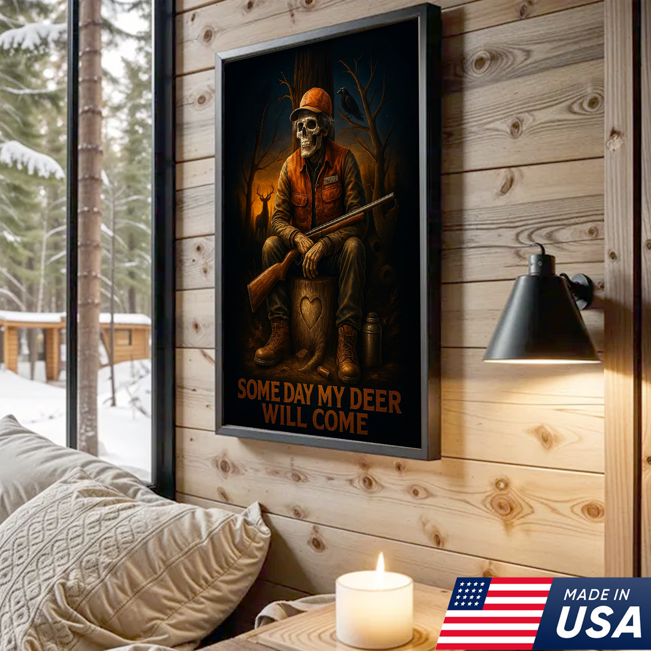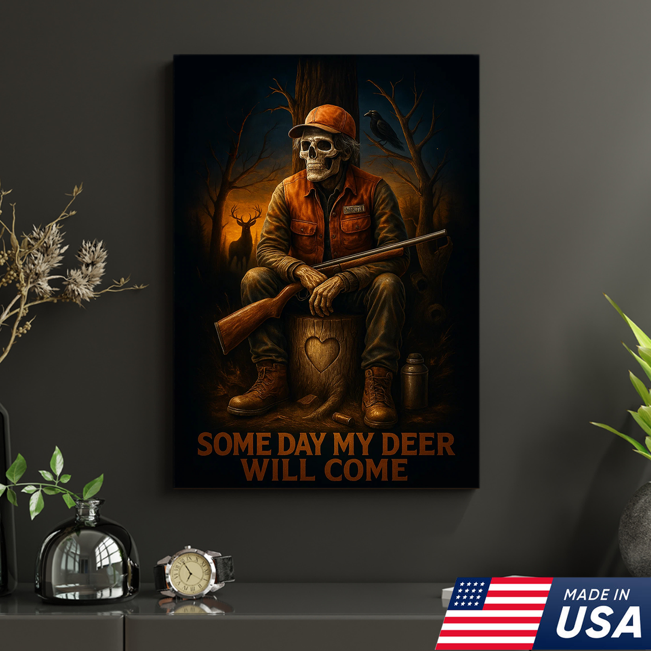 Funny Deer Hunting Canvas Wall Art – Skeleton Hunter with Rifle, Rustic Lodge Decor, “Some Day My Deer Will Come” Artwork
