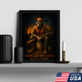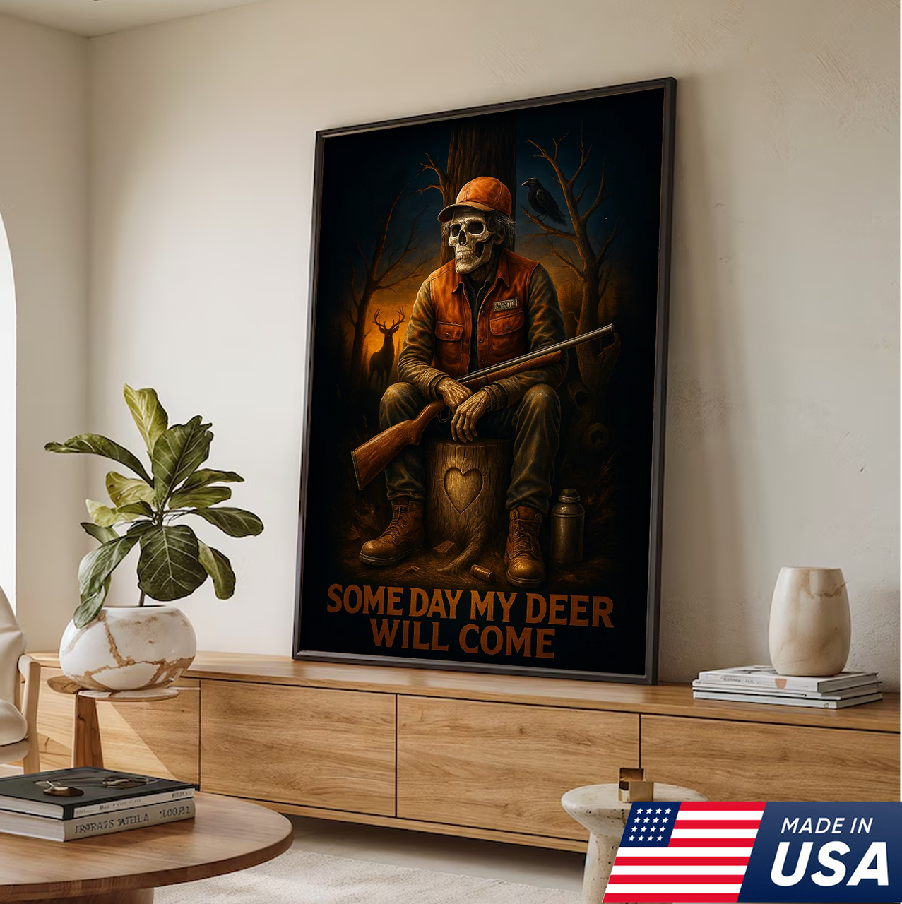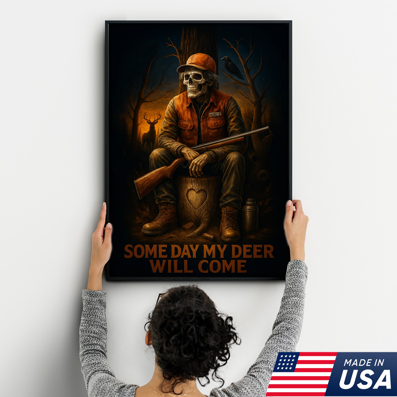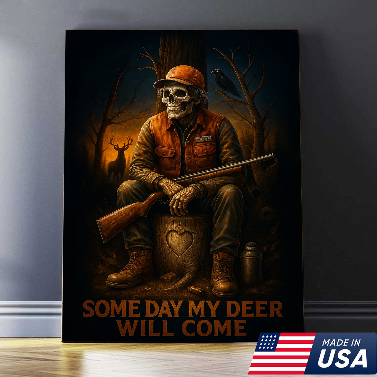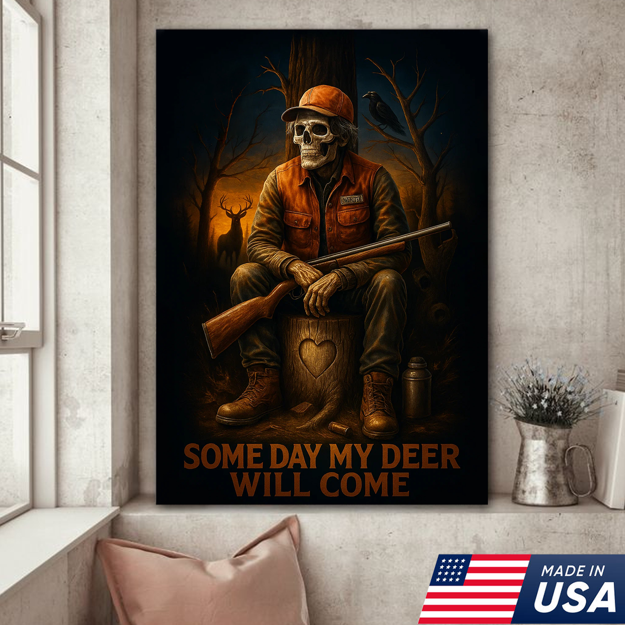 Funny Deer Hunting Canvas Wall Art – Skeleton Hunter with Rifle, Rustic Lodge Decor, “Some Day My Deer Will Come” Artwork
