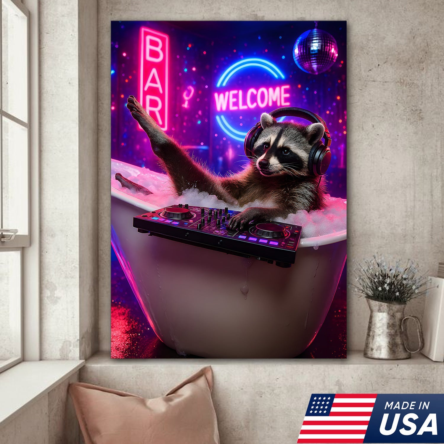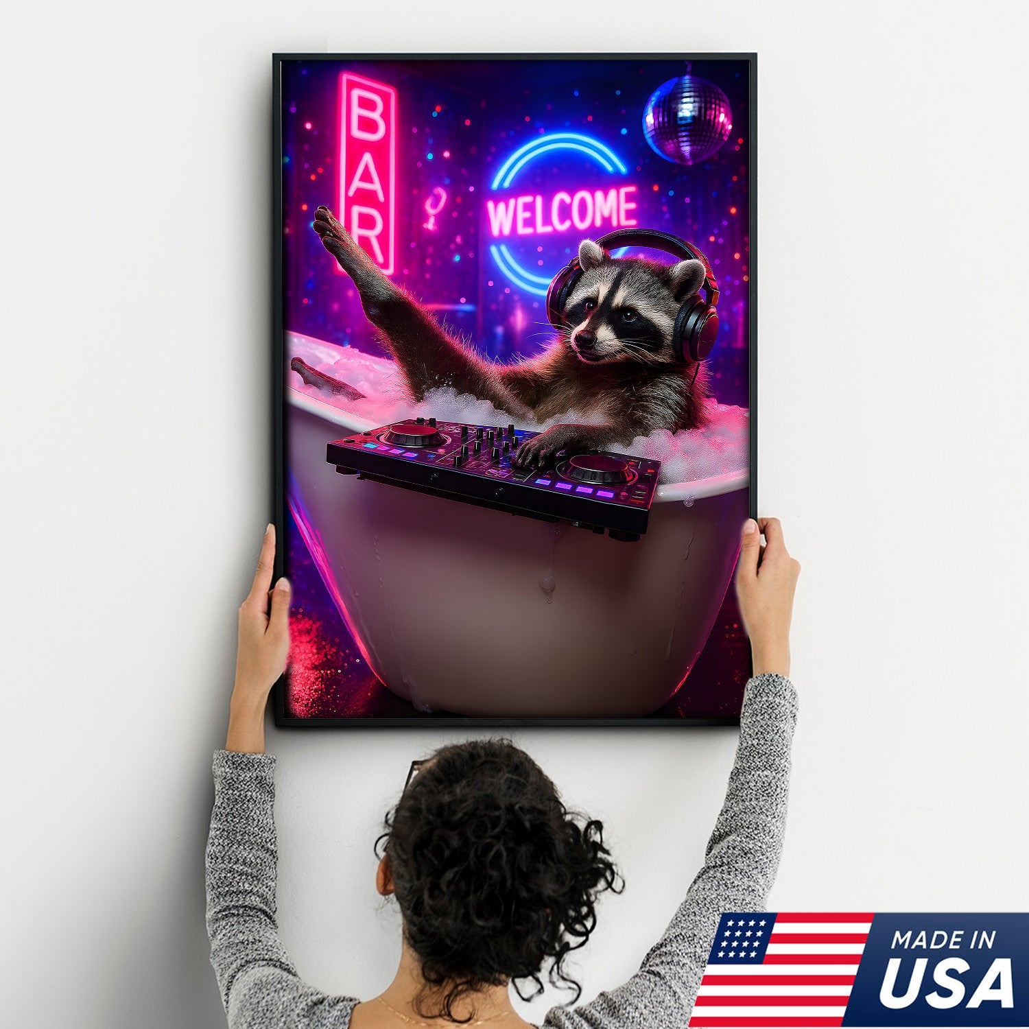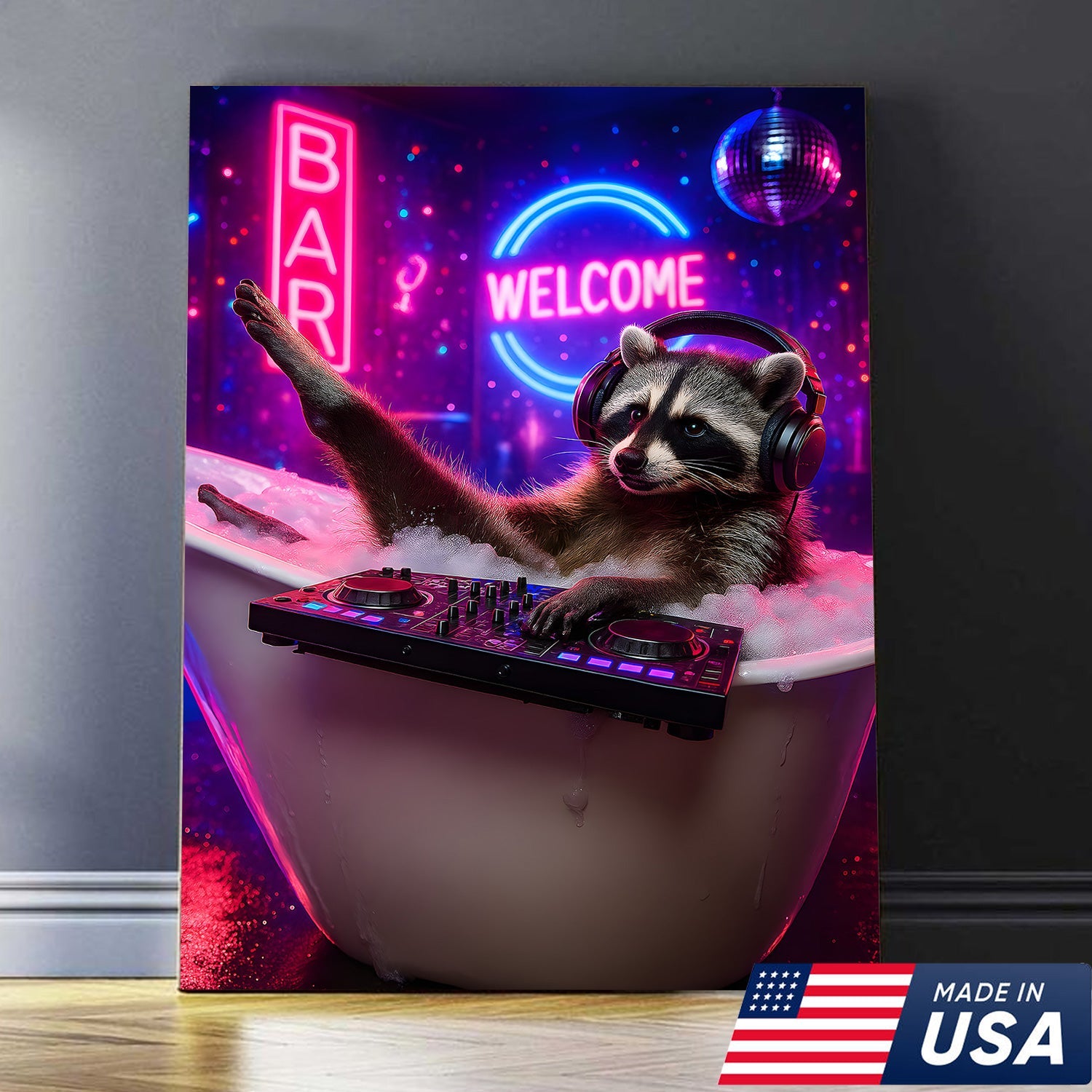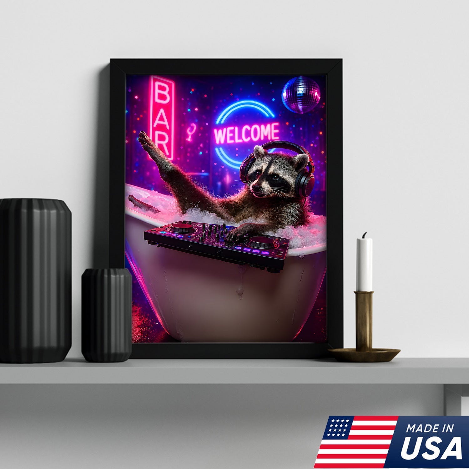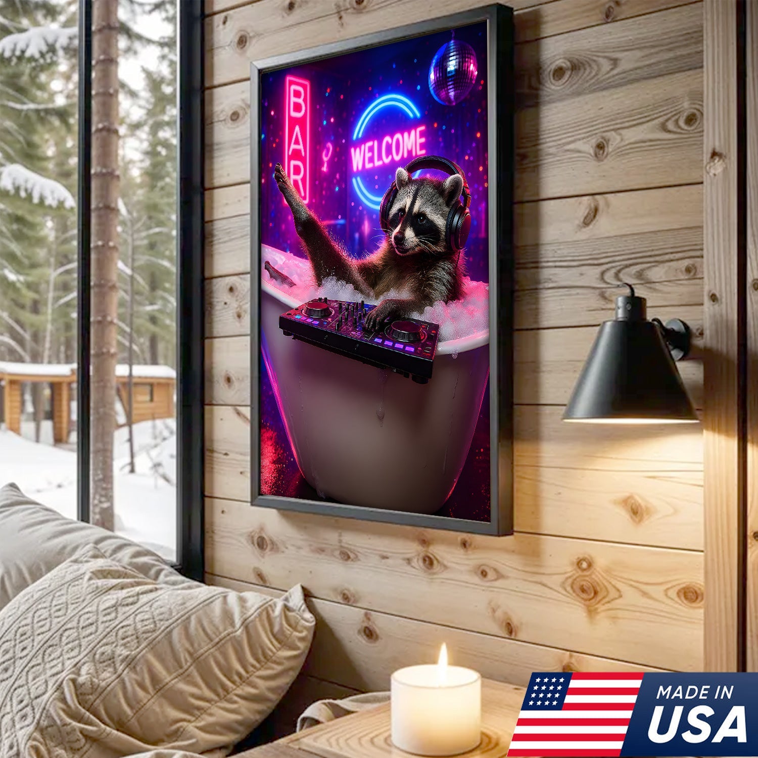 Funny DJ Raccoon Wall Art – Unique Gift for Hunters, Wildlife Lovers & Cabin Bar Decor