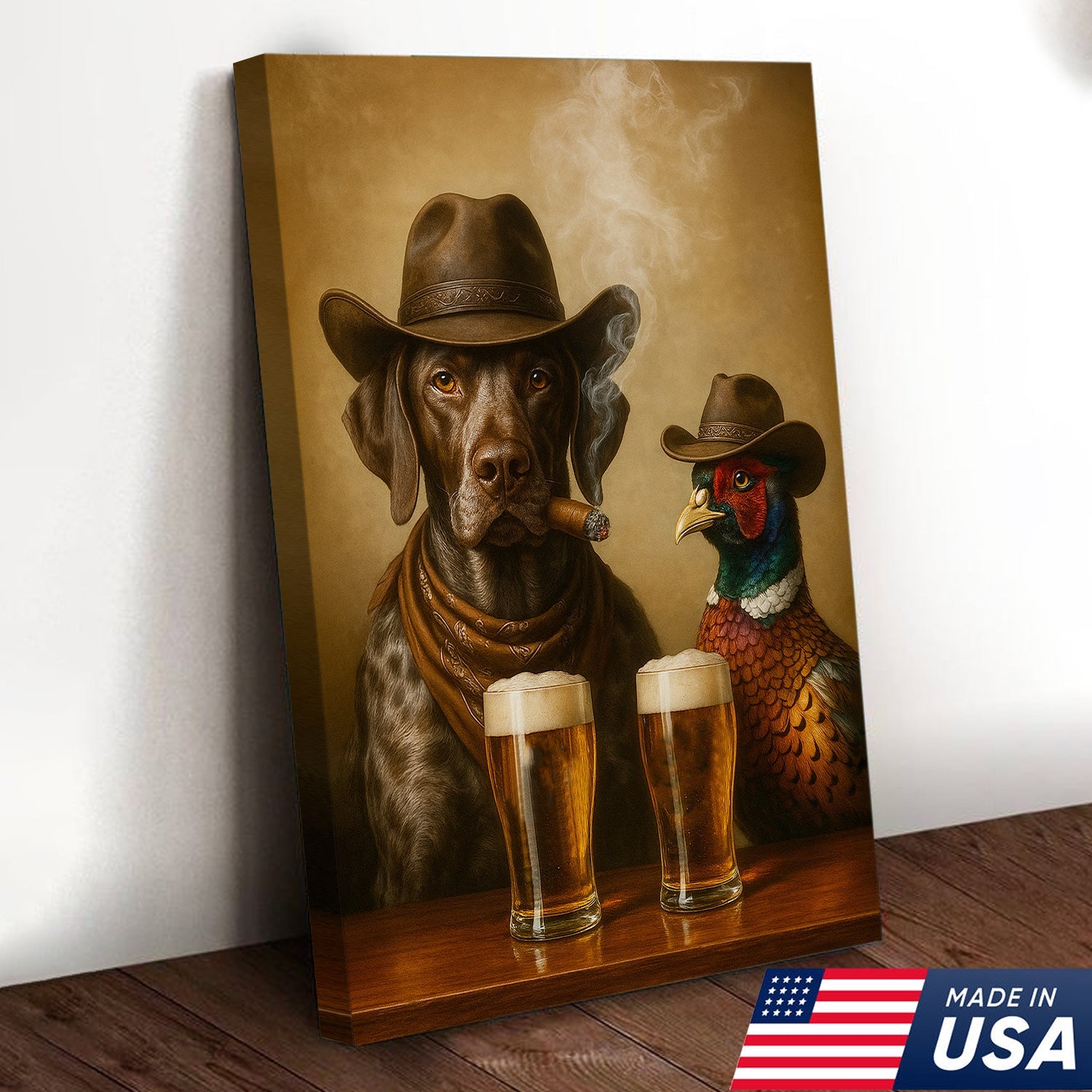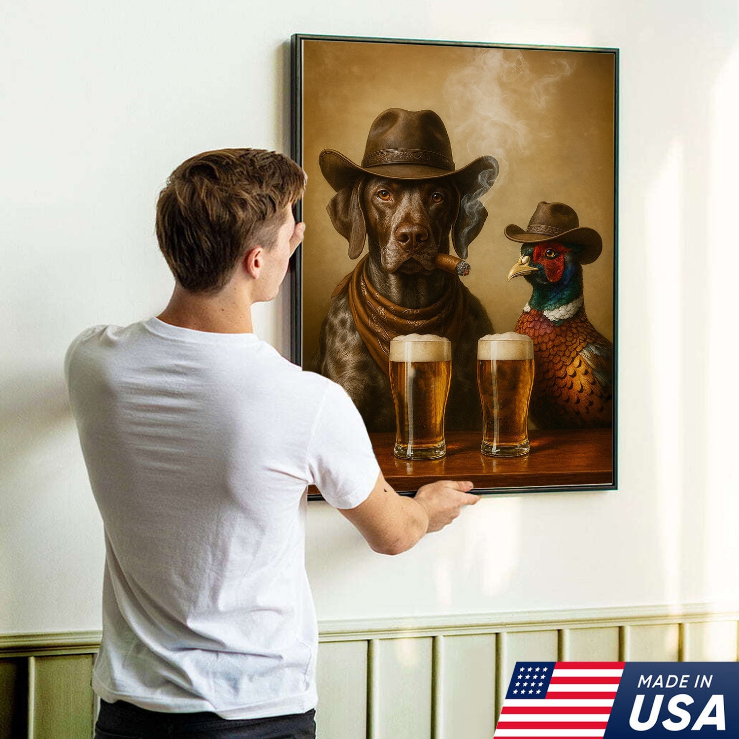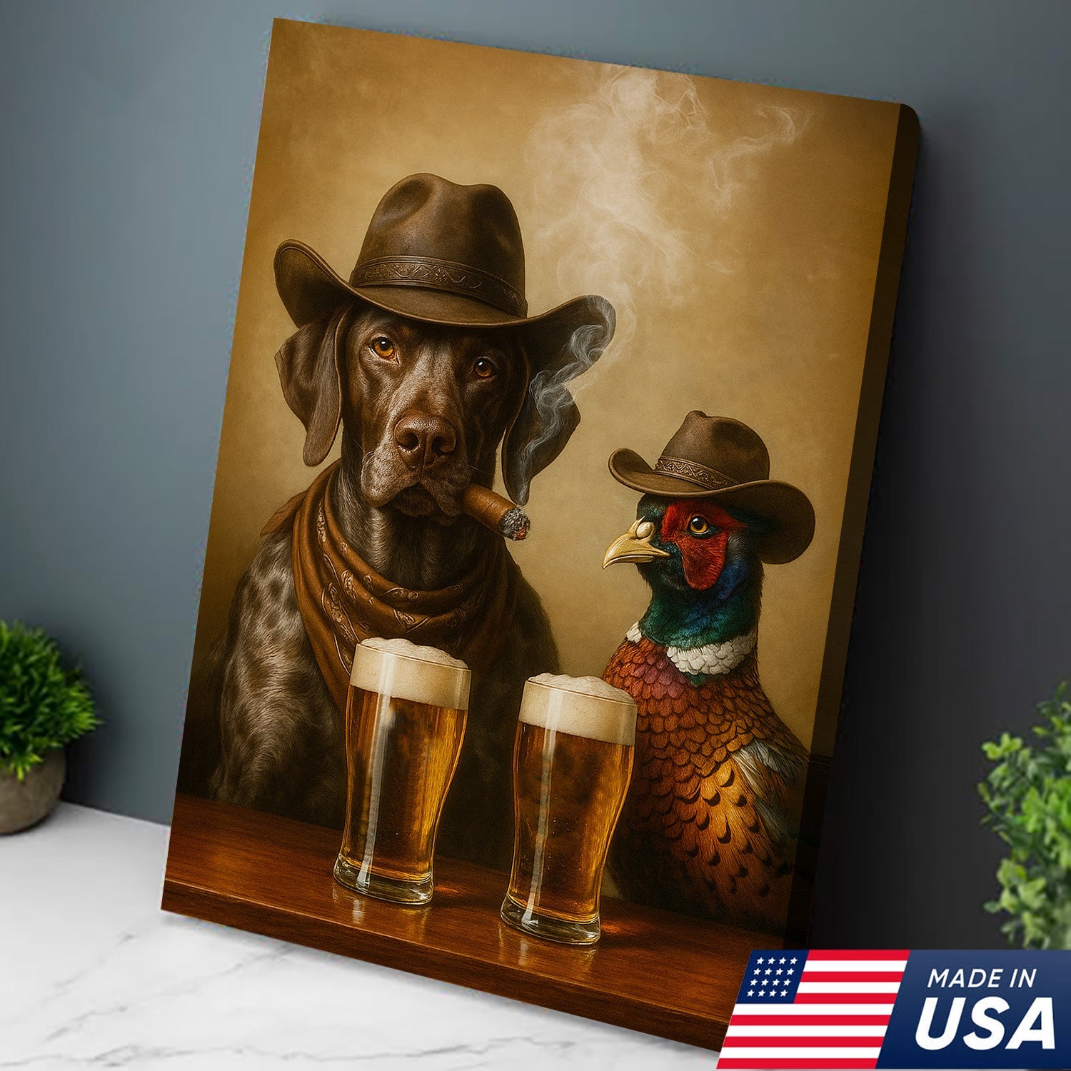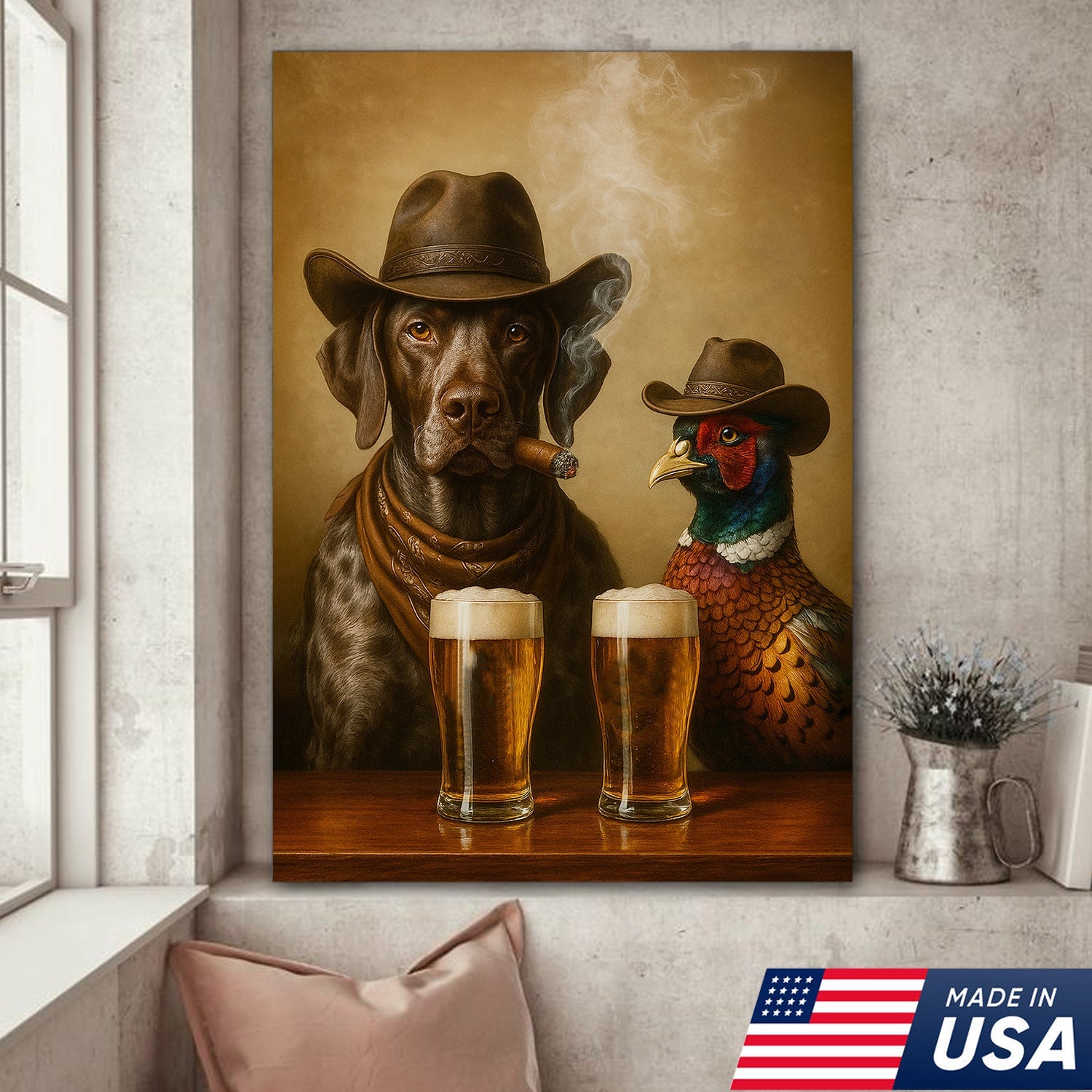Funny Dog & Pheasant Beer Canvas Wall Art – Cowboy Hunting Bar Decor Gift for Hunters & Outdoorsmen