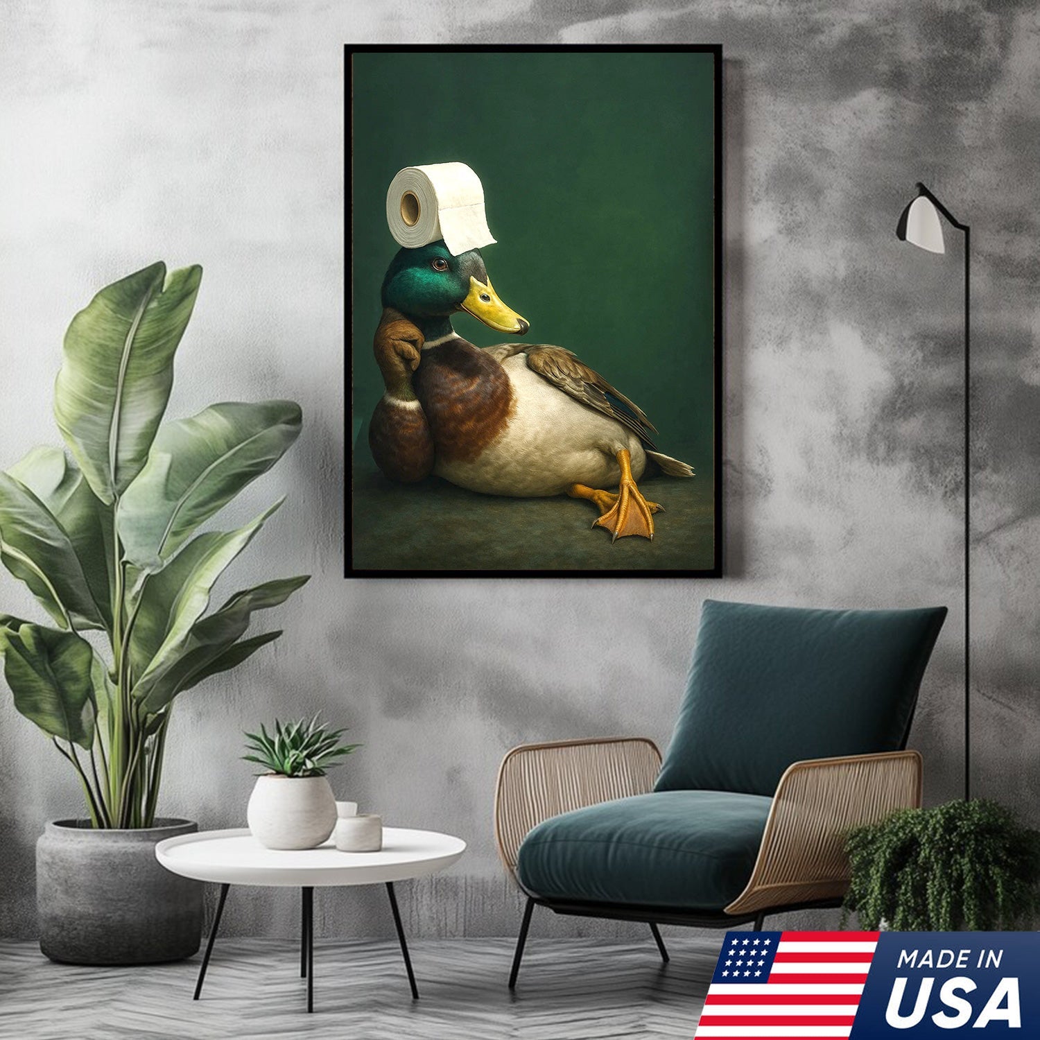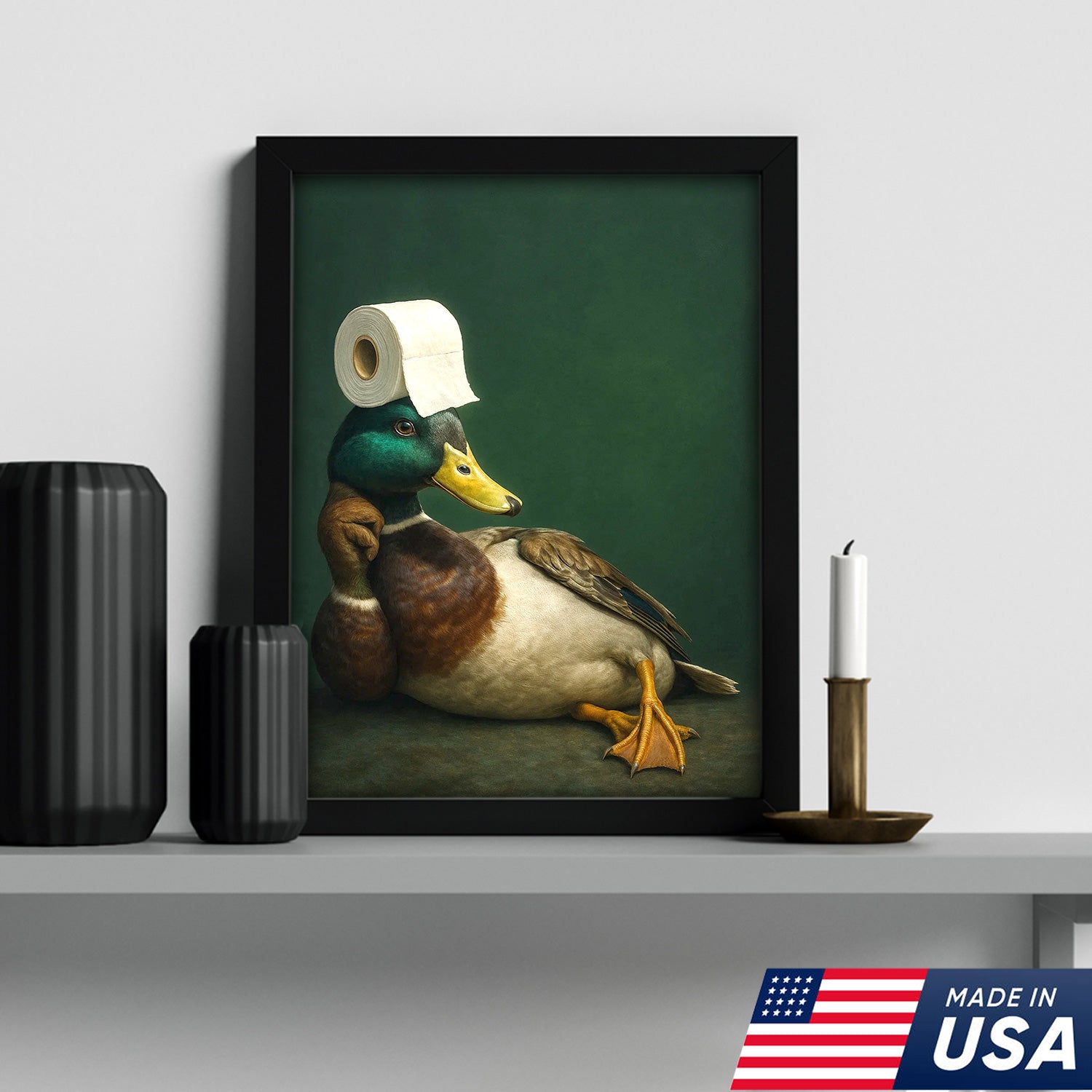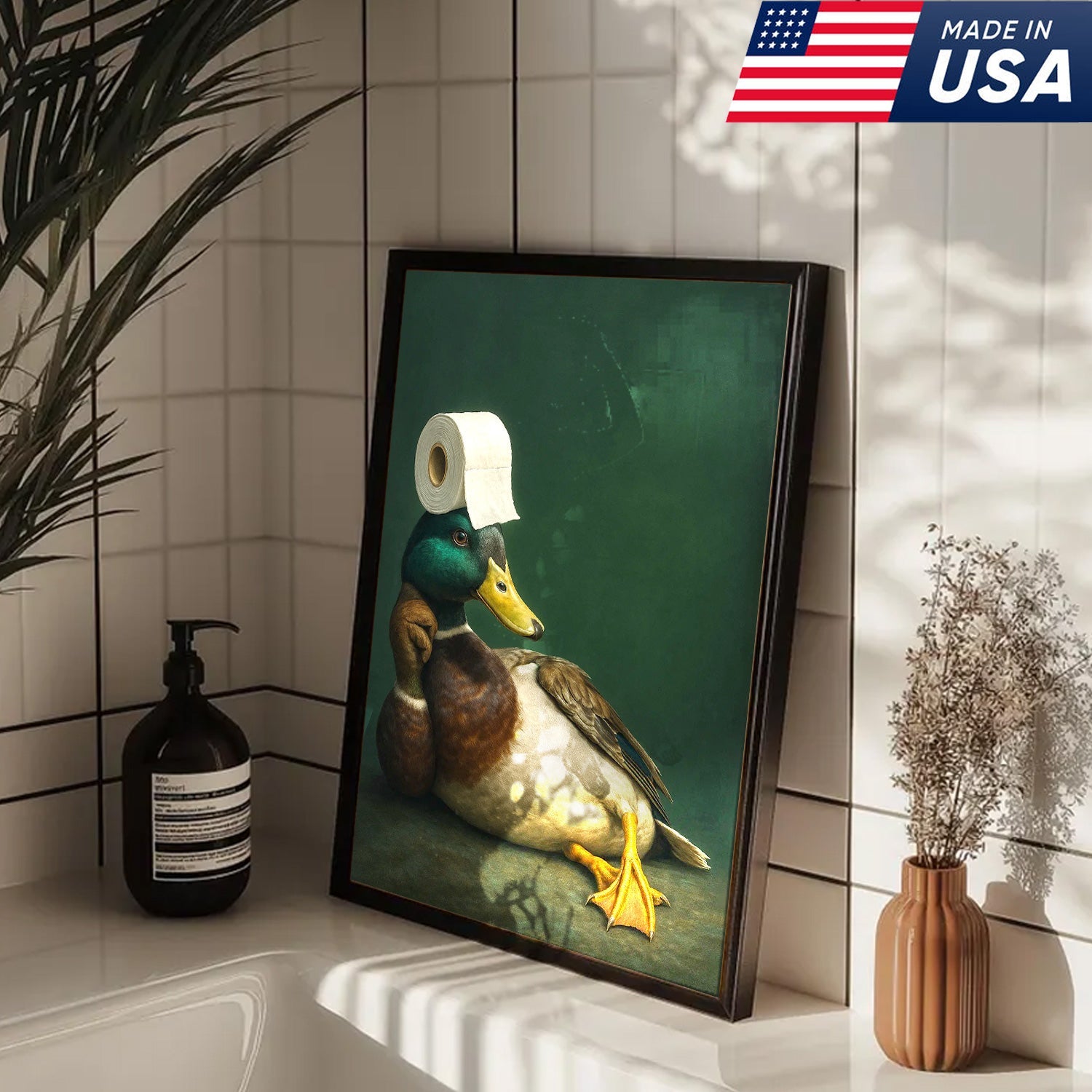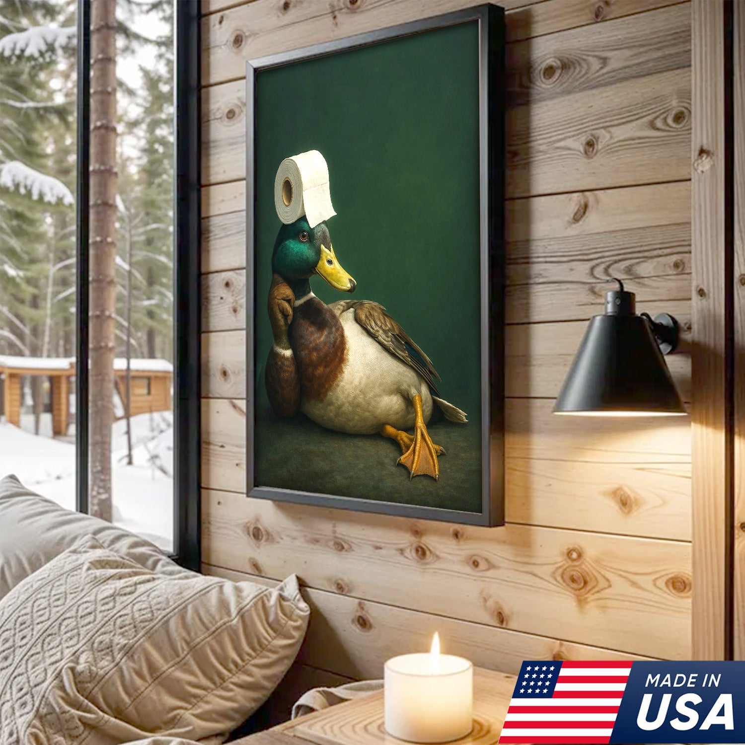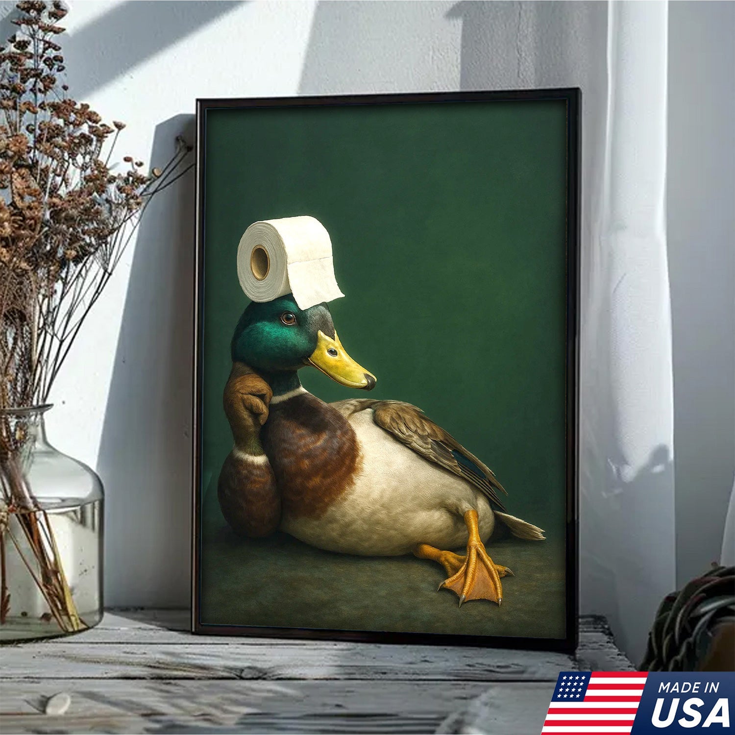 Funny Duck Bathroom Canvas Wall Art – Quirky Rustic Lodge Decor – Mallard Humor Gift Idea