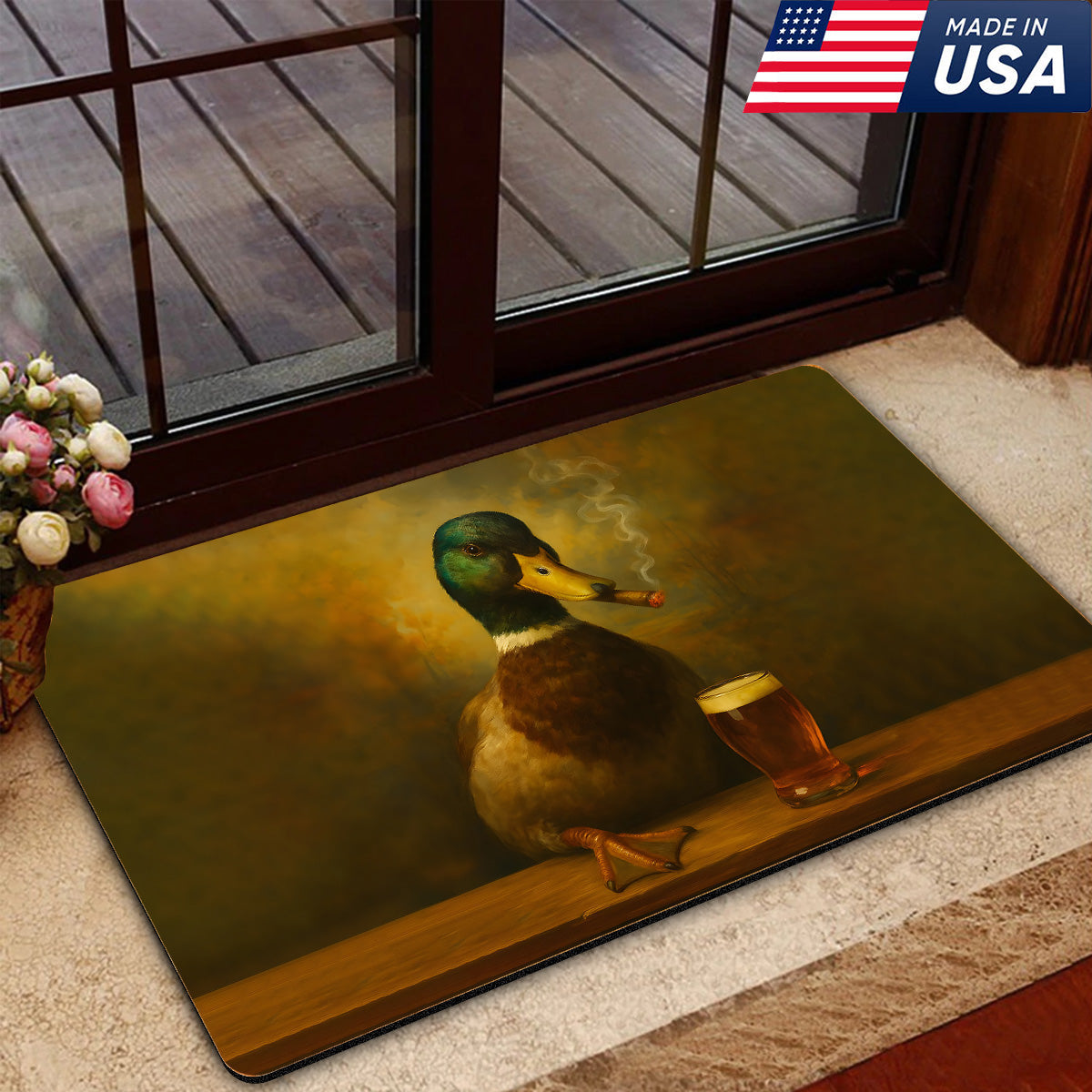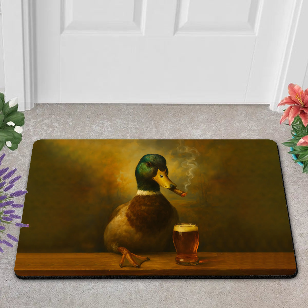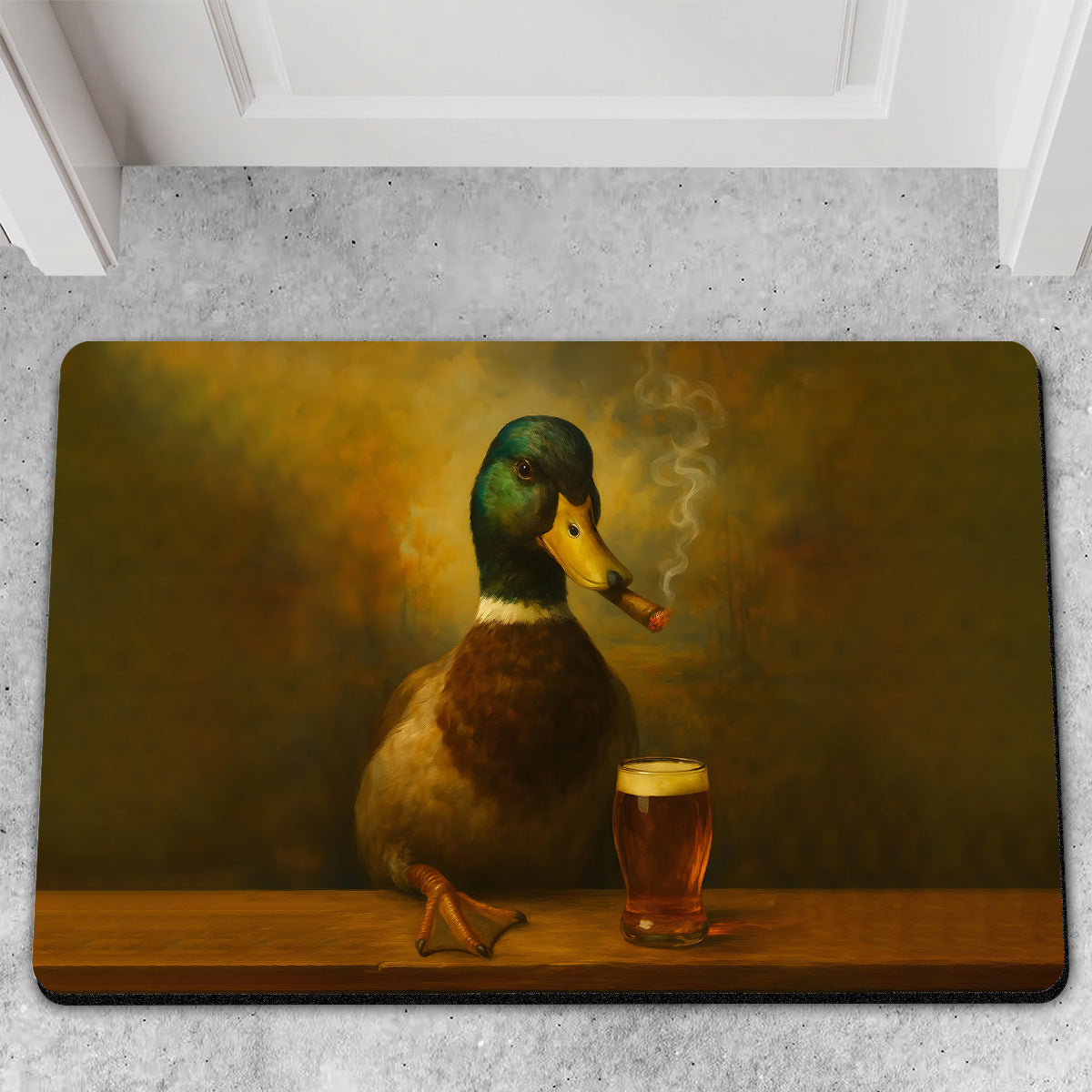 Funny Duck Barware Doormat – Hunting Lodge Rug with Drinking Glasses & Smoking-related Decor, Outdoor Cabin Decor Gift