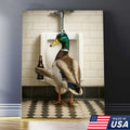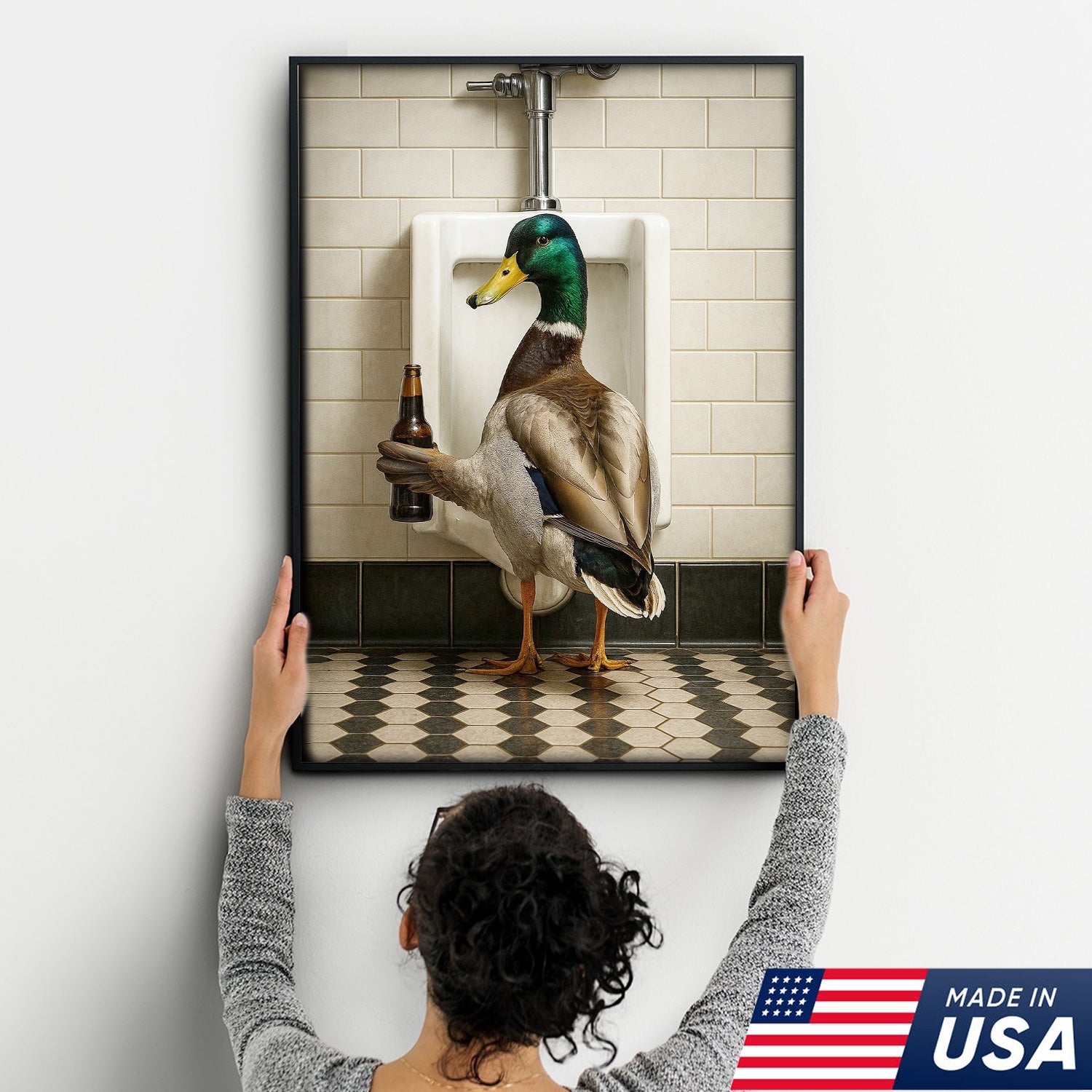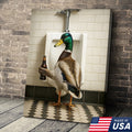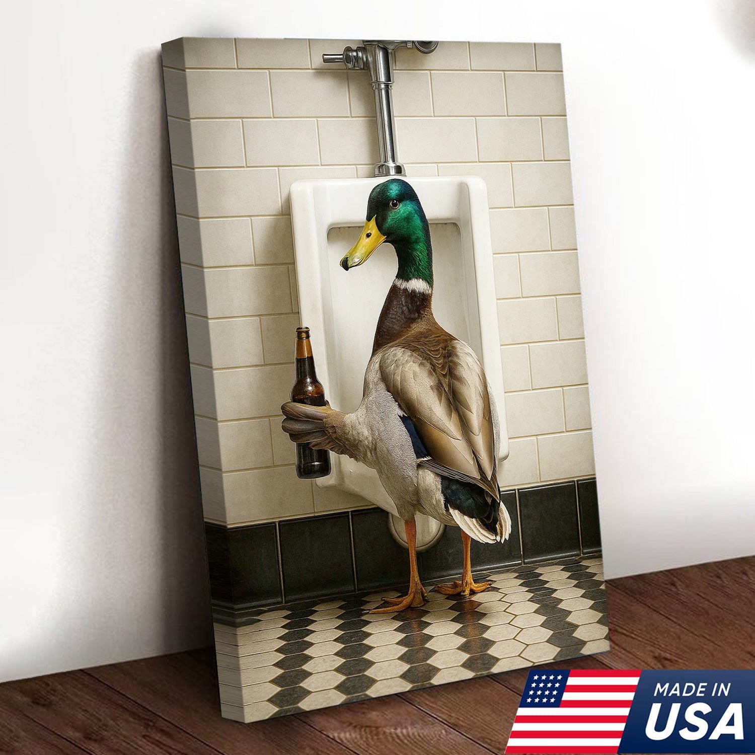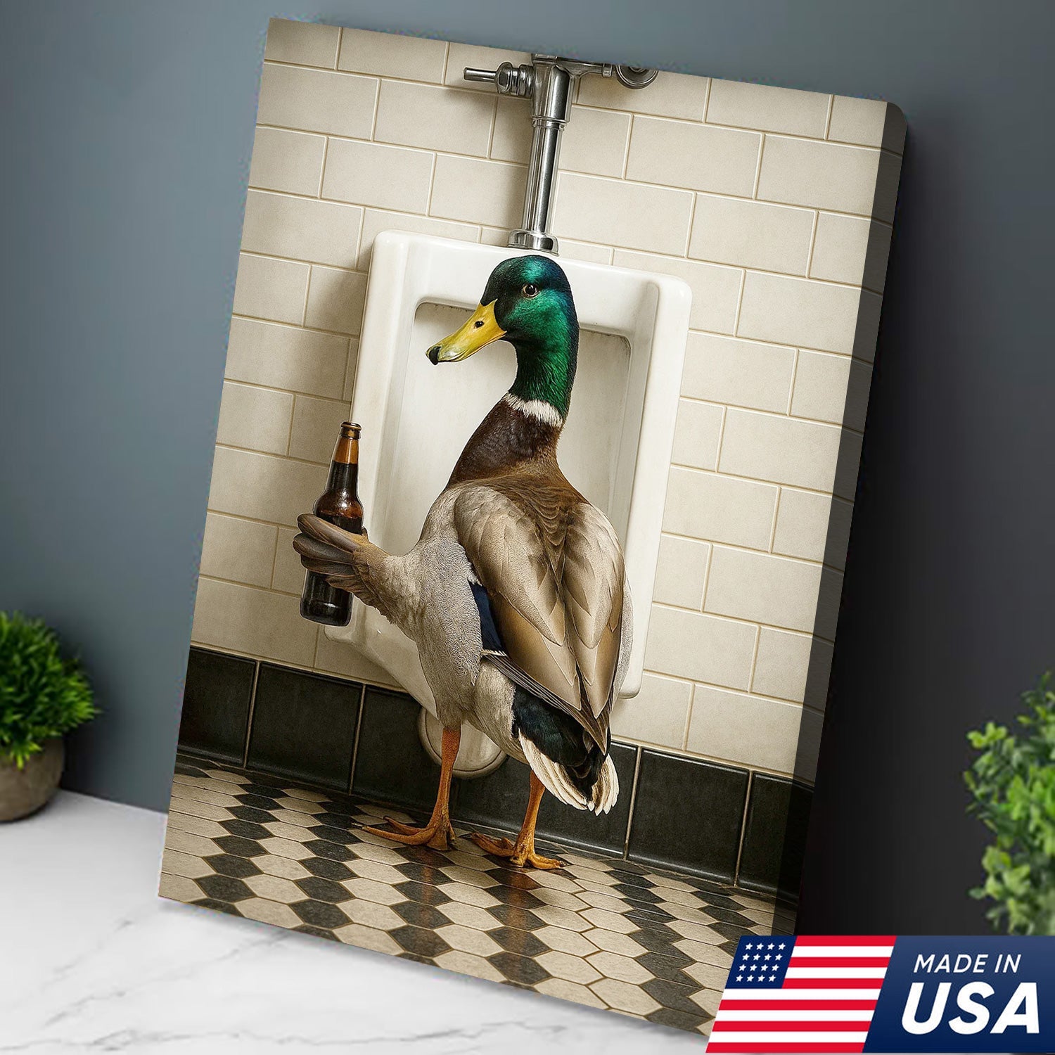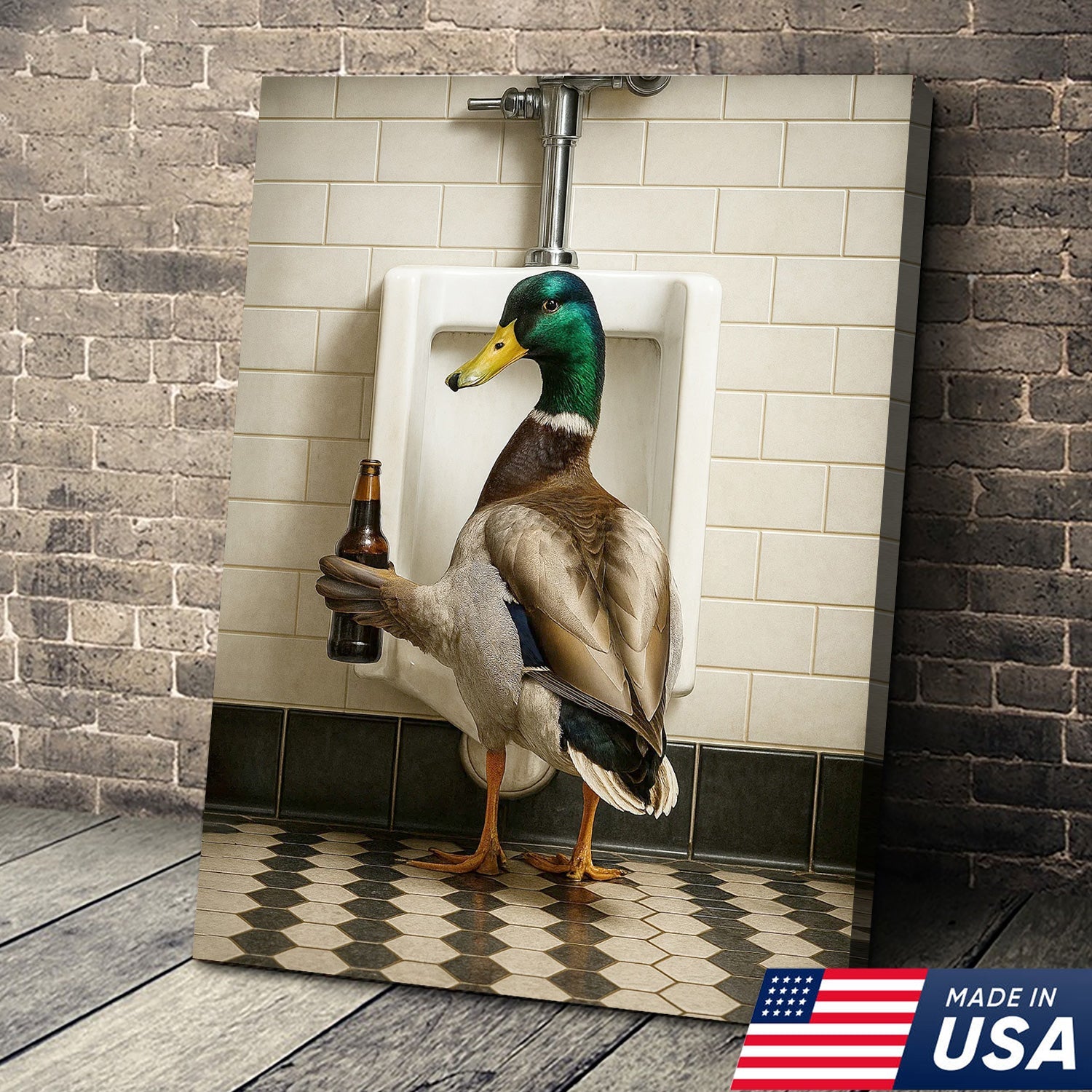 Funny Mallard Duck Holding Beer Bathroom Canvas – Duck at Urinal Wall Art, Rustic Cabin & Man Cave Decor