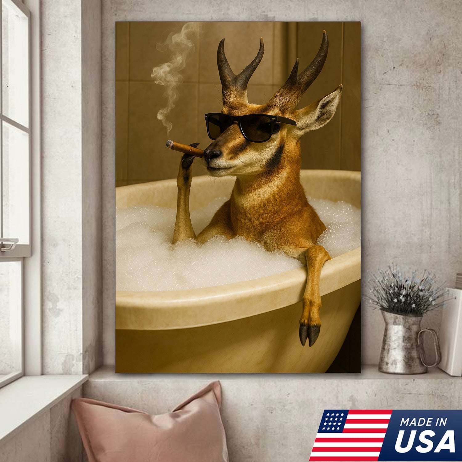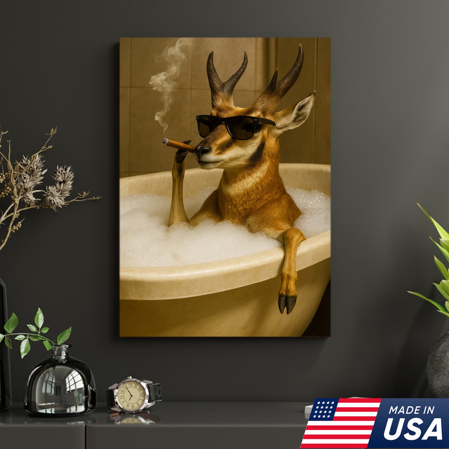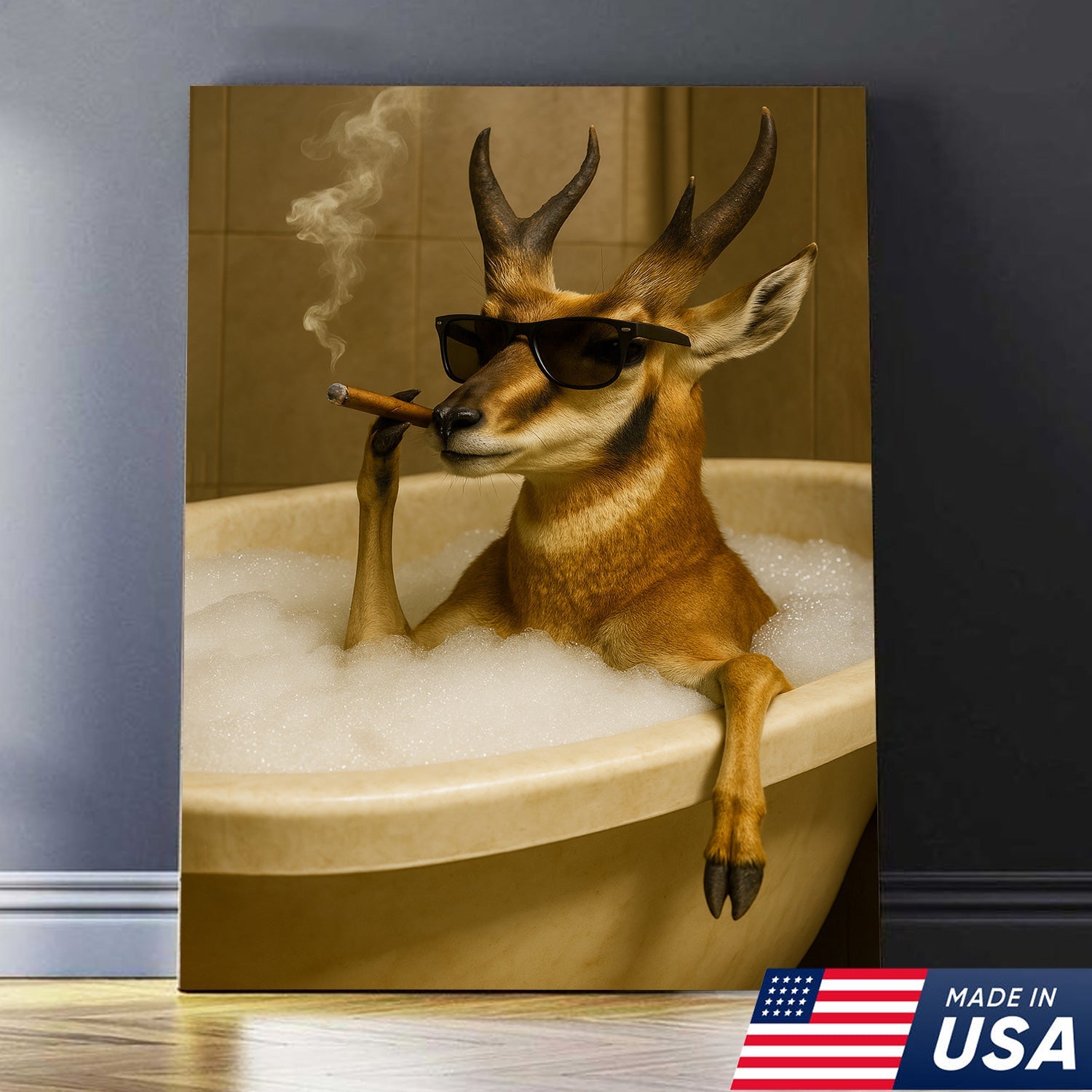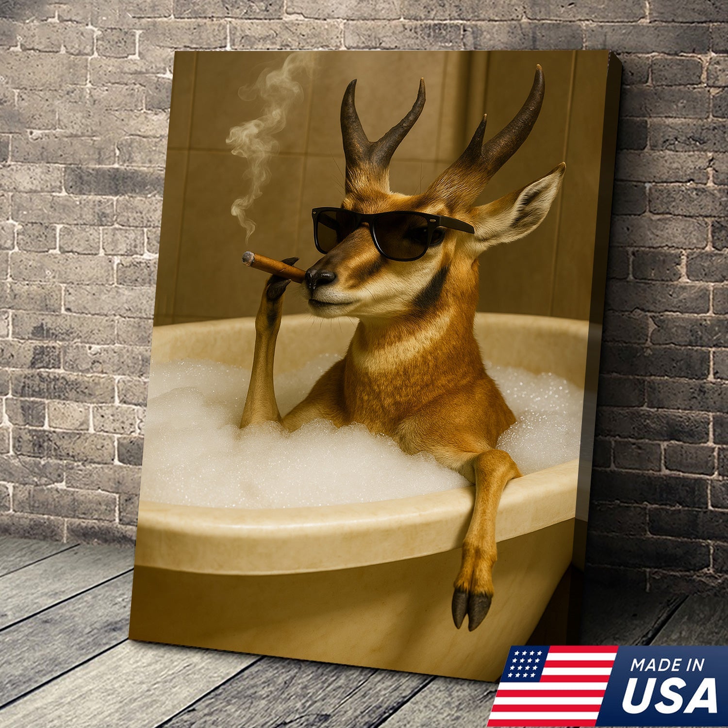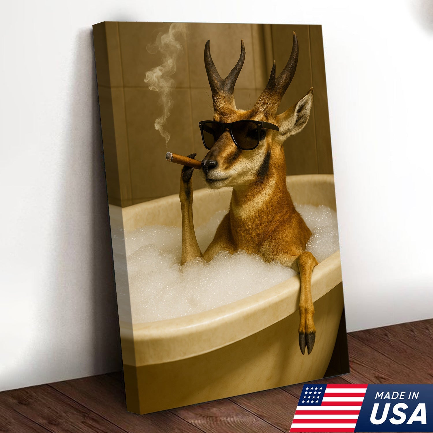 Funny Pronghorn Antelope Smoking Canvas Wall Art – Cool Bathtub & Cigar Gift for Hunters, Outdoorsmen & Cabin Decor