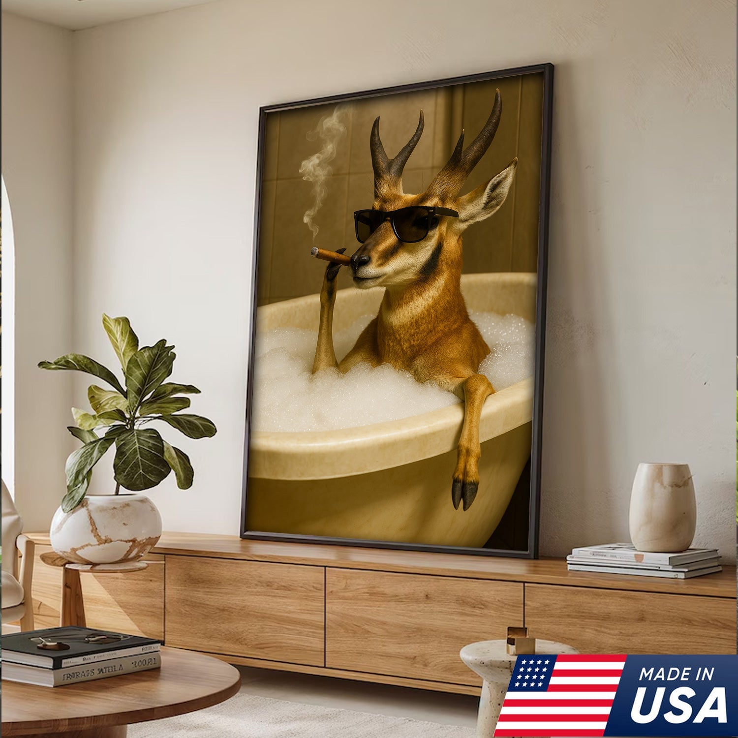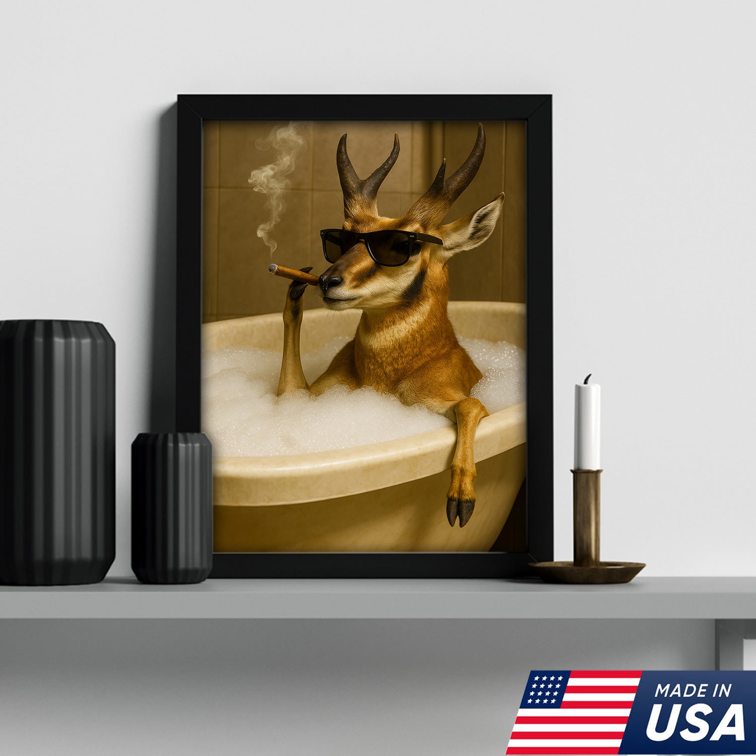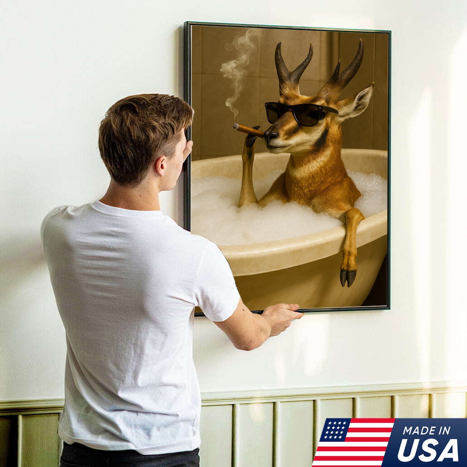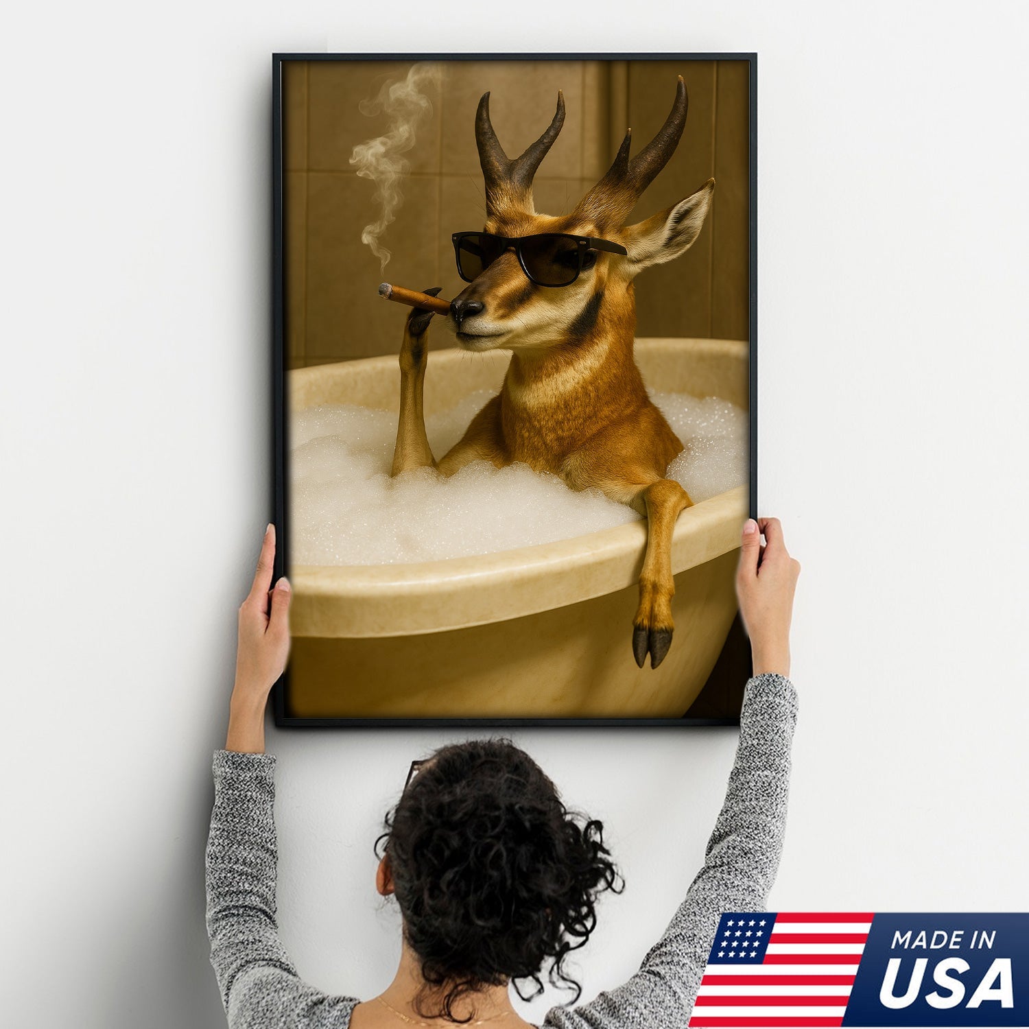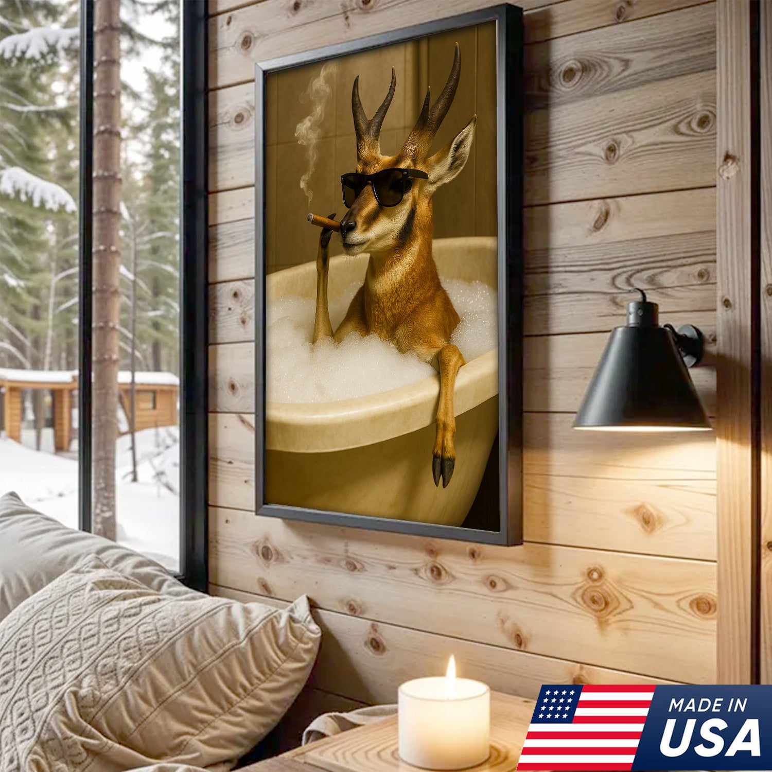 Funny Pronghorn Antelope Smoking Canvas Wall Art – Cool Bathtub & Cigar Gift for Hunters, Outdoorsmen & Cabin Decor