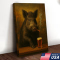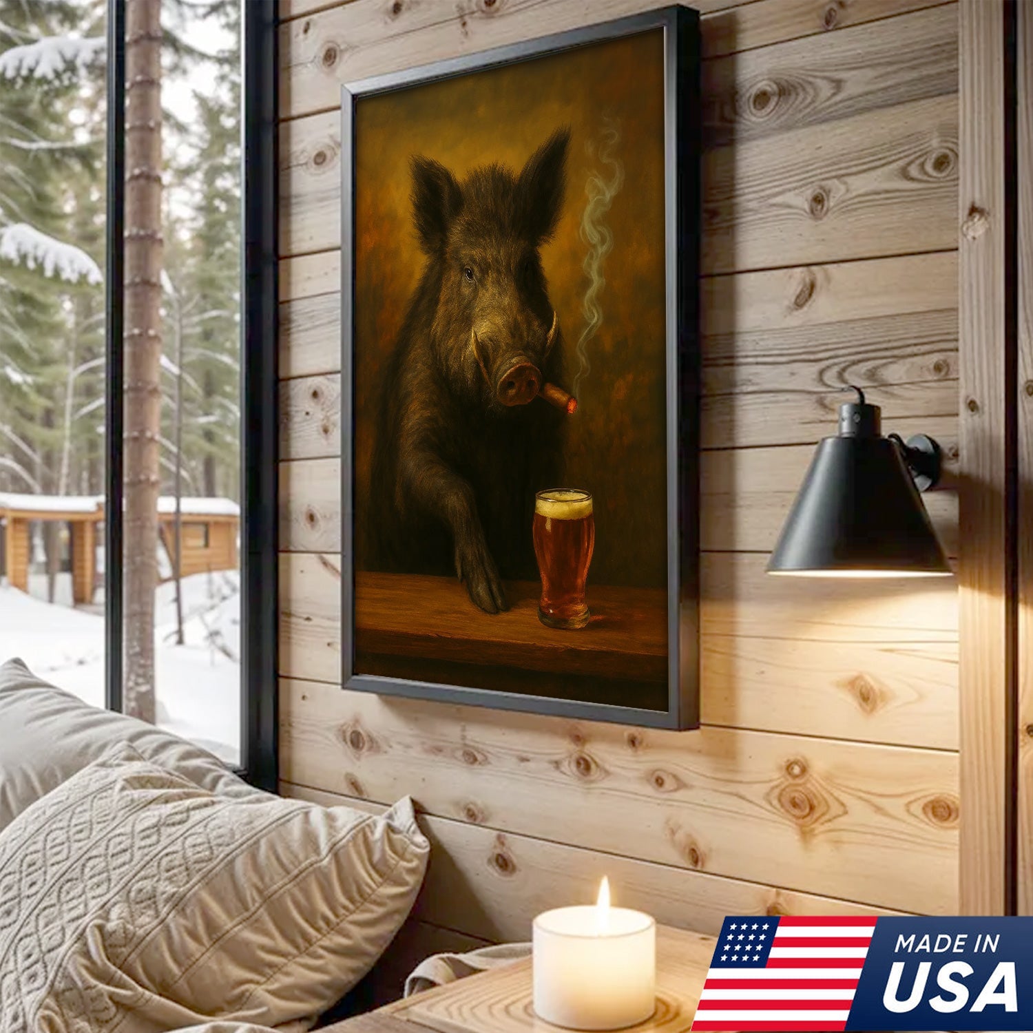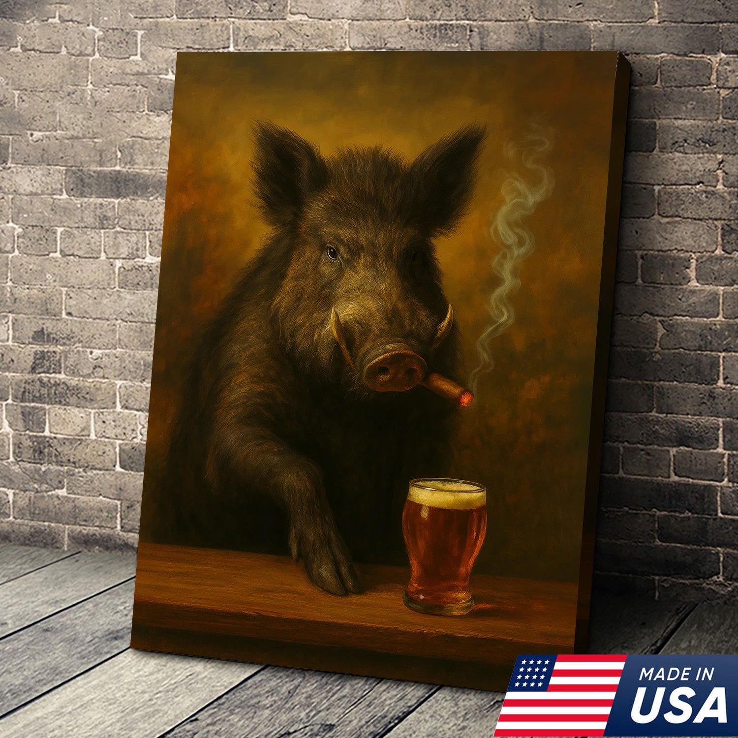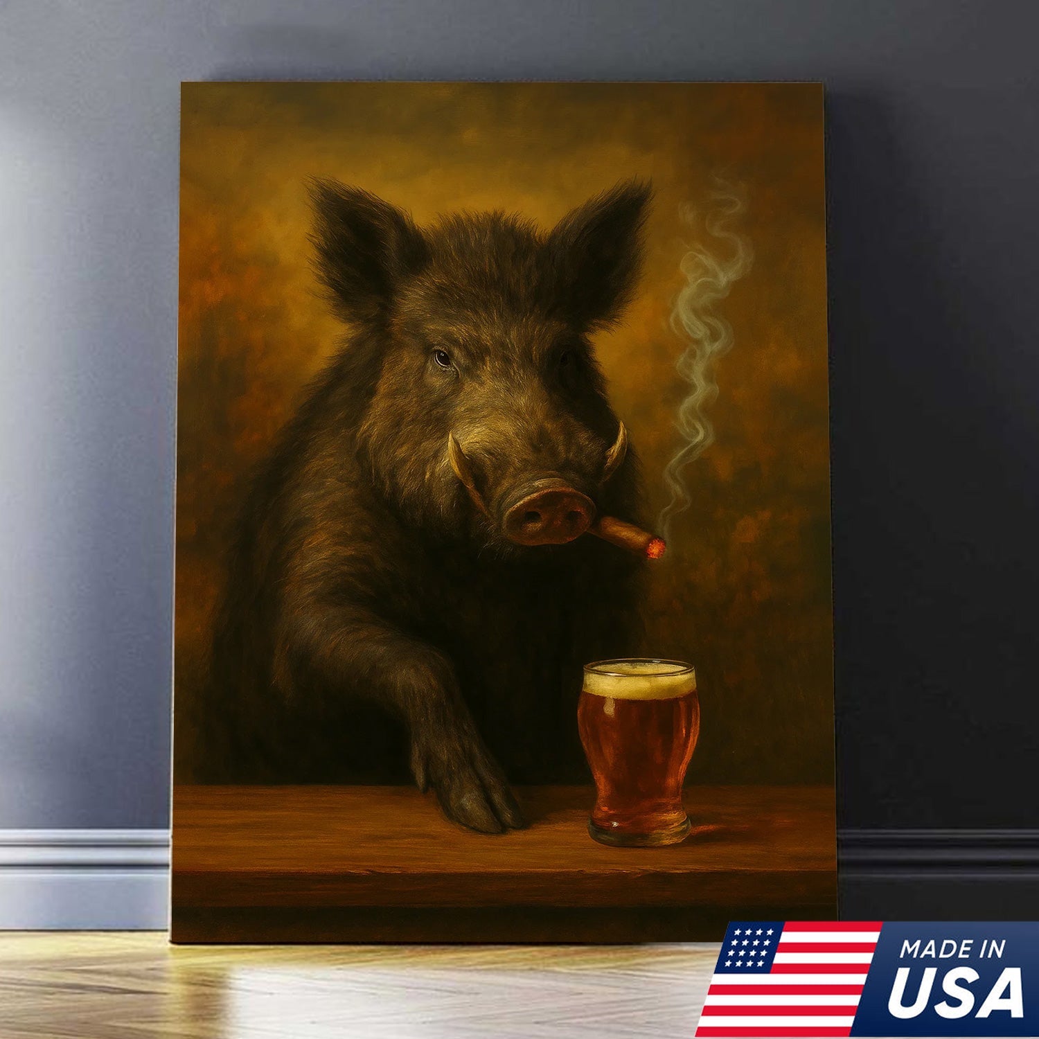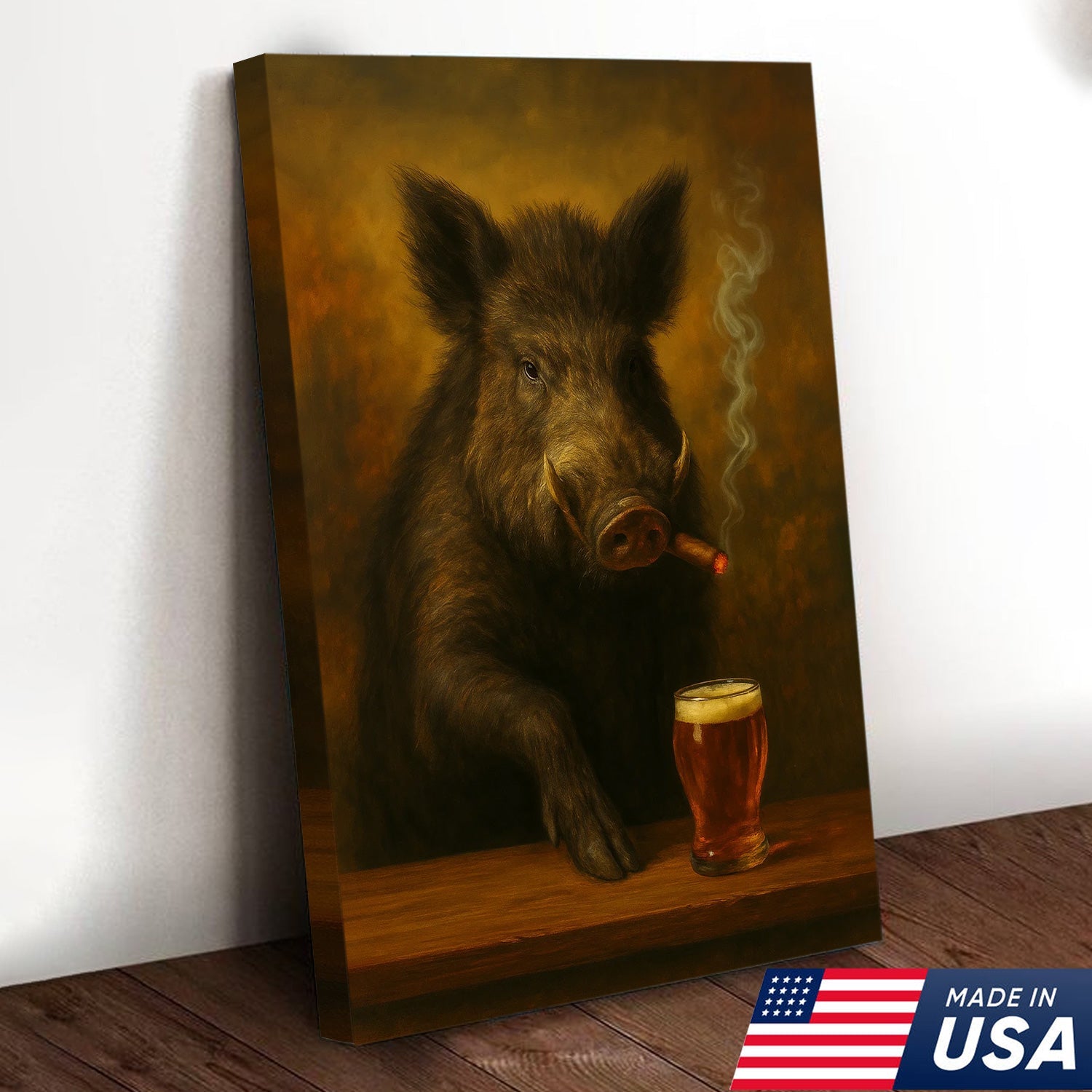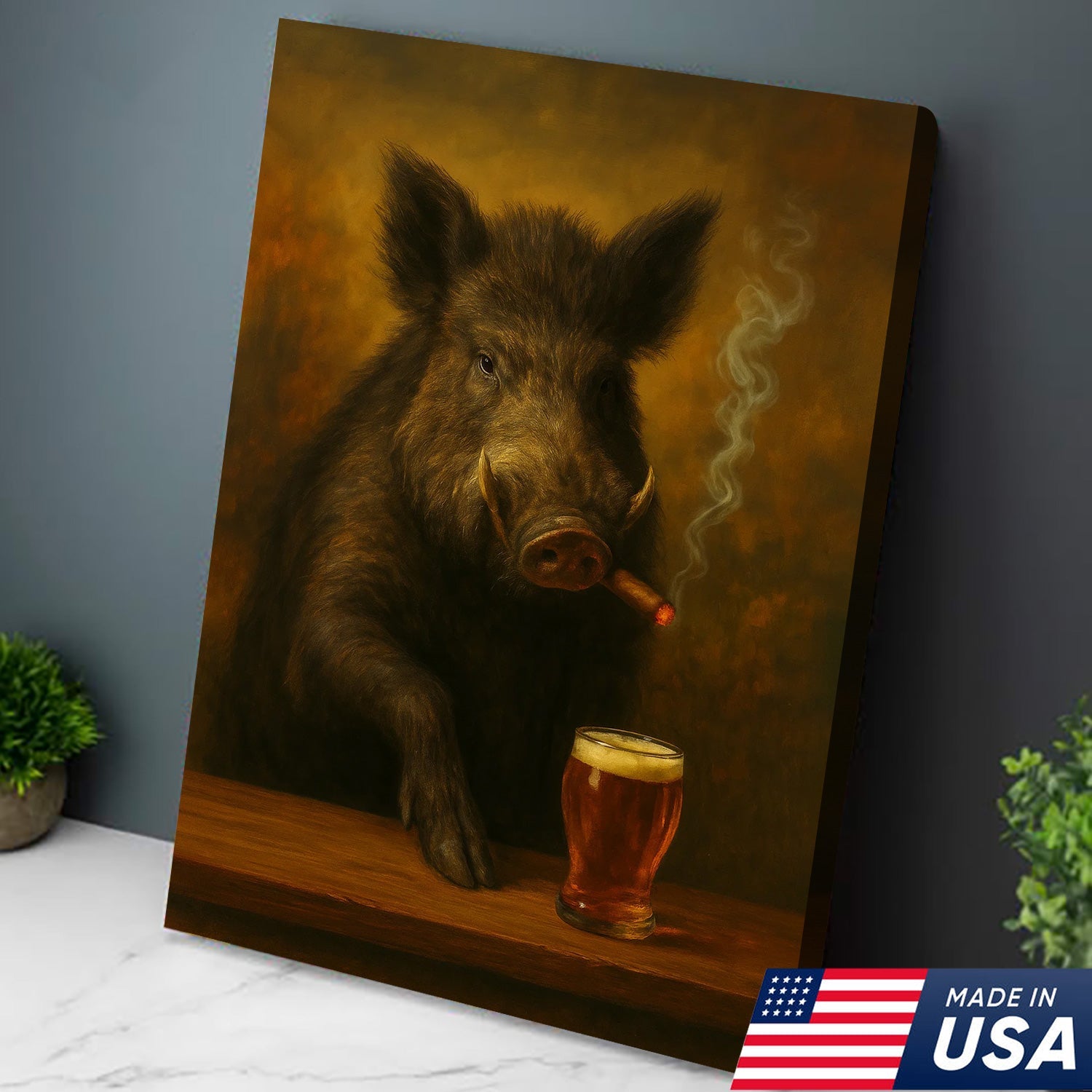 Funny Wild Boar Smoking with Cocktail Glasses Canvas – Rustic Hunting Lodge Wall Art