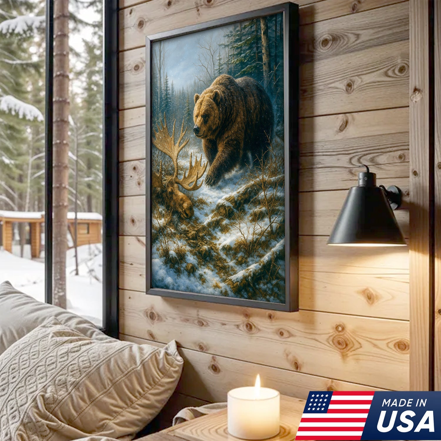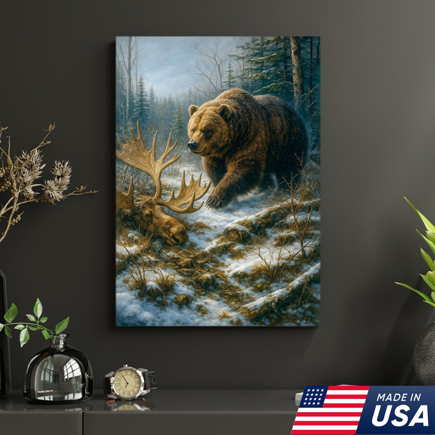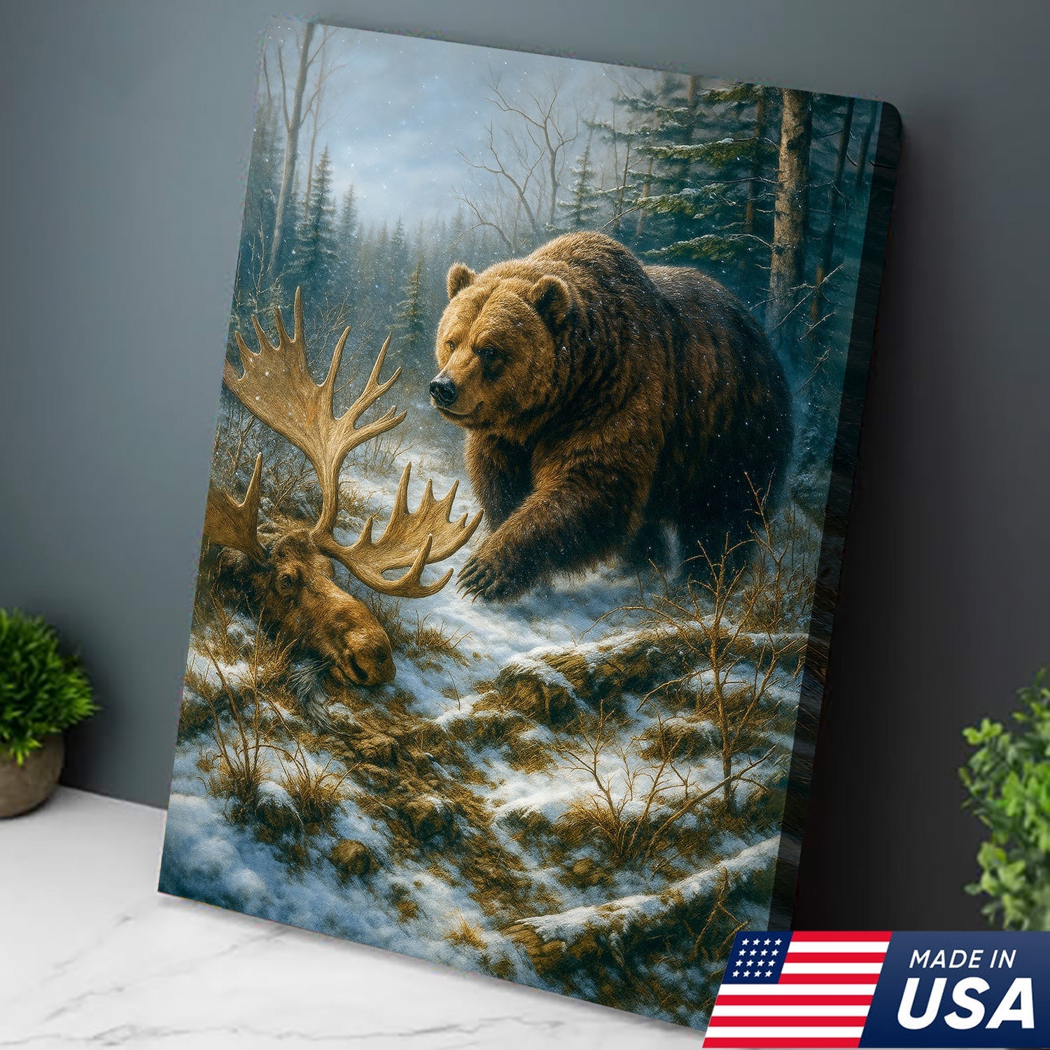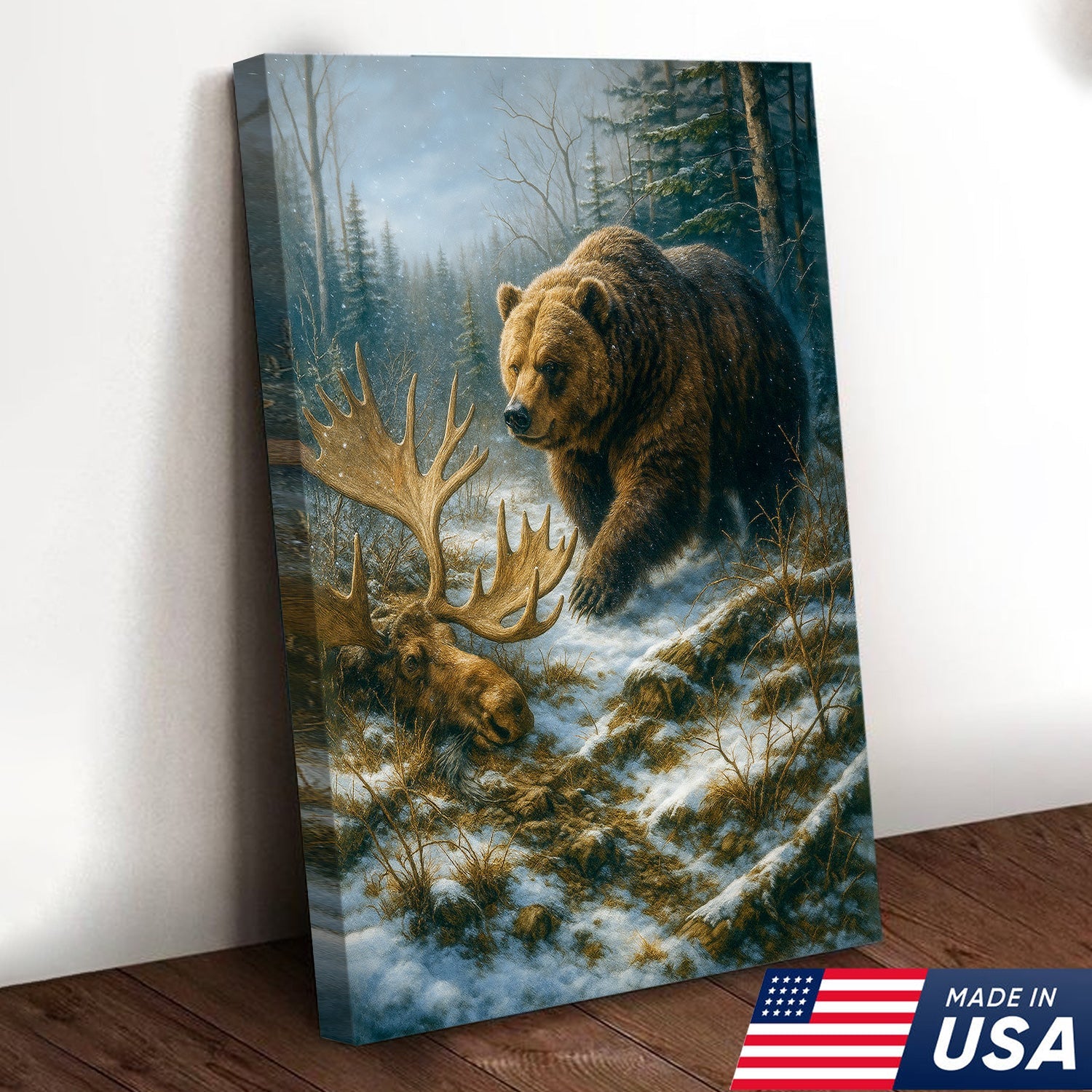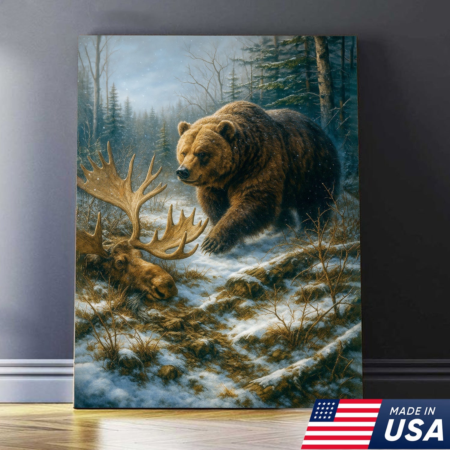 Grizzly Bear and Moose Wilderness Wall Art – Rustic Hunting Canvas for Cabin & Lodge Decor