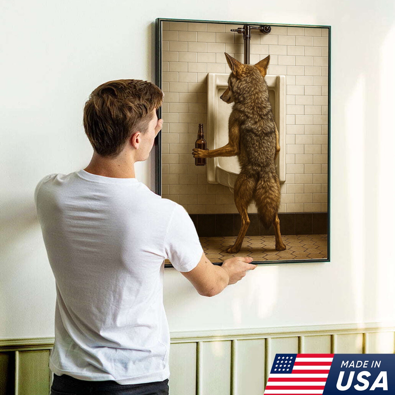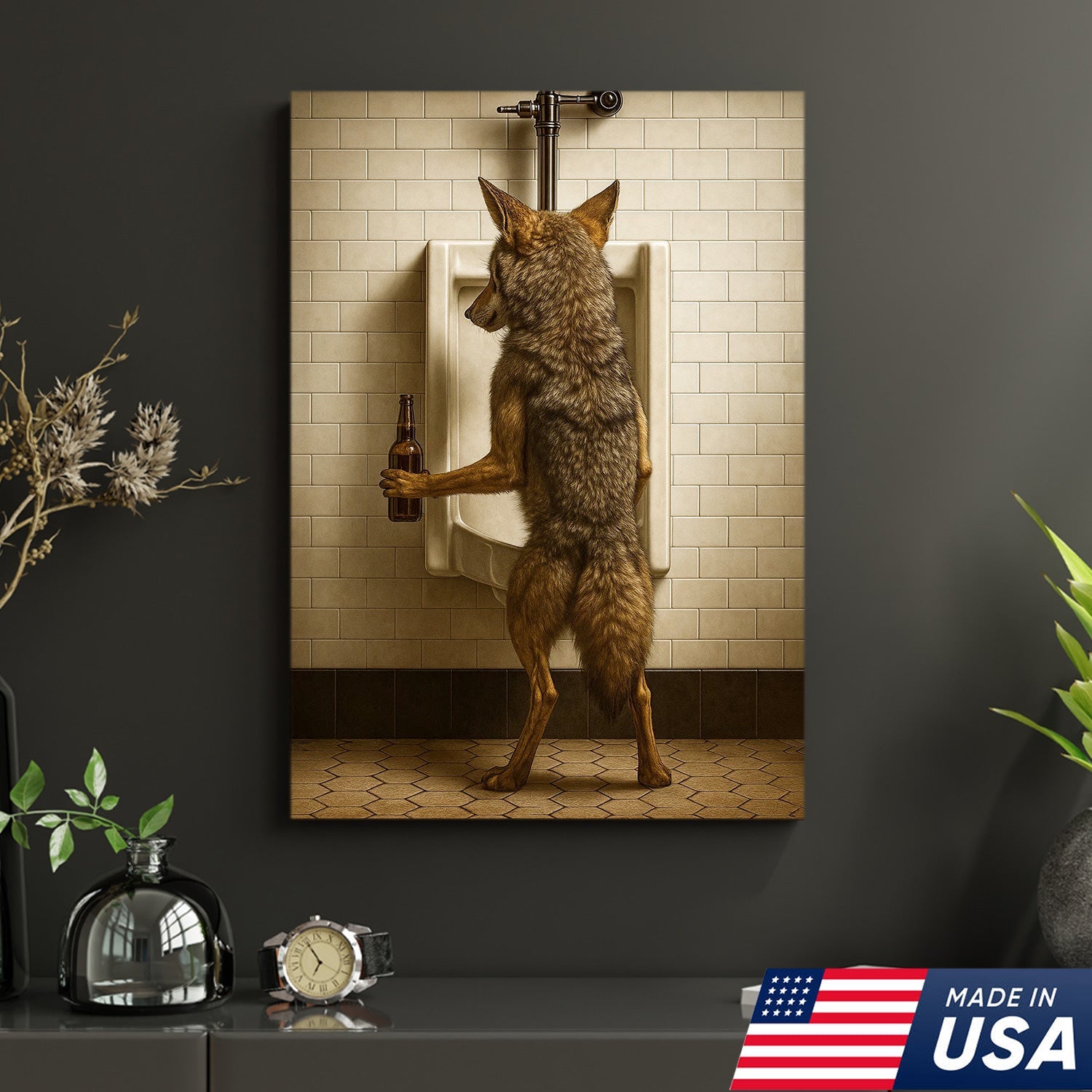 Hilarious Coyote Canvas Wall Art – Funny Bathroom Humor Decor – Rustic Hunting Cabin Gag Gift – Quirky Lodge Animal Artwork