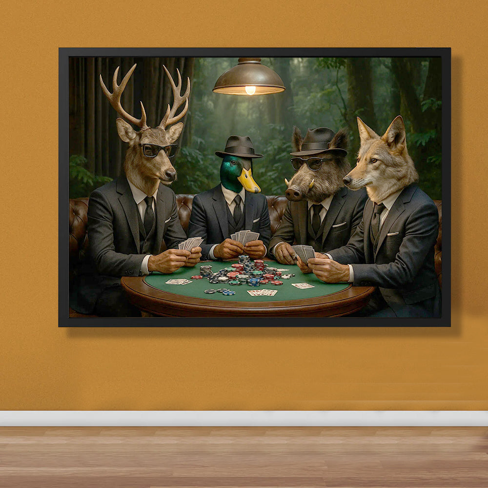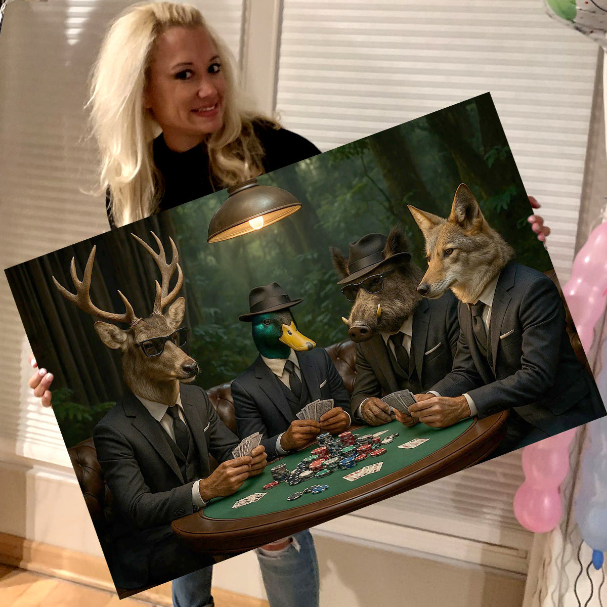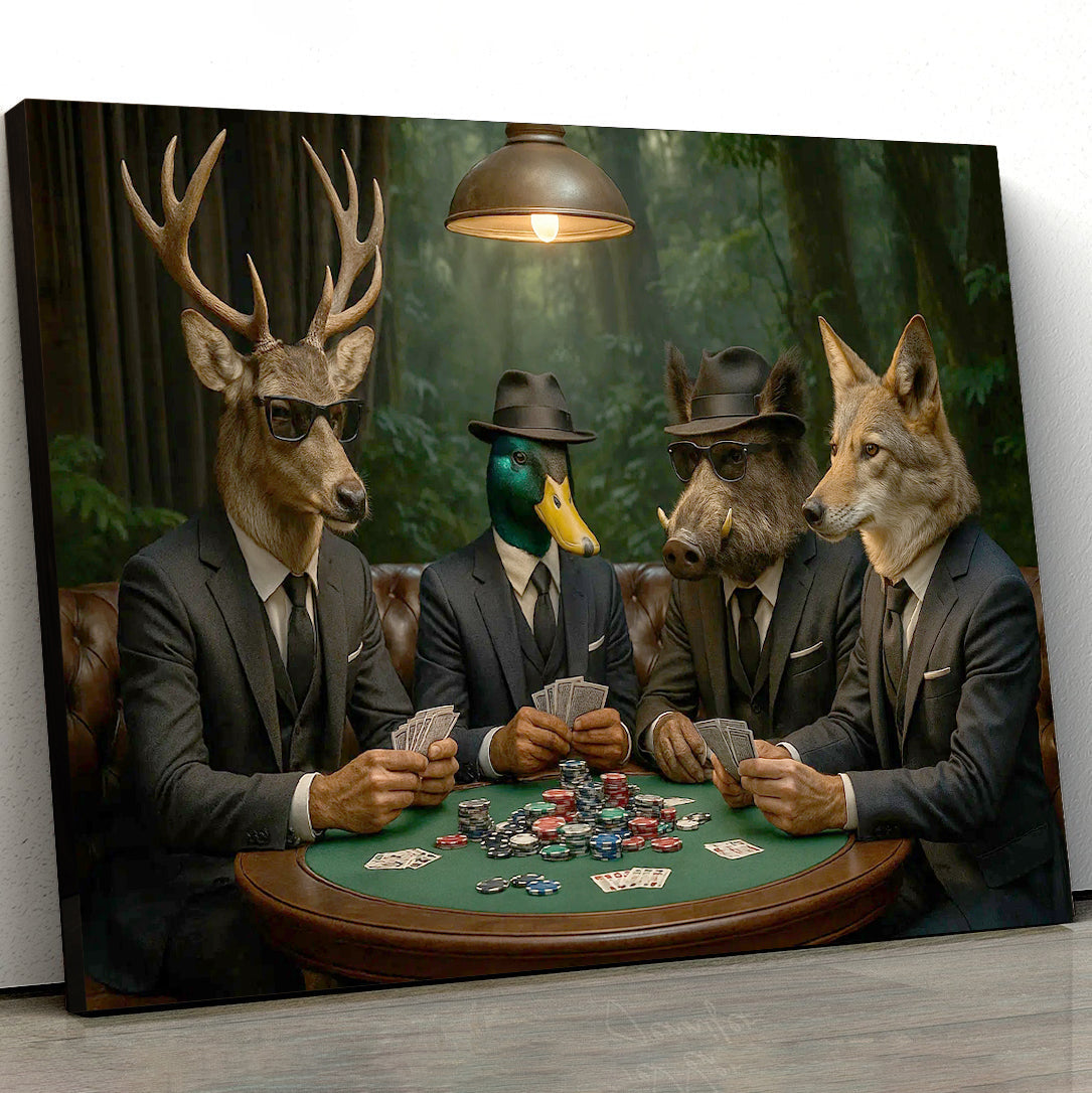 Hunter Animals Playing Poker Canvas - Deer, Duck, Boar & Coyote Poker Print – Man Cave Wall Decor