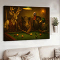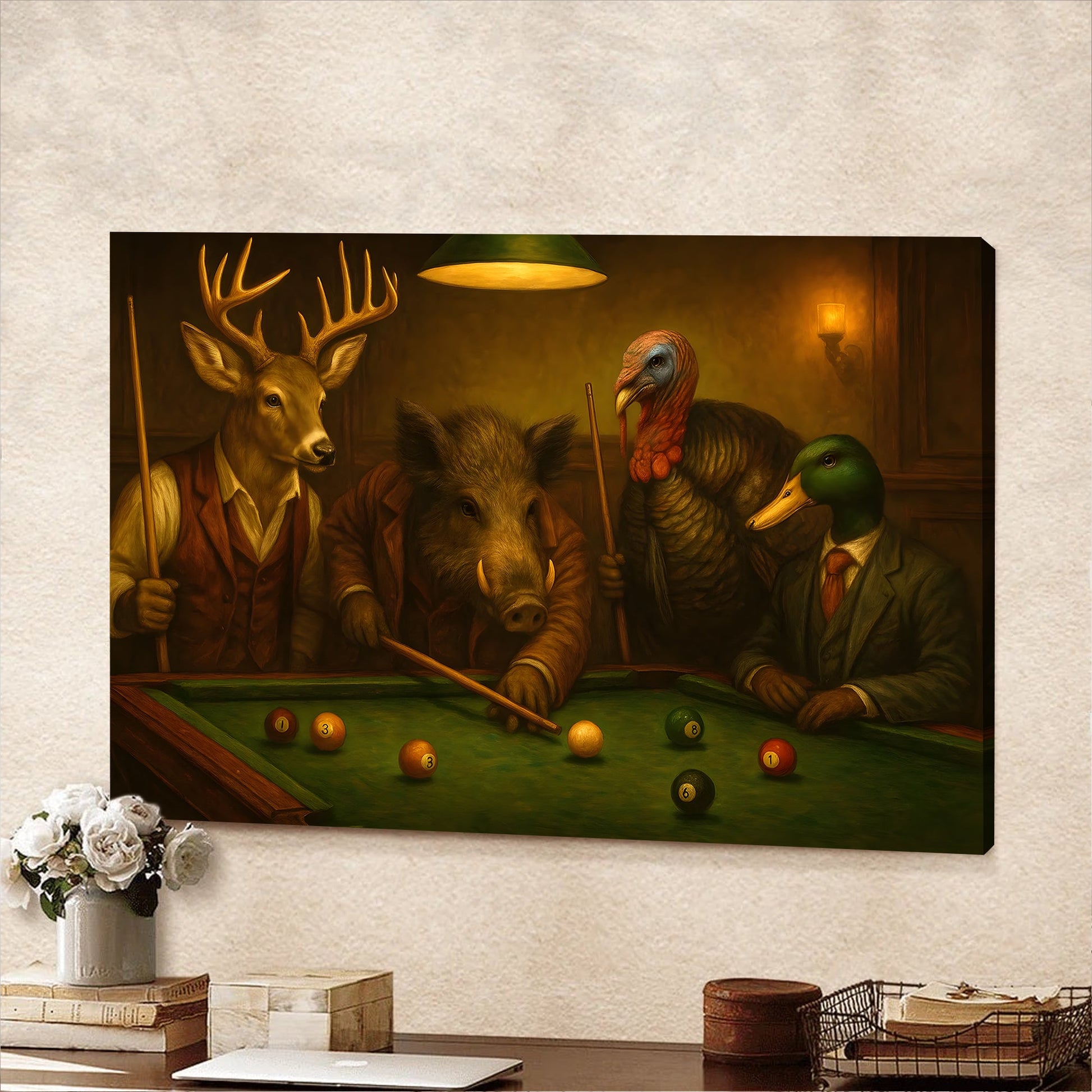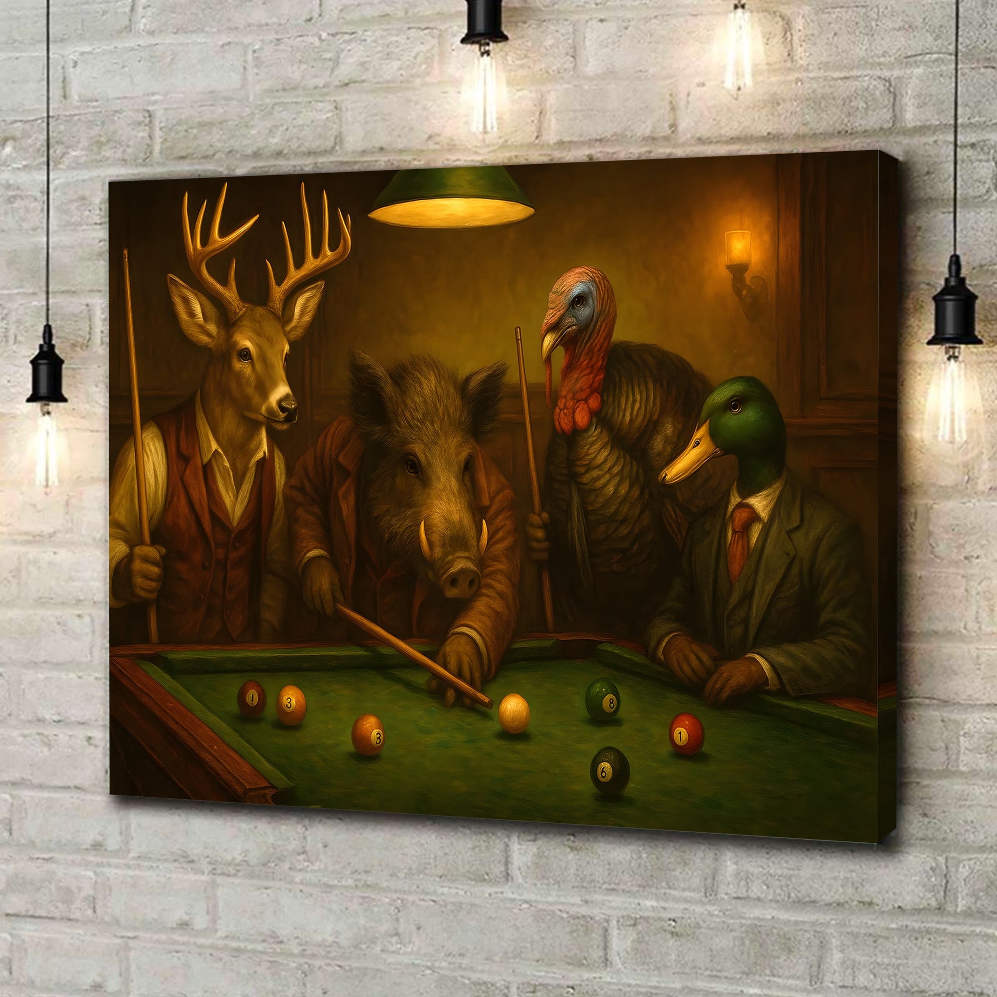 Hunter’s Billiard Crew Canvas Wall Art – Deer, Boar, Duck & Turkey Playing Pool – Rustic Hunting Cave & Lodge Decor
