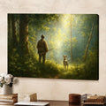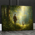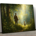 Hunting Canvas Wall Art – Hunter and Dog in Sunlit Forest – Rustic Cabin Decor for Wildlife and Outdoor Enthusiasts
