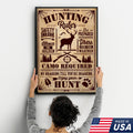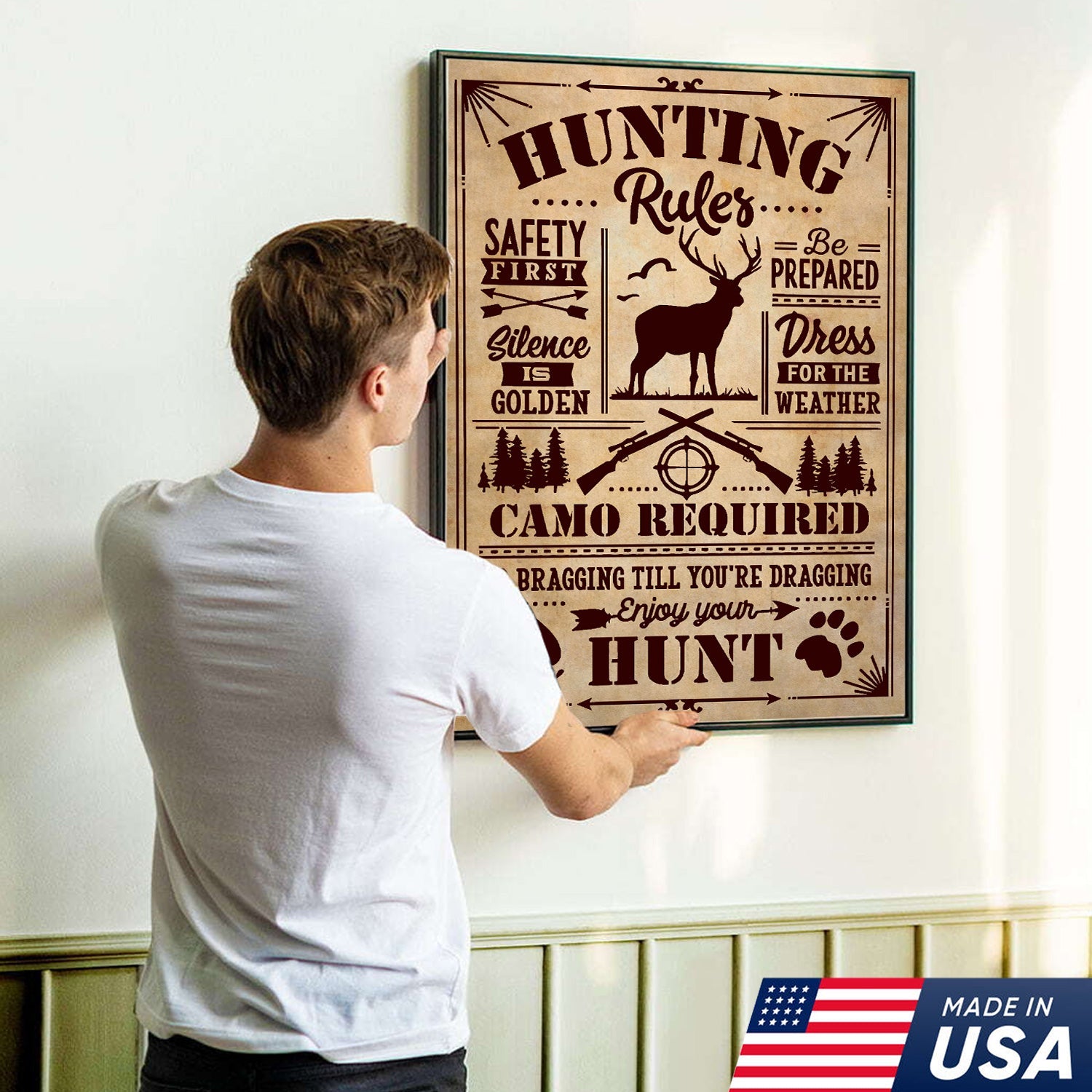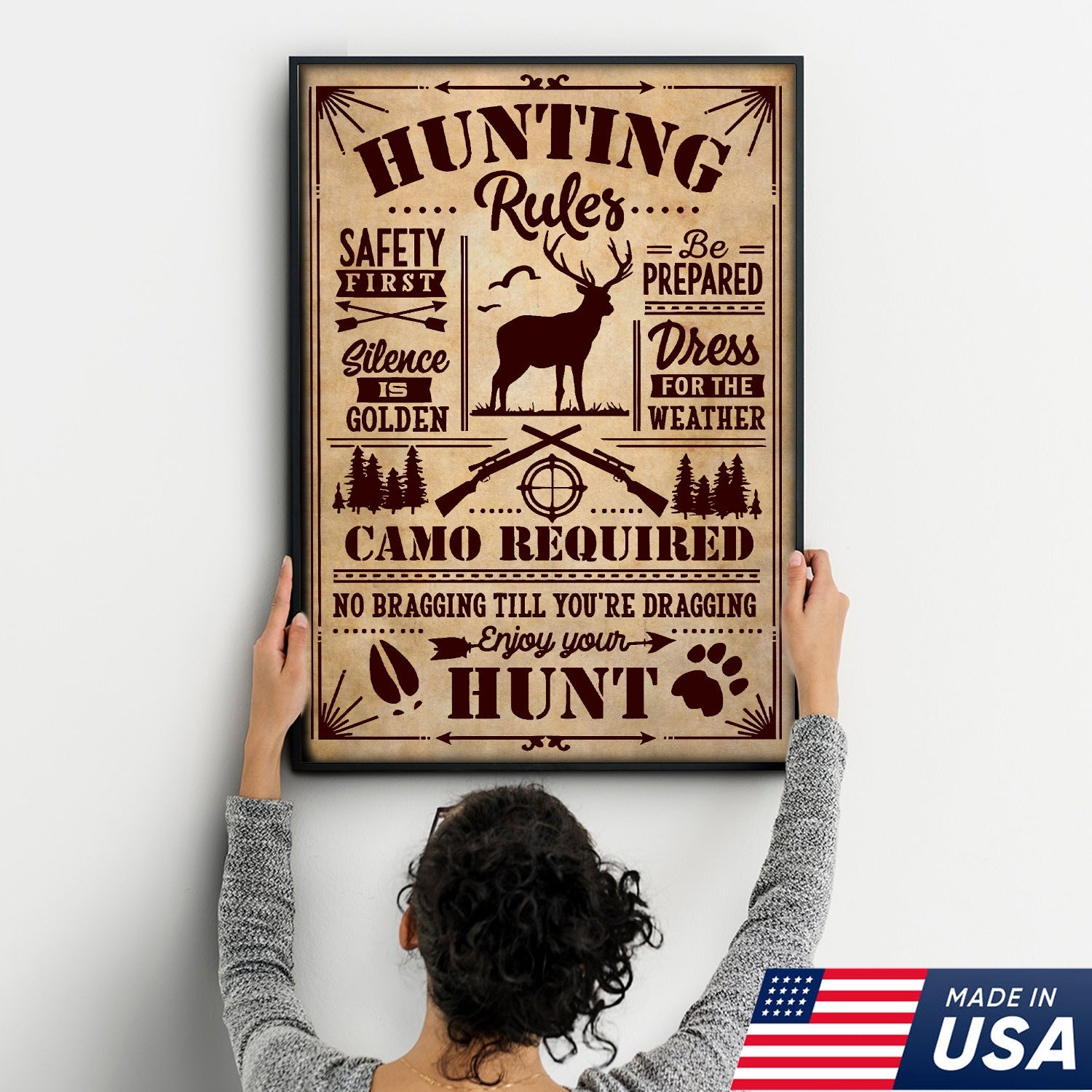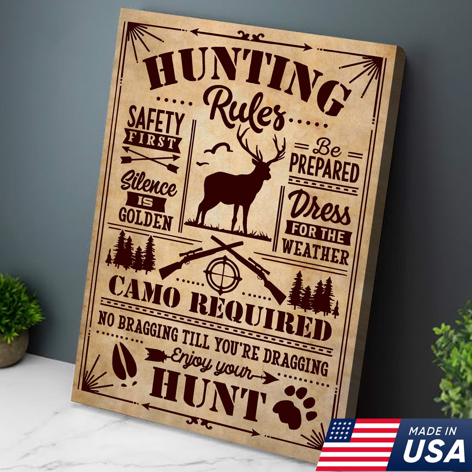 Hunting Rules Wall Art Canvas – Rustic Deer Hunting Lodge Decor – Safety First, Camo Required, Enjoy Your Hunt