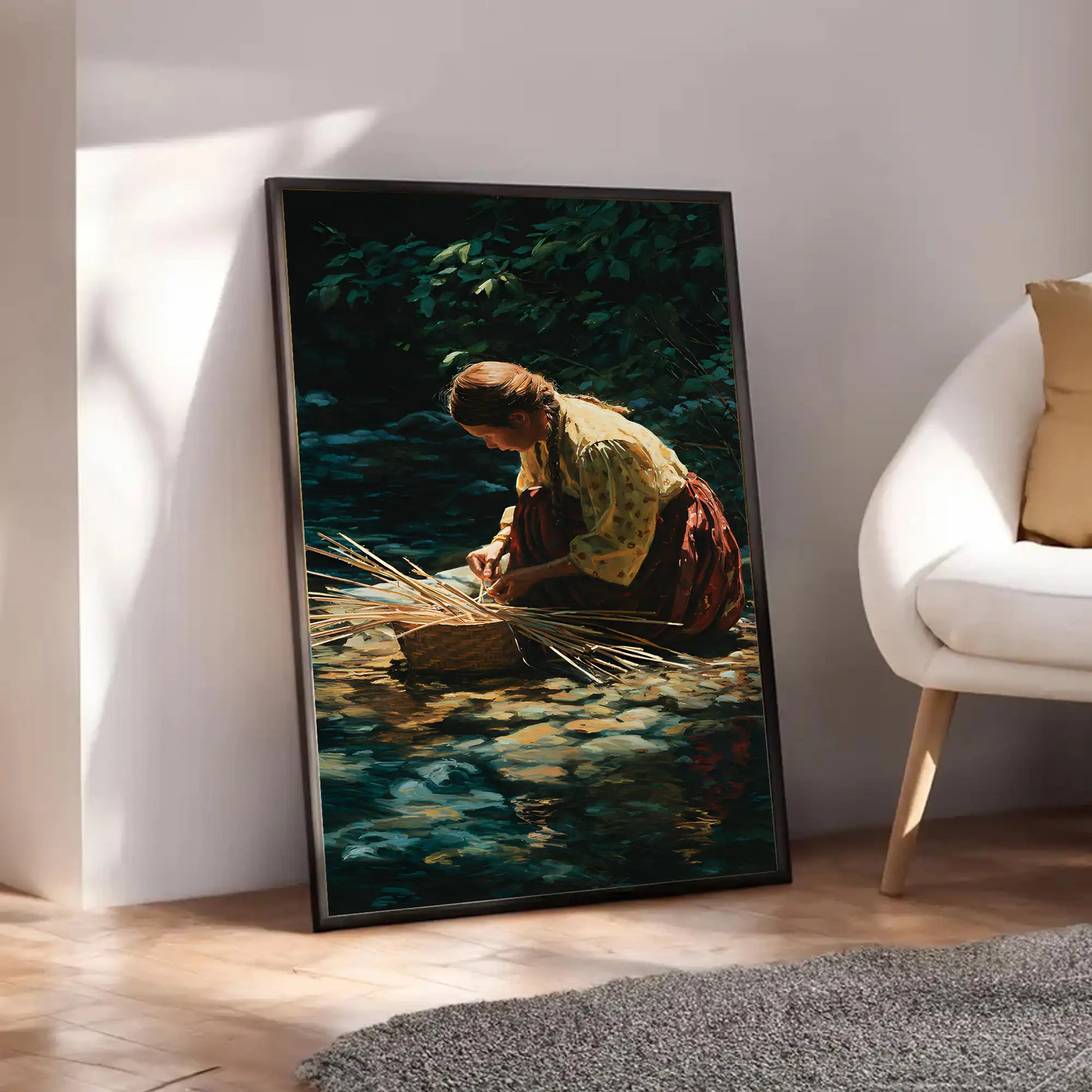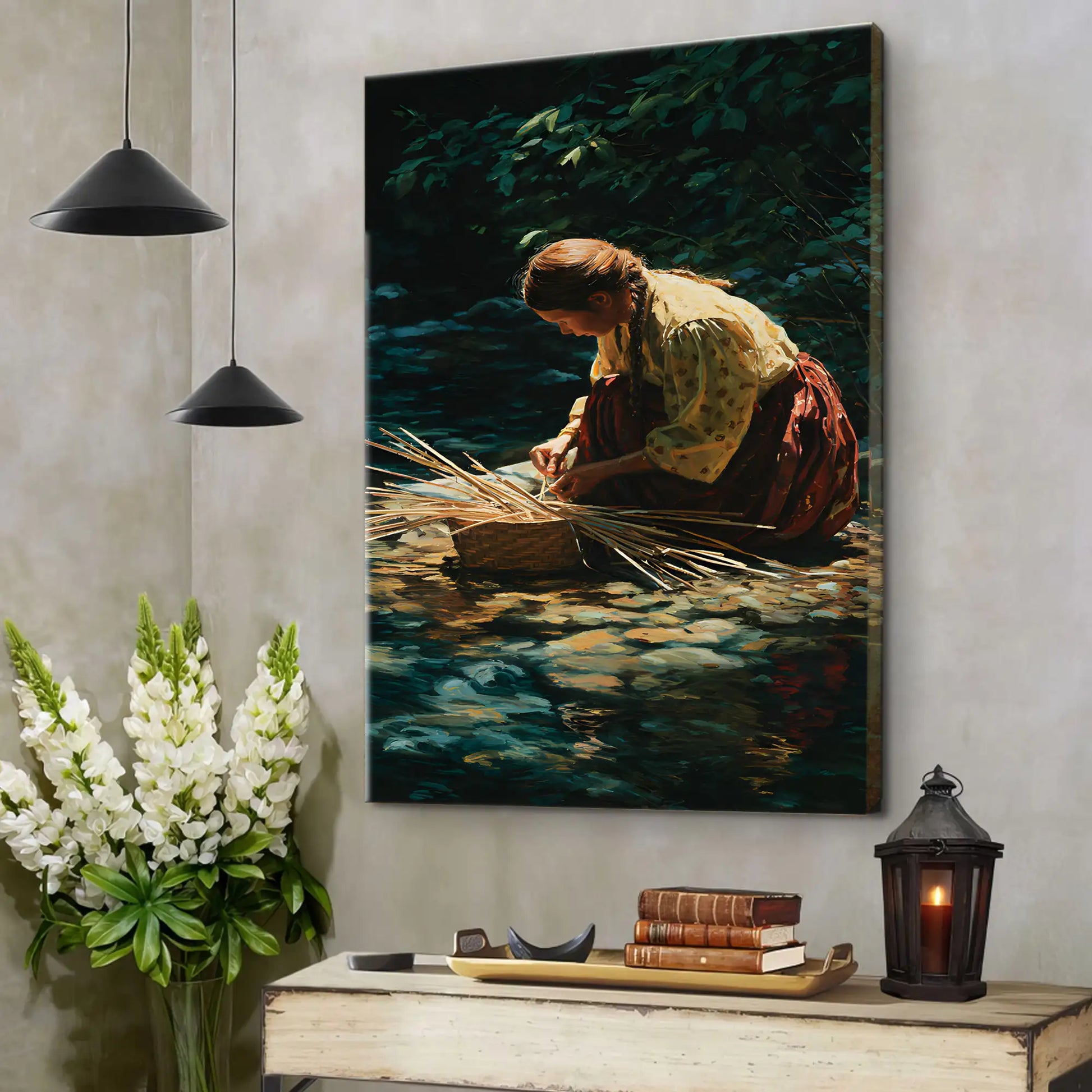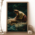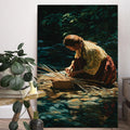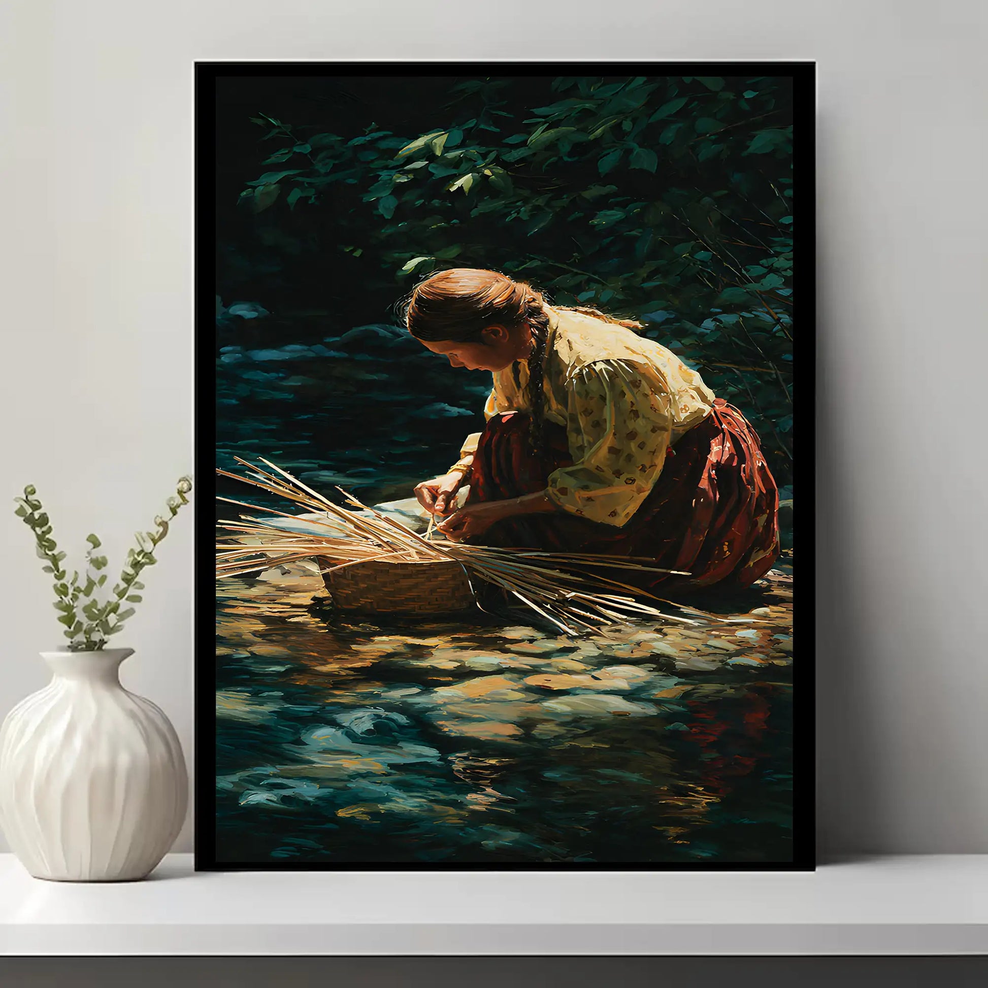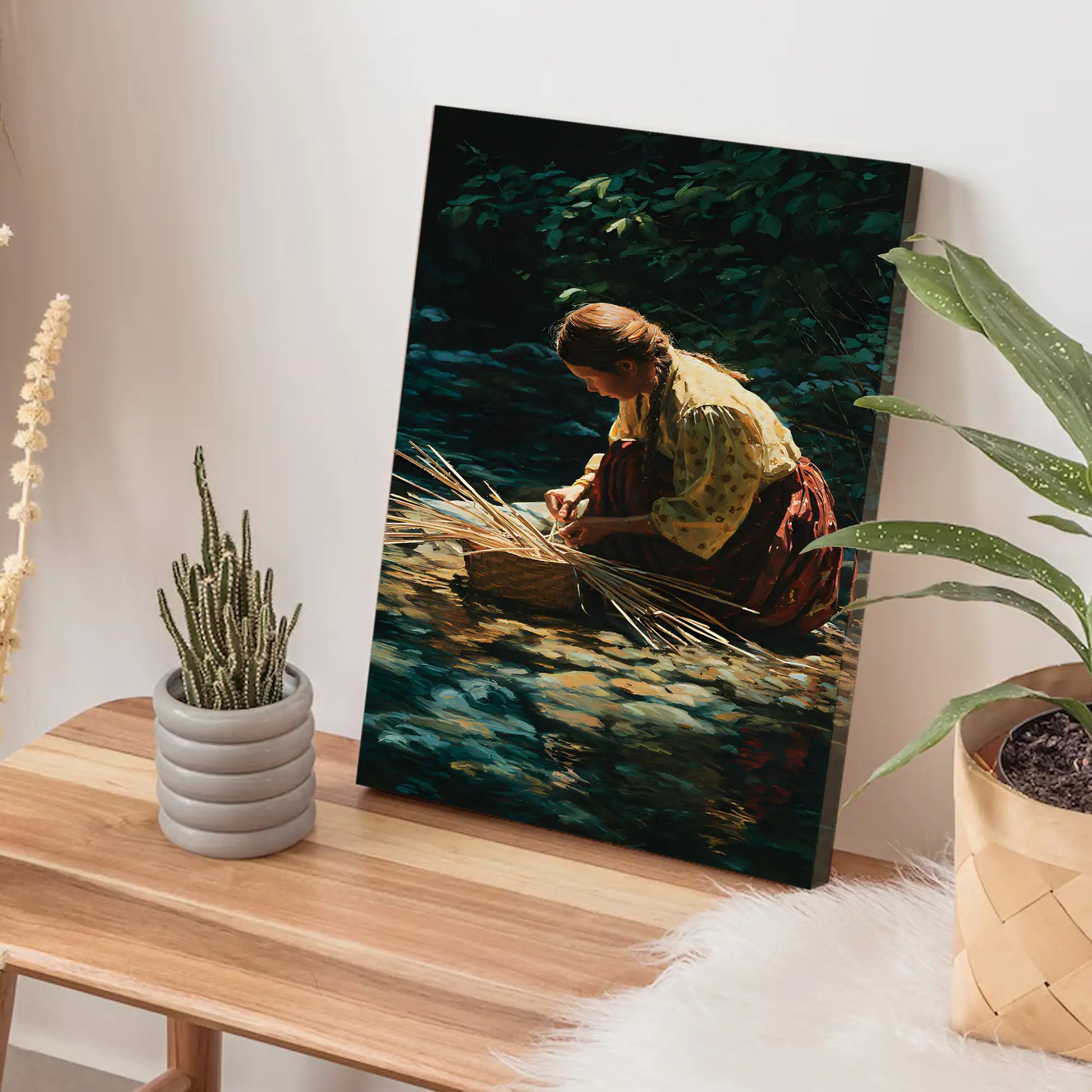 This stunning canvas artwork captures the timeless tradition of basket weaving, a skill deeply rooted in Native American culture. The scene depicts a woman by the river, carefully weaving reeds into a basket, reflecting patience, resilience, and harmony with nature. Basket weaving has been an essential art form across many tribes, not only for practical use but also as a cultural expression passed down through generations. This piece brings a sense of calm and history into your home, reminding viewers of the sacred connection between people and the land, as well as the enduring strength of Indigenous traditions.