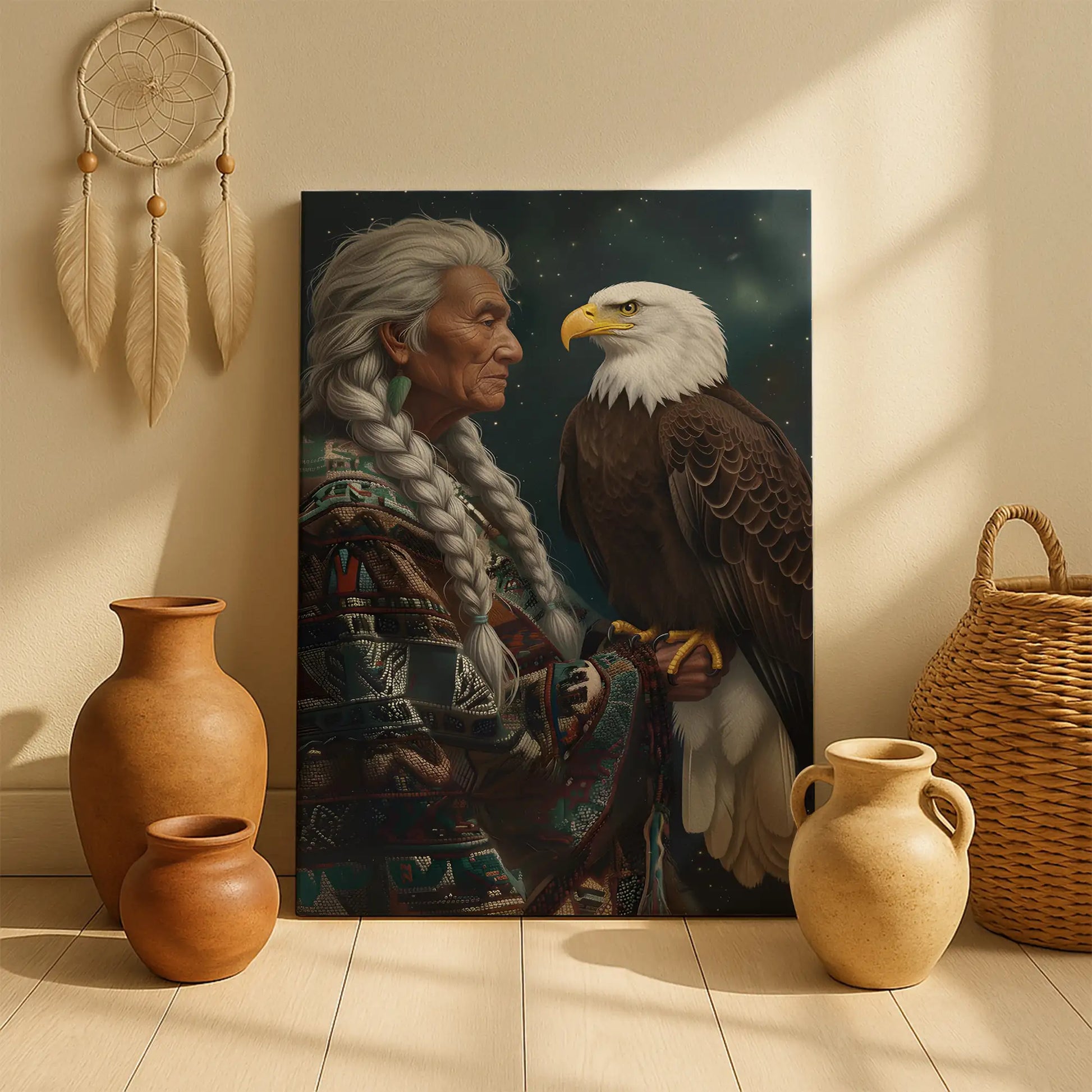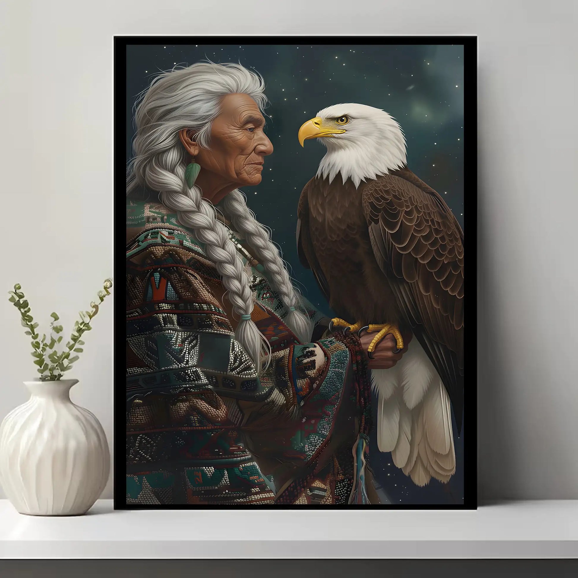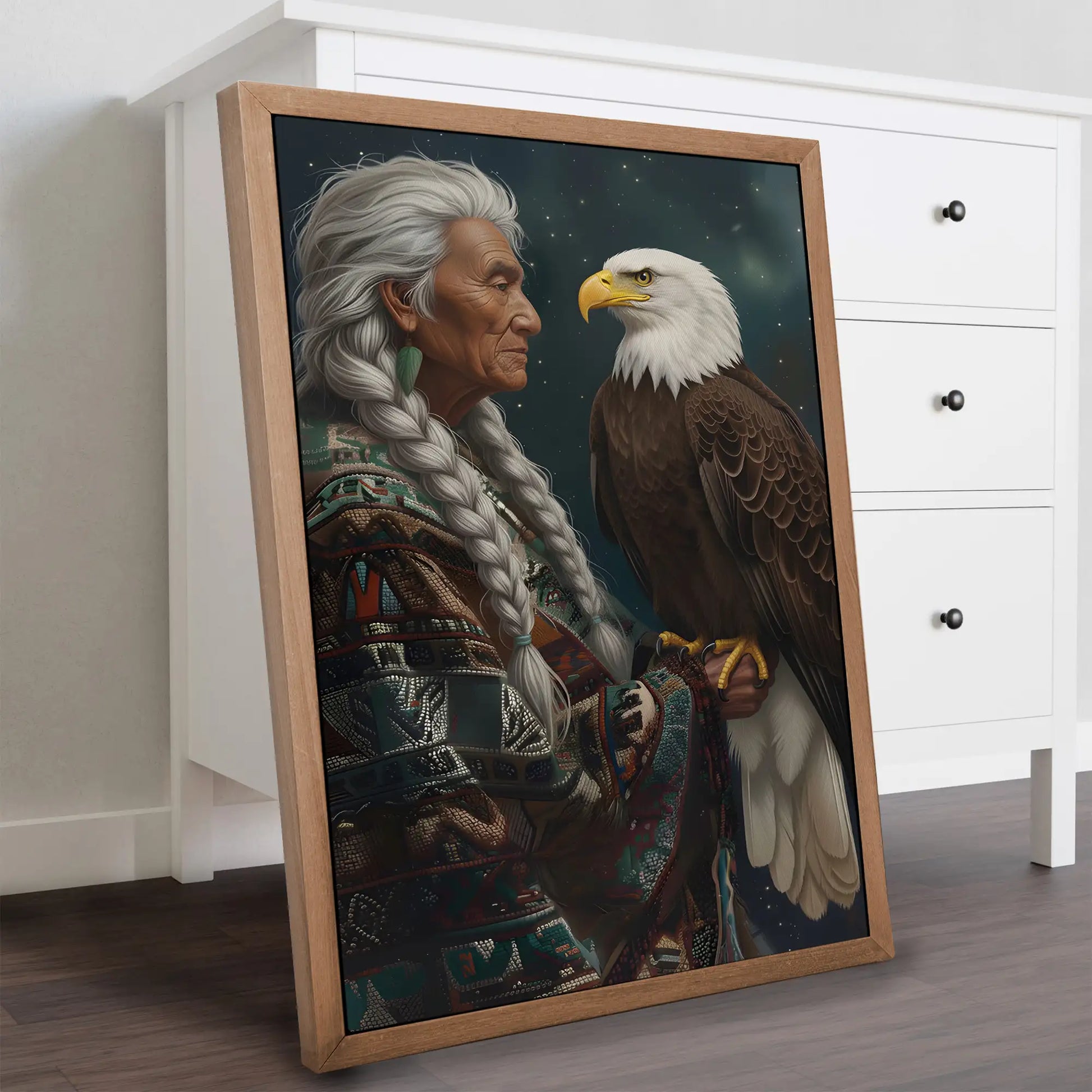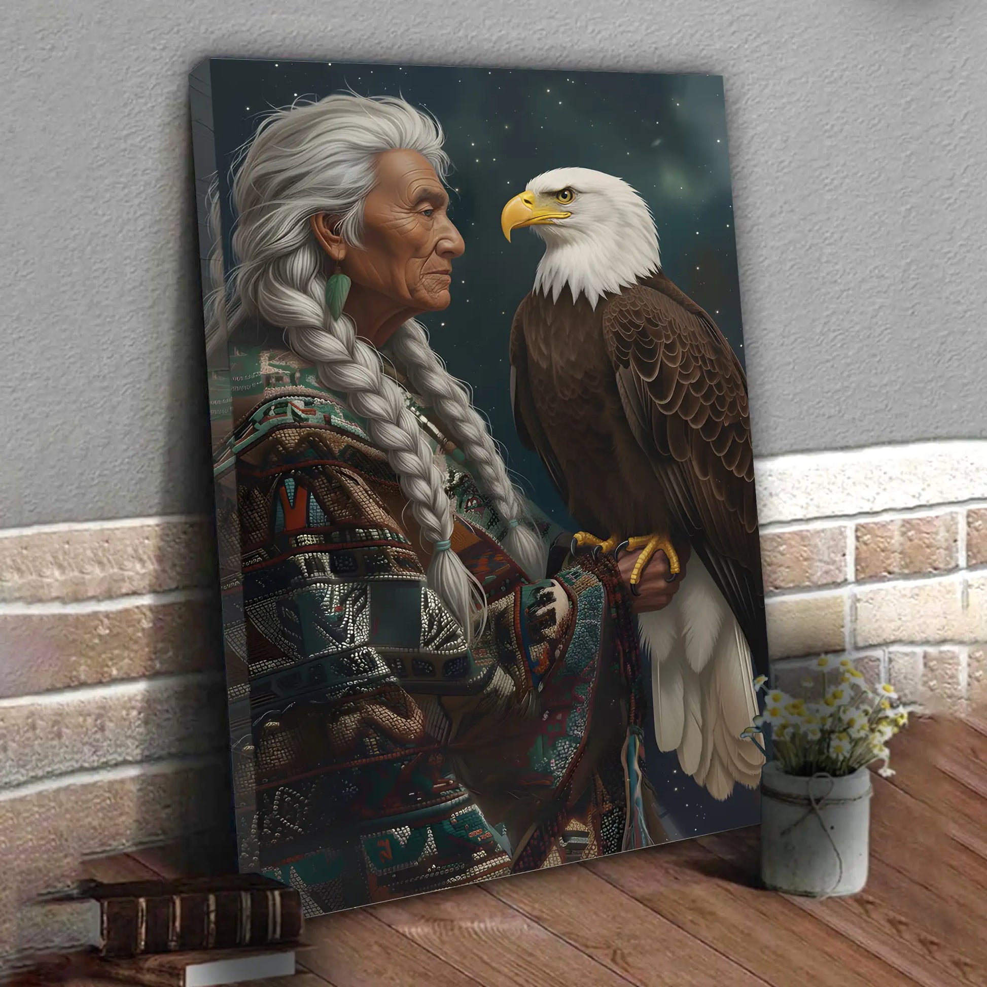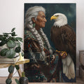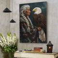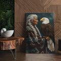This canvas artwork portrays the wisdom of an indigenous elder standing with a bald eagle, a bird regarded as a sacred messenger among many North American tribes. The elder’s braided hair and traditional patterned garment symbolize heritage and resilience, while the eagle represents vision, strength, and spiritual guidance. Against a starry night background, the composition highlights the deep connection between humanity and nature, wisdom and freedom. Every detail reflects respect for culture and the timeless bond with the natural world. This artwork is perfect for those who seek meaningful decor that embodies tradition, spirituality, and strength in their home space.