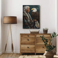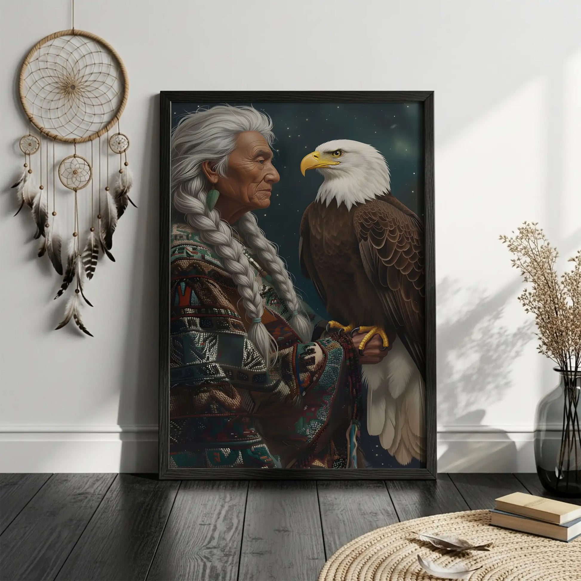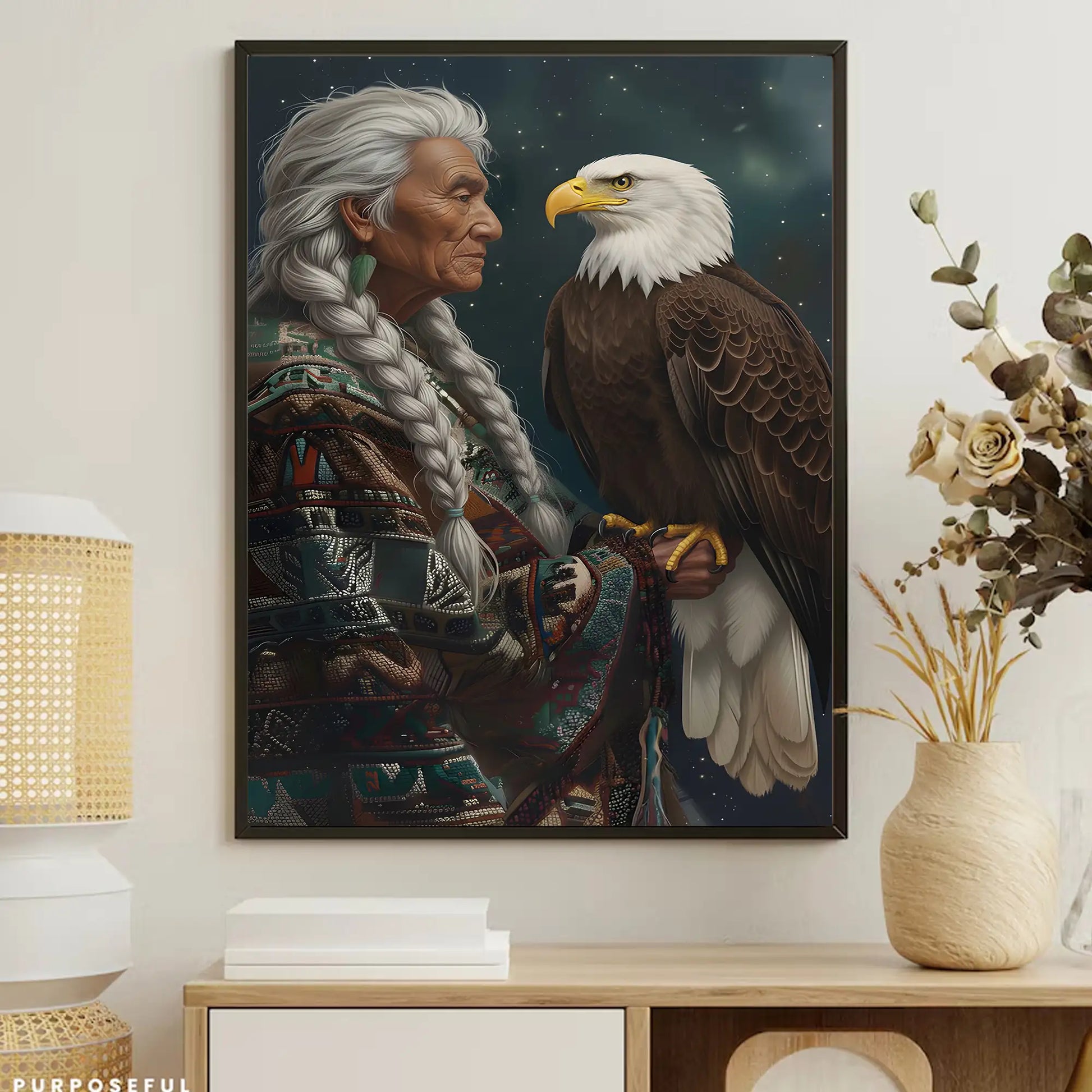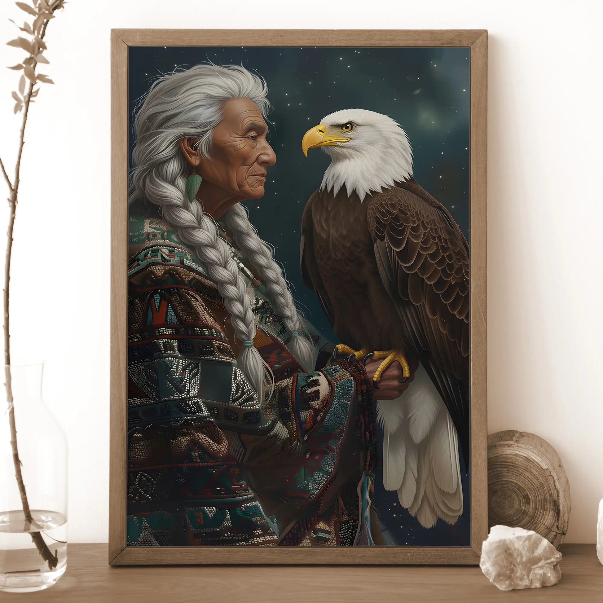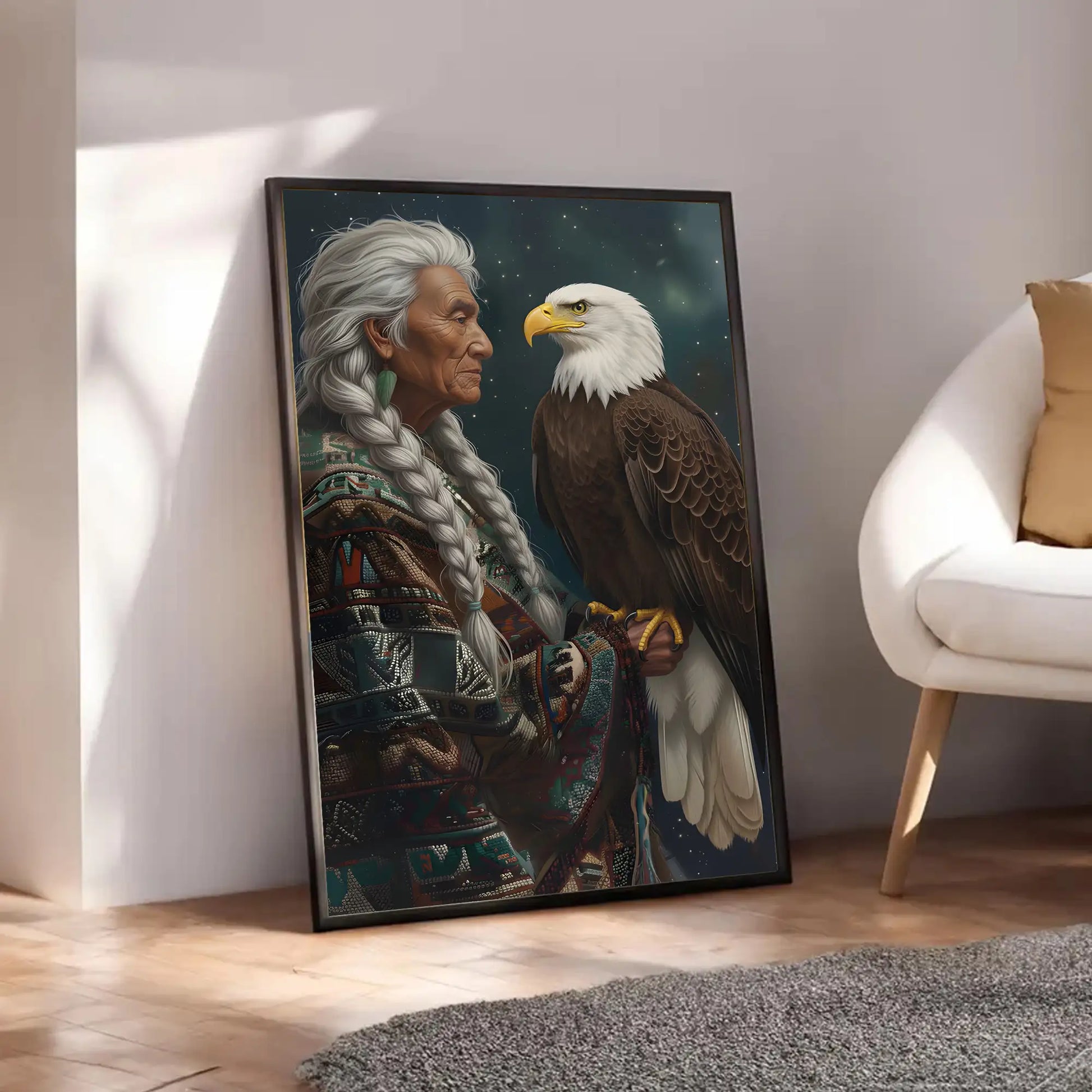 This canvas artwork portrays the wisdom of an indigenous elder standing with a bald eagle, a bird regarded as a sacred messenger among many North American tribes. The elder’s braided hair and traditional patterned garment symbolize heritage and resilience, while the eagle represents vision, strength, and spiritual guidance. Against a starry night background, the composition highlights the deep connection between humanity and nature, wisdom and freedom. Every detail reflects respect for culture and the timeless bond with the natural world. This artwork is perfect for those who seek meaningful decor that embodies tradition, spirituality, and strength in their home space.