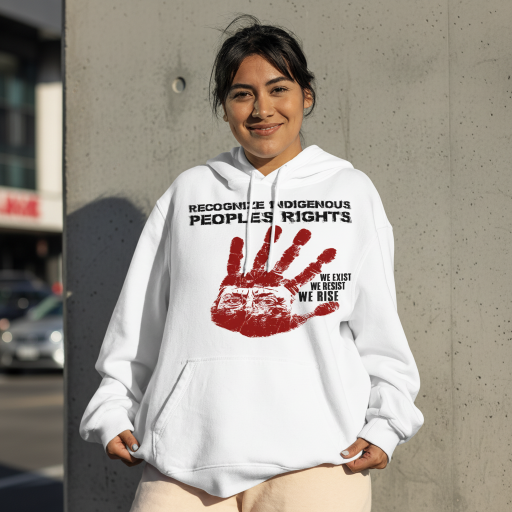 Indigenous Peoples Rights Hoodie, "We Exist We Resist We Rise", Tribal Handprint