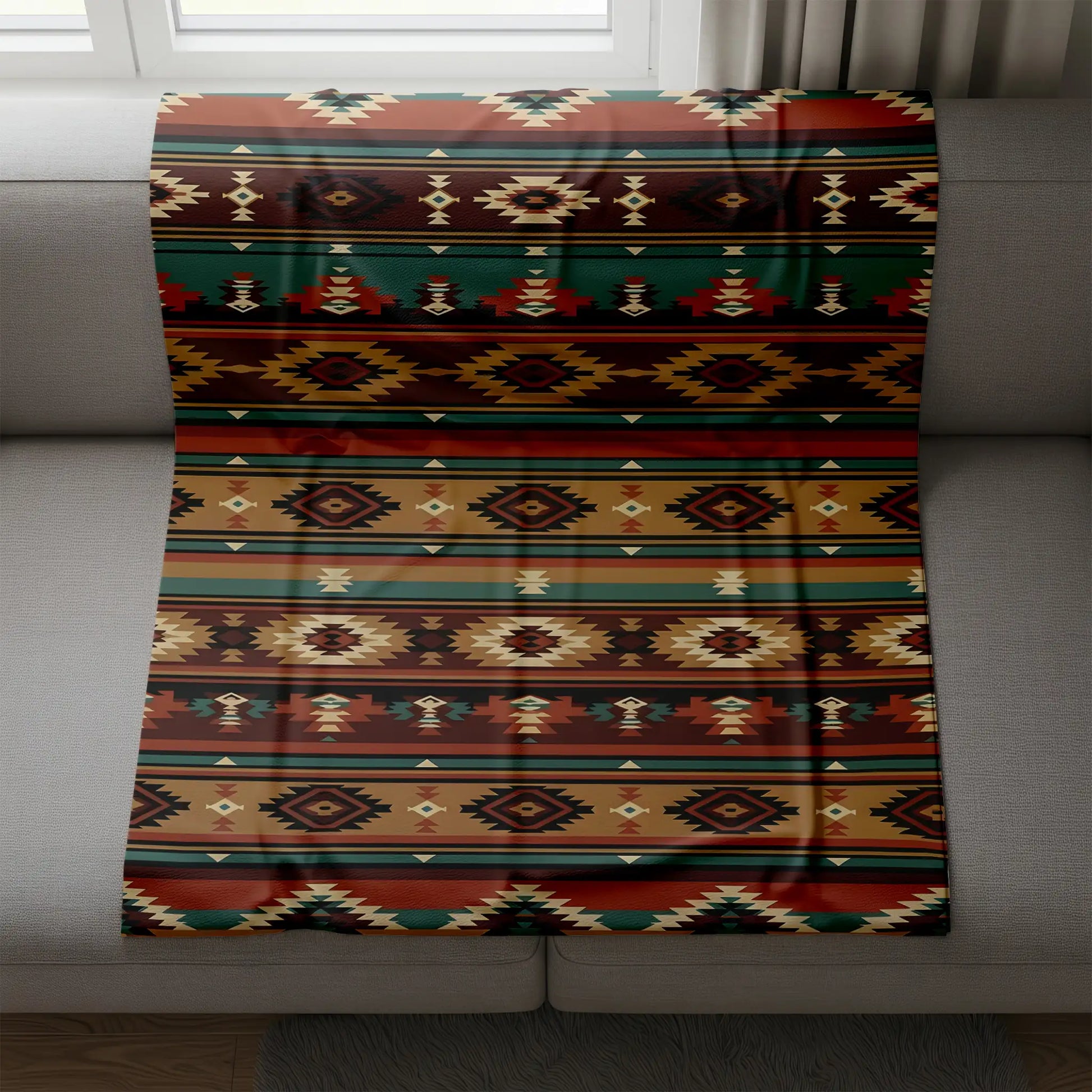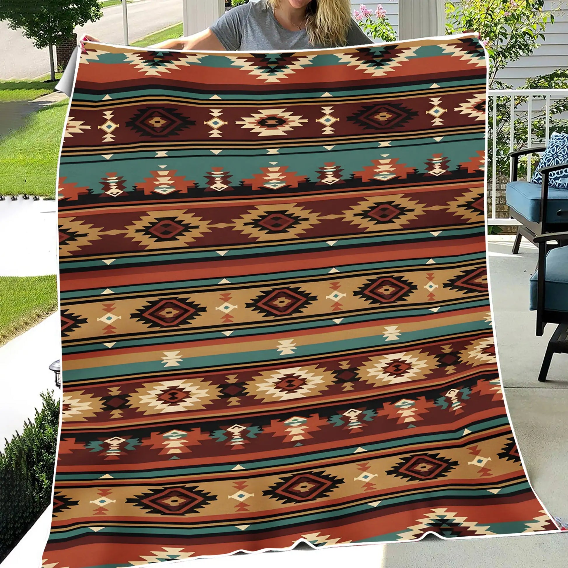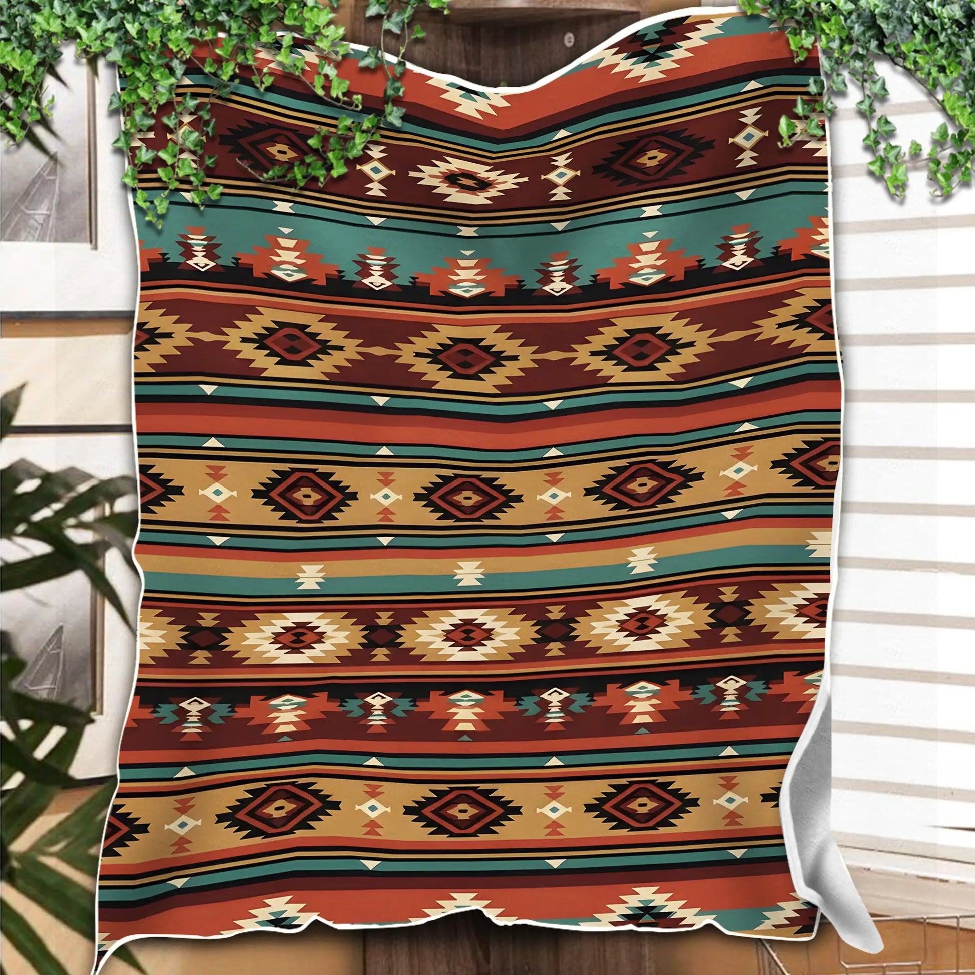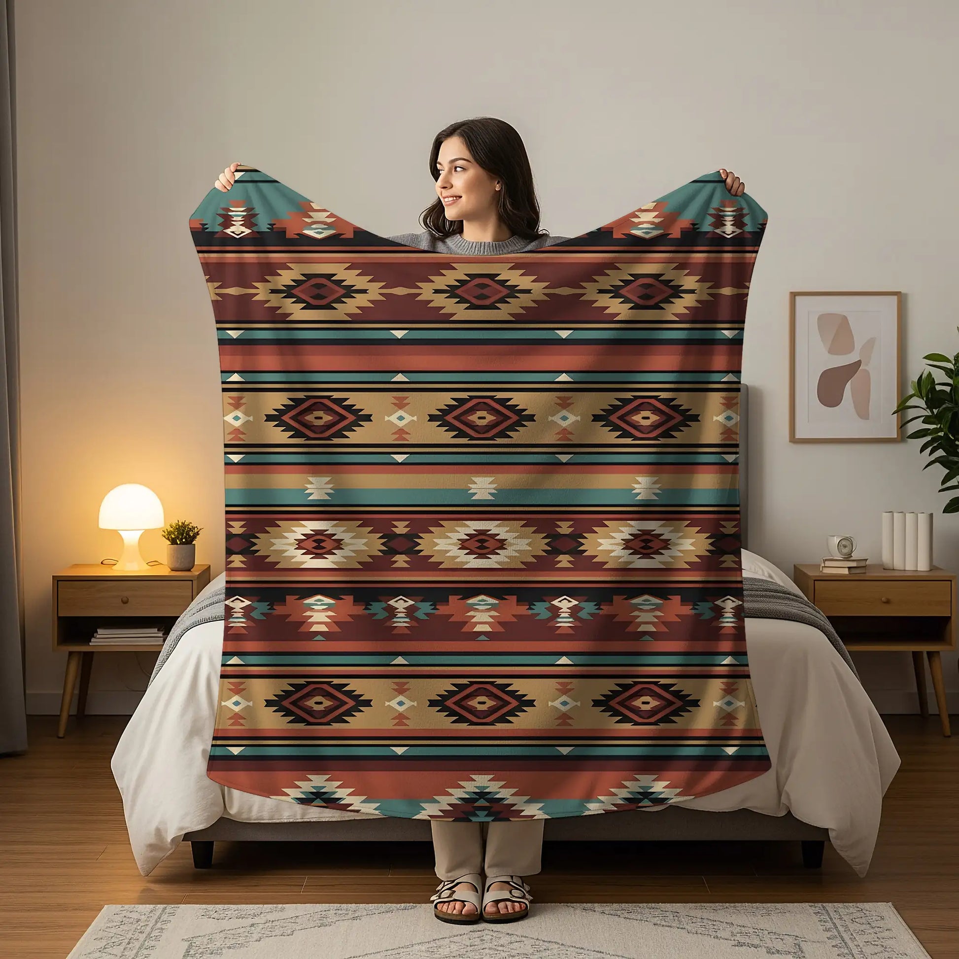 This blanket showcases a bold tribal design inspired by indigenous weaving traditions of the Southwest. The repeating diamond and stripe patterns in earthy shades of red, tan, green, and black symbolize balance, strength, and unity with nature. Crafted for both comfort and meaning, the blanket is soft, lightweight, and versatile, perfect for cozy nights, decorative layering on your sofa, or as a cultural accent in your bedroom. Each detail reflects the artistry and storytelling found in traditional patterns, bringing warmth, heritage, and timeless style into modern living spaces while celebrating the beauty of indigenous culture.