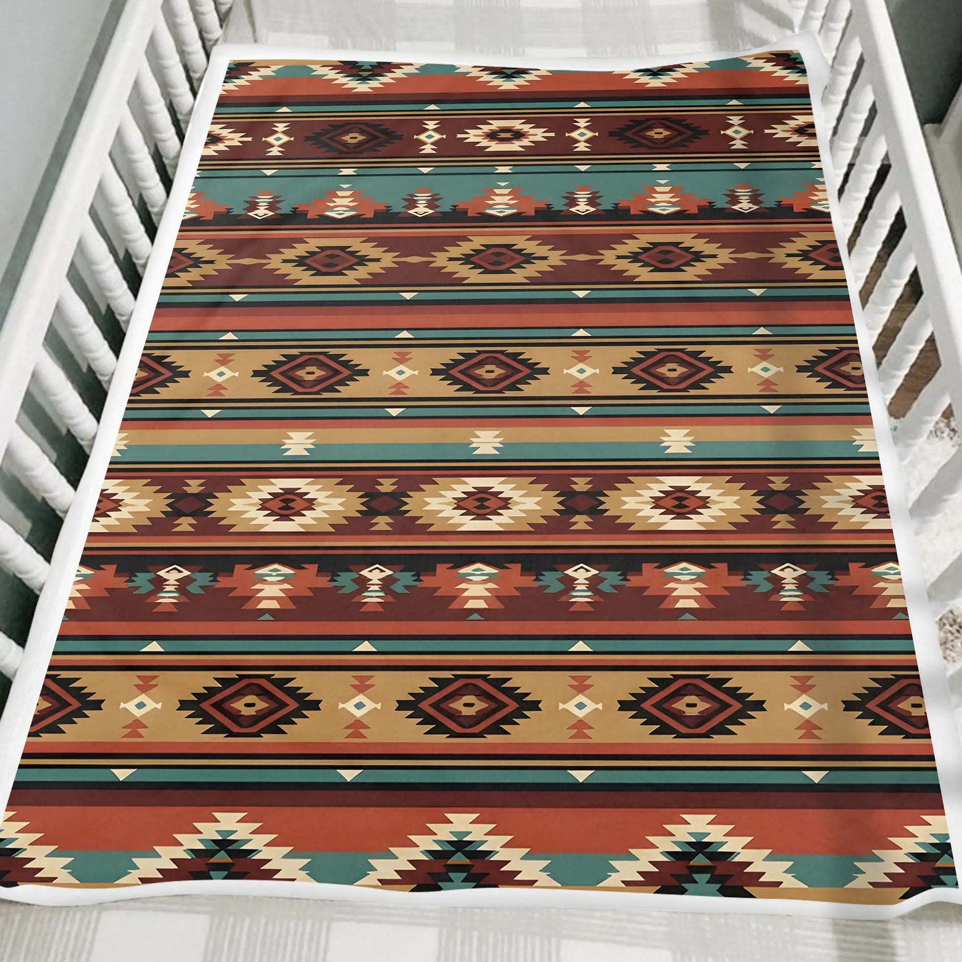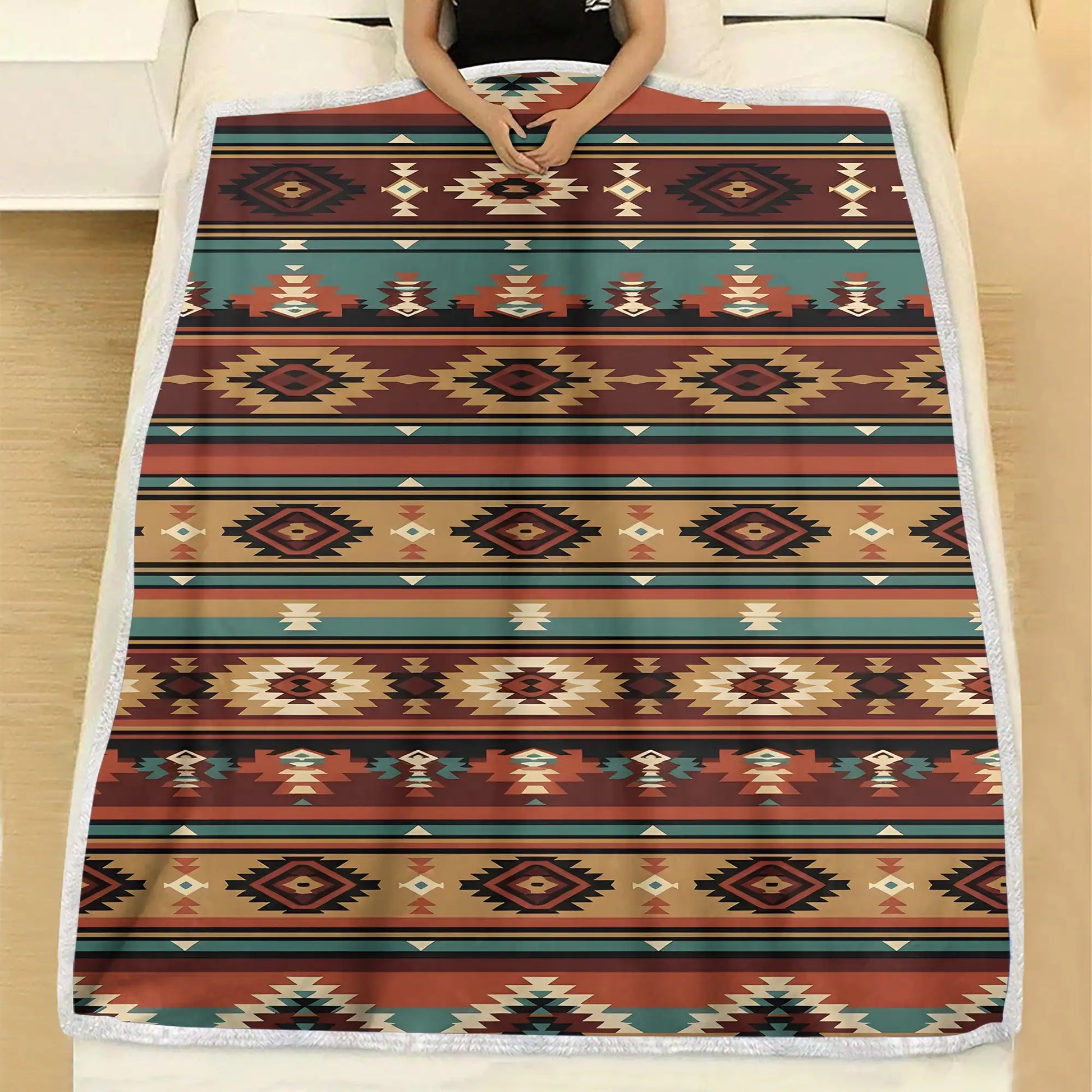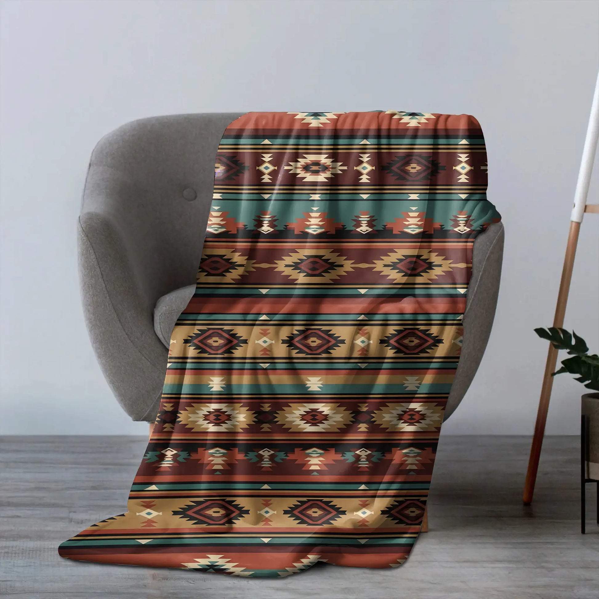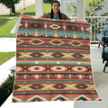 This blanket showcases a bold tribal design inspired by indigenous weaving traditions of the Southwest. The repeating diamond and stripe patterns in earthy shades of red, tan, green, and black symbolize balance, strength, and unity with nature. Crafted for both comfort and meaning, the blanket is soft, lightweight, and versatile, perfect for cozy nights, decorative layering on your sofa, or as a cultural accent in your bedroom. Each detail reflects the artistry and storytelling found in traditional patterns, bringing warmth, heritage, and timeless style into modern living spaces while celebrating the beauty of indigenous culture.
