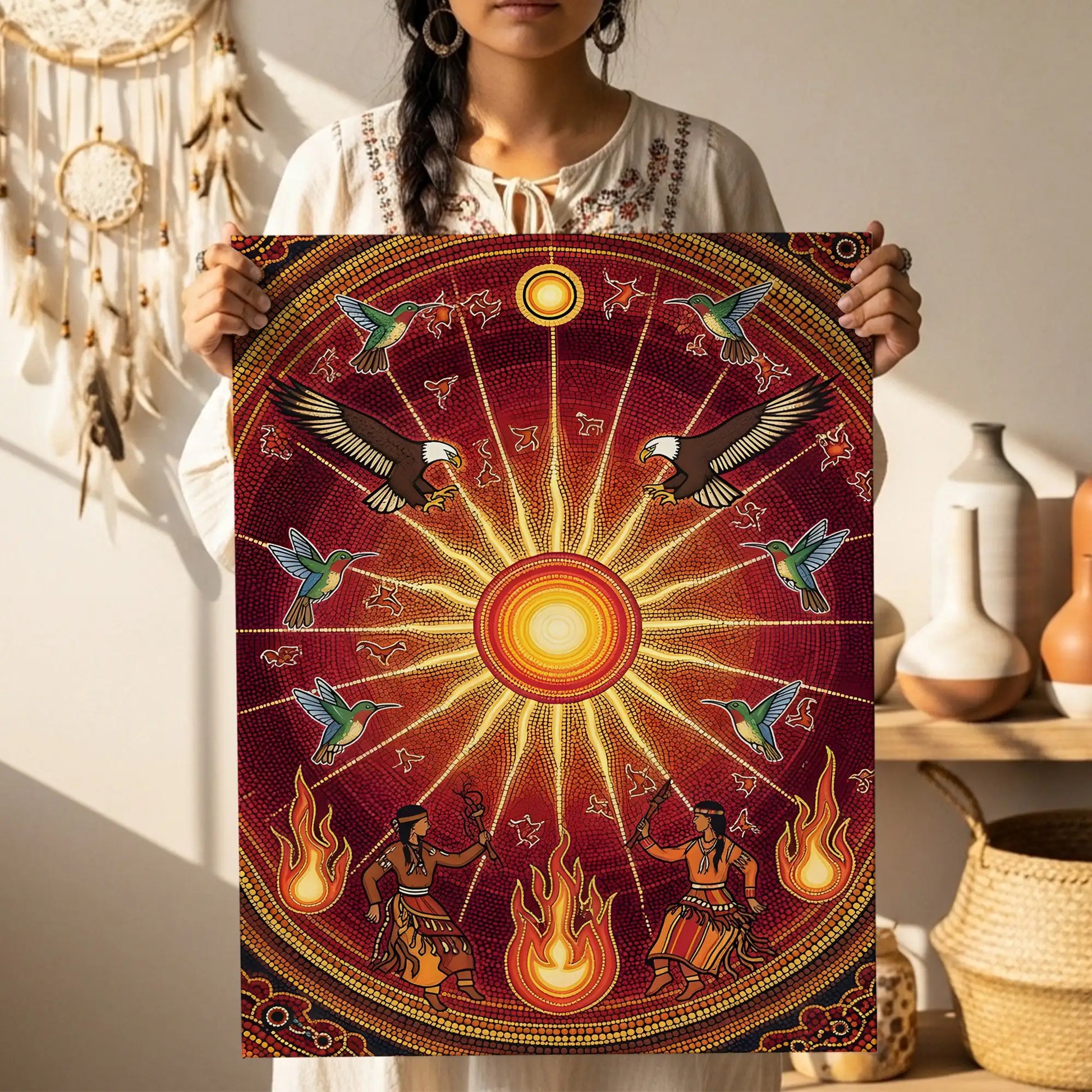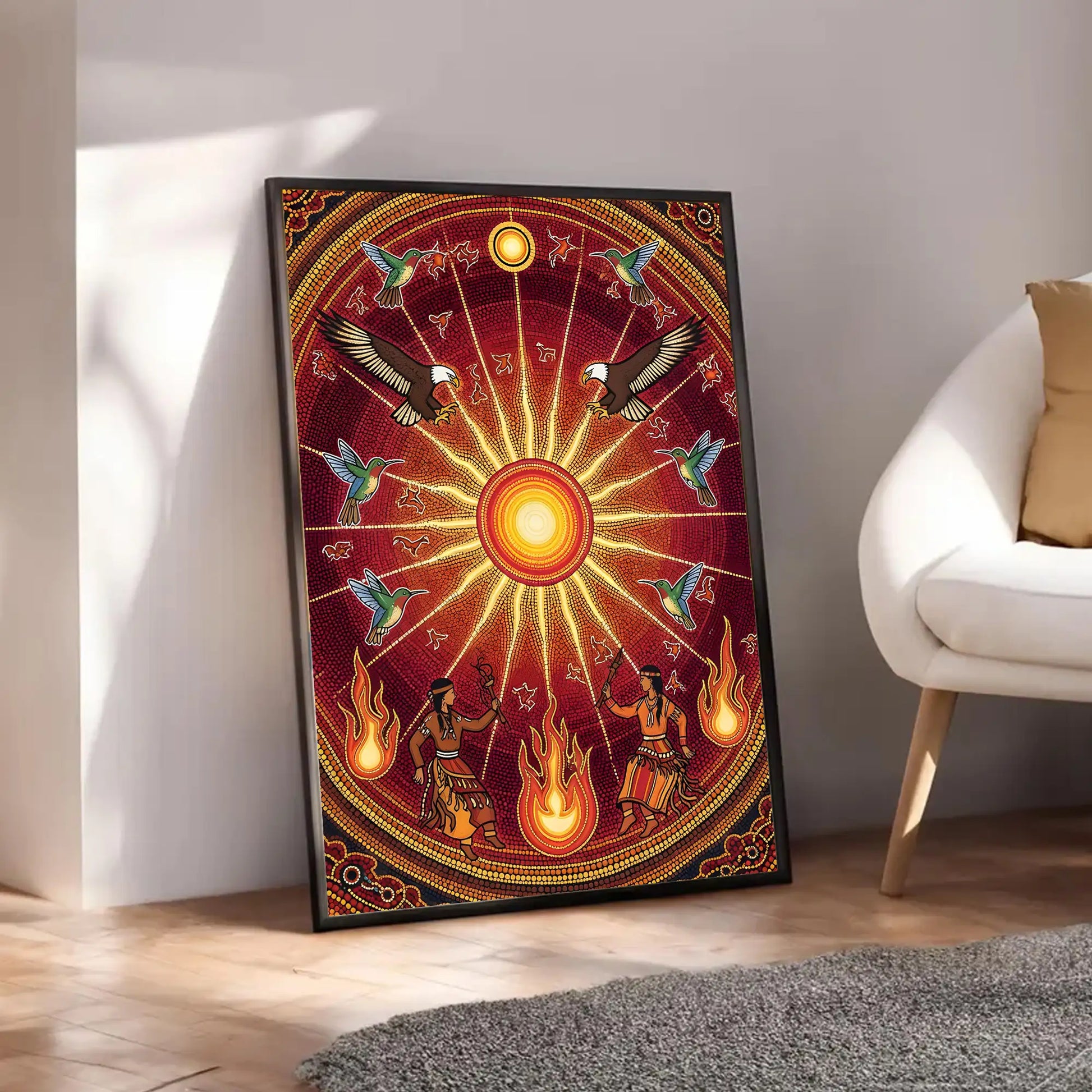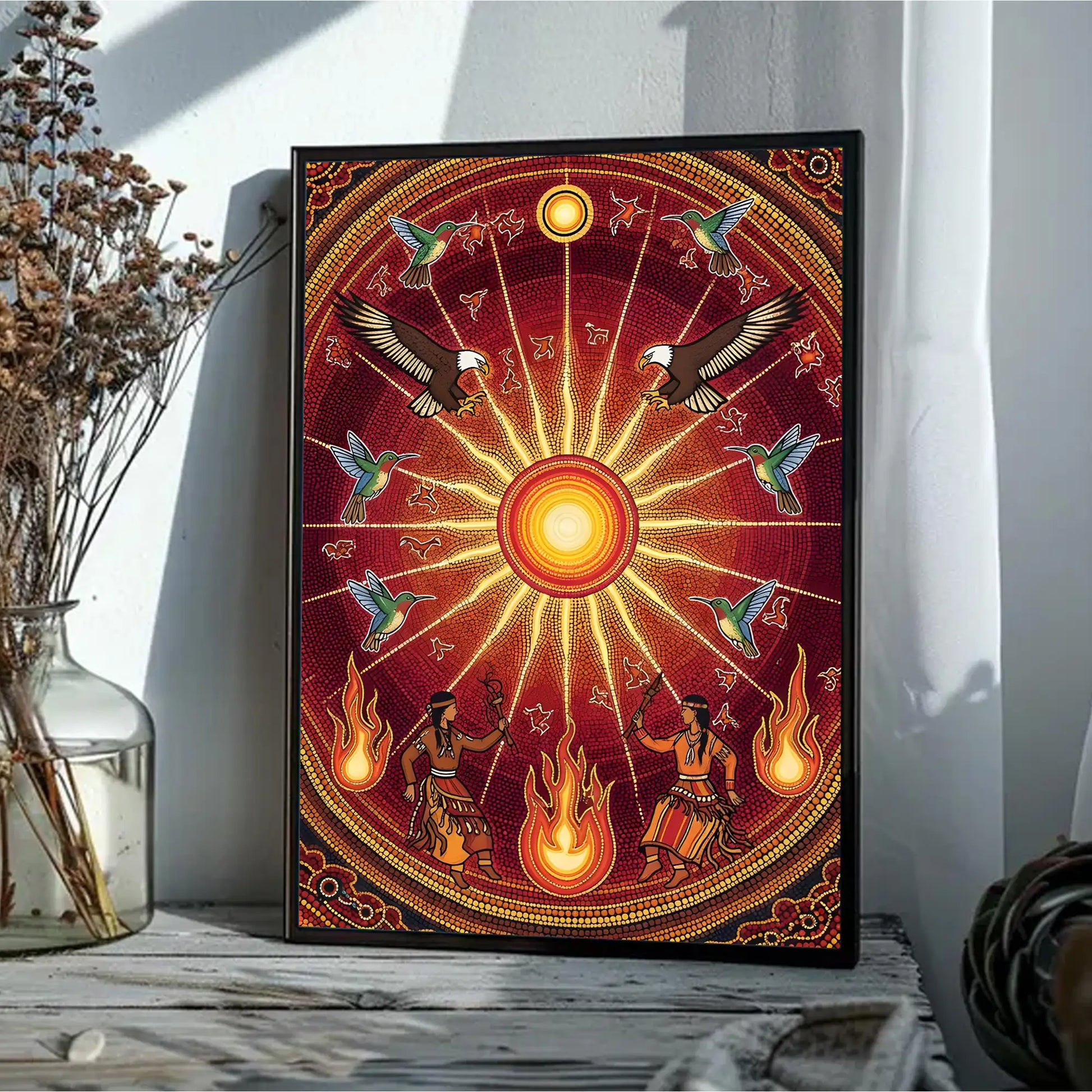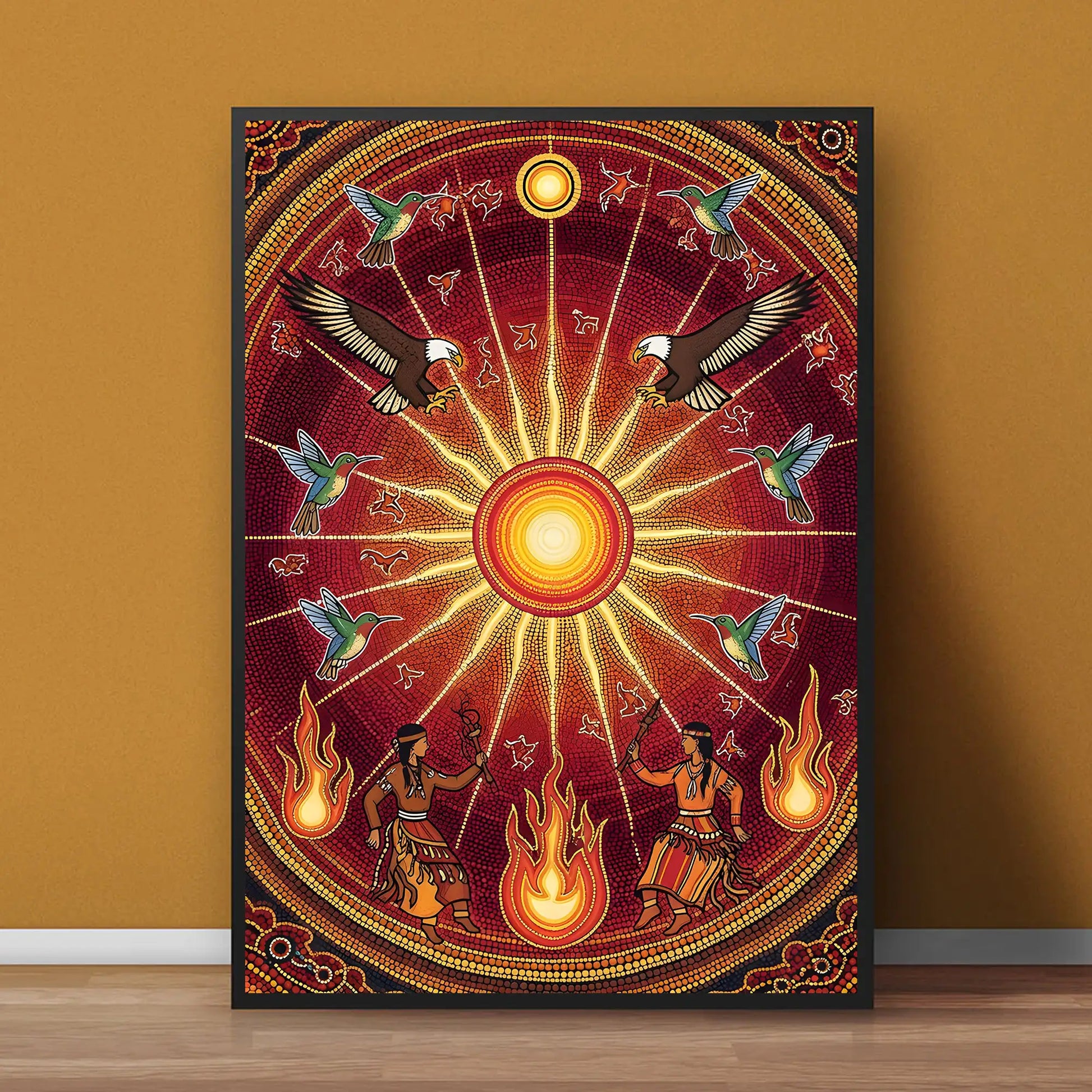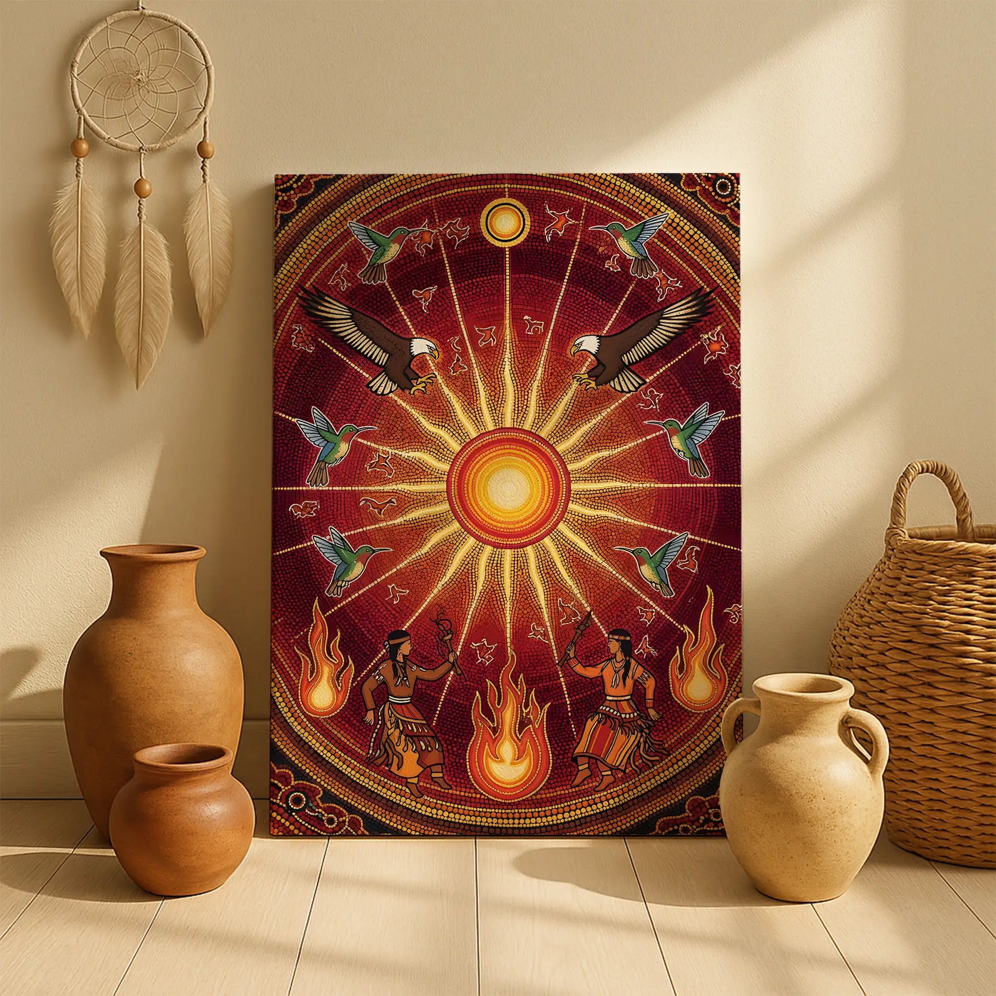 This canvas artwork draws inspiration from the sacred Sun Dance ceremonies of indigenous tribes from the Great Plains, where the sun represents life, renewal, and spiritual connection. At the center, the radiant sun shines with powerful energy, surrounded by eagles symbolizing vision and strength, and hummingbirds representing joy and resilience. Below, tribal dancers move with fire, embodying the harmony between earth and sky. The circular composition reflects the cycles of nature and the eternal bond between humanity and the universe. This artwork brings vibrant energy, cultural depth, and spiritual meaning to any home, meditation, or ceremonial space.