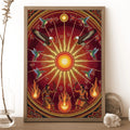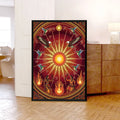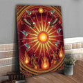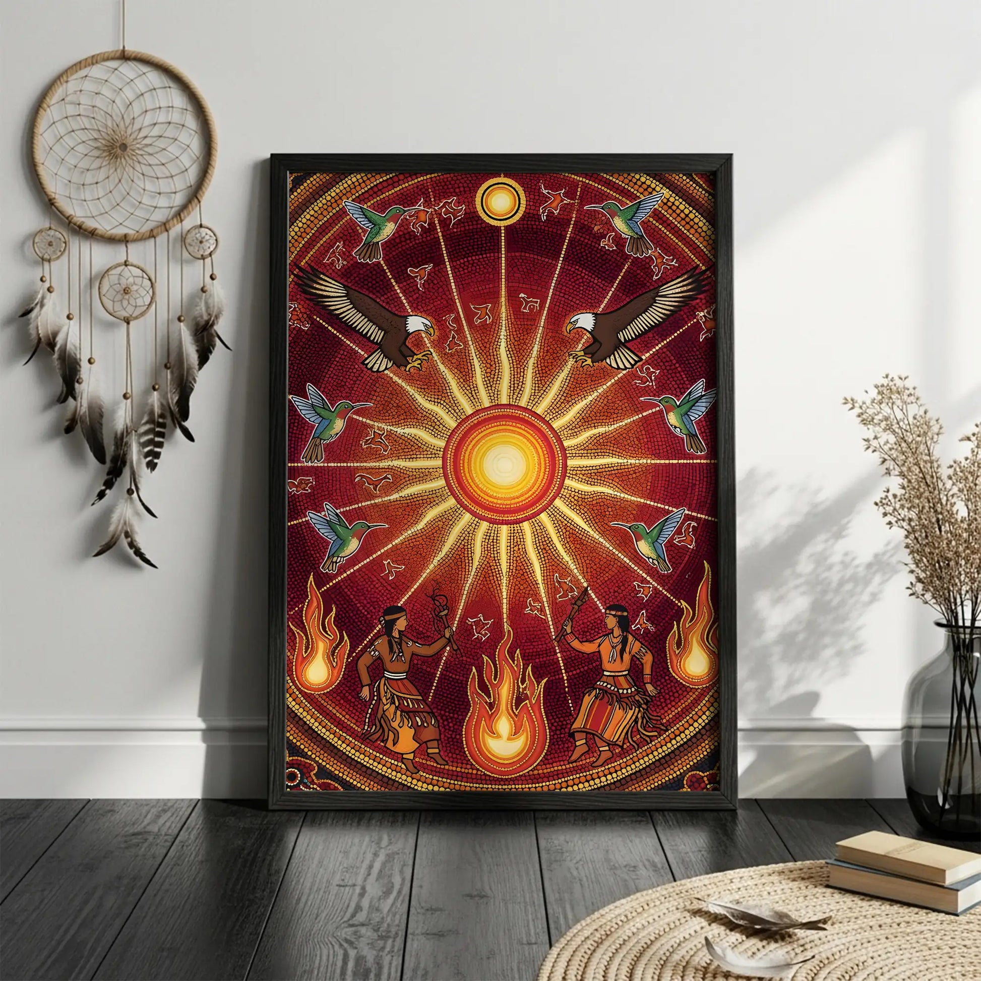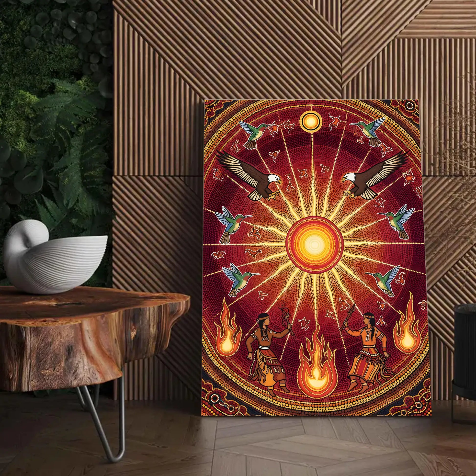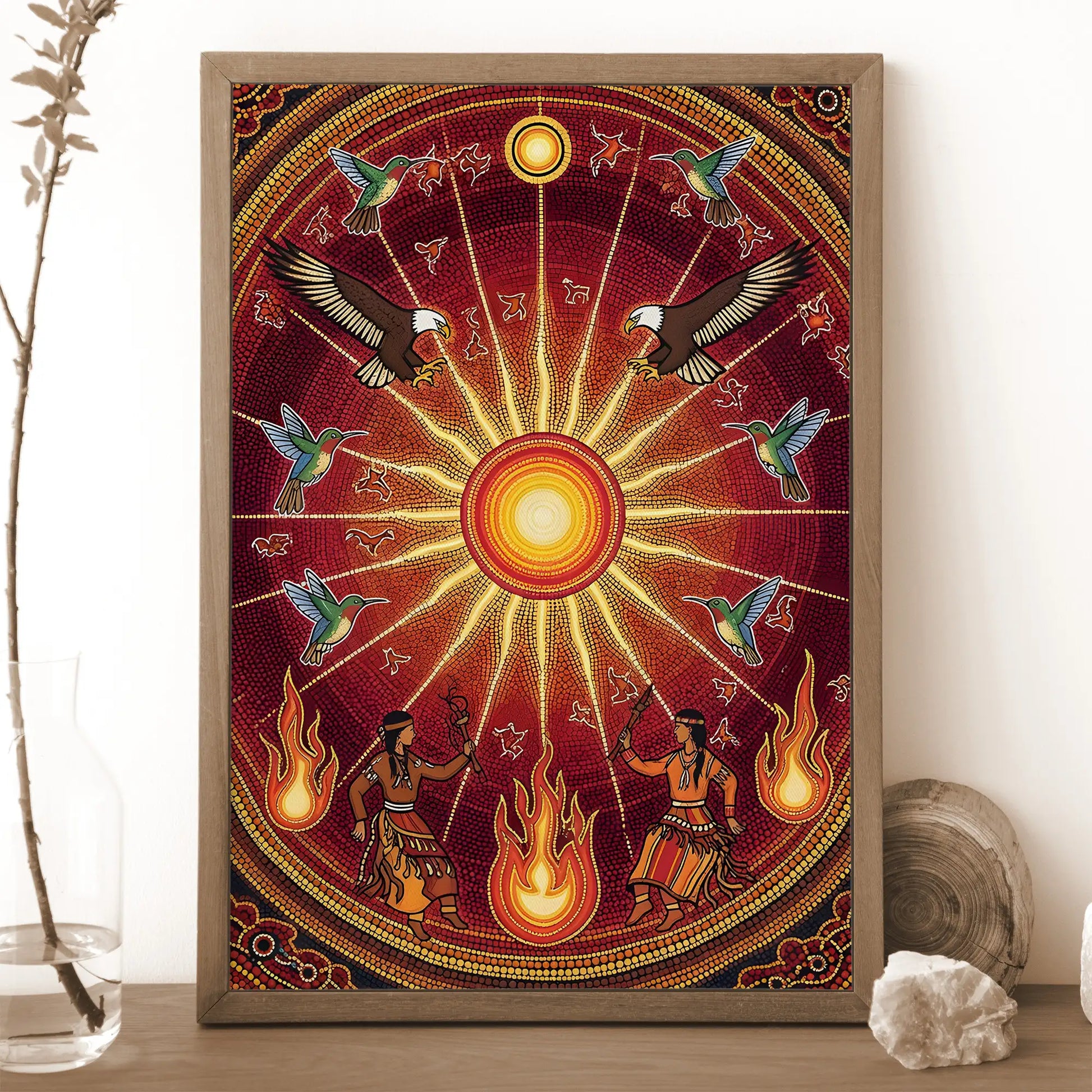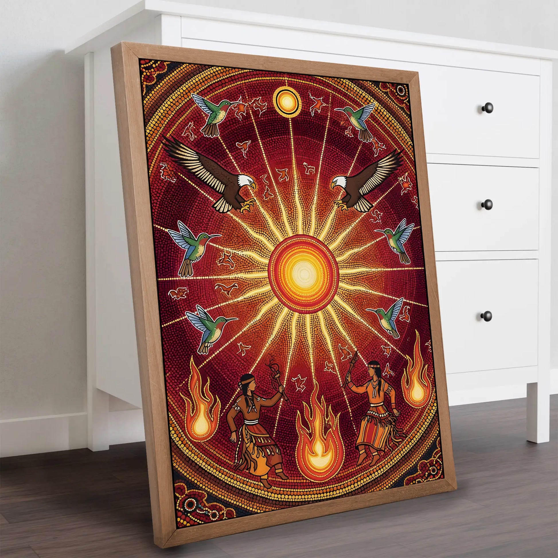 This canvas artwork draws inspiration from the sacred Sun Dance ceremonies of indigenous tribes from the Great Plains, where the sun represents life, renewal, and spiritual connection. At the center, the radiant sun shines with powerful energy, surrounded by eagles symbolizing vision and strength, and hummingbirds representing joy and resilience. Below, tribal dancers move with fire, embodying the harmony between earth and sky. The circular composition reflects the cycles of nature and the eternal bond between humanity and the universe. This artwork brings vibrant energy, cultural depth, and spiritual meaning to any home, meditation, or ceremonial space.
