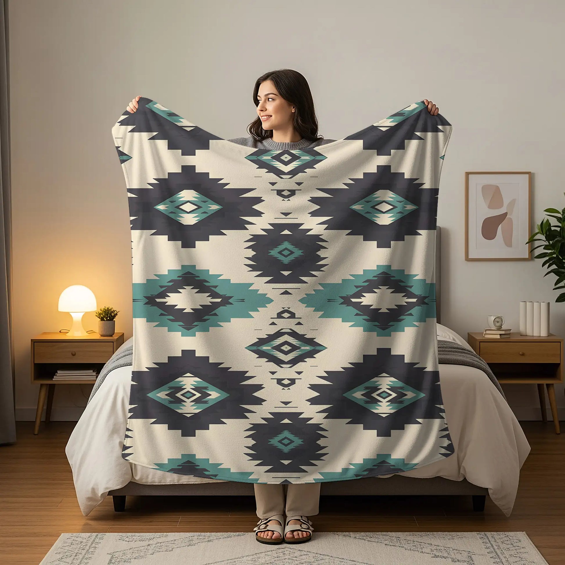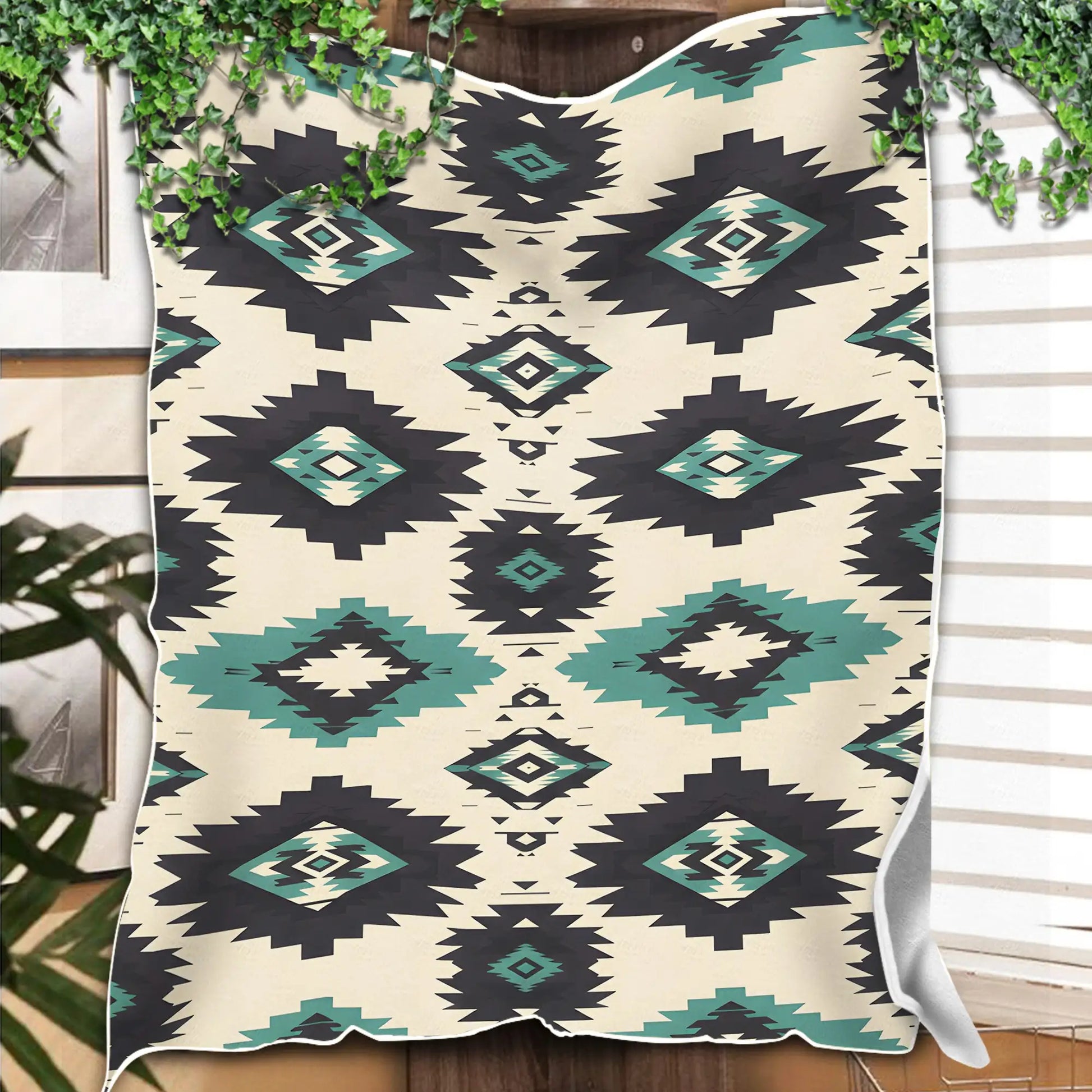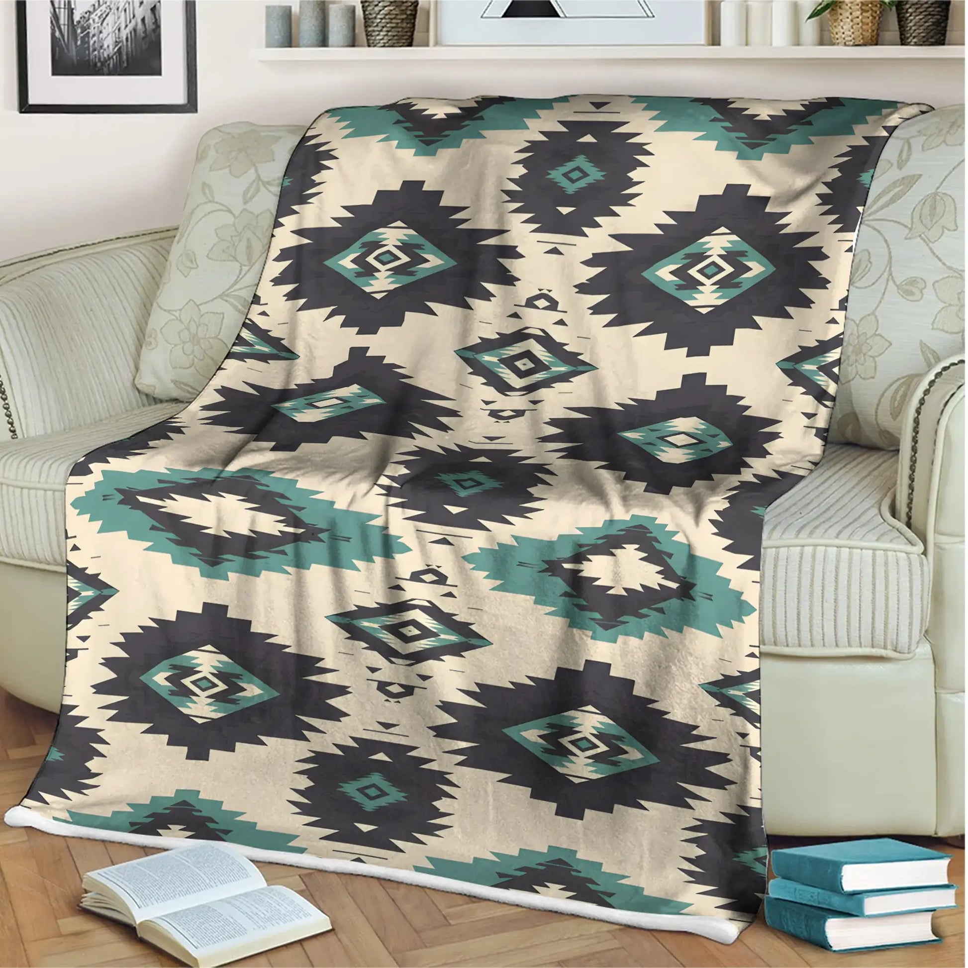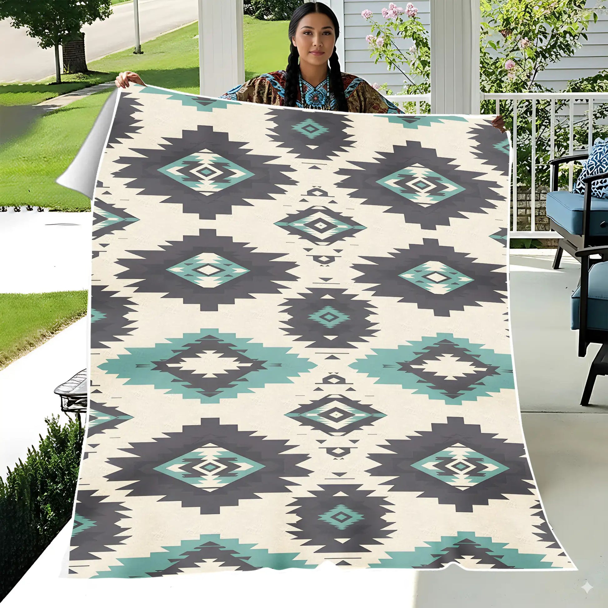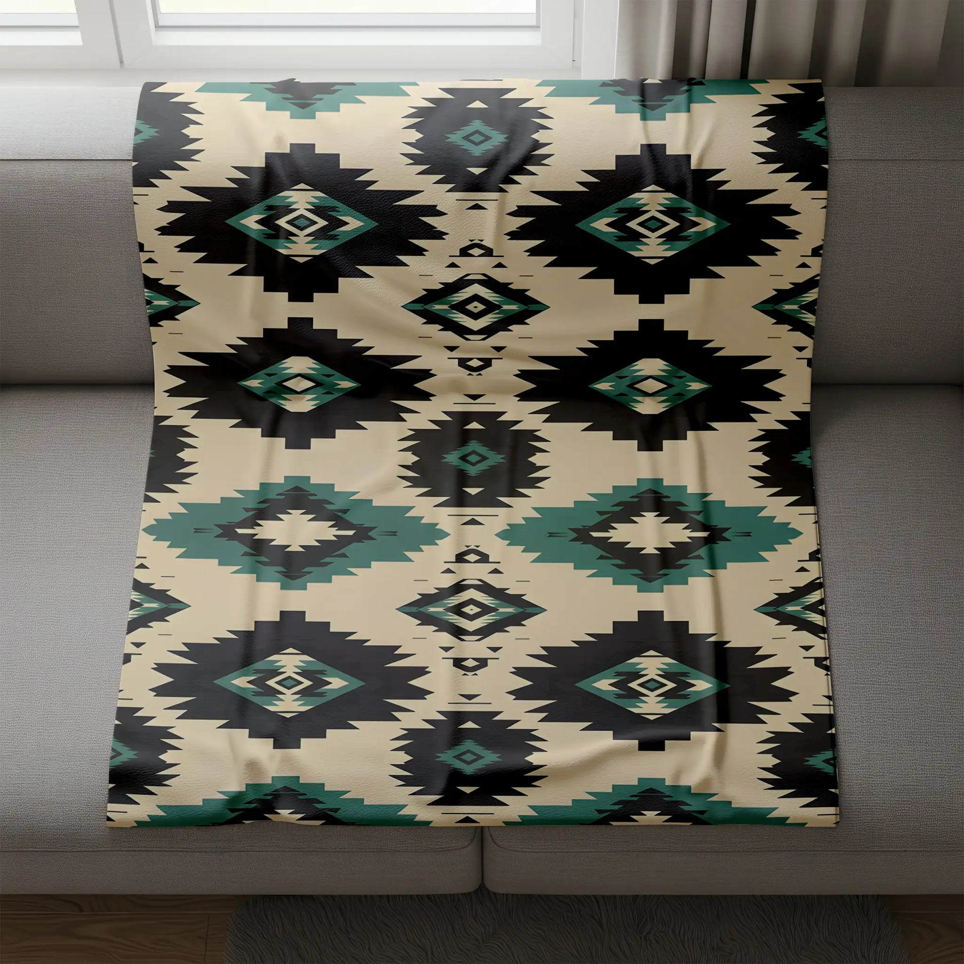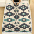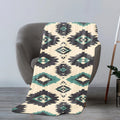 This Indigenous blanket celebrates traditional artistry through bold tribal diamond patterns in black and teal set against a cream background. The geometric design reflects timeless symbolism found in Native America weaving traditions, representing harmony, protection, and a deep connection to the earth. Crafted to provide warmth and comfort, this blanket doubles as a striking decor piece that brings cultural depth to any home. Its vibrant colors and sharp motifs make it ideal for draping over sofas, using during cool evenings, or gifting to those who appreciate meaningful heritage. A true blend of beauty, tradition, and function.