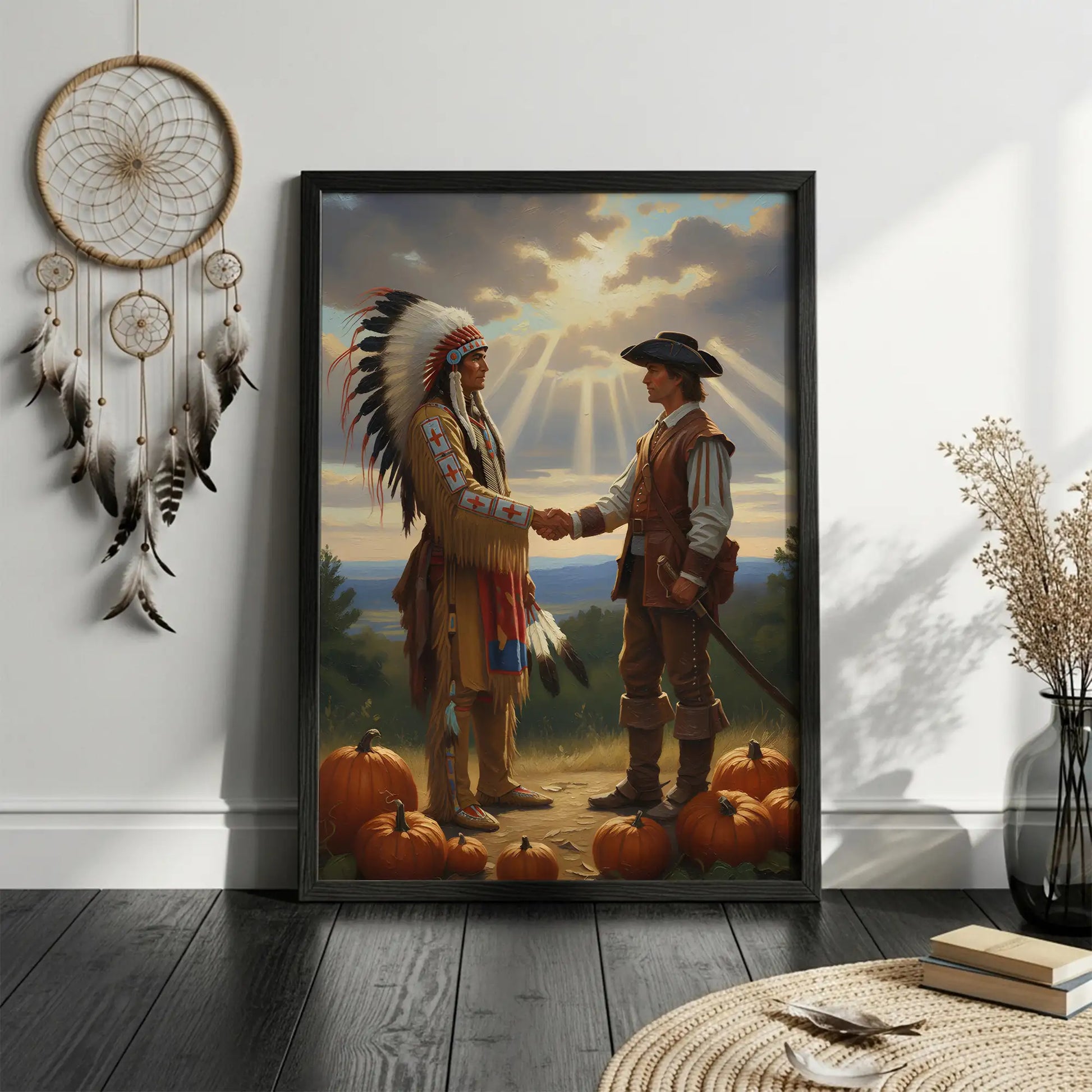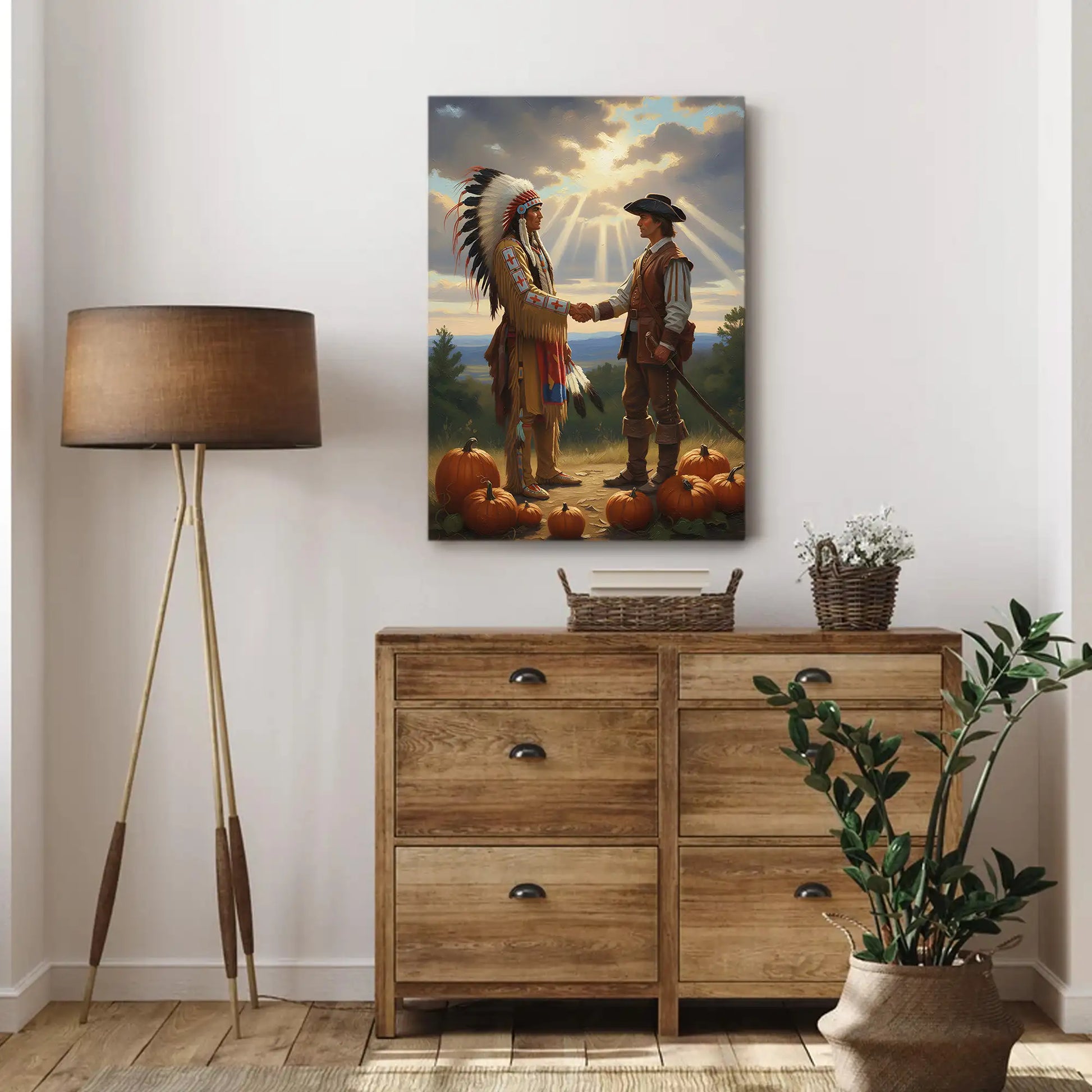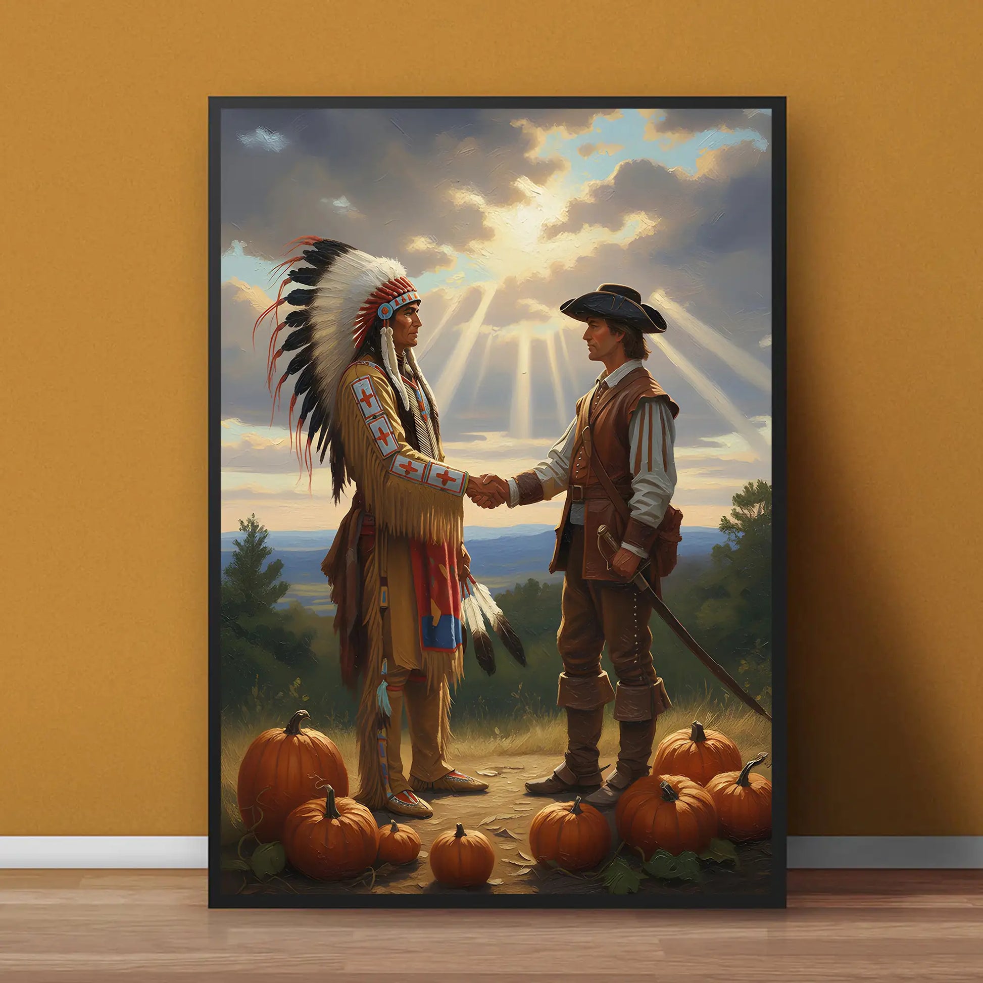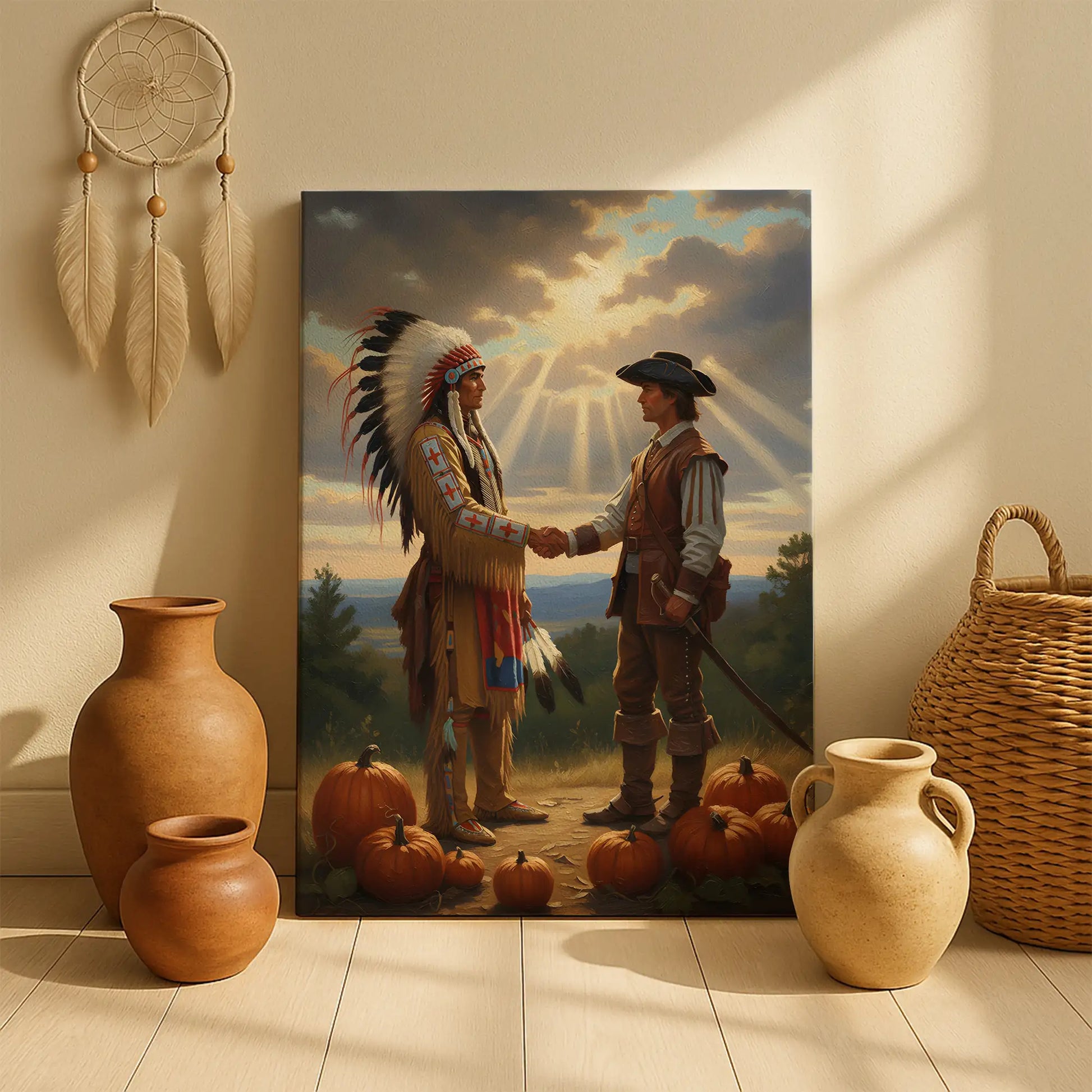 This canvas artwork depicts a powerful symbolic moment between a tribal chief and an early settler, shaking hands under the rays of the setting sun. Surrounded by pumpkins and autumn scenery, the image represents themes of respect, unity, and the meeting of two worlds. The detailed attire of the chief with his feathered headdress and the settler’s traditional clothing highlights cultural heritage and history. Inspired by indigenous and colonial encounters, the design carries a message of peace and understanding. Perfect as a meaningful addition to any home, it celebrates tradition, reconciliation, and cultural storytelling.
