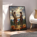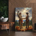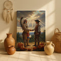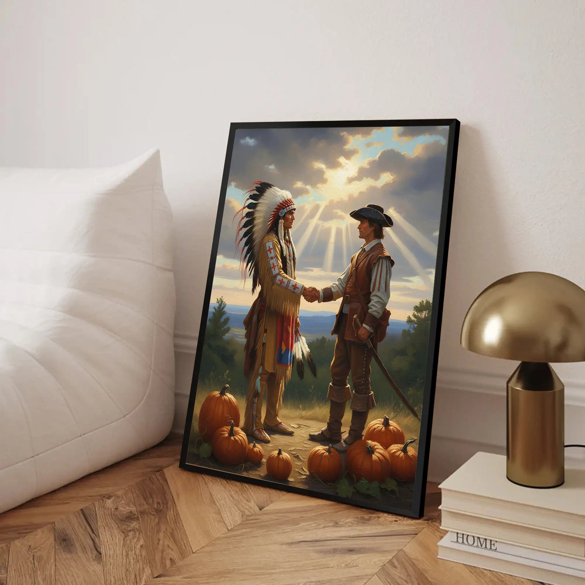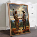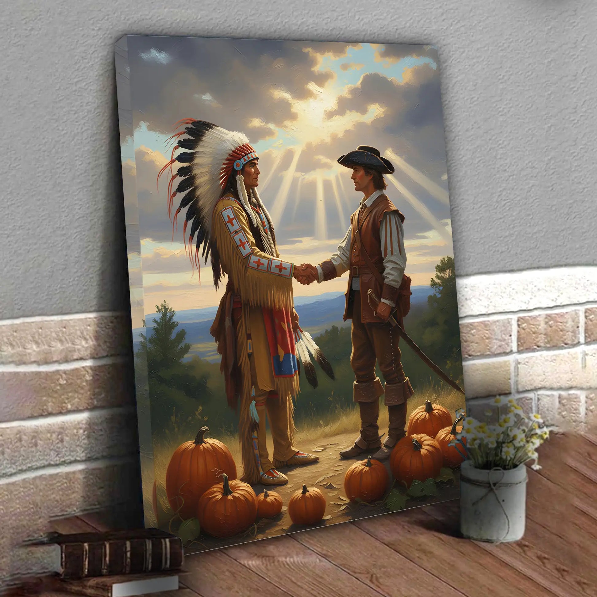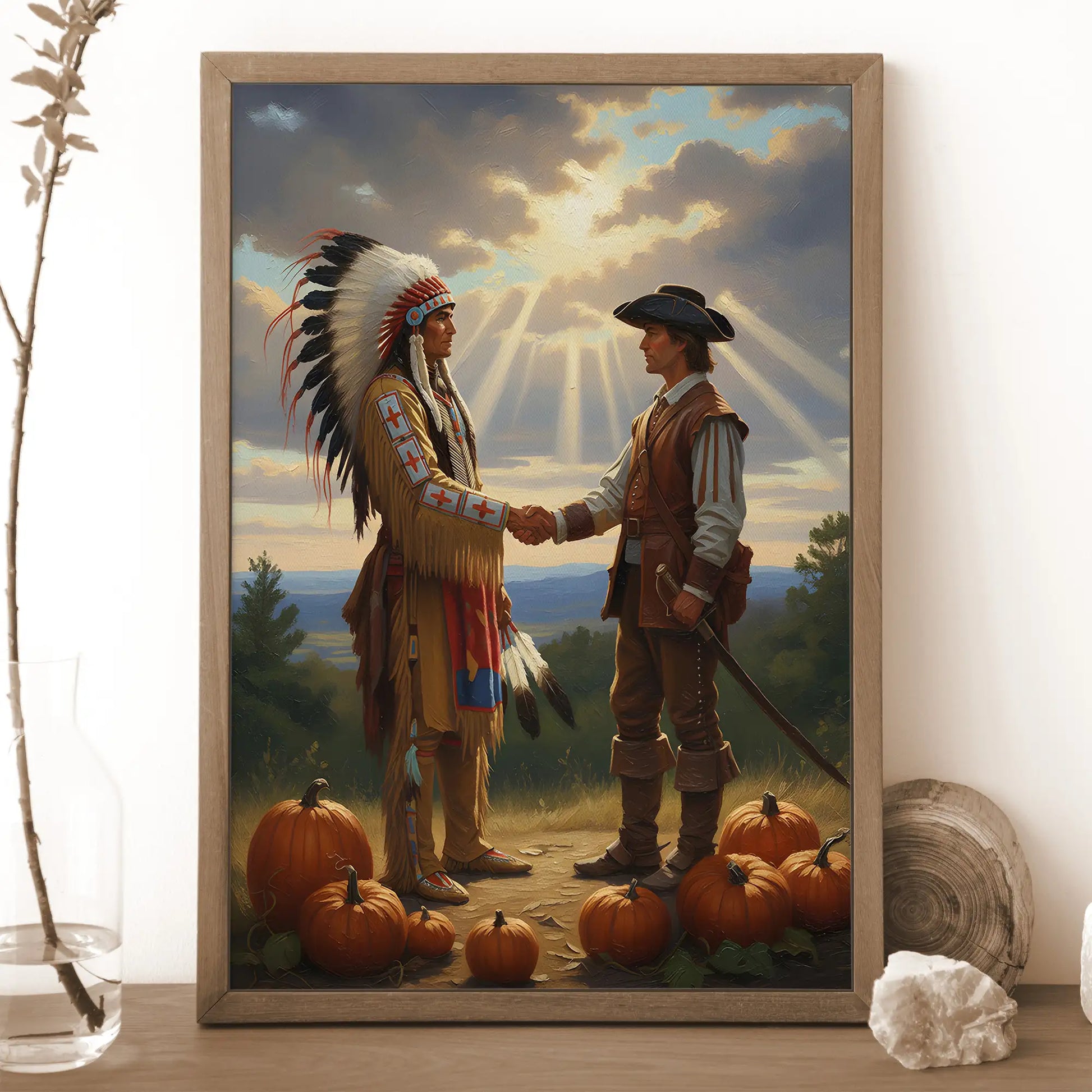 This canvas artwork depicts a powerful symbolic moment between a tribal chief and an early settler, shaking hands under the rays of the setting sun. Surrounded by pumpkins and autumn scenery, the image represents themes of respect, unity, and the meeting of two worlds. The detailed attire of the chief with his feathered headdress and the settler’s traditional clothing highlights cultural heritage and history. Inspired by indigenous and colonial encounters, the design carries a message of peace and understanding. Perfect as a meaningful addition to any home, it celebrates tradition, reconciliation, and cultural storytelling.