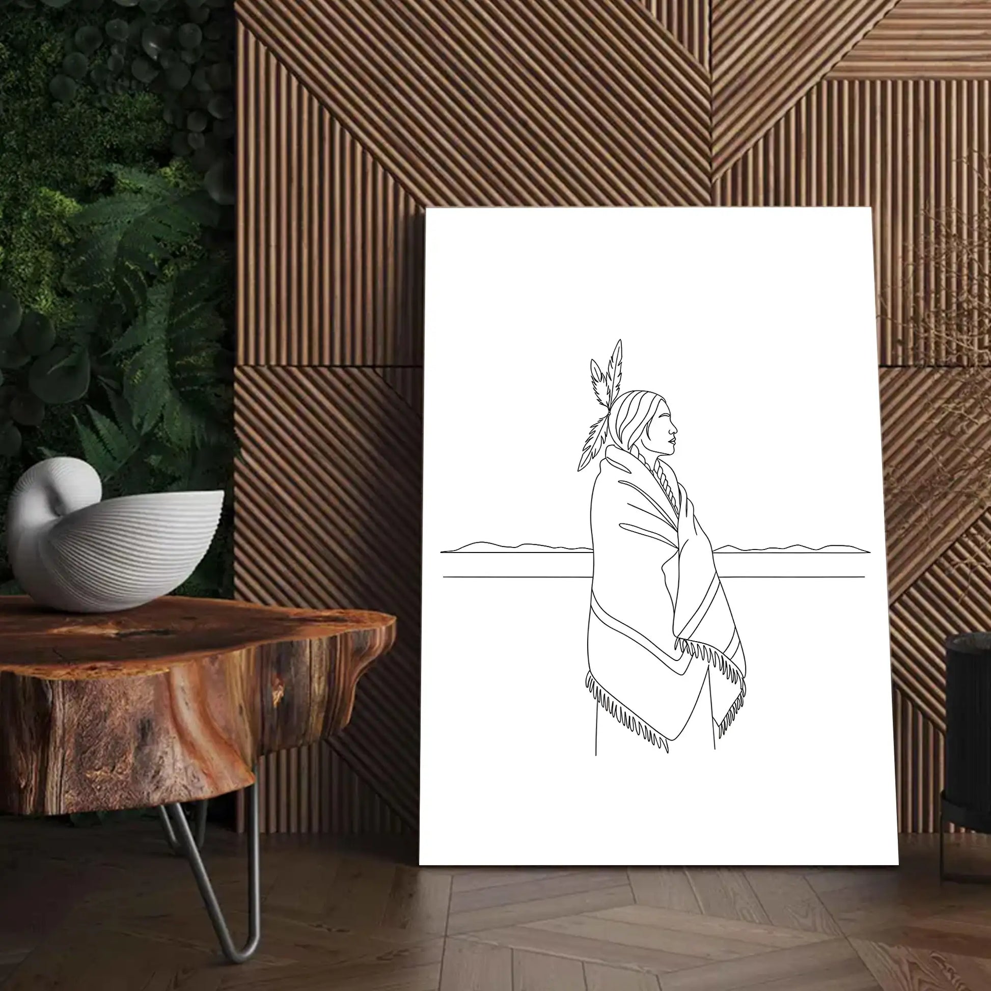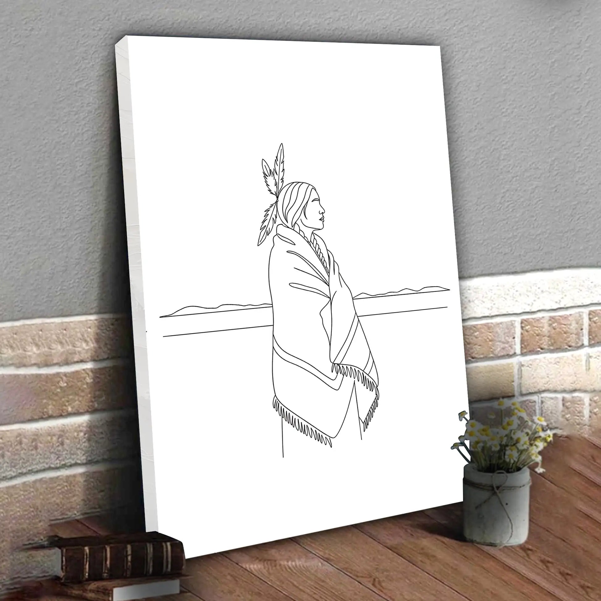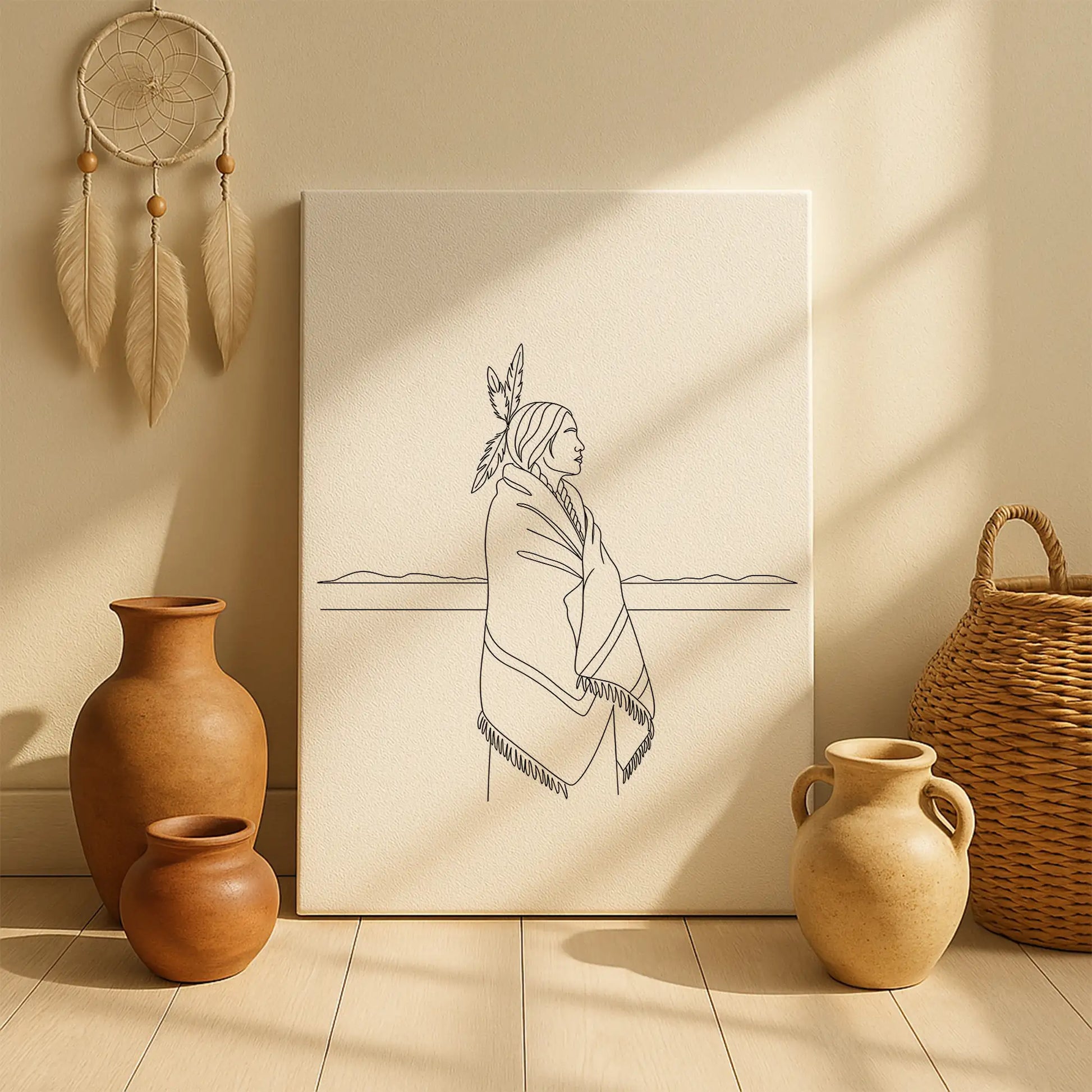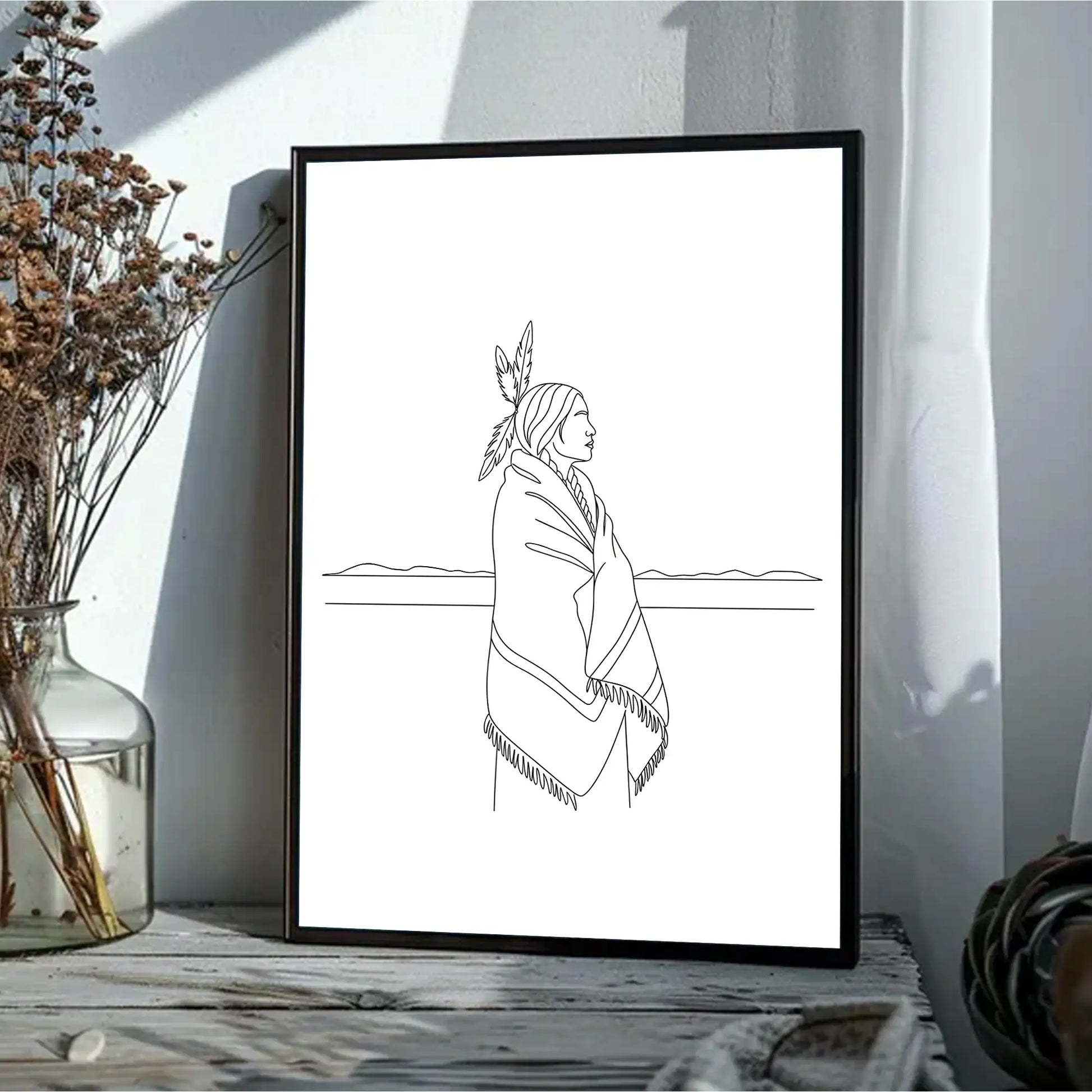 This canvas artwork honors indigenous heritage through a minimalist line art design of a woman wearing a feather headdress and wrapped in a traditional blanket. The simple black outline against a clean background captures both elegance and strength, symbolizing cultural pride and deep connection to the land. Inspired by tribal traditions of North America, the image reflects dignity, identity, and resilience carried through generations. Its modern minimalist approach makes it versatile for any interior style while retaining its cultural essence. Perfect as wall decor for living rooms, studios, or meditation spaces, it combines tradition and contemporary artistry in a timeless way.