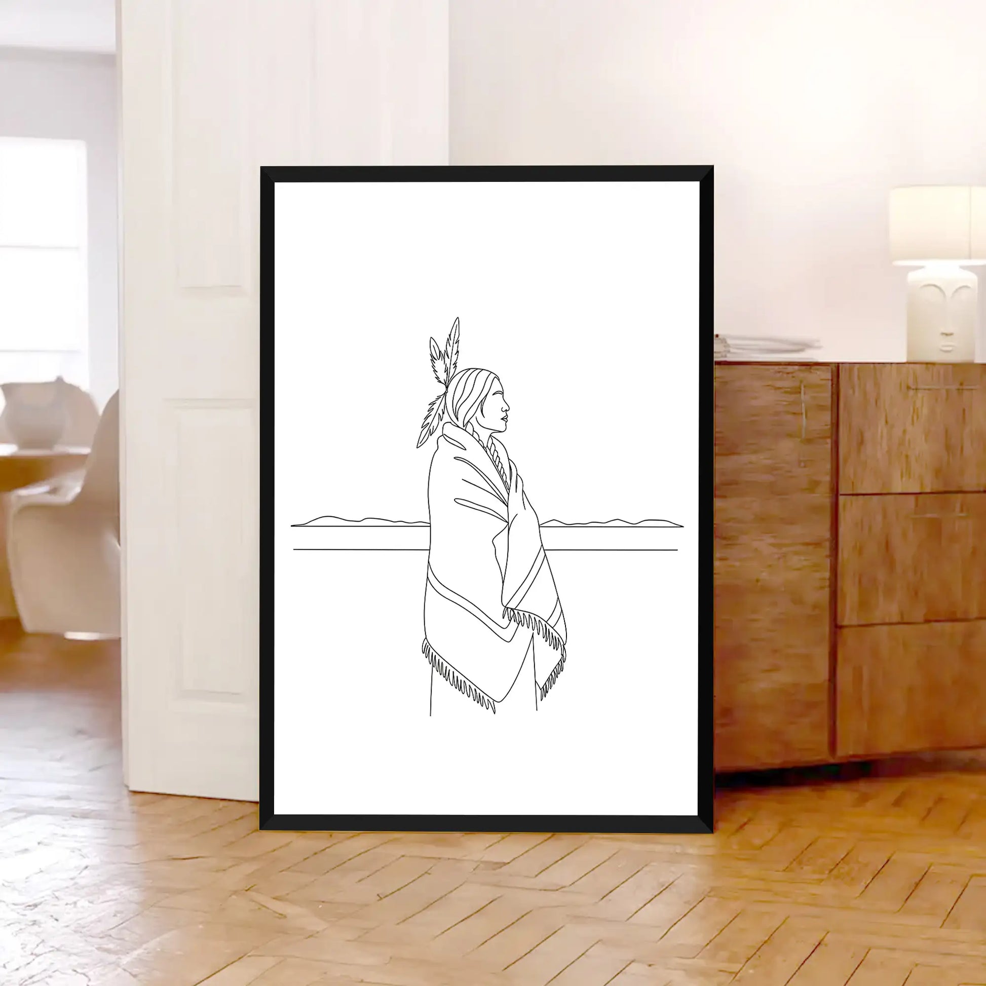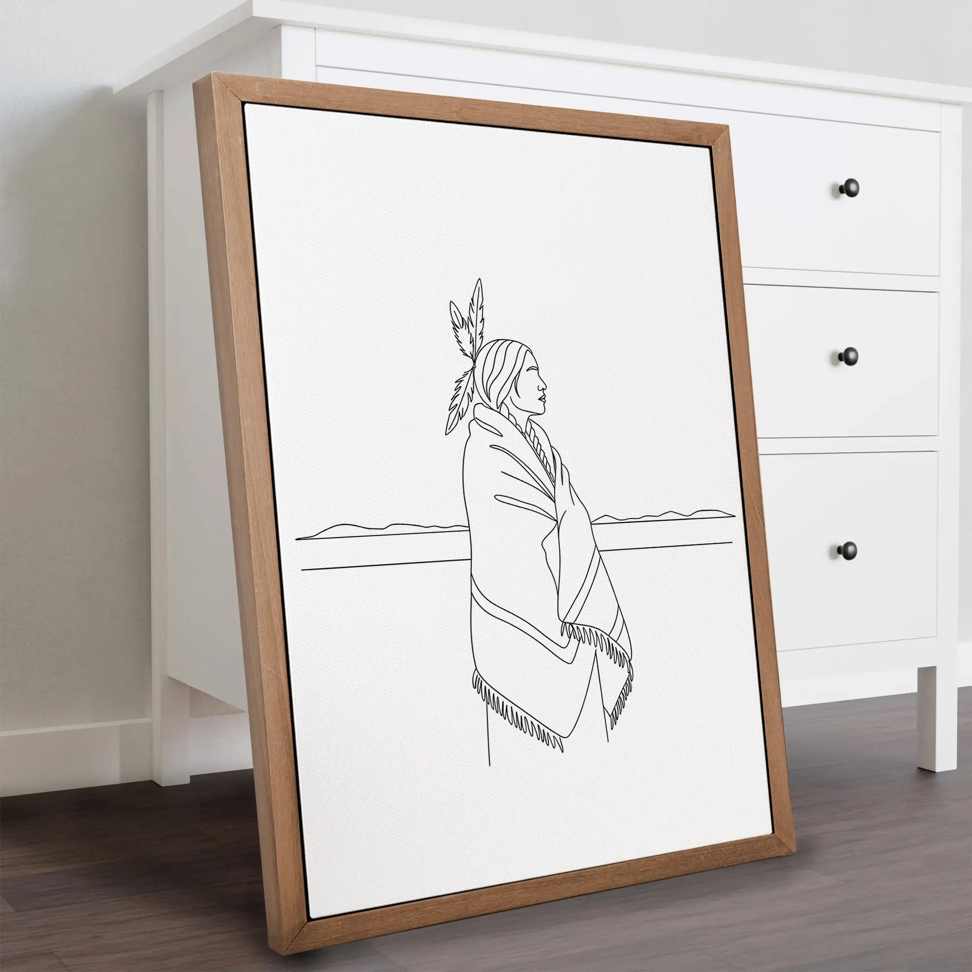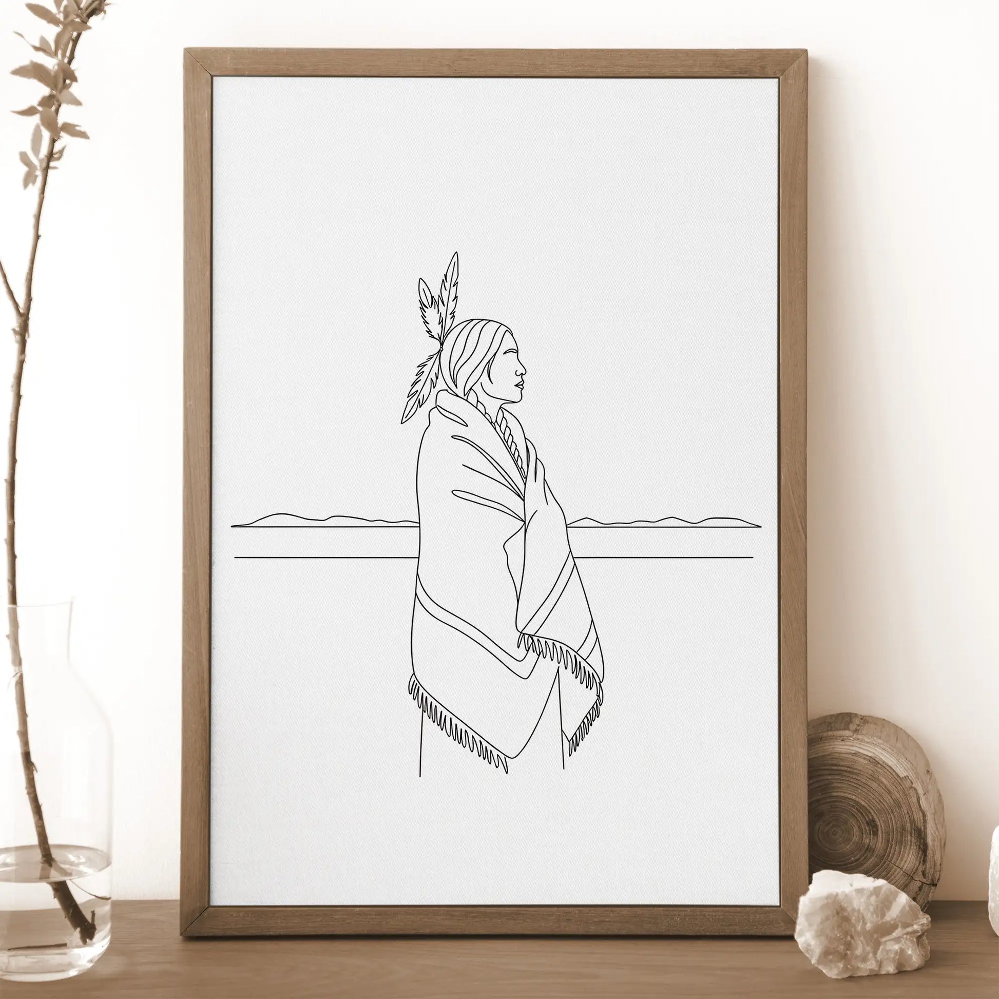 This canvas artwork honors indigenous heritage through a minimalist line art design of a woman wearing a feather headdress and wrapped in a traditional blanket. The simple black outline against a clean background captures both elegance and strength, symbolizing cultural pride and deep connection to the land. Inspired by tribal traditions of North America, the image reflects dignity, identity, and resilience carried through generations. Its modern minimalist approach makes it versatile for any interior style while retaining its cultural essence. Perfect as wall decor for living rooms, studios, or meditation spaces, it combines tradition and contemporary artistry in a timeless way.
