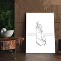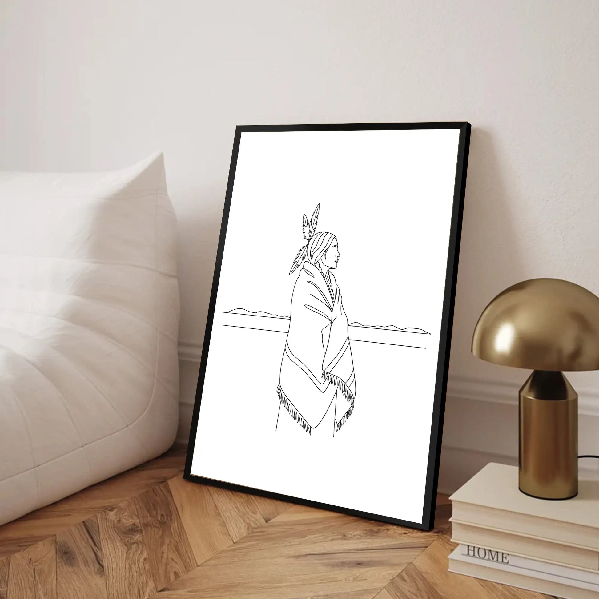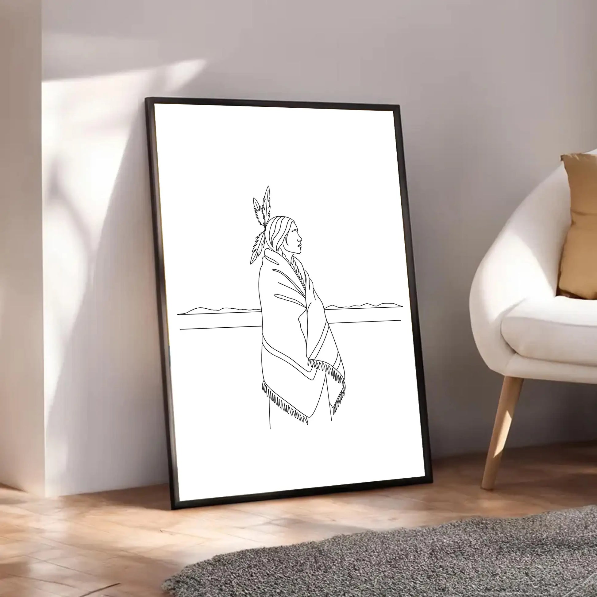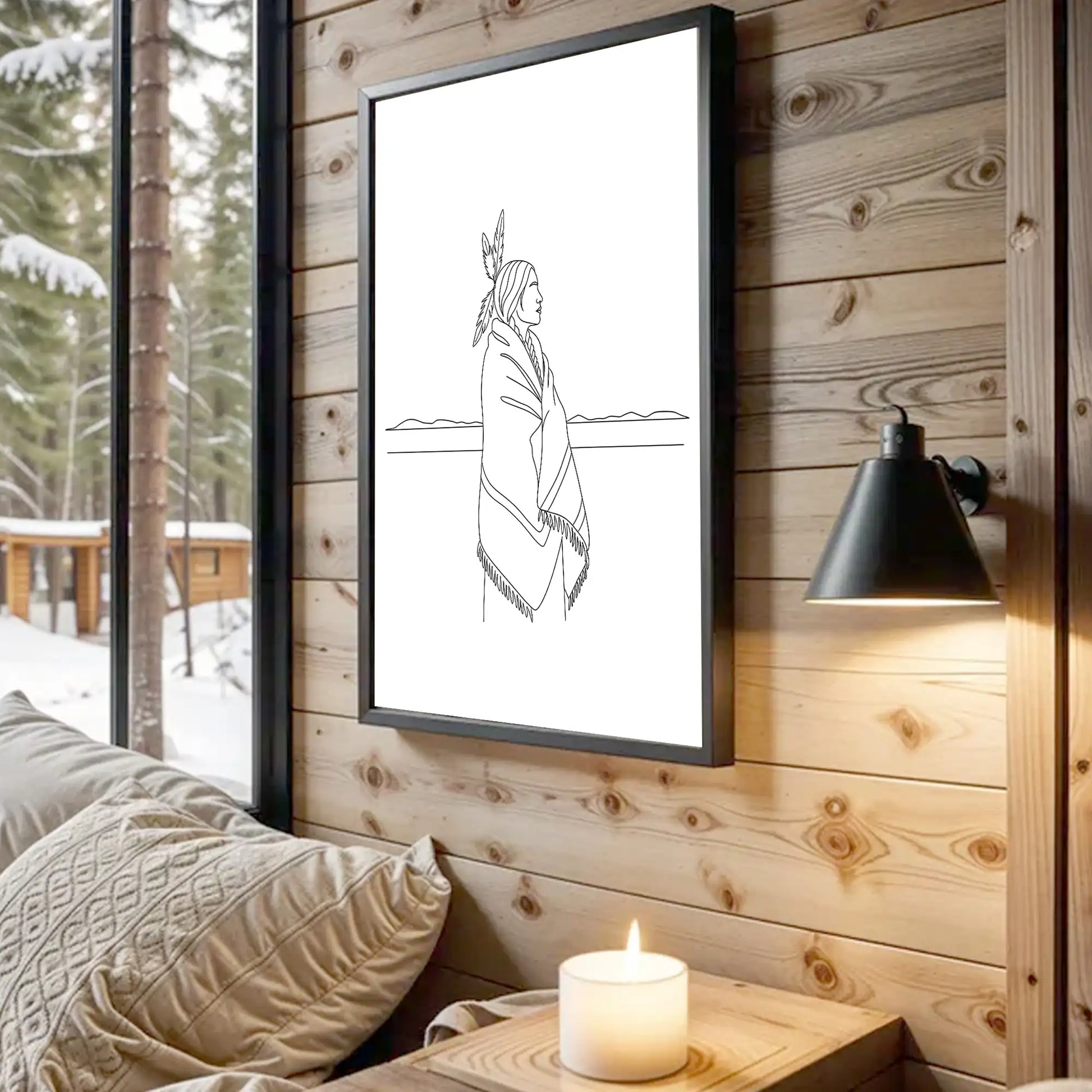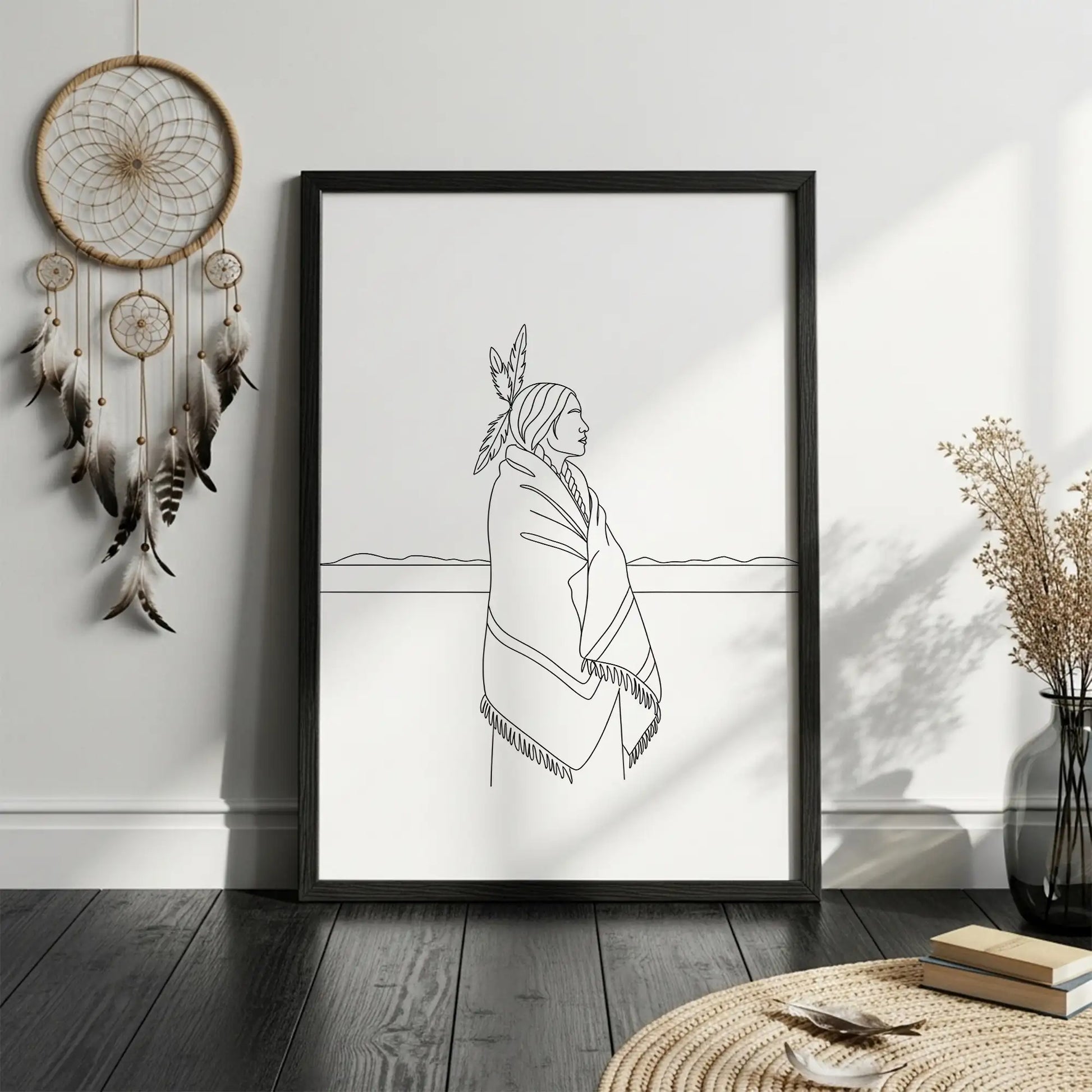 This canvas artwork honors indigenous heritage through a minimalist line art design of a woman wearing a feather headdress and wrapped in a traditional blanket. The simple black outline against a clean background captures both elegance and strength, symbolizing cultural pride and deep connection to the land. Inspired by tribal traditions of North America, the image reflects dignity, identity, and resilience carried through generations. Its modern minimalist approach makes it versatile for any interior style while retaining its cultural essence. Perfect as wall decor for living rooms, studios, or meditation spaces, it combines tradition and contemporary artistry in a timeless way.