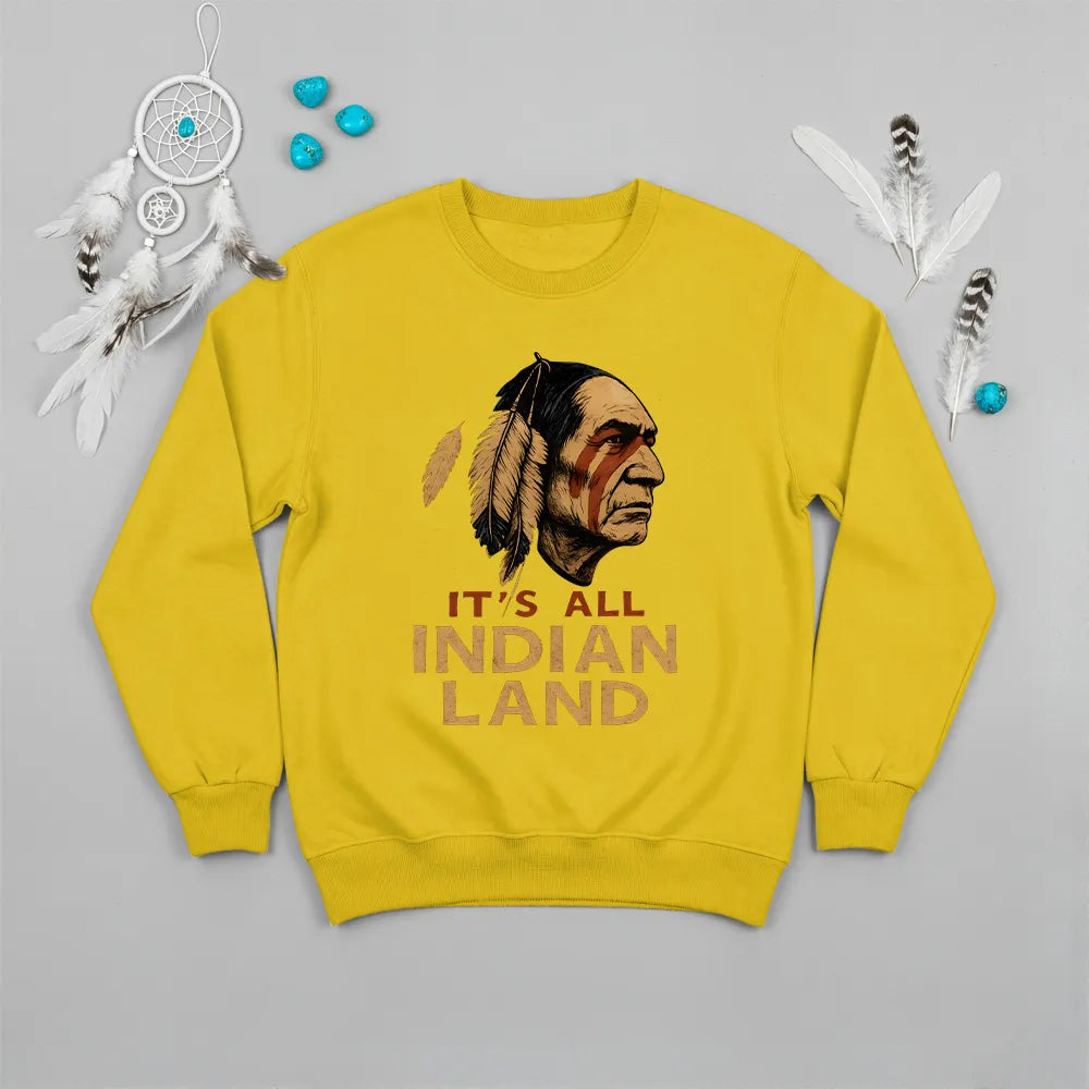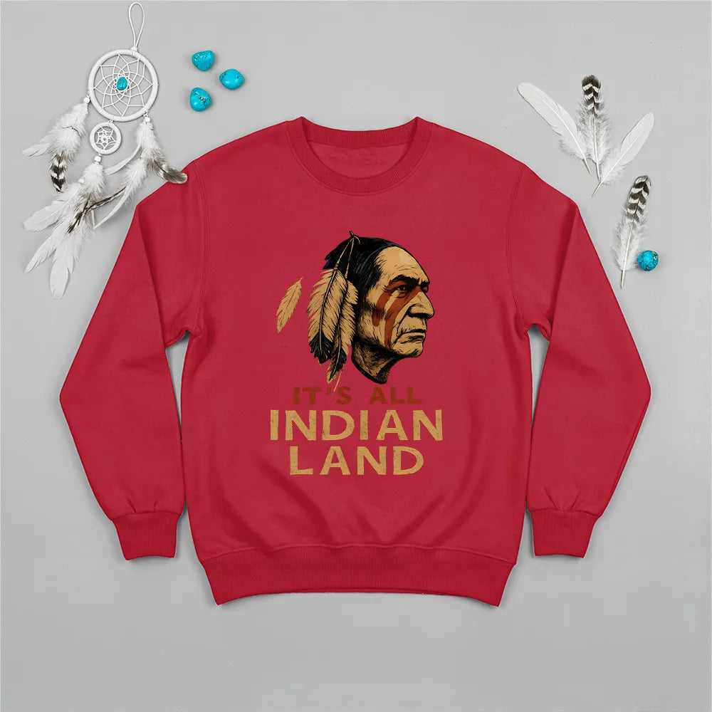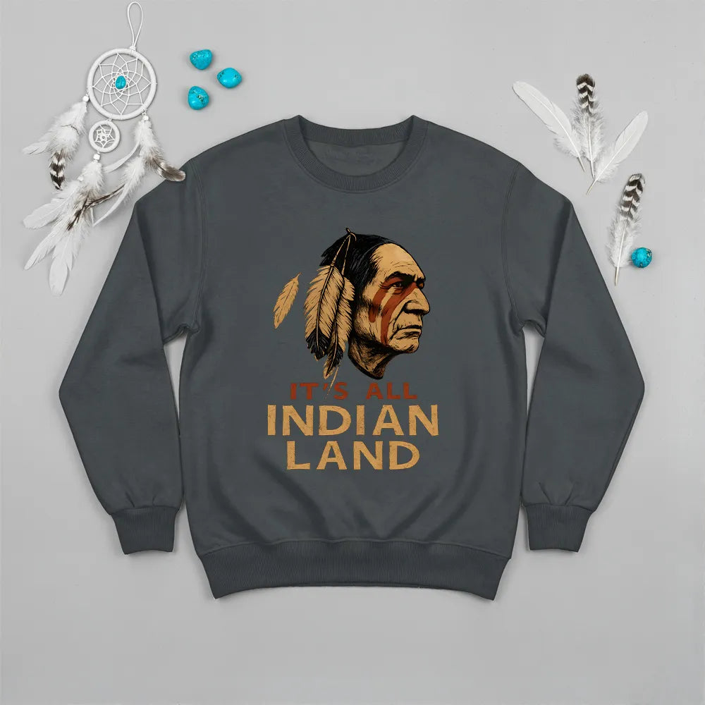 Make an unwavering statement with our "It’s All Indian Land" Sweatshirt, a powerful emblem of Native American sovereignty and historical truth. This cozy and comfortable sweatshirt features a majestic traditional headdress, adorned with symbolic feathers, representing honor, courage, and a profound connection to ancestral lands and spirits. The bold quote directly asserts the enduring indigenous presence across the continent, challenging colonial narratives and celebrating cultural resilience. designed by the deep wisdom and unyielding spirit of Native nations, particularly from the Great Plains, this garment is more than just clothing; it's a declaration of indigenous rights.