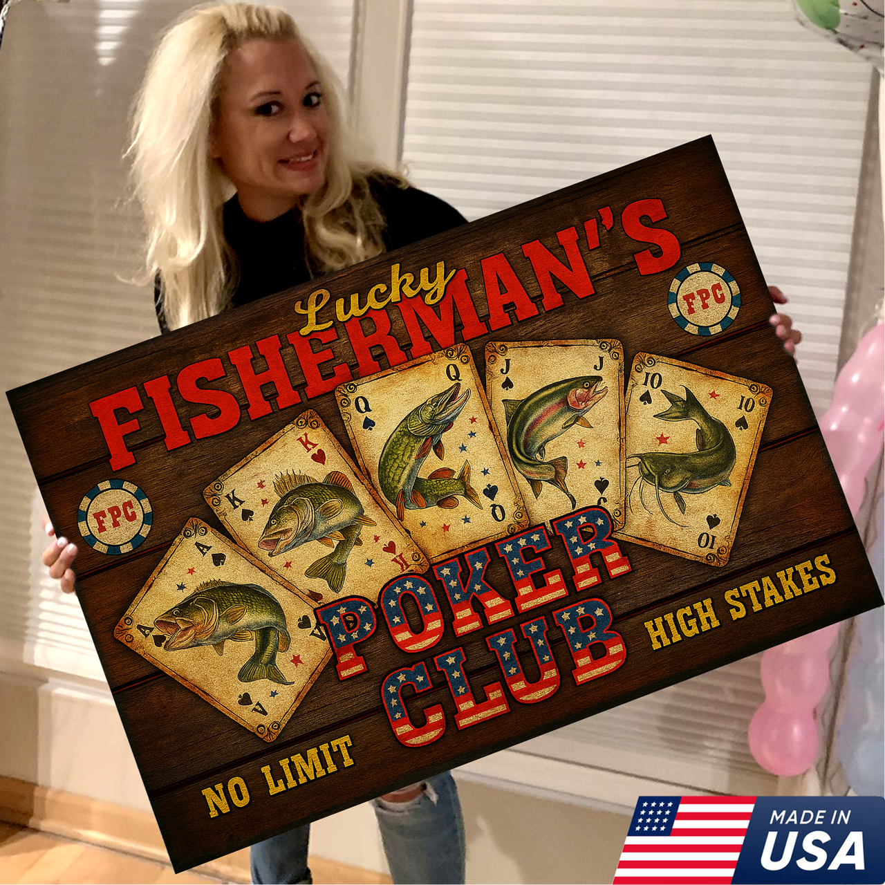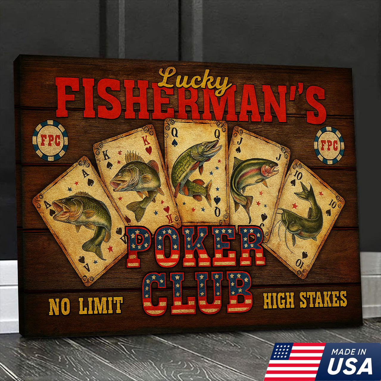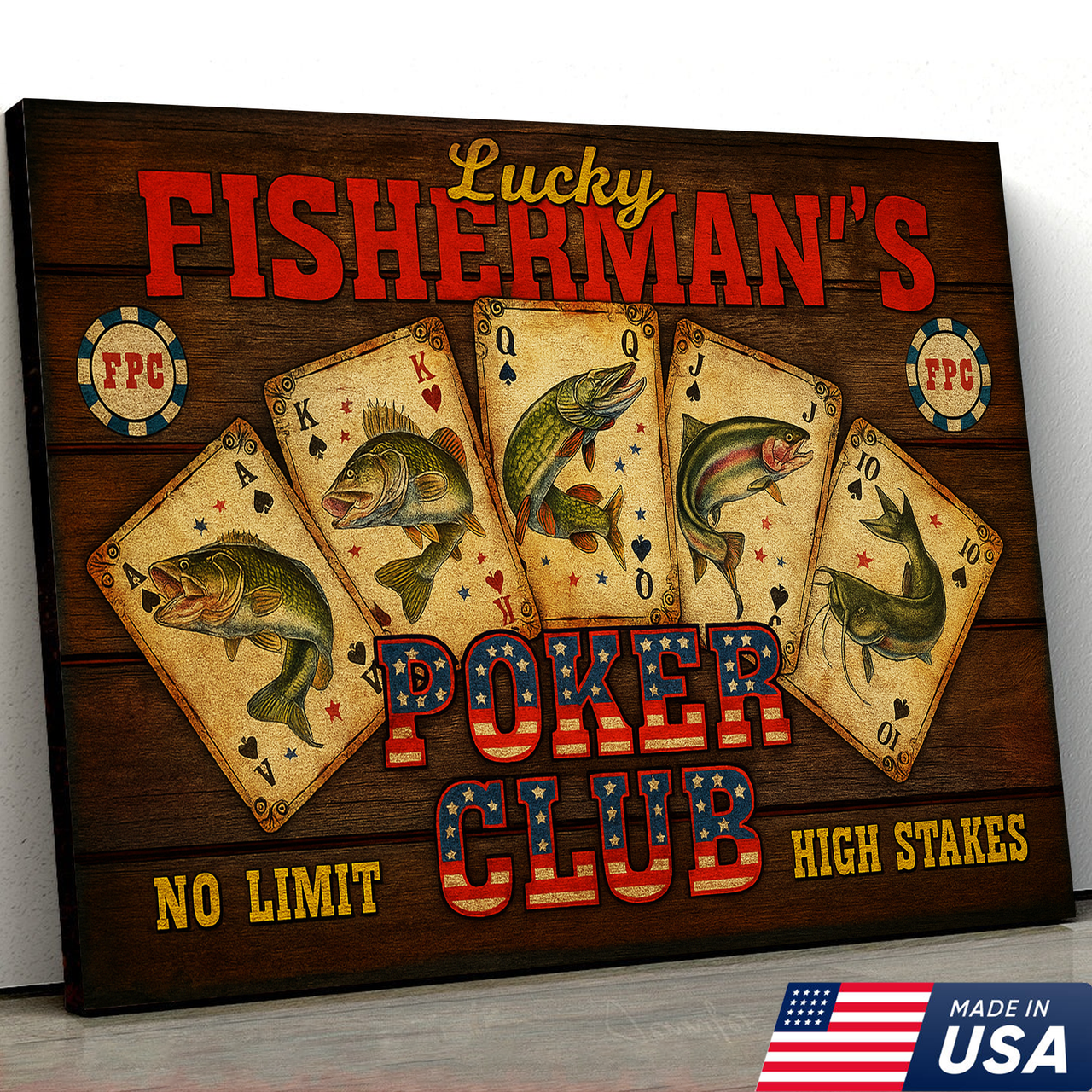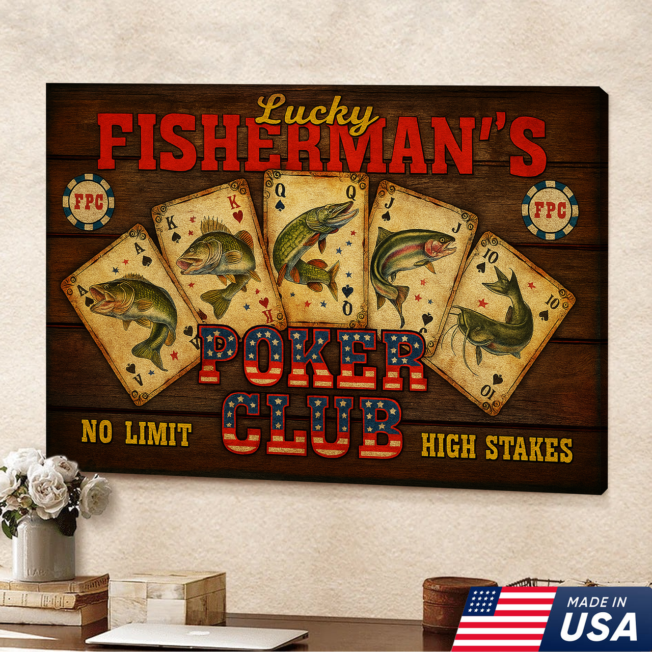 Lucky Fisherman’s Poker Club Wall Art – Vintage Fishing Playing Cards Canvas for Man Cave