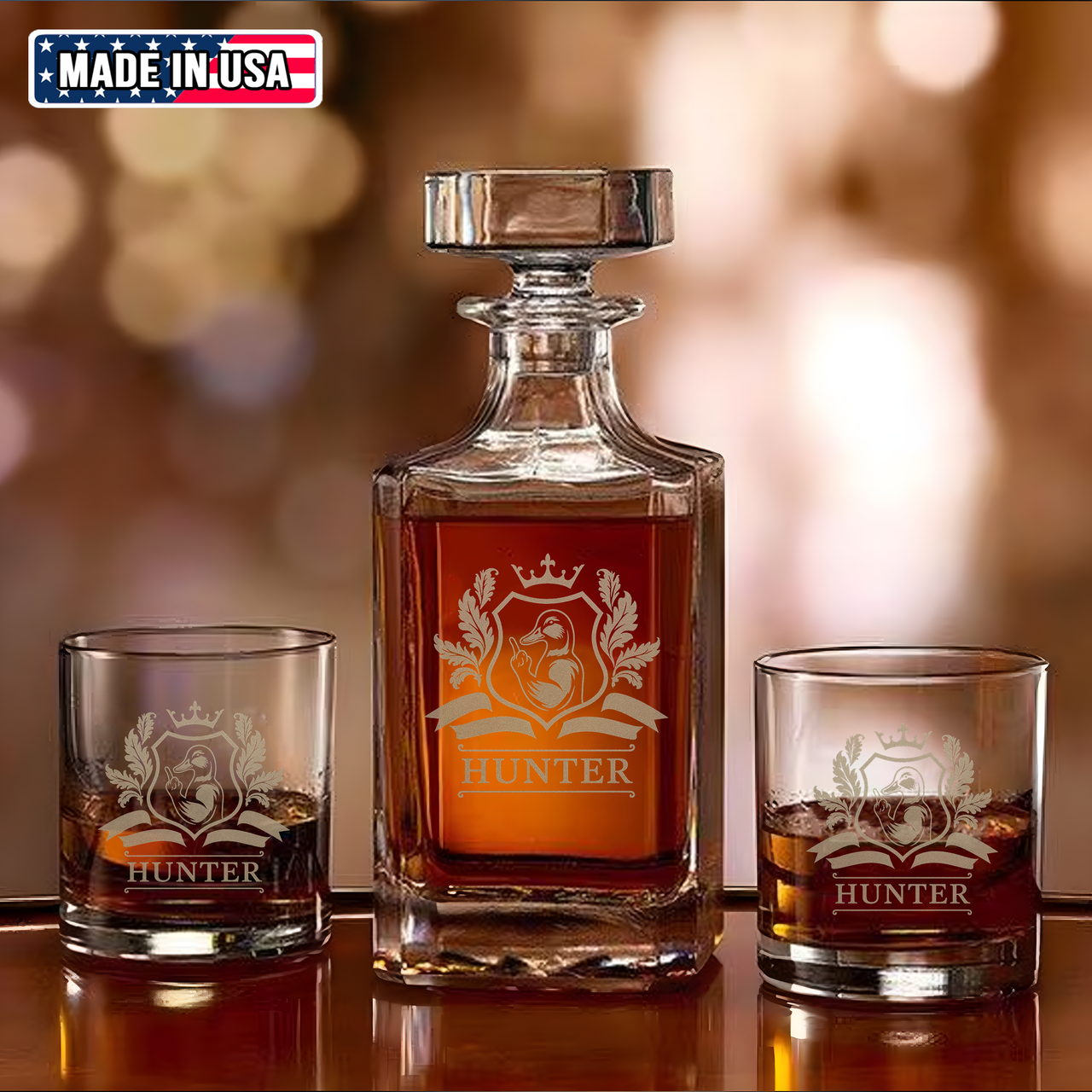 Luxury Hunter’s Whiskey Decanter & Glass Set – Engraved Duck Glassware, Unique Gift for Men & Hunting Lovers