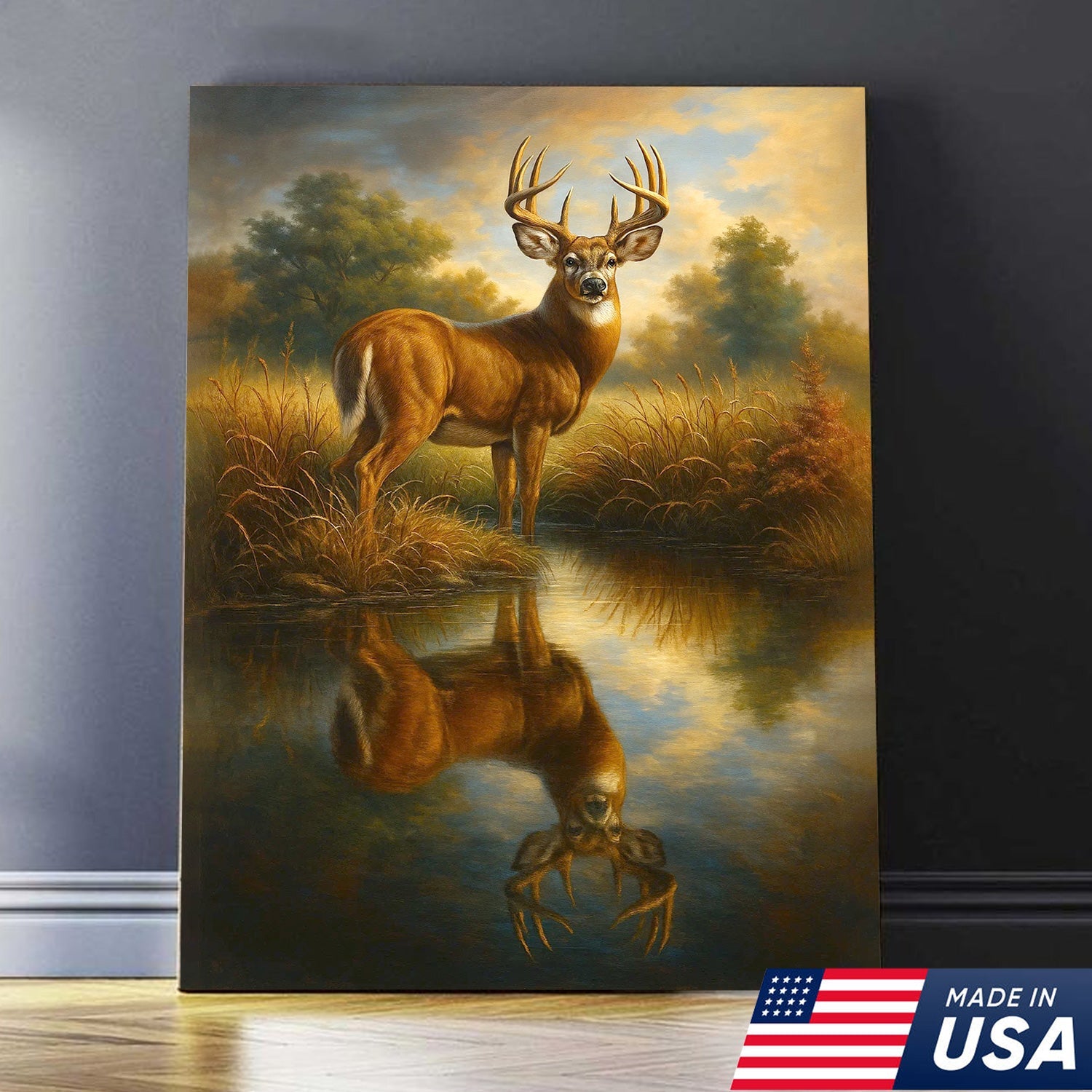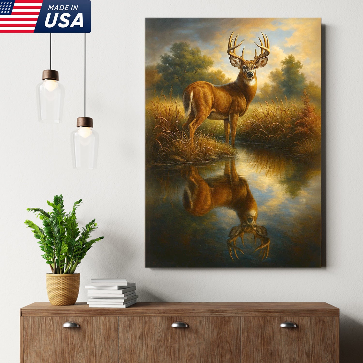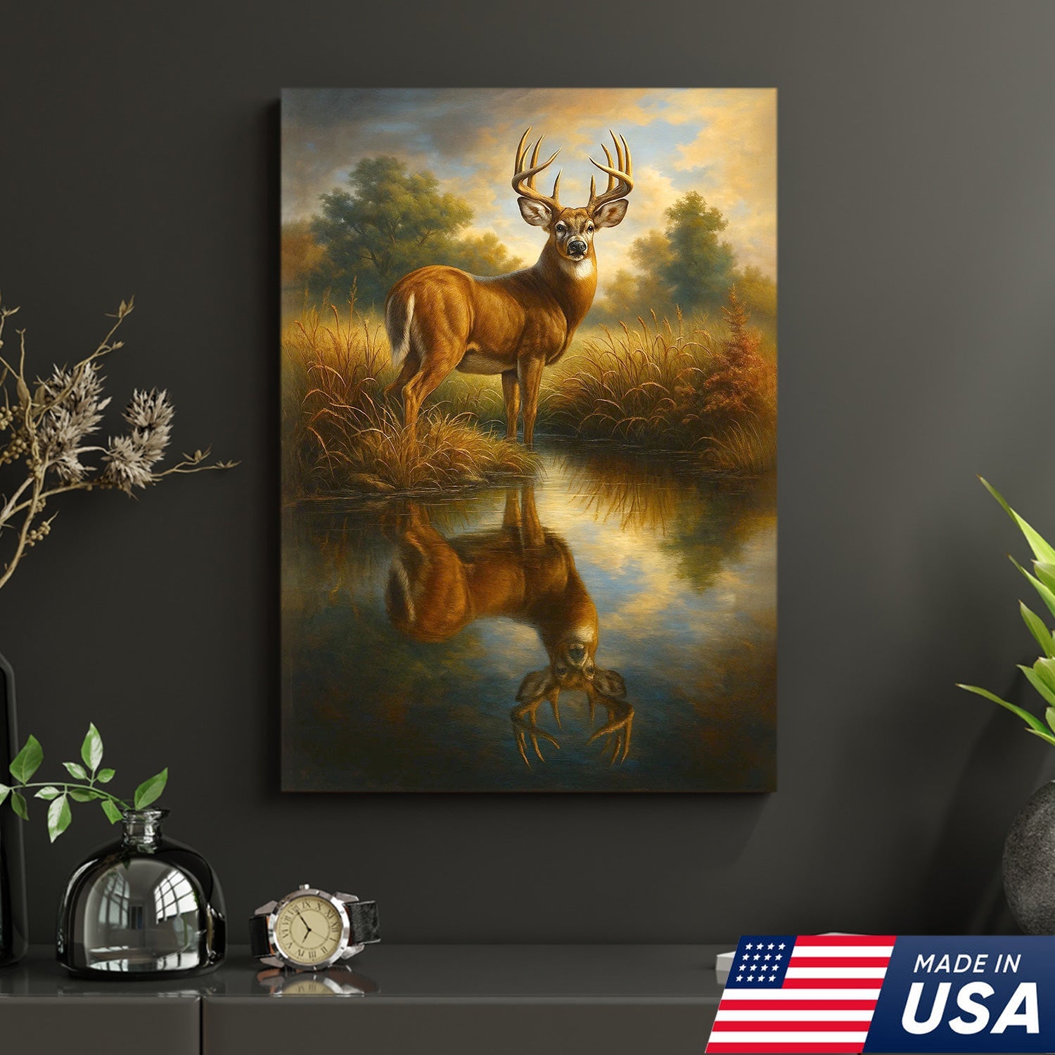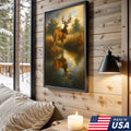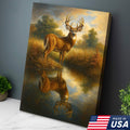 Majestic Deer Reflection Canvas Wall Art – Rustic Wildlife Nature Scene – Cabin and Lodge Decor