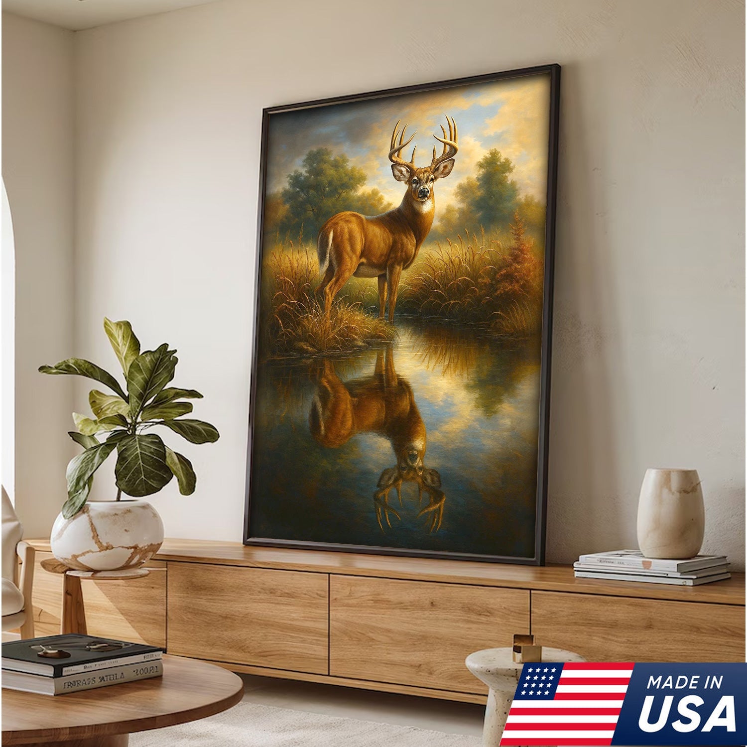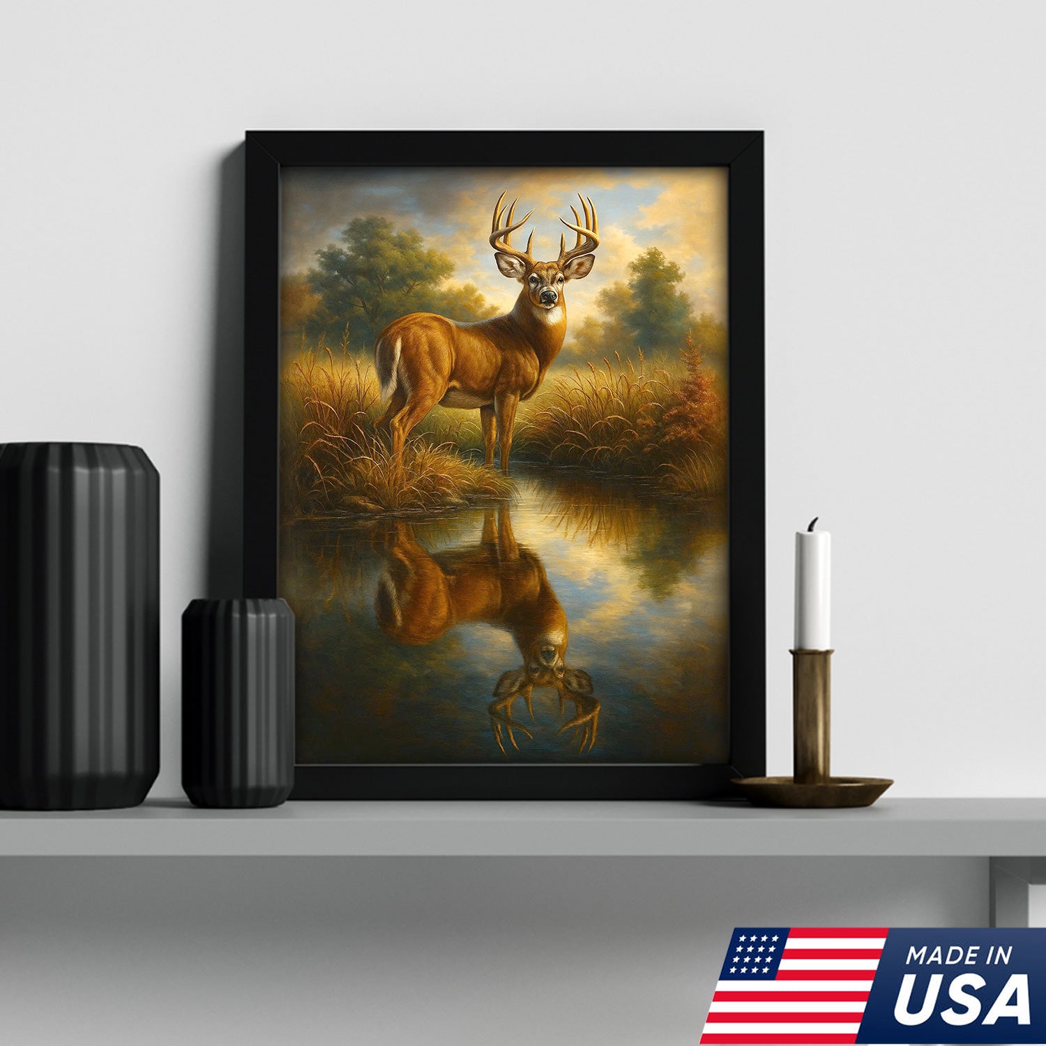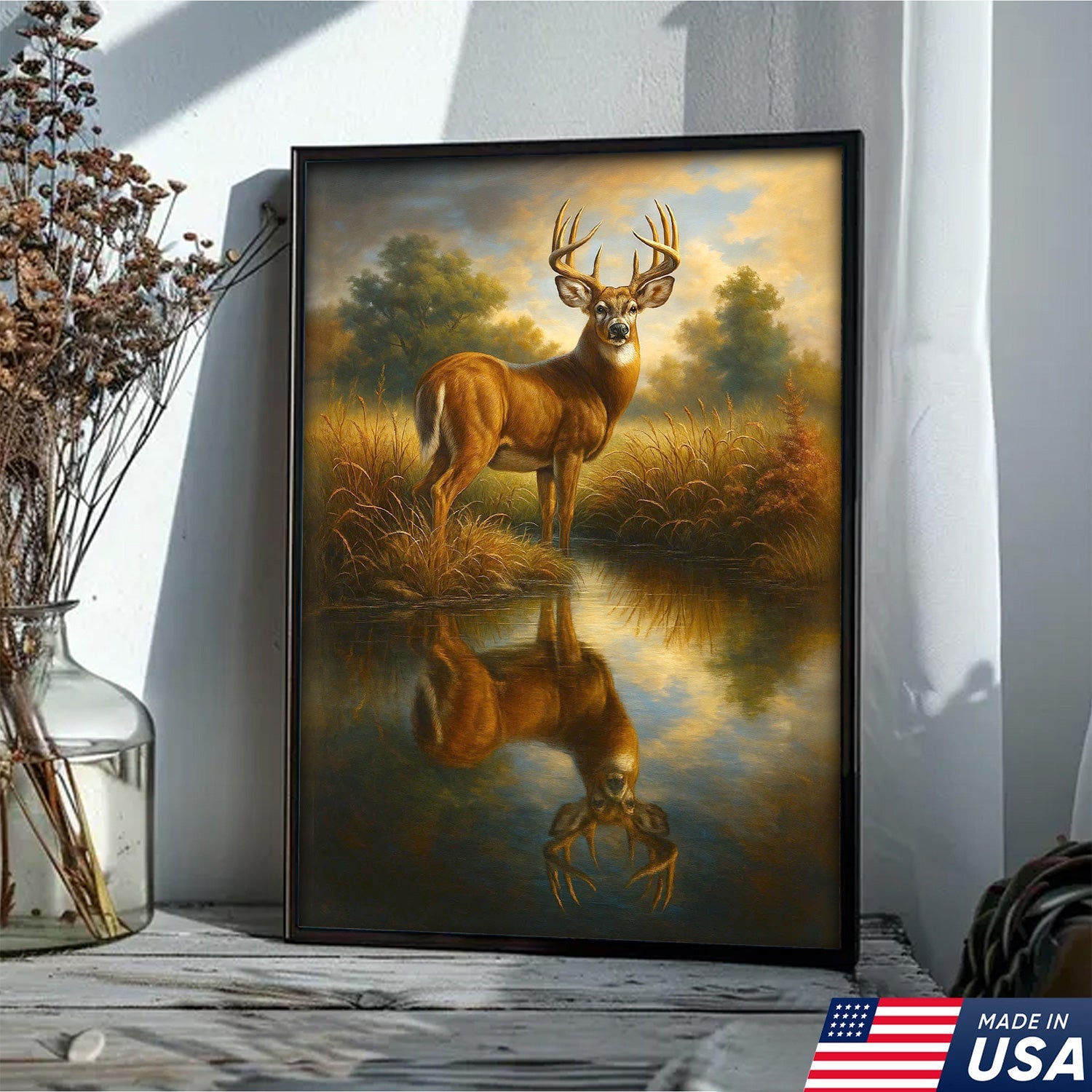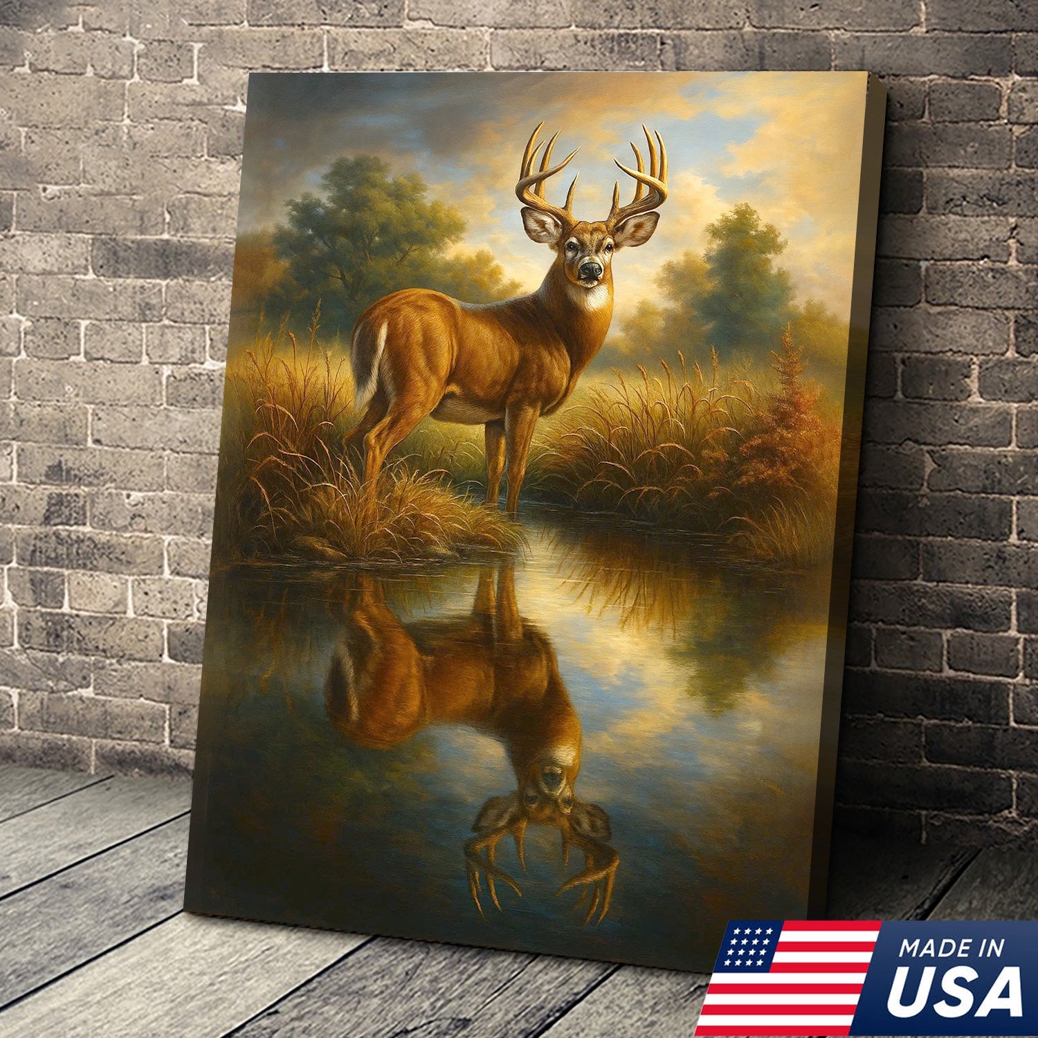 Majestic Deer Reflection Canvas Wall Art – Rustic Wildlife Nature Scene – Cabin and Lodge Decor
