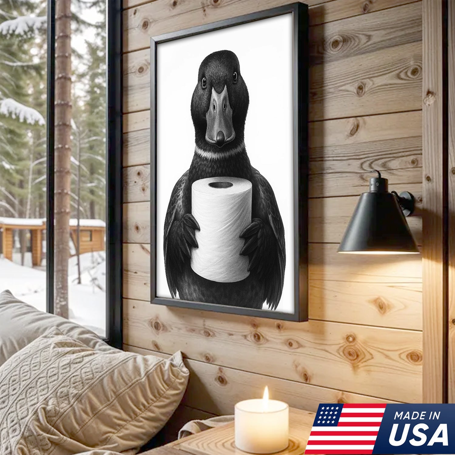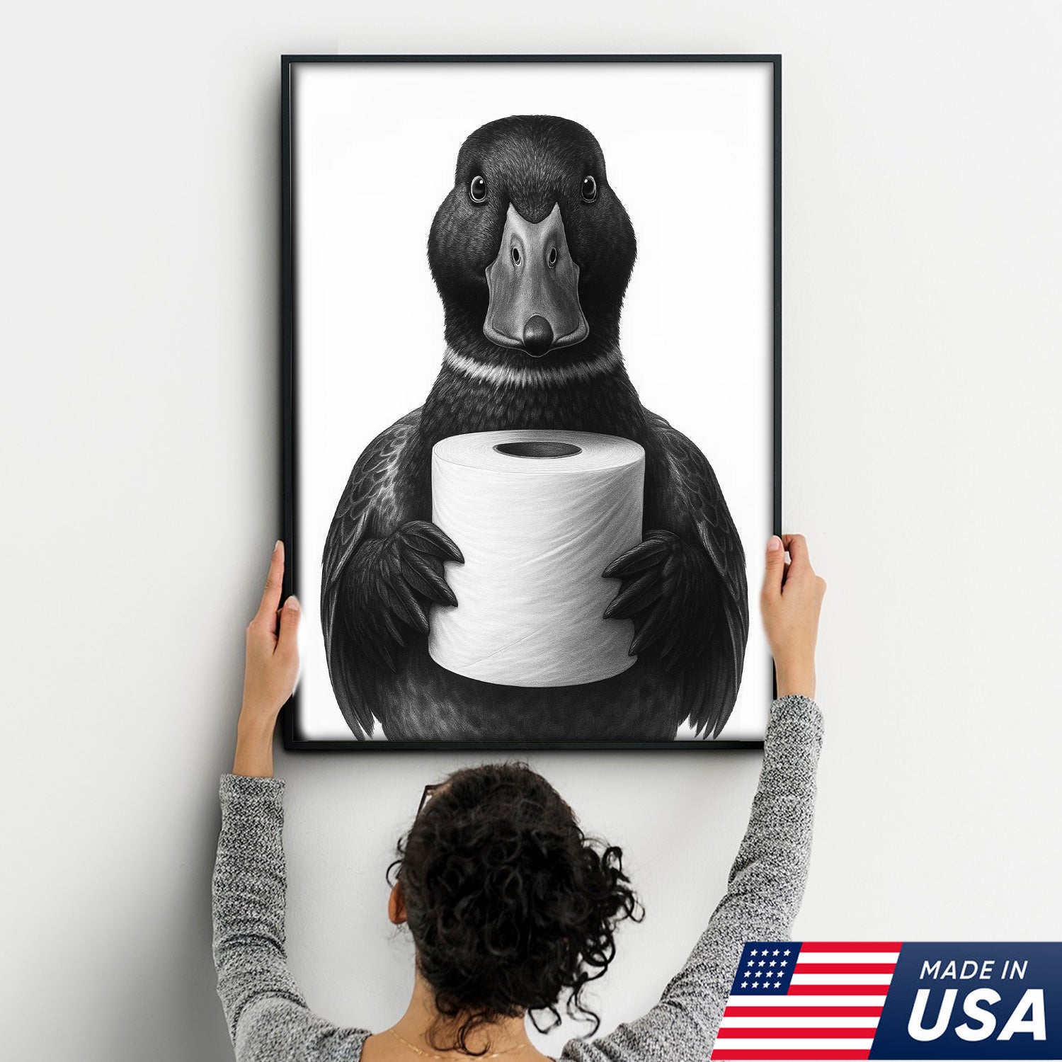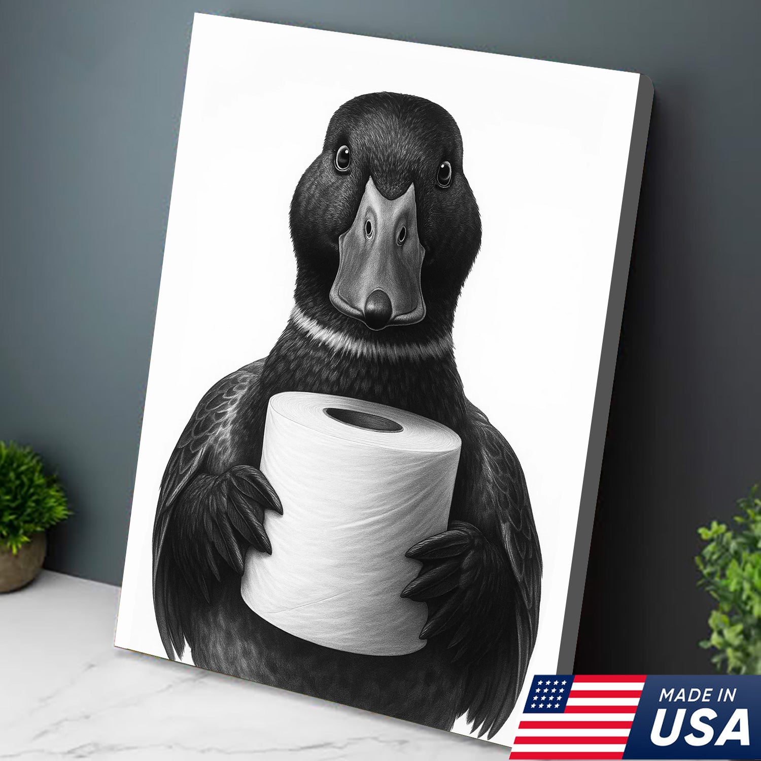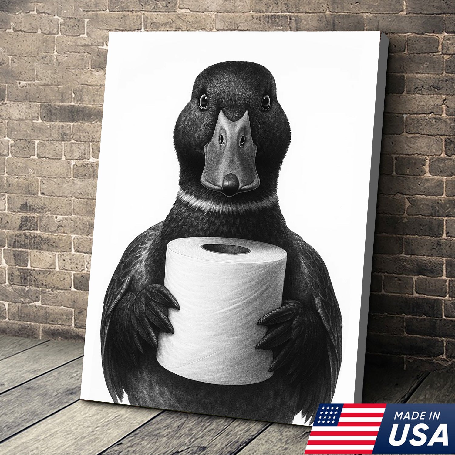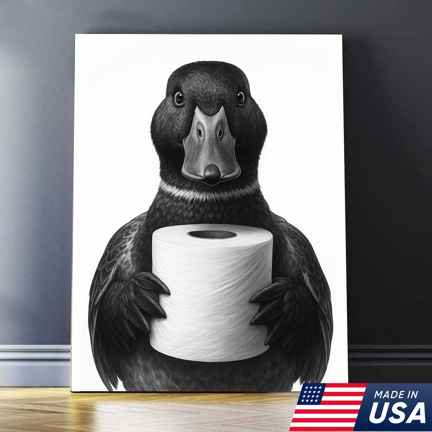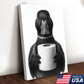 Mallard Duck Canvas Wall Art, Funny Animal Portrait Holding Toilet Paper, Black and White Bathroom Decor Print