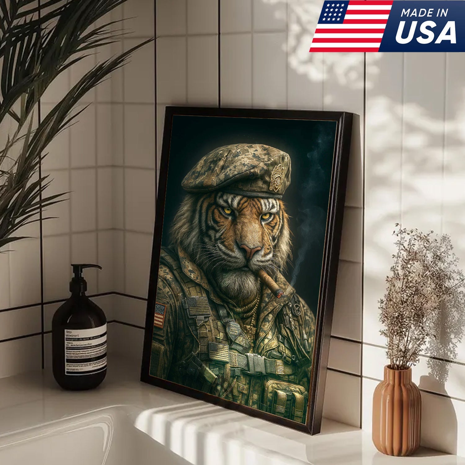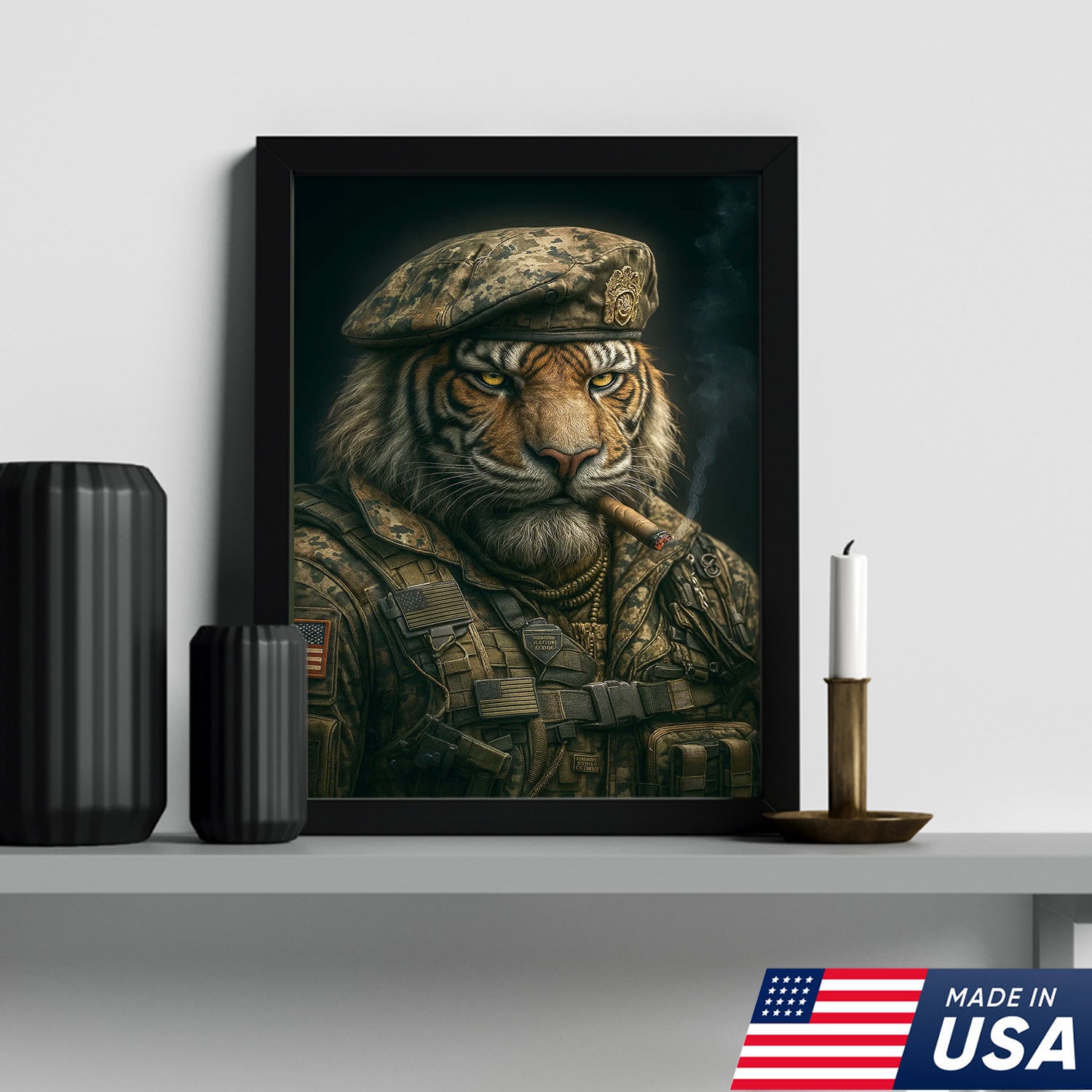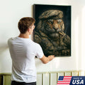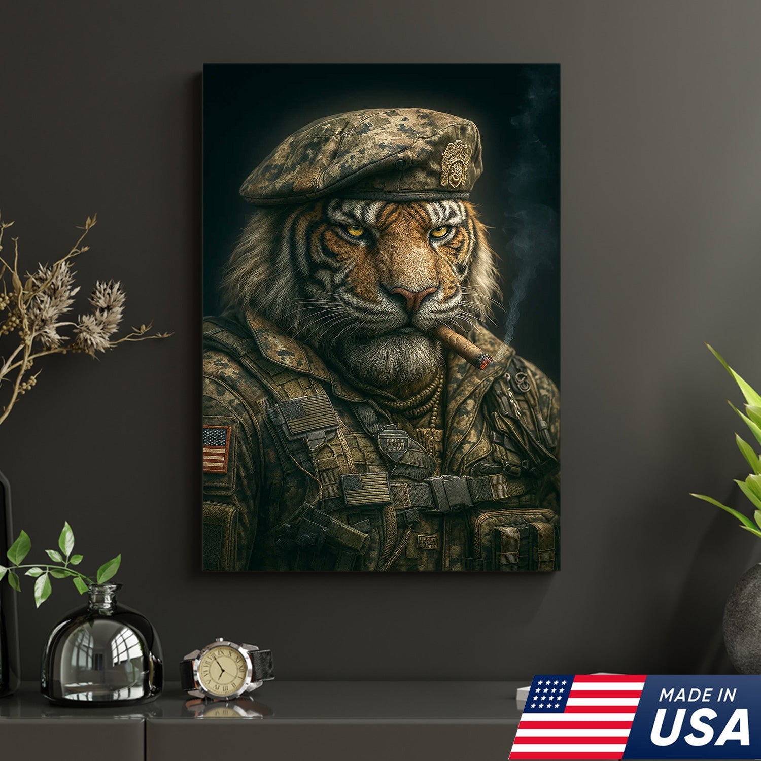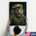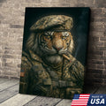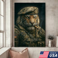 Military Tiger Canvas Wall Art, Warrior Animal Portrait in Army Uniform, Bold Patriotic Home Decor Gift for Men