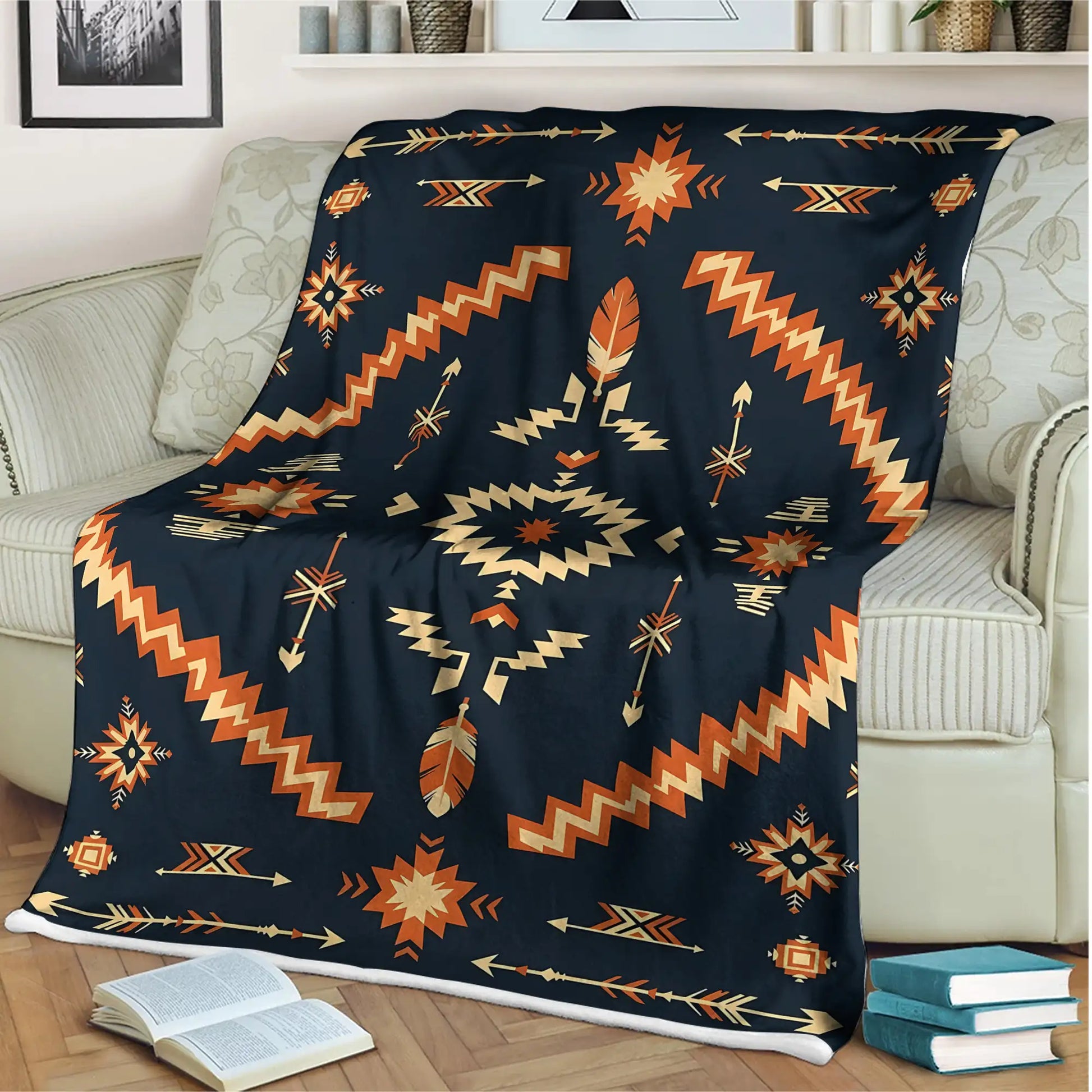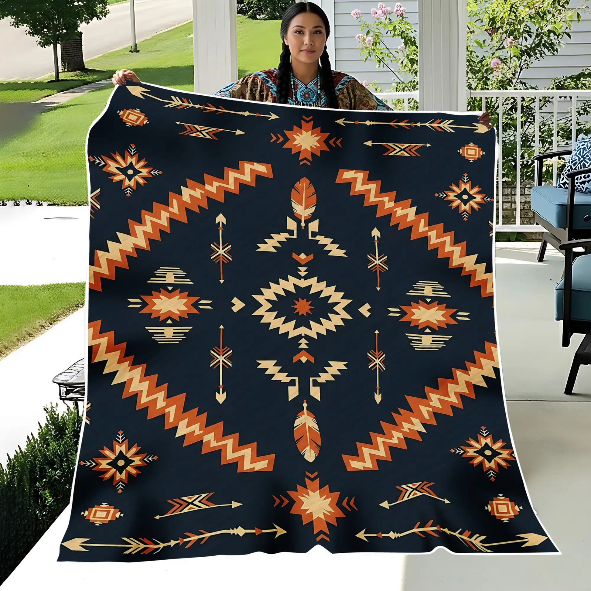 This blanket features a bold Native America design with striking arrows, feathers, and geometric star motifs in warm orange and beige tones against a deep background. Inspired by the traditions of Plains tribes, the arrows symbolize direction and protection, while the feathers represent freedom and connection to the spirit world. The central star pattern highlights guidance and strength, making this blanket not only a cozy accessory but also a meaningful piece of cultural storytelling. Perfect for draping over your sofa, adding warmth to your bedroom, or using during cool outdoor evenings, it blends tradition with comfort effortlessly.