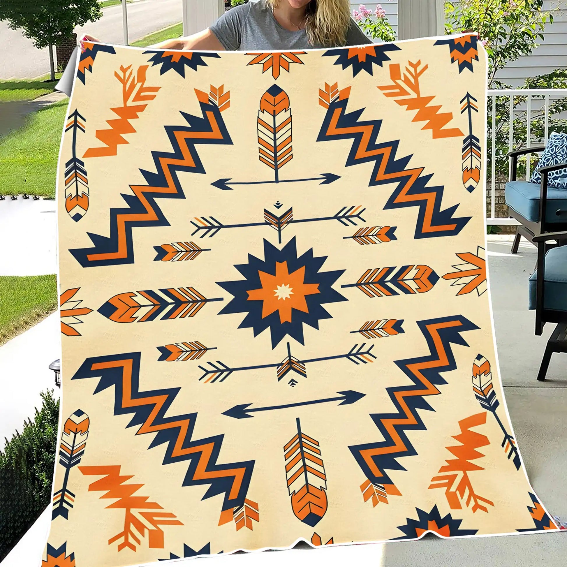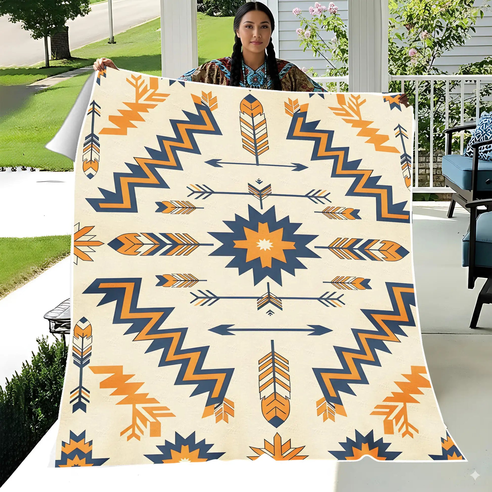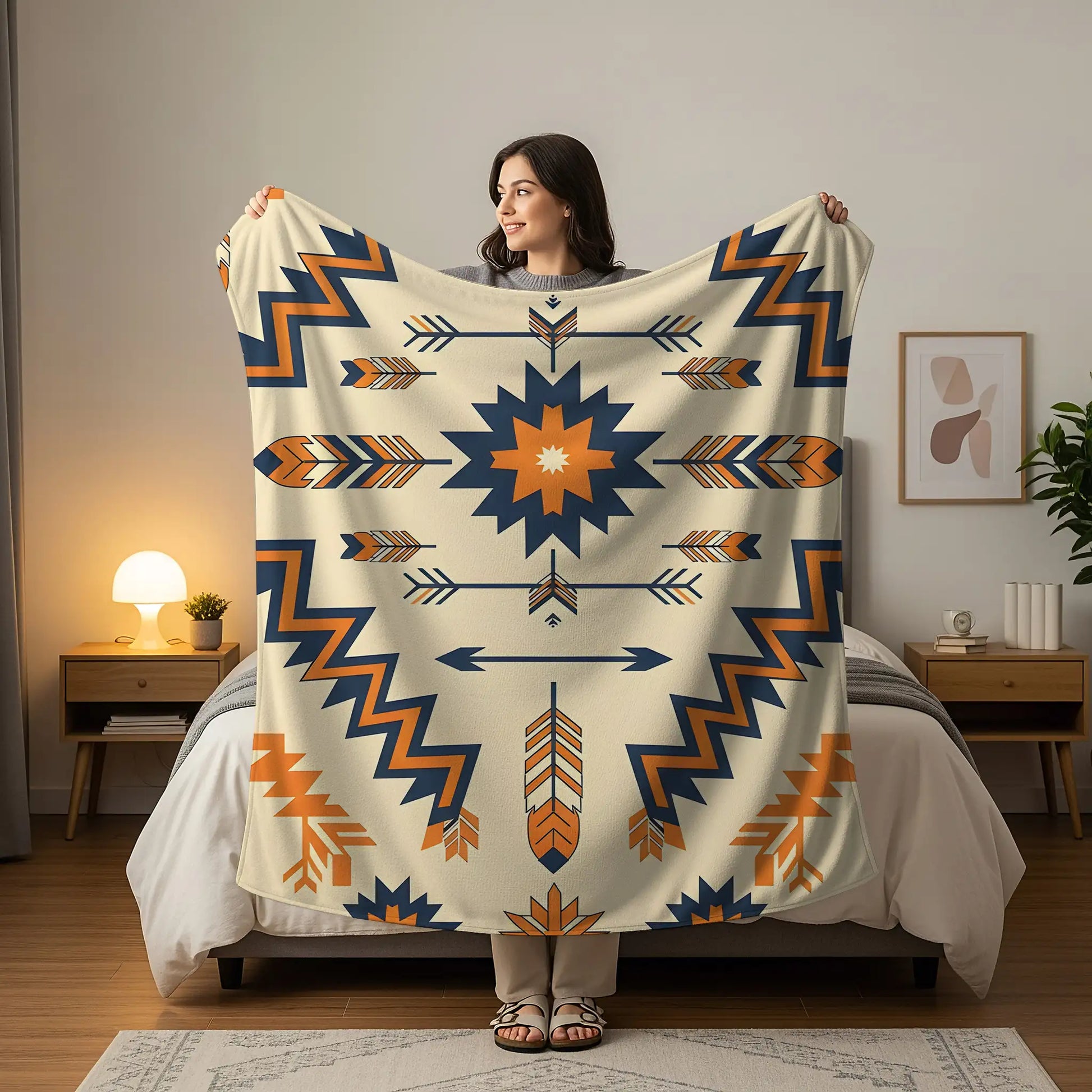 This fleece blanket features a striking Native America tribal design with bold arrow and star patterns in orange and navy set against a cream background. Inspired by the artistry of Southwestern tribes, the motif represents direction, guidance, and strength, while the star symbolizes light and unity. Made from soft fleece, it offers comfort, warmth, and durability, making it suitable for both indoor relaxation and outdoor adventures. Beyond its practical use, this blanket serves as a meaningful decorative piece, celebrating tradition and cultural storytelling. A thoughtful gift for those who value heritage, style, and comfort in their living space.