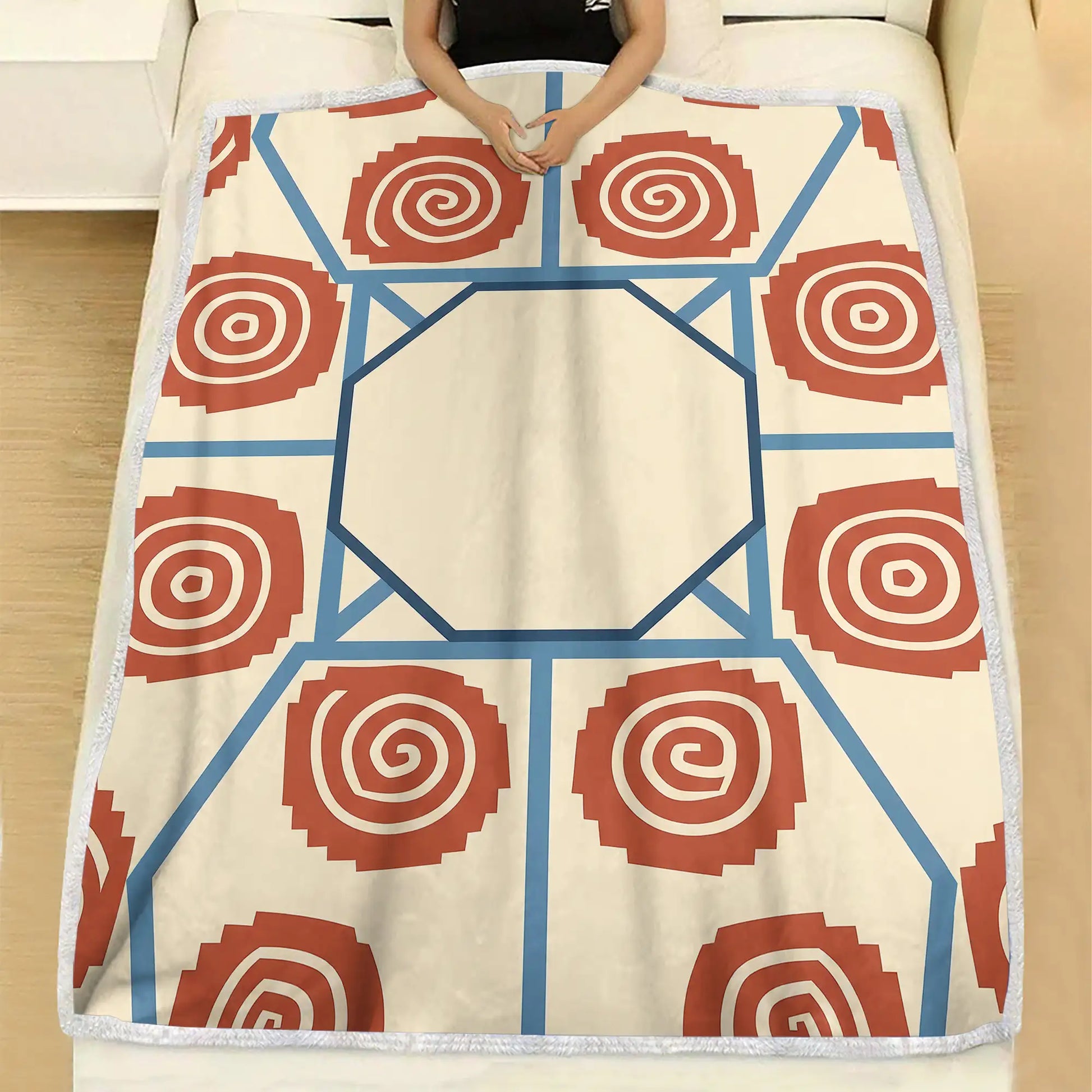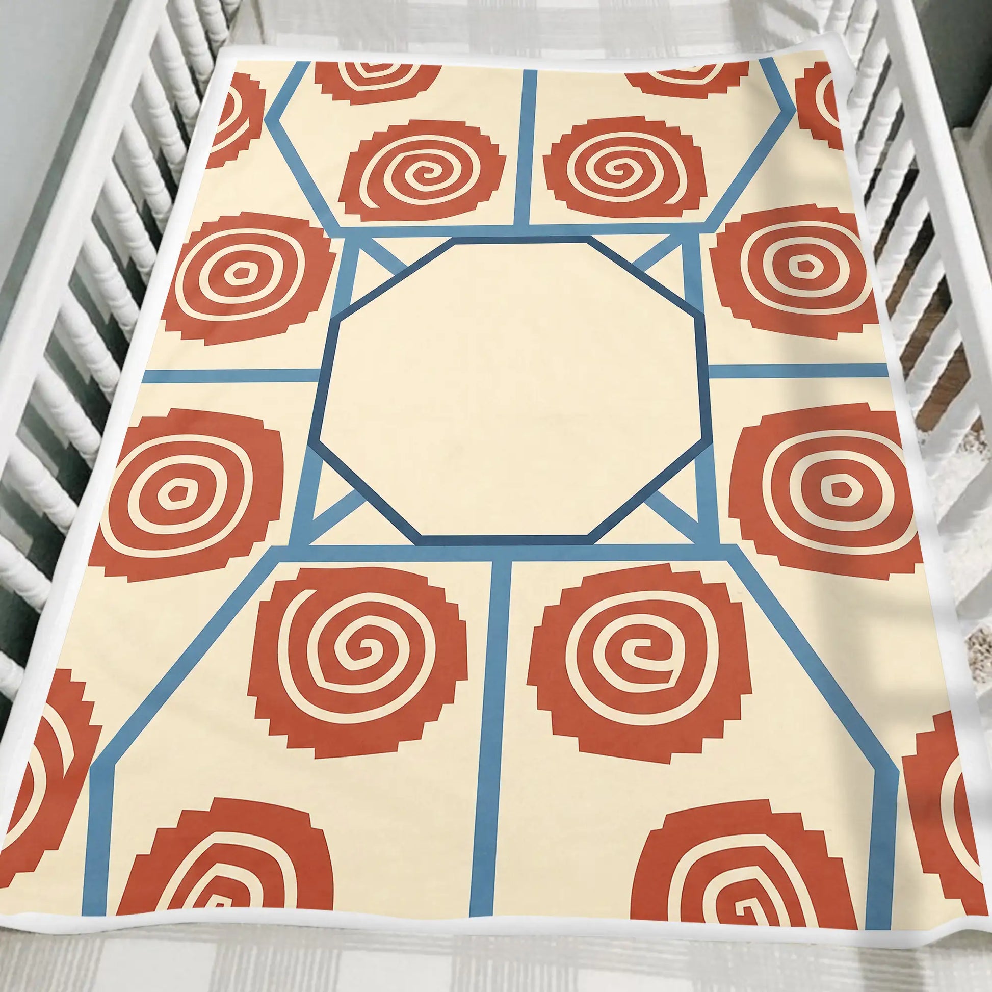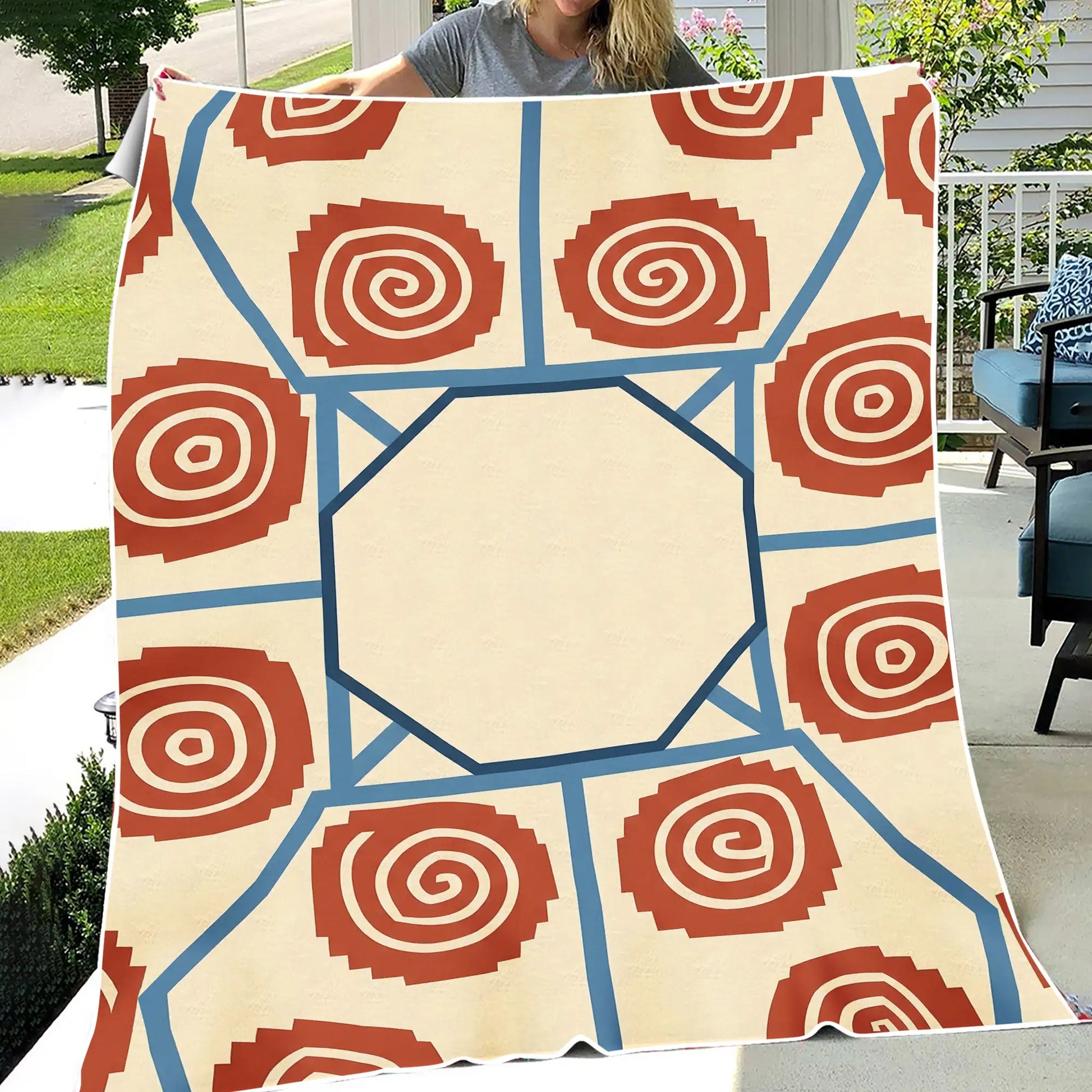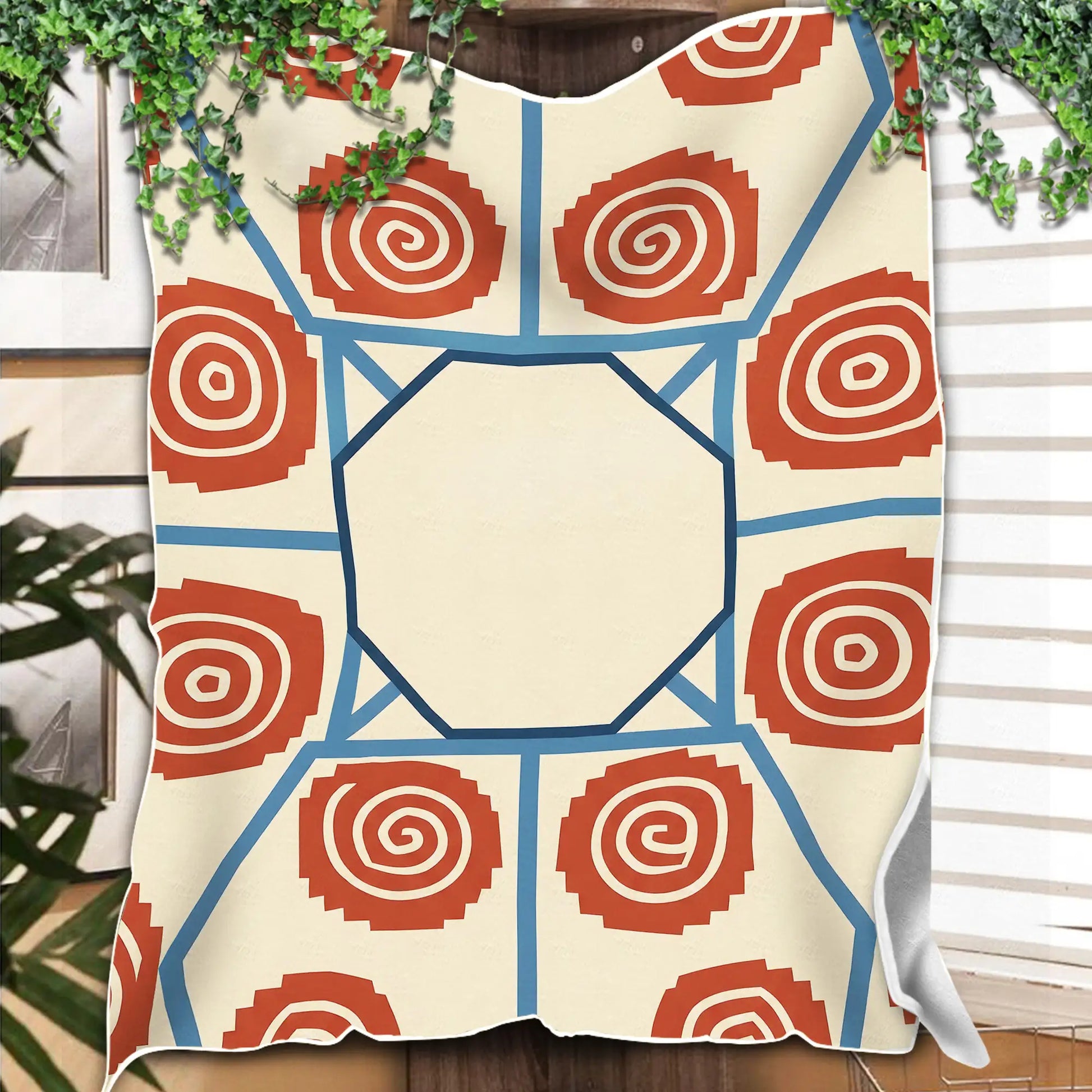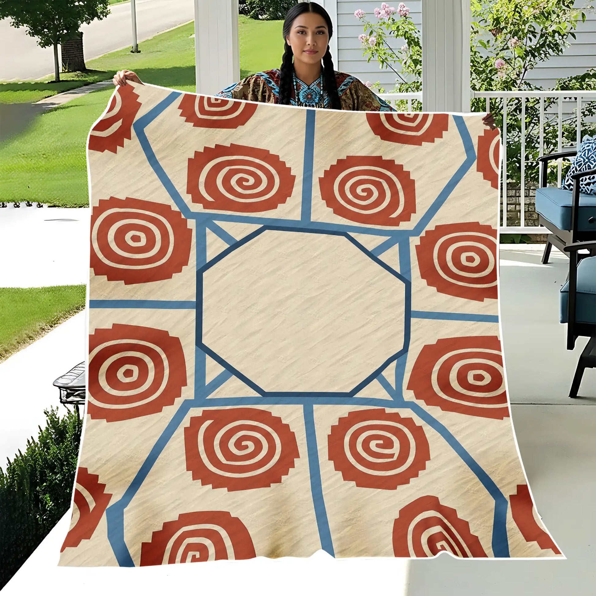 This blanket highlights an artistic spiral pattern inspired by Native America symbolism, where the spiral represents life cycles, growth, and spiritual journeys. Designed with earthy red tones against a beige background and accented with structured blue lines, the pattern reflects both energy and balance found in ancient tribal art. The bold spirals echo motifs seen in Southwestern tribal traditions, carrying cultural meaning of continuity and resilience. Perfect as a cozy throw or decorative accent, this blanket brings warmth, heritage, and artistry into modern living spaces while connecting deeply to traditions rooted in nature and storytelling.