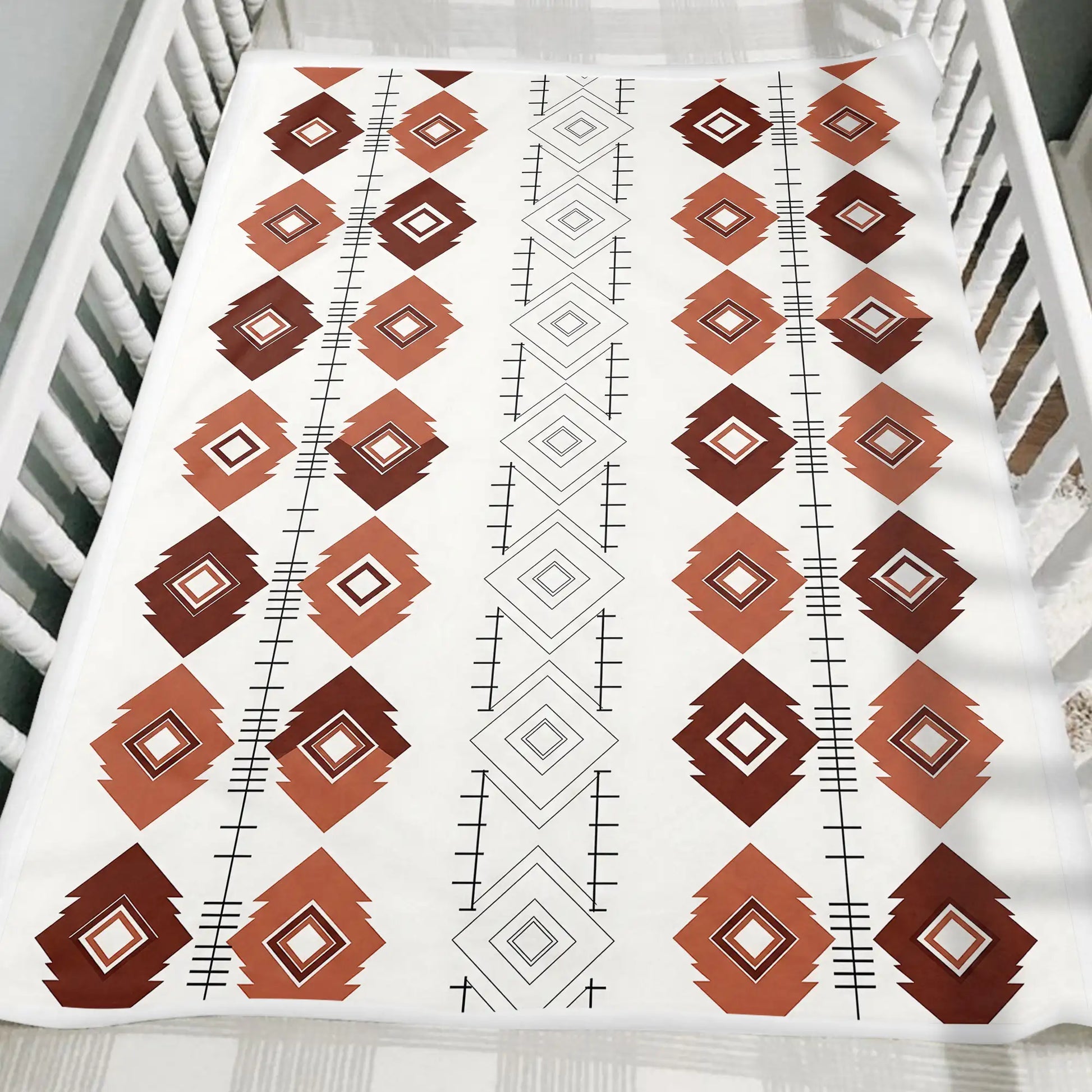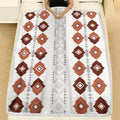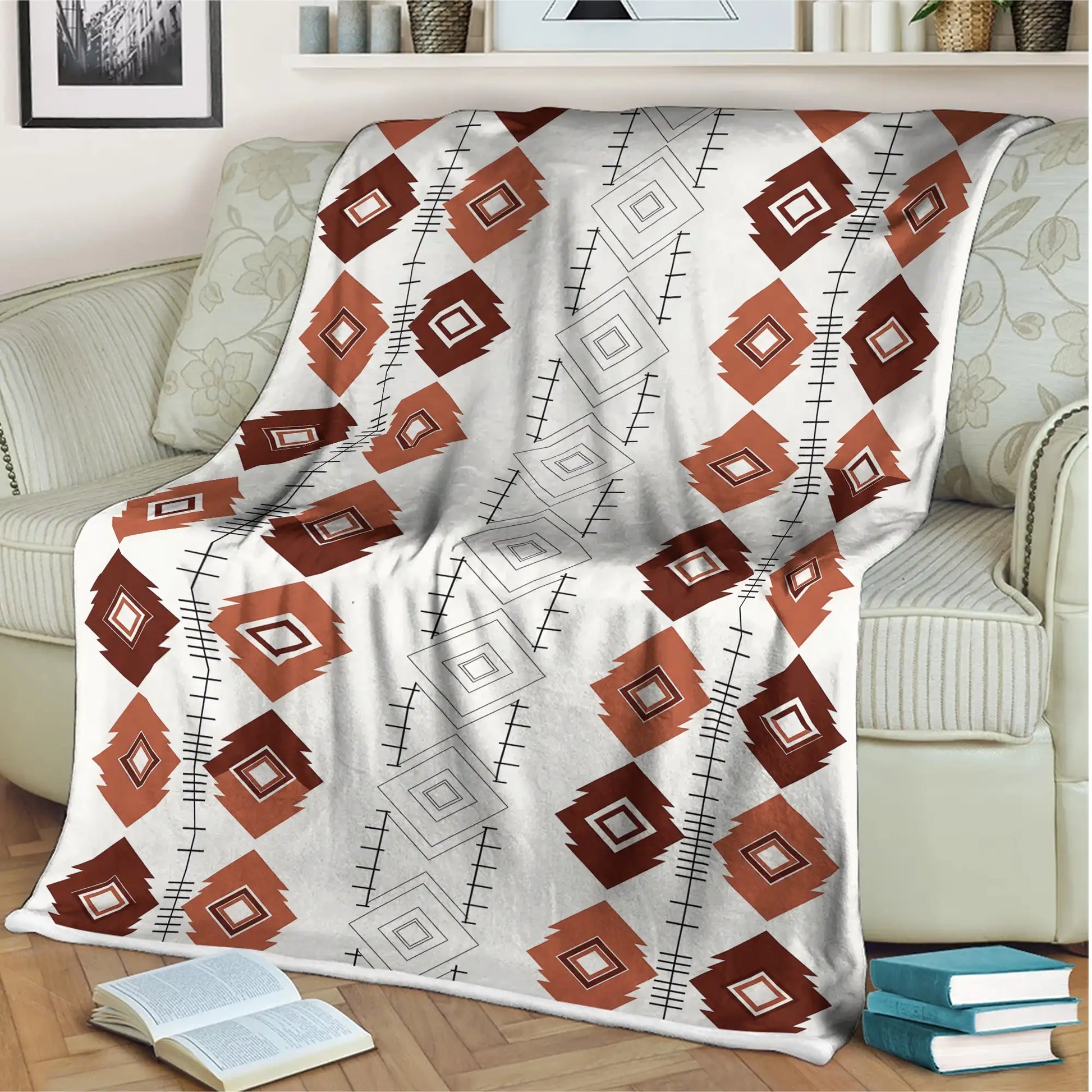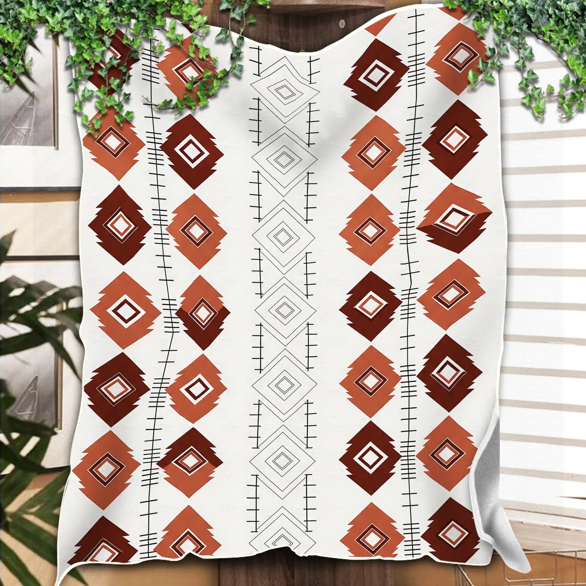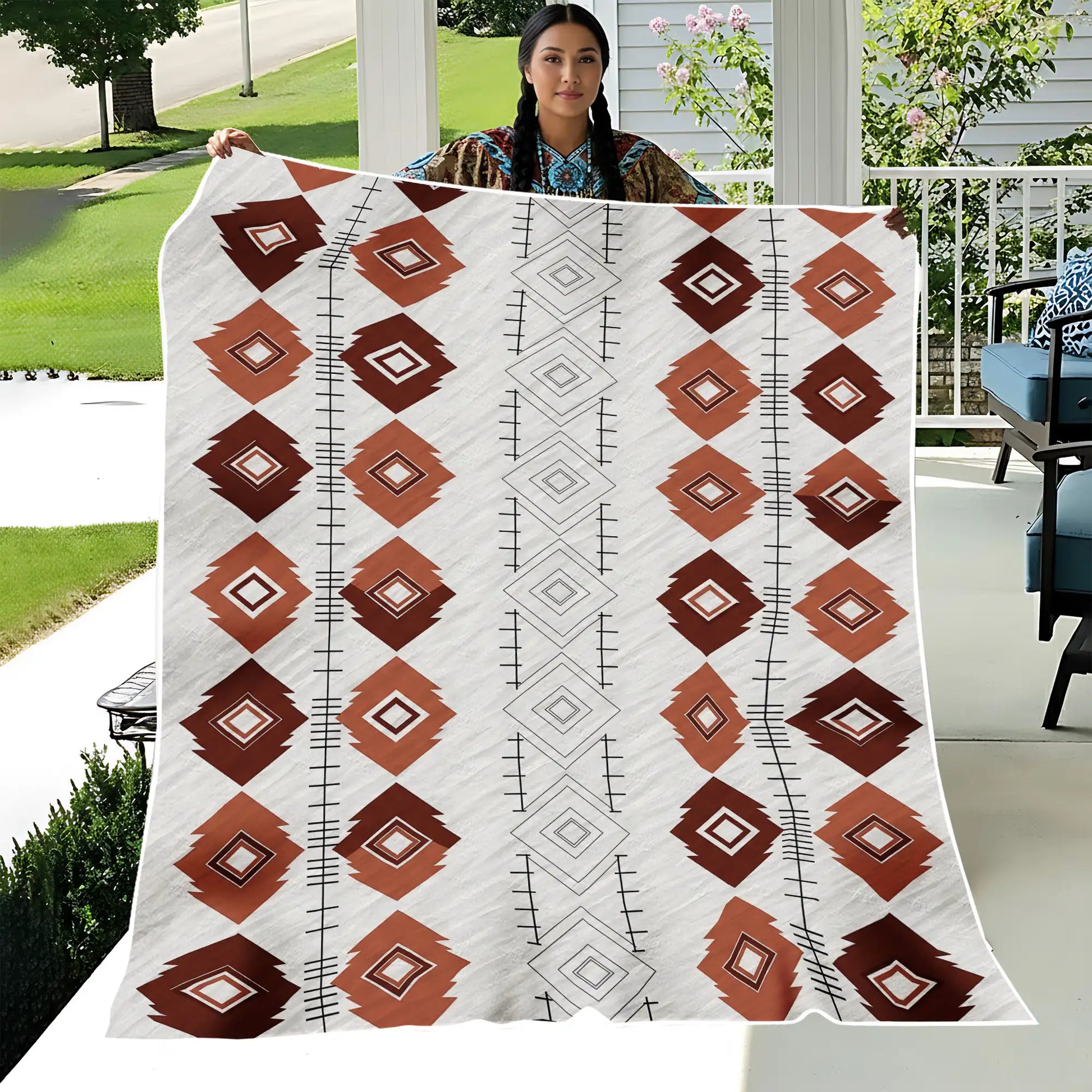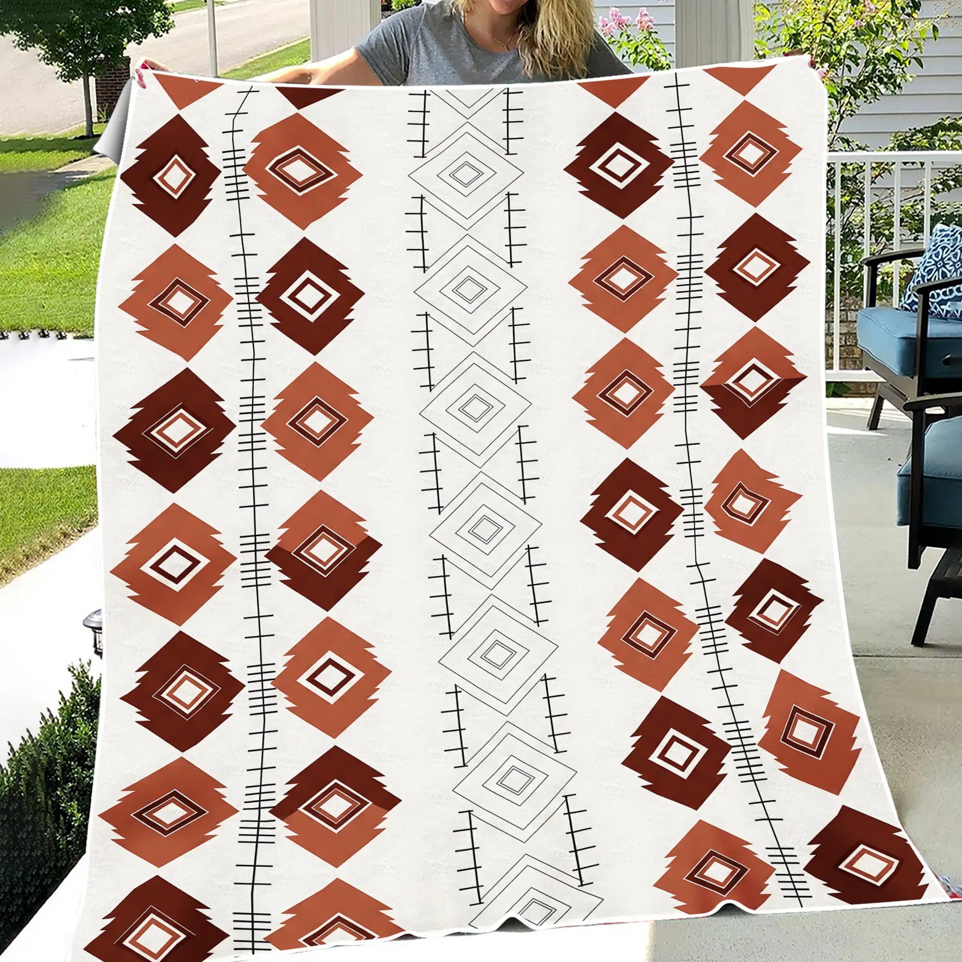 This blanket showcases a bold geometric diamond pattern inspired by Native America heritage, featuring earthy tones of brown, red, and white. The repeated diamond motifs symbolize unity, balance, and cultural resilience, reflecting the artistry of Southwestern tribes where geometric forms were deeply tied to storytelling and symbolism. Each detail carries cultural depth, from the symmetrical lines to the rich color palette that evokes the spirit of tradition and strength. Crafted for both warmth and aesthetic appeal, this blanket is ideal for adding a touch of heritage to your home décor, blending comfort with timeless Native design.