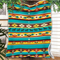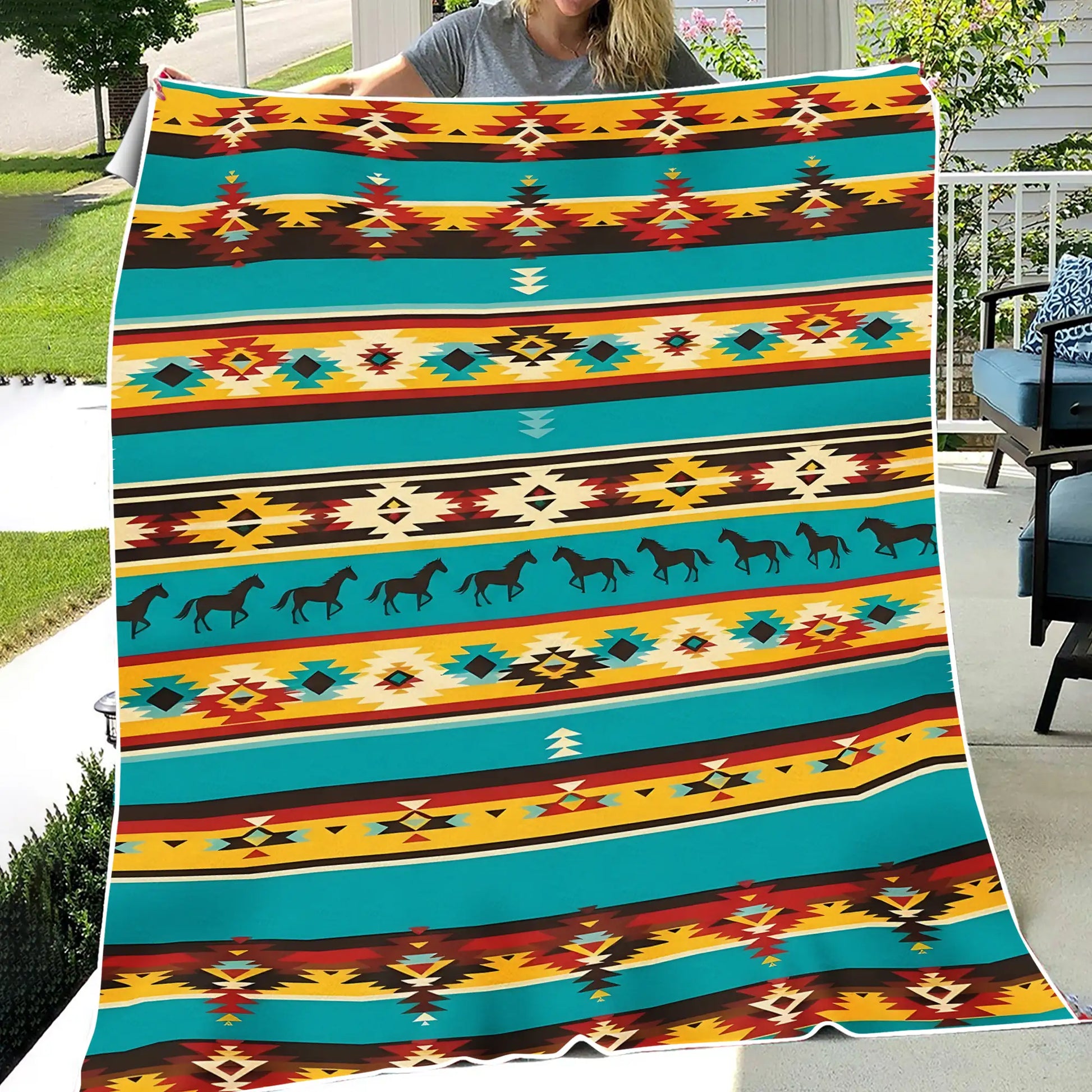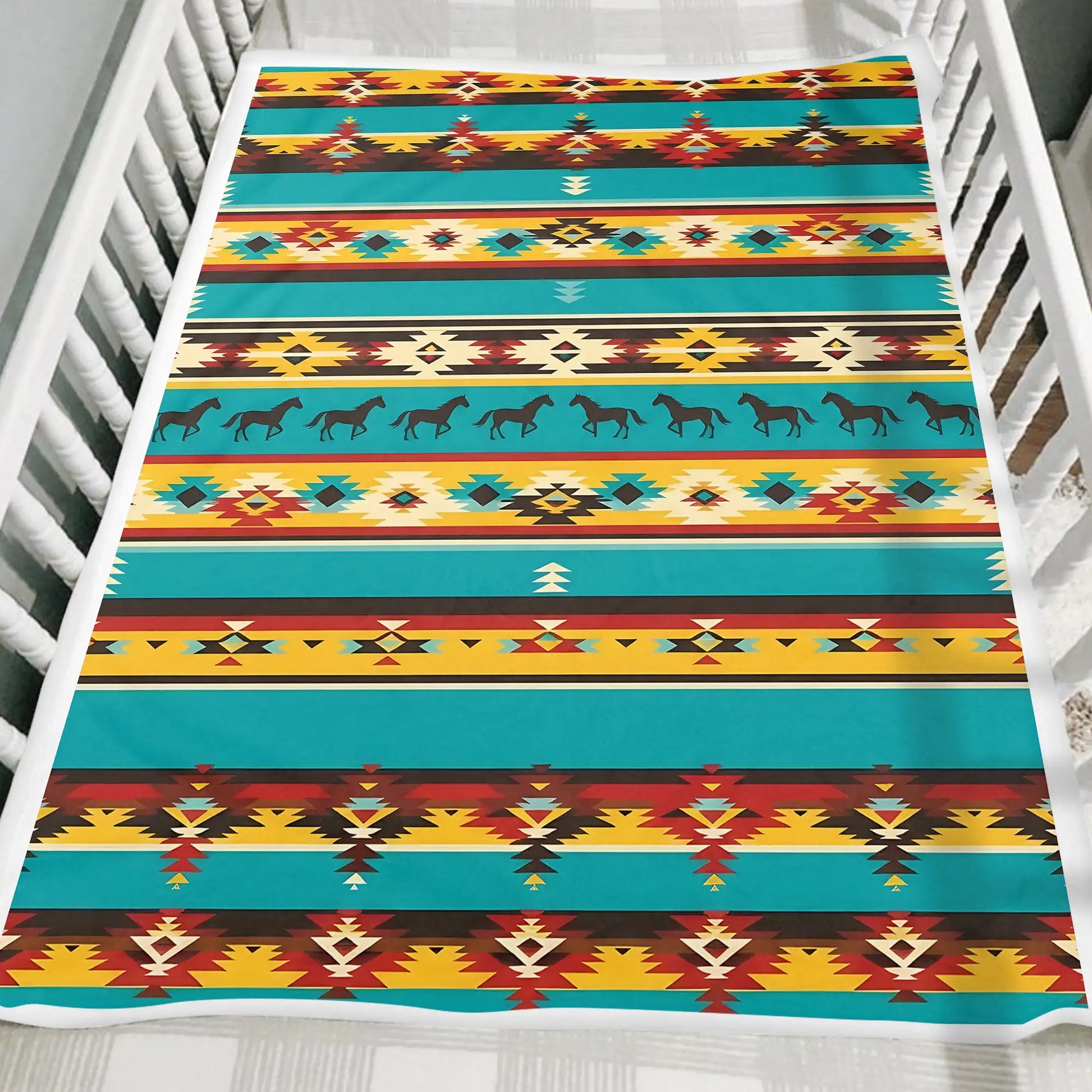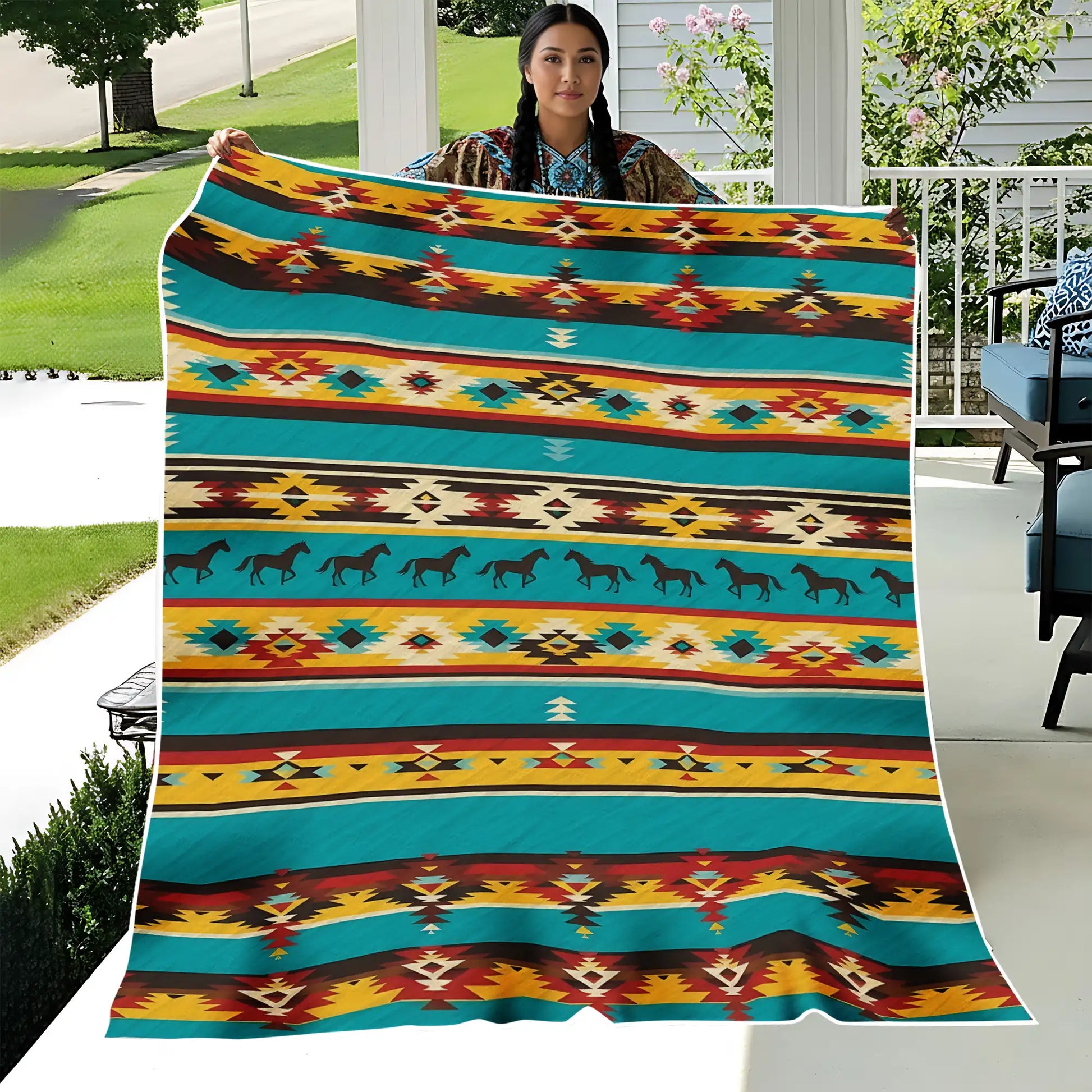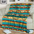 This blanket design is inspired by Native America heritage, featuring vibrant turquoise, yellow, red, and black tones arranged in striking tribal geometric rows. At its center, a bold horse pattern symbolizes freedom, power, and the unbreakable bond between humans and nature. The combination of diamonds, zigzags, and traditional motifs represents balance, direction, and harmony within Indigenous culture. Crafted for comfort and warmth, this throw blanket not only enhances your bedroom or living room decor but also carries a meaningful story rooted in ancestral traditions. A perfect piece for cozy nights and meaningful home decoration.