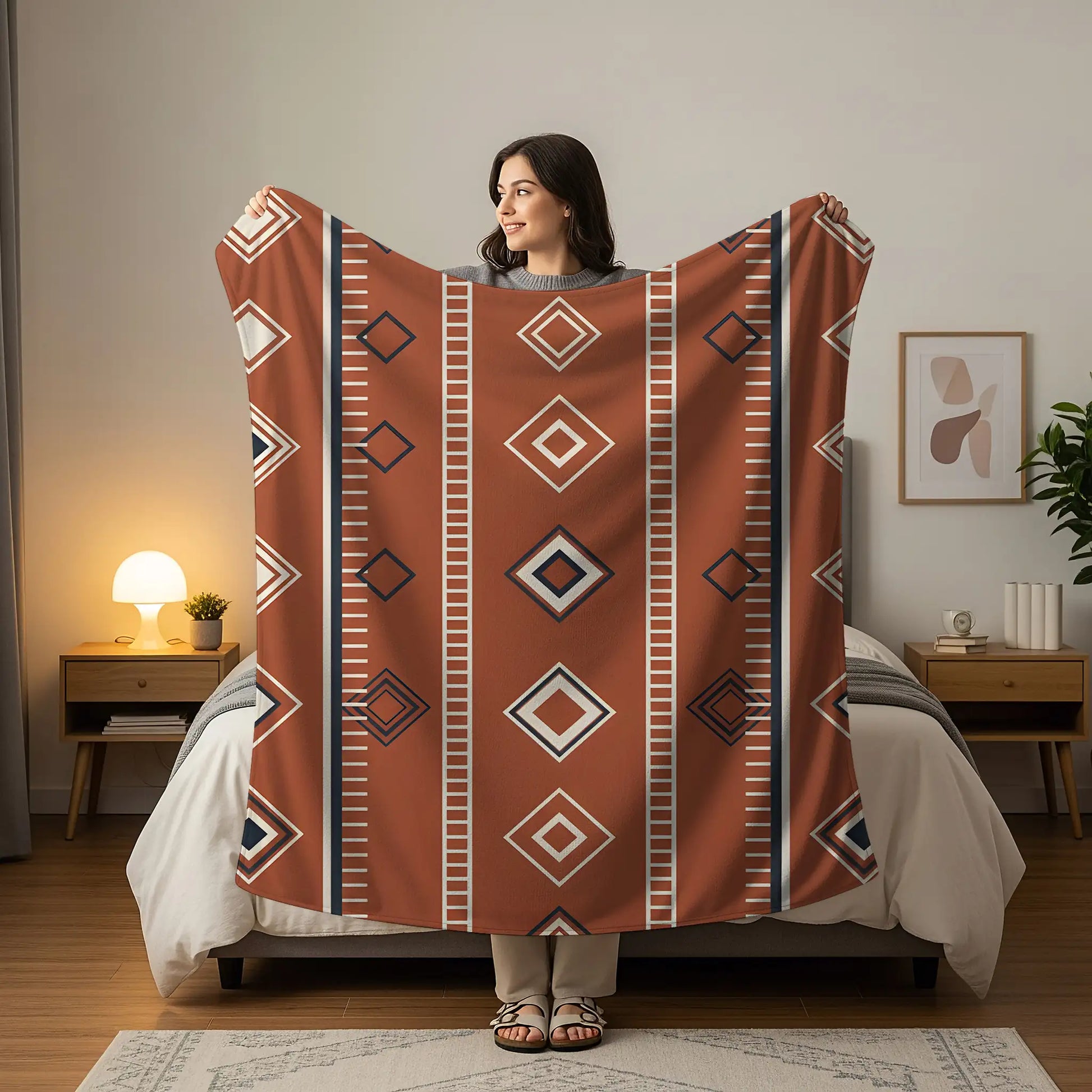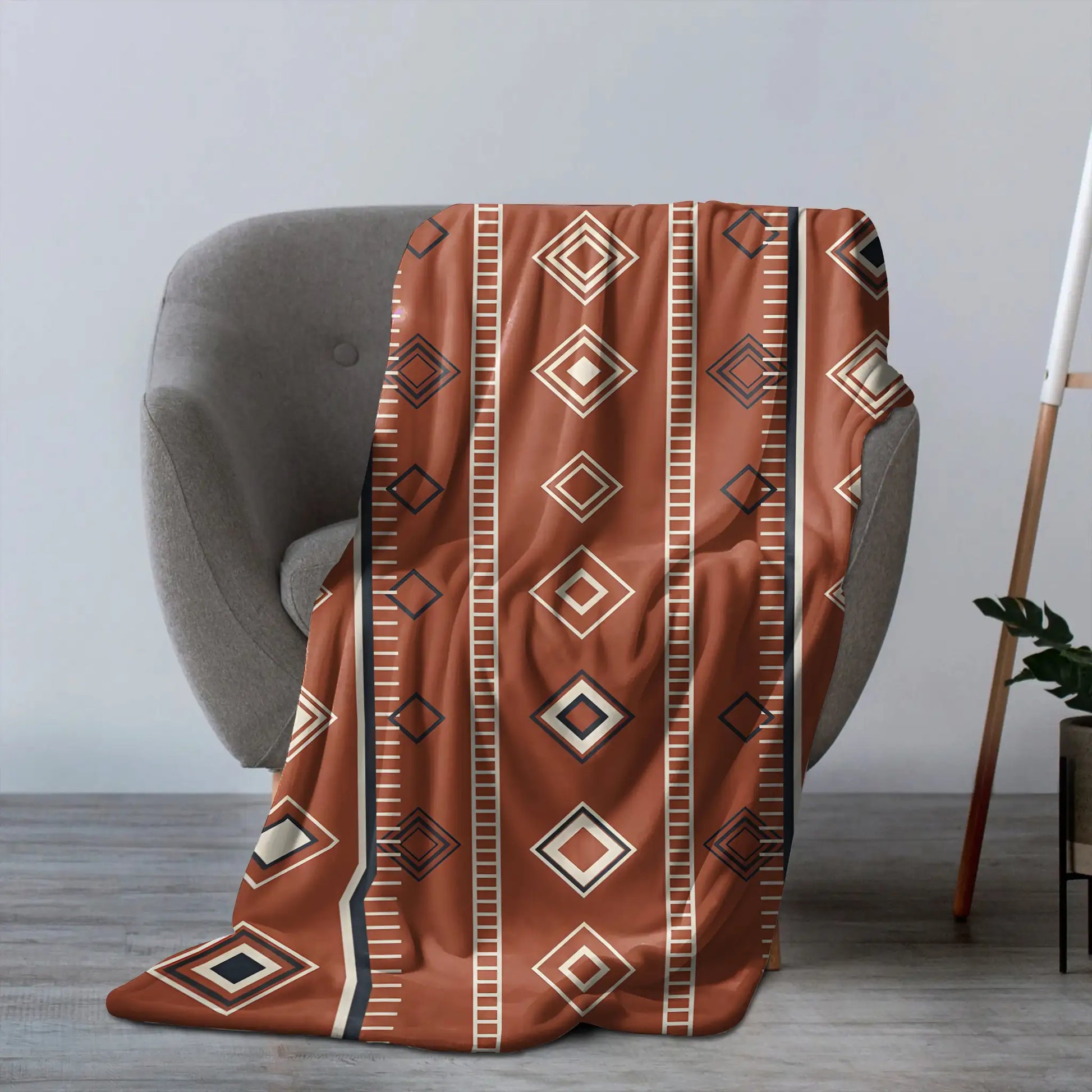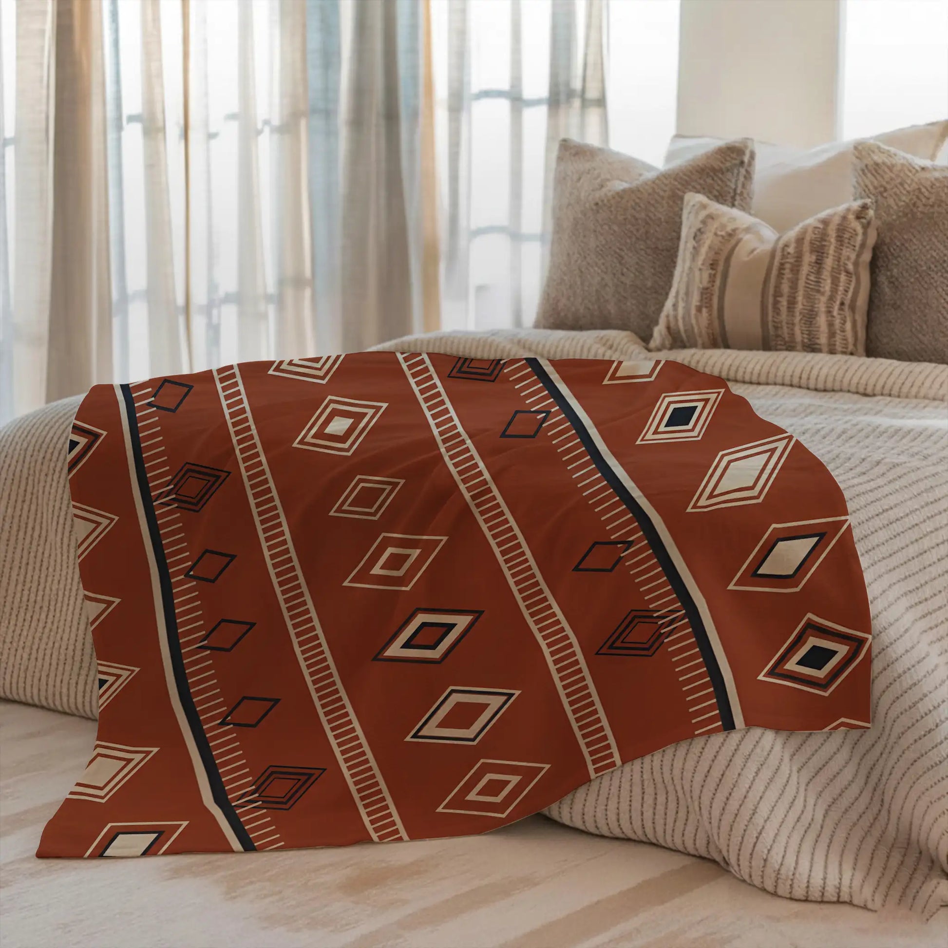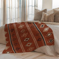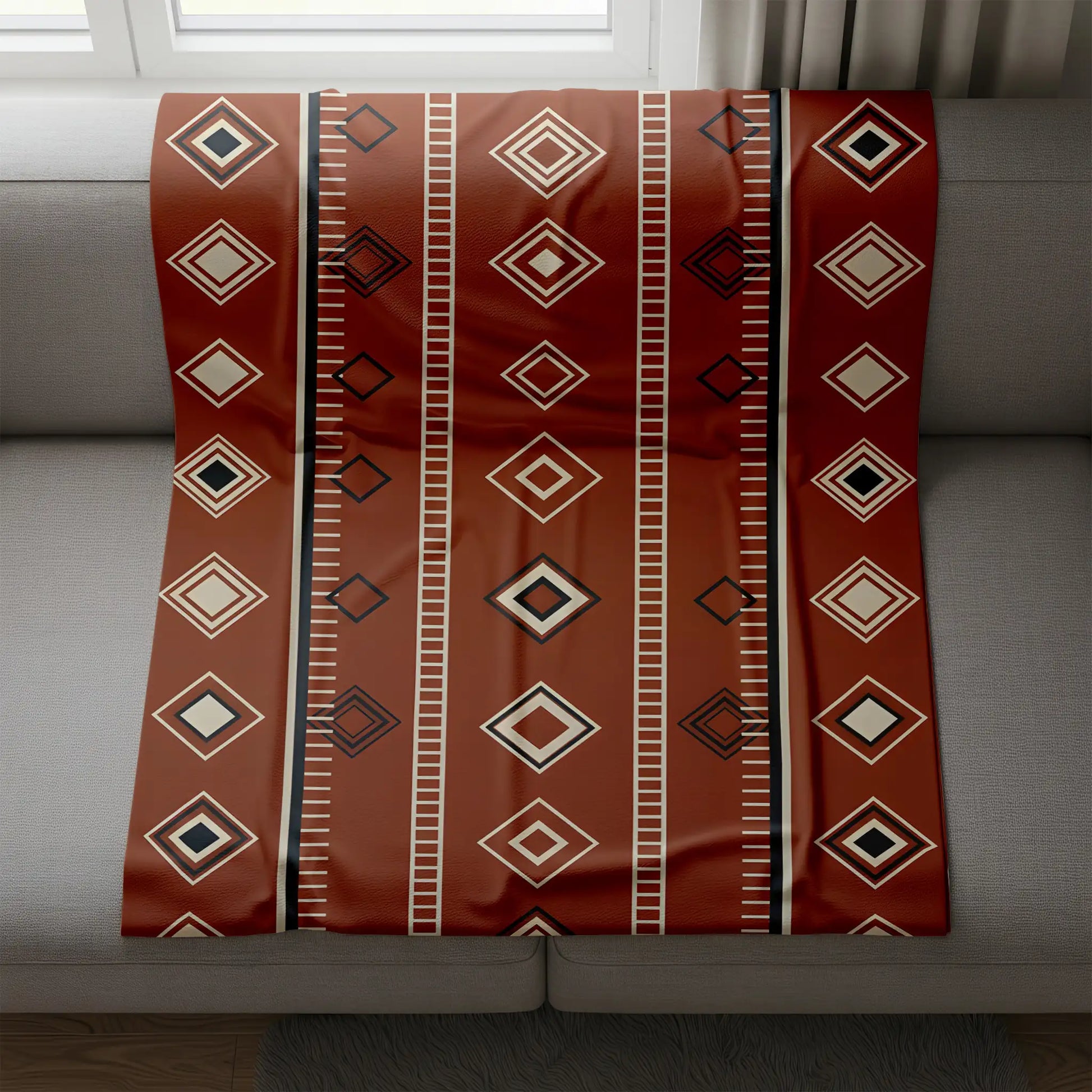 This blanket reflects the artistry of Native America tribes, where geometric balance and earthy tones symbolize connection to land and tradition. The bold diamond stripe motifs on a rustic red background create a sense of warmth and unity, echoing patterns historically used to represent strength and protection. With its clean symmetry and timeless tribal layout, the design evokes stories of heritage while adding a striking accent to any living space. Crafted for comfort and durability, it is ideal for cozy nights indoors or as a decorative statement piece that celebrates cultural depth and meaningful artistry.