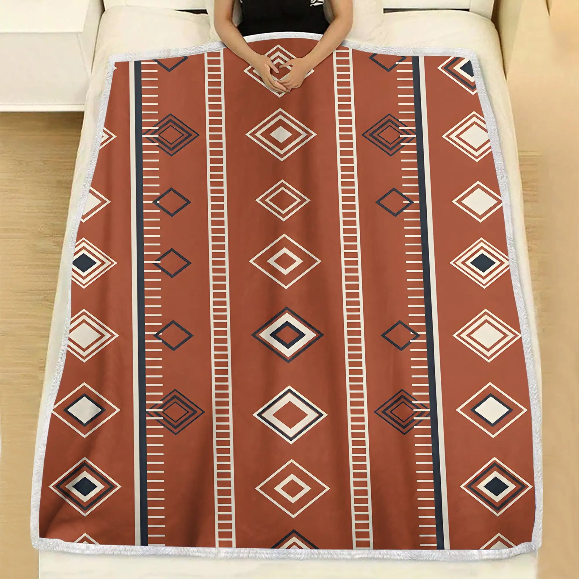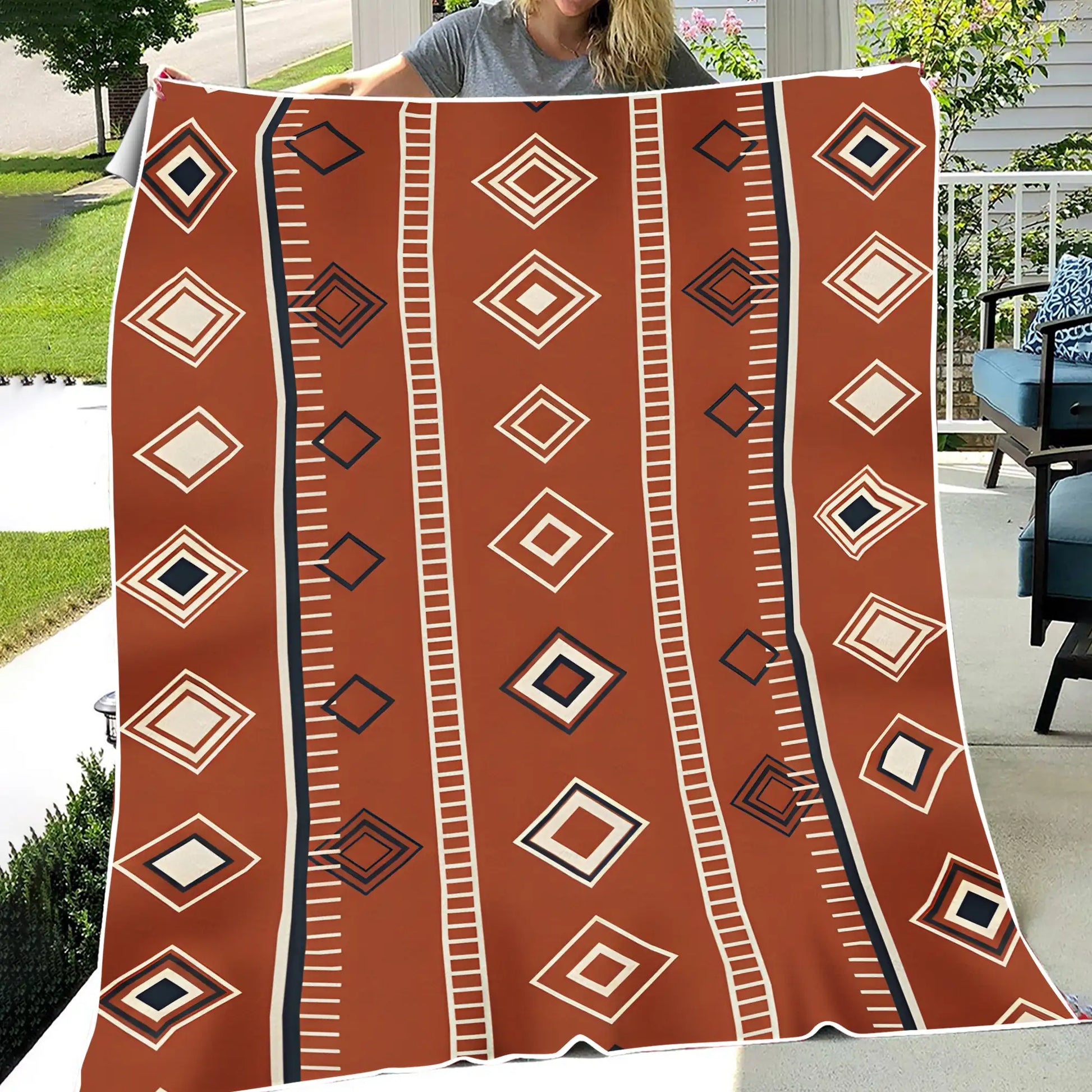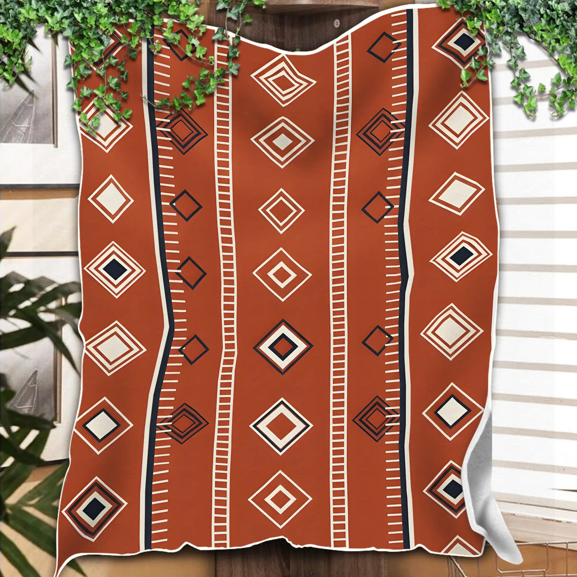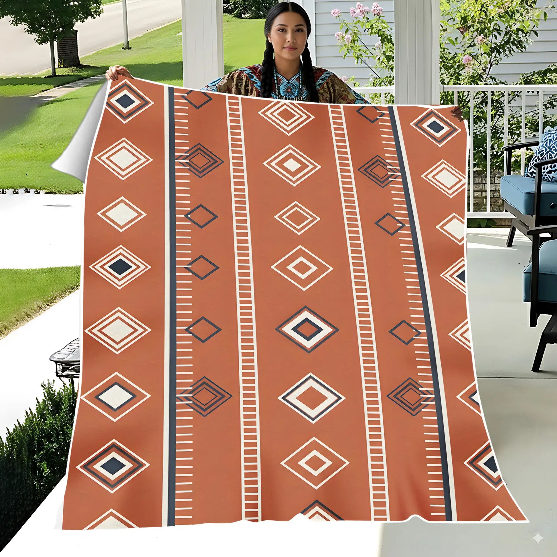 This blanket reflects the artistry of Native America tribes, where geometric balance and earthy tones symbolize connection to land and tradition. The bold diamond stripe motifs on a rustic red background create a sense of warmth and unity, echoing patterns historically used to represent strength and protection. With its clean symmetry and timeless tribal layout, the design evokes stories of heritage while adding a striking accent to any living space. Crafted for comfort and durability, it is ideal for cozy nights indoors or as a decorative statement piece that celebrates cultural depth and meaningful artistry.