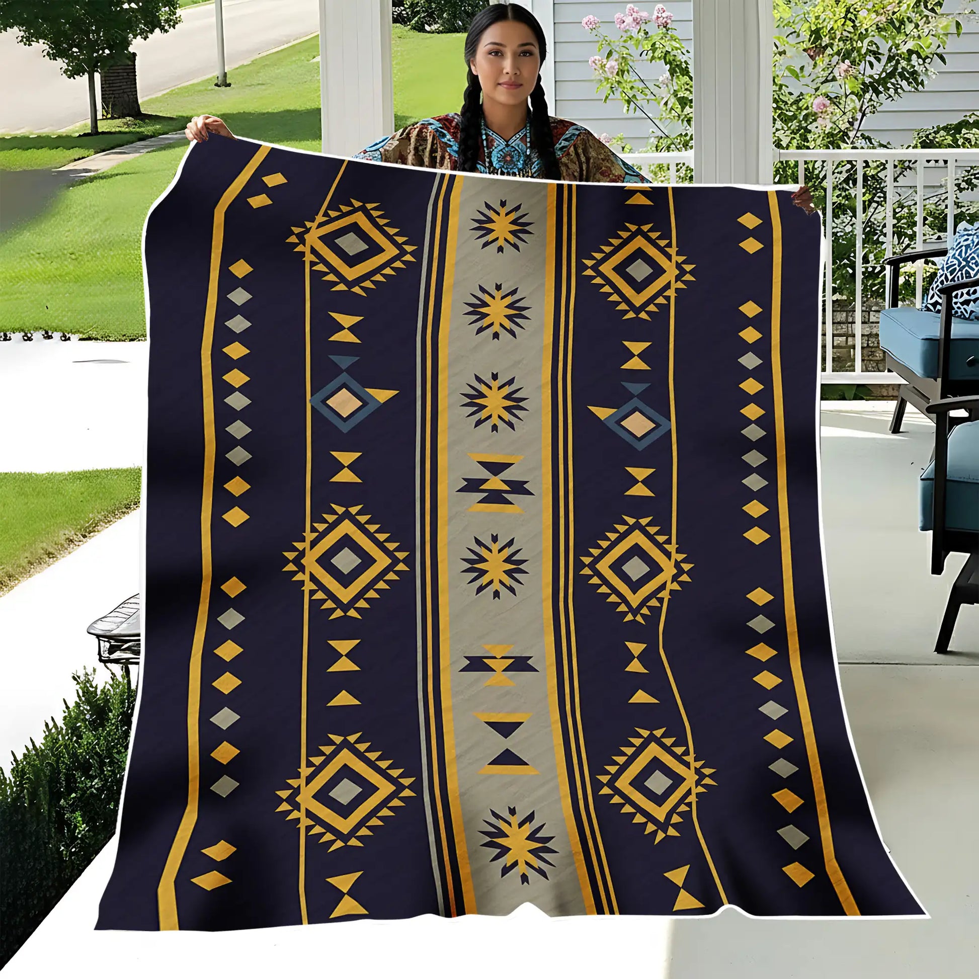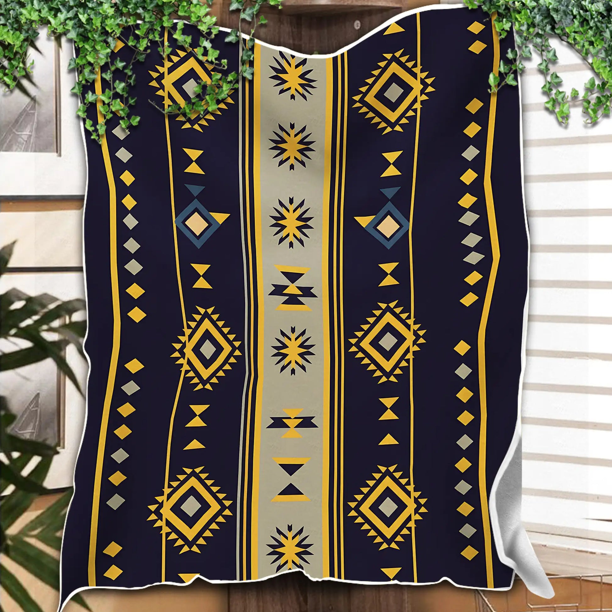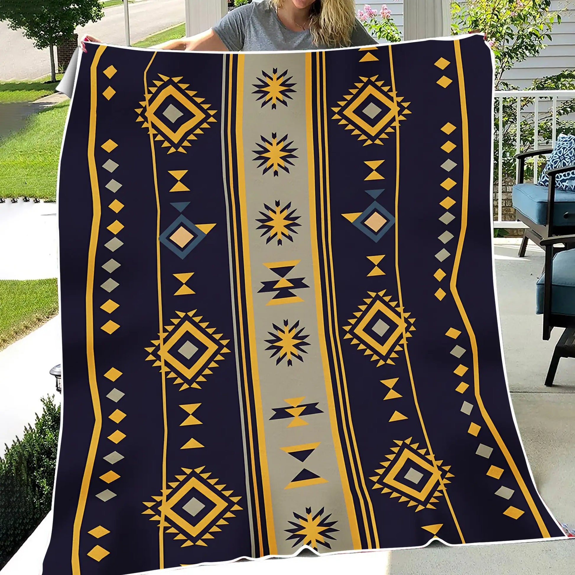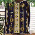 This blanket features a bold Native America design with deep navy and golden yellow tones arranged in striking vertical rows. The central focus is on geometric diamond and starburst patterns, symbolizing direction, strength, and harmony with the natural world. Inspired by Indigenous tribes of the Southwest, this design reflects balance and the guiding light of tradition. Crafted for both warmth and aesthetic beauty, it transforms any bedroom or living space into a cultural statement. Perfect for cozy nights or as a decorative piece, this throw blanket carries the spirit of ancestral artistry and timeless meaning.