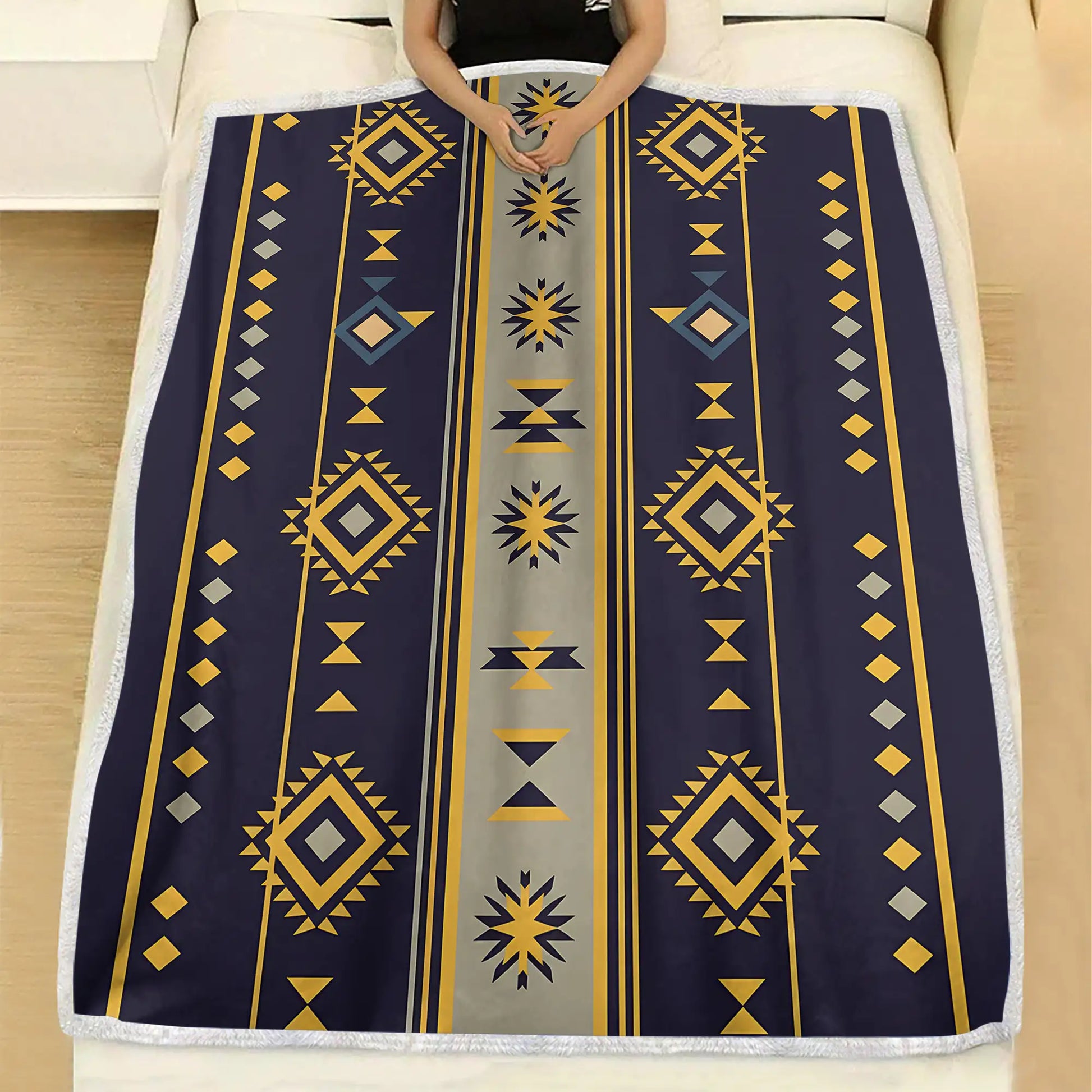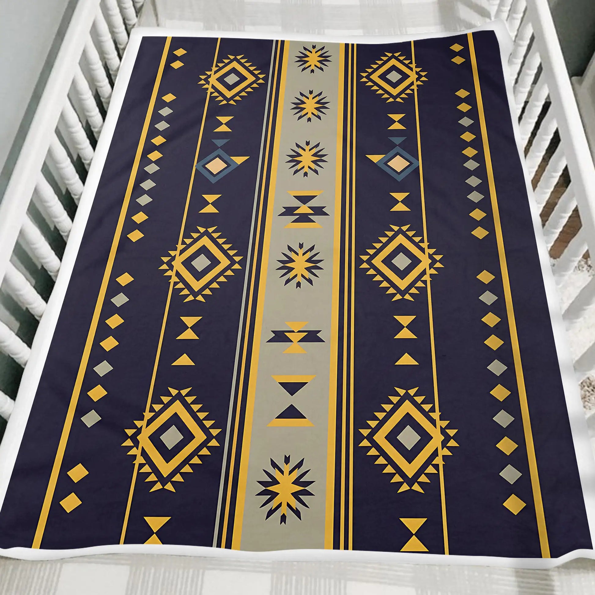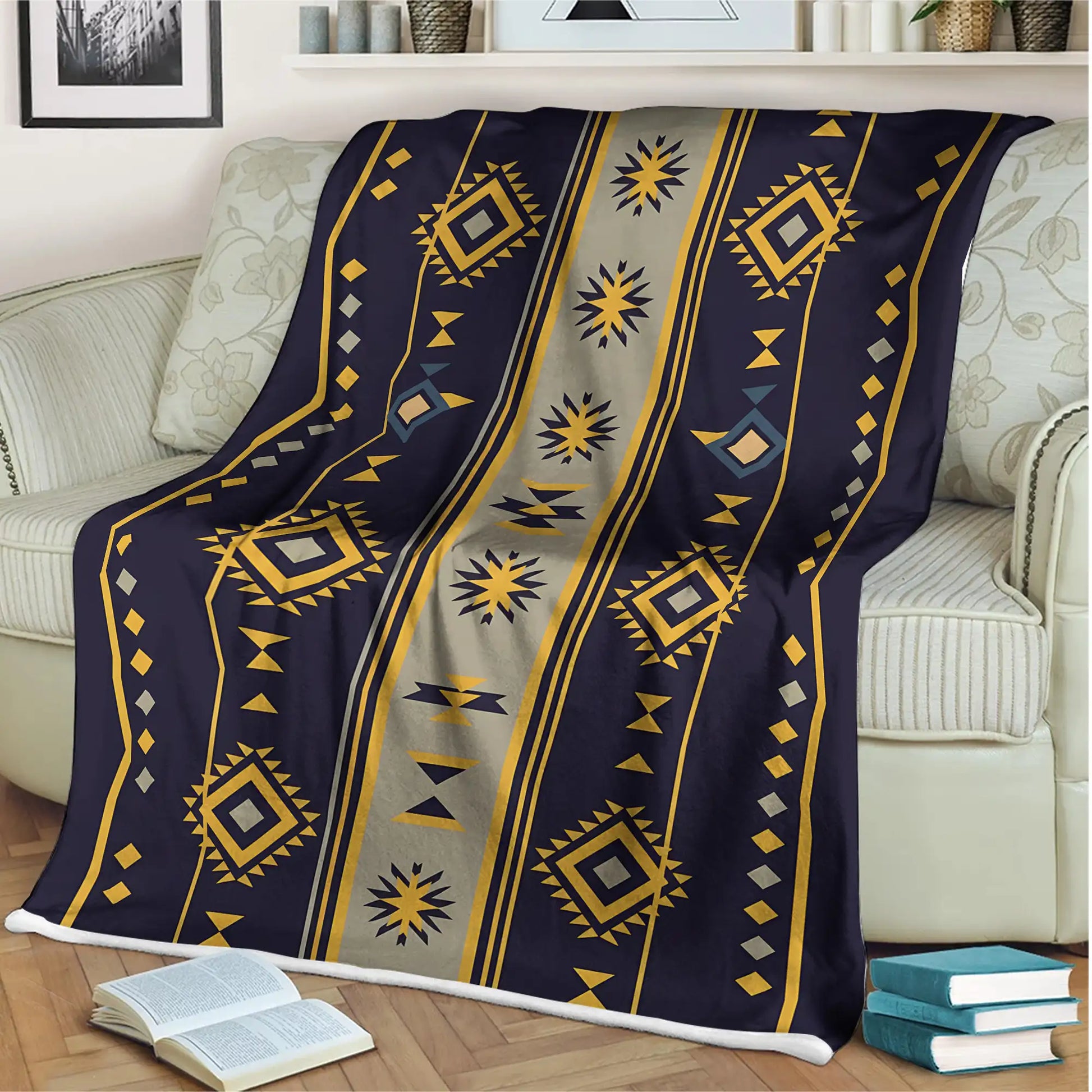 This blanket features a bold Native America design with deep navy and golden yellow tones arranged in striking vertical rows. The central focus is on geometric diamond and starburst patterns, symbolizing direction, strength, and harmony with the natural world. Inspired by Indigenous tribes of the Southwest, this design reflects balance and the guiding light of tradition. Crafted for both warmth and aesthetic beauty, it transforms any bedroom or living space into a cultural statement. Perfect for cozy nights or as a decorative piece, this throw blanket carries the spirit of ancestral artistry and timeless meaning.